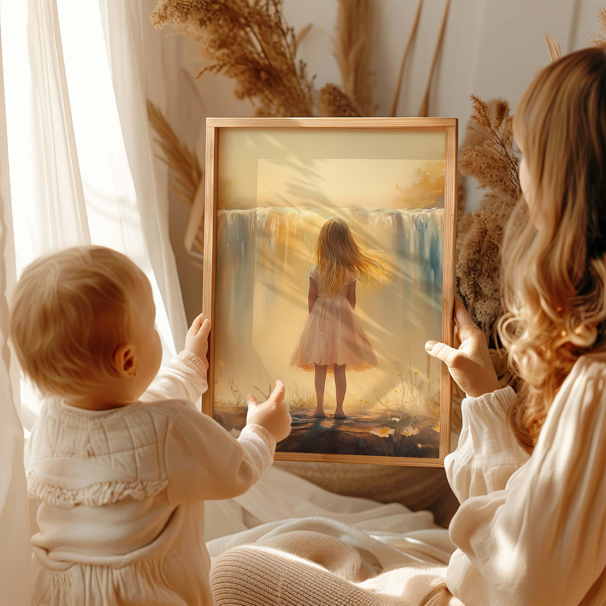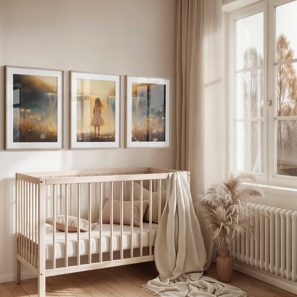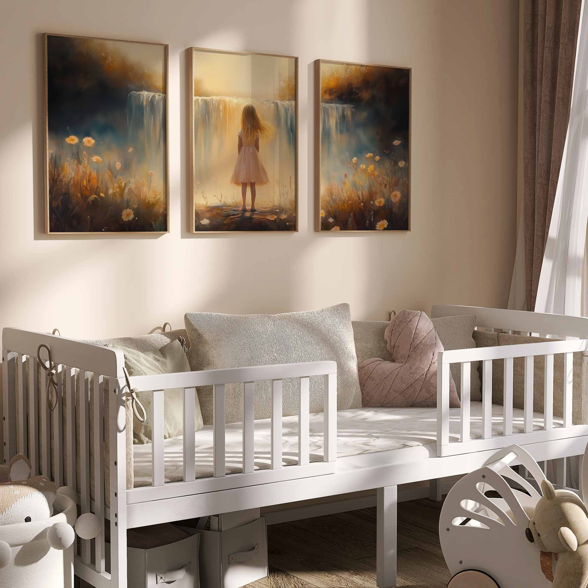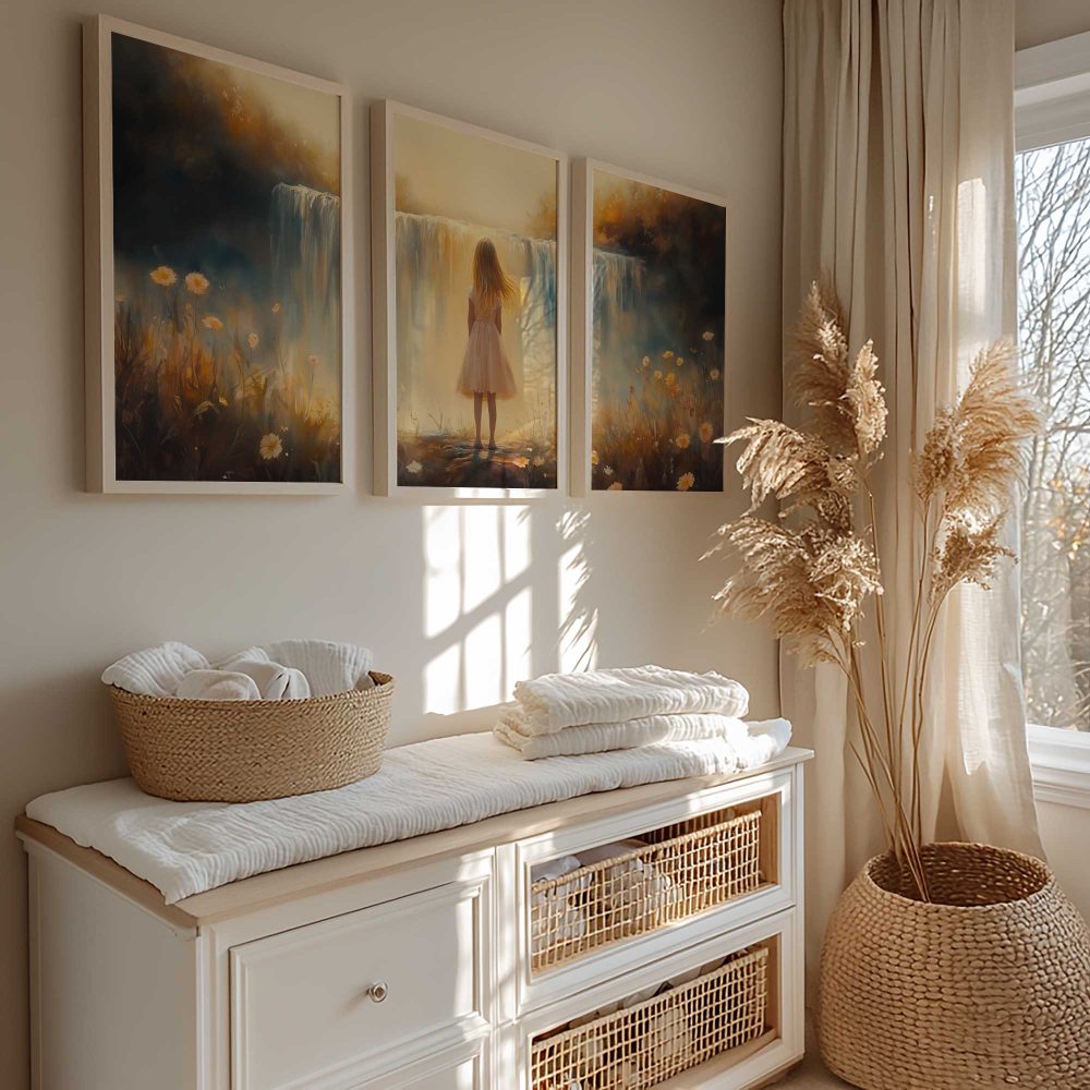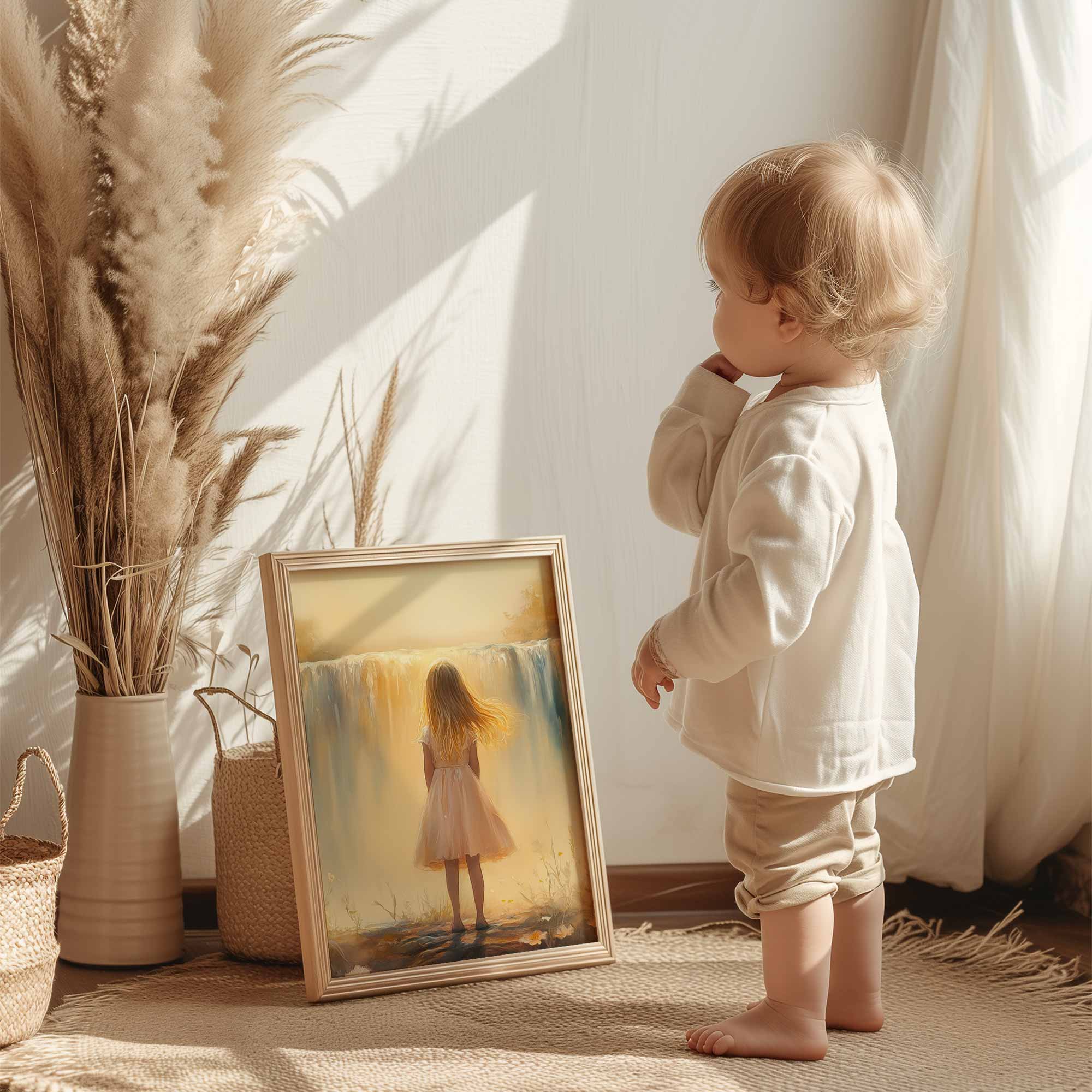 Terug naar collectie / Kinderkamer posters / Bloemen posters / Dromerig Meisje bij Waterval – Pastel Bloemen en Sereniteit