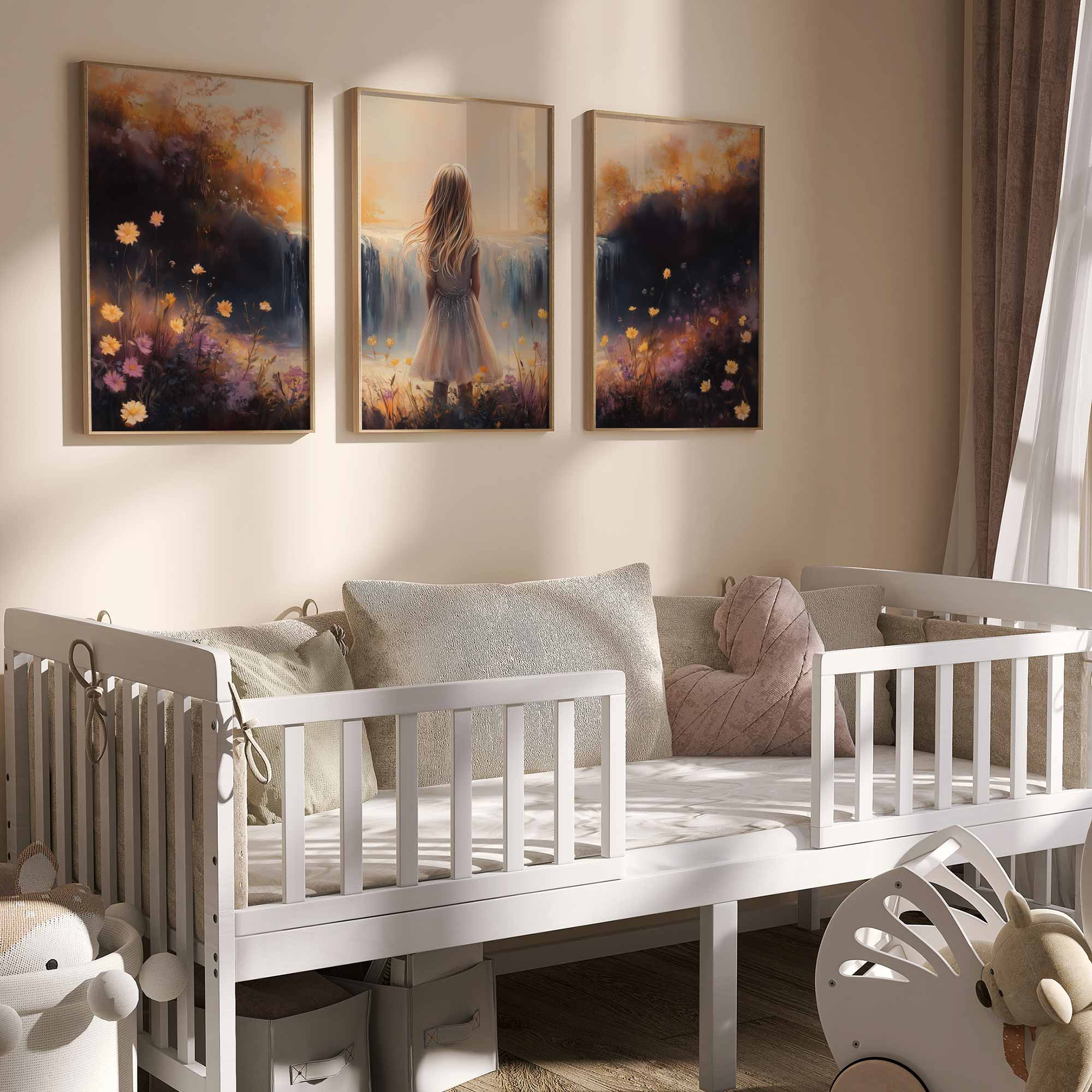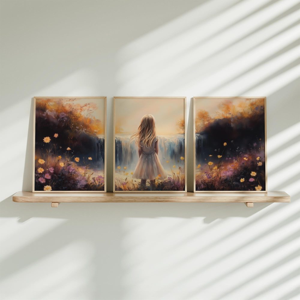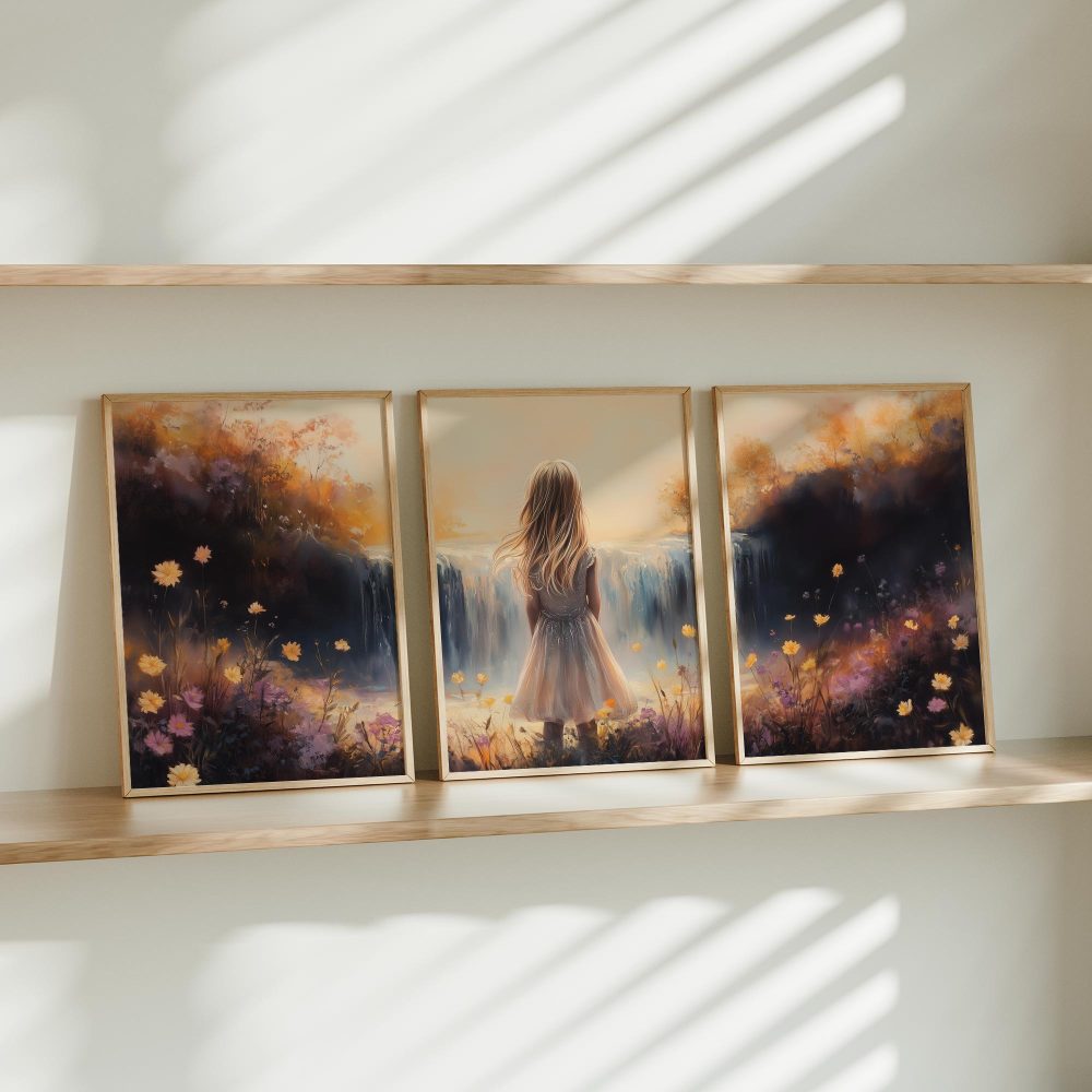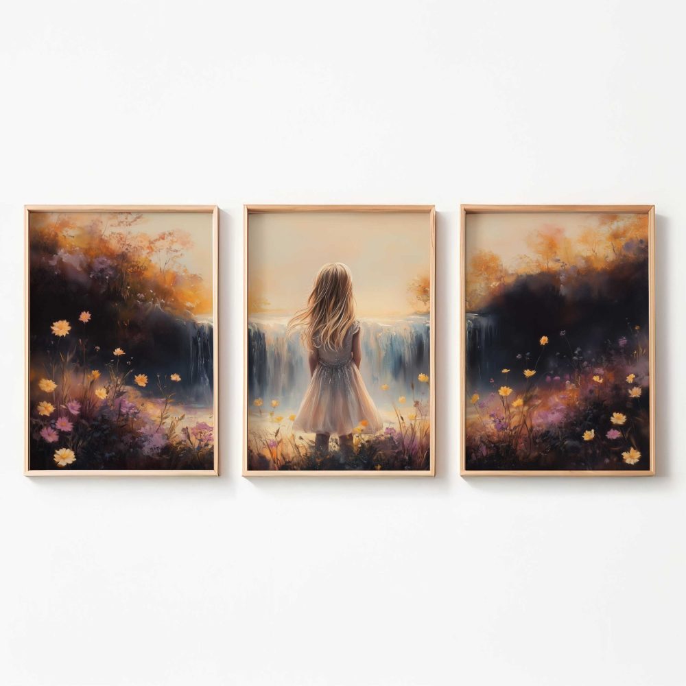 Terug naar collectie / Kinderkamer posters / Bloemen posters / Dromerig Meisje bij Waterval – Pastel Bloemenwereld