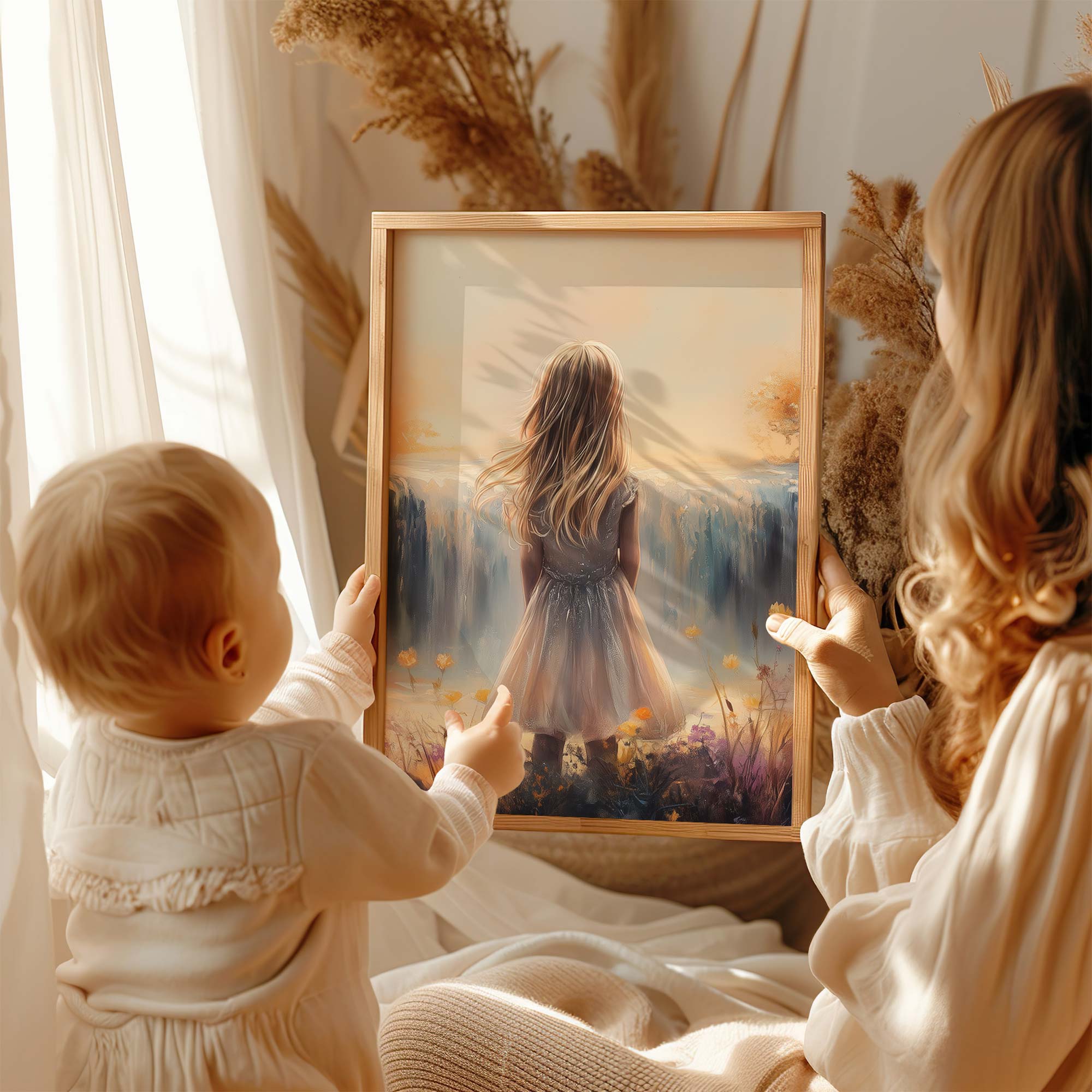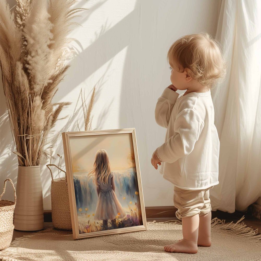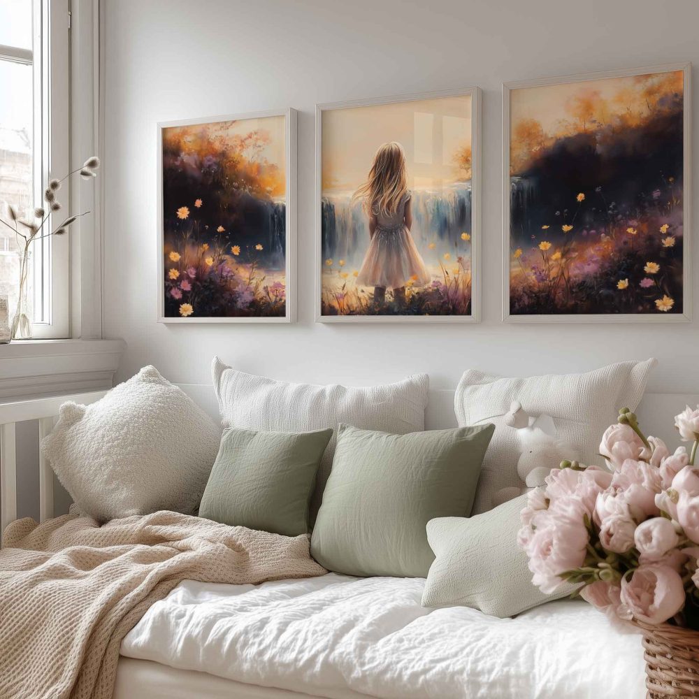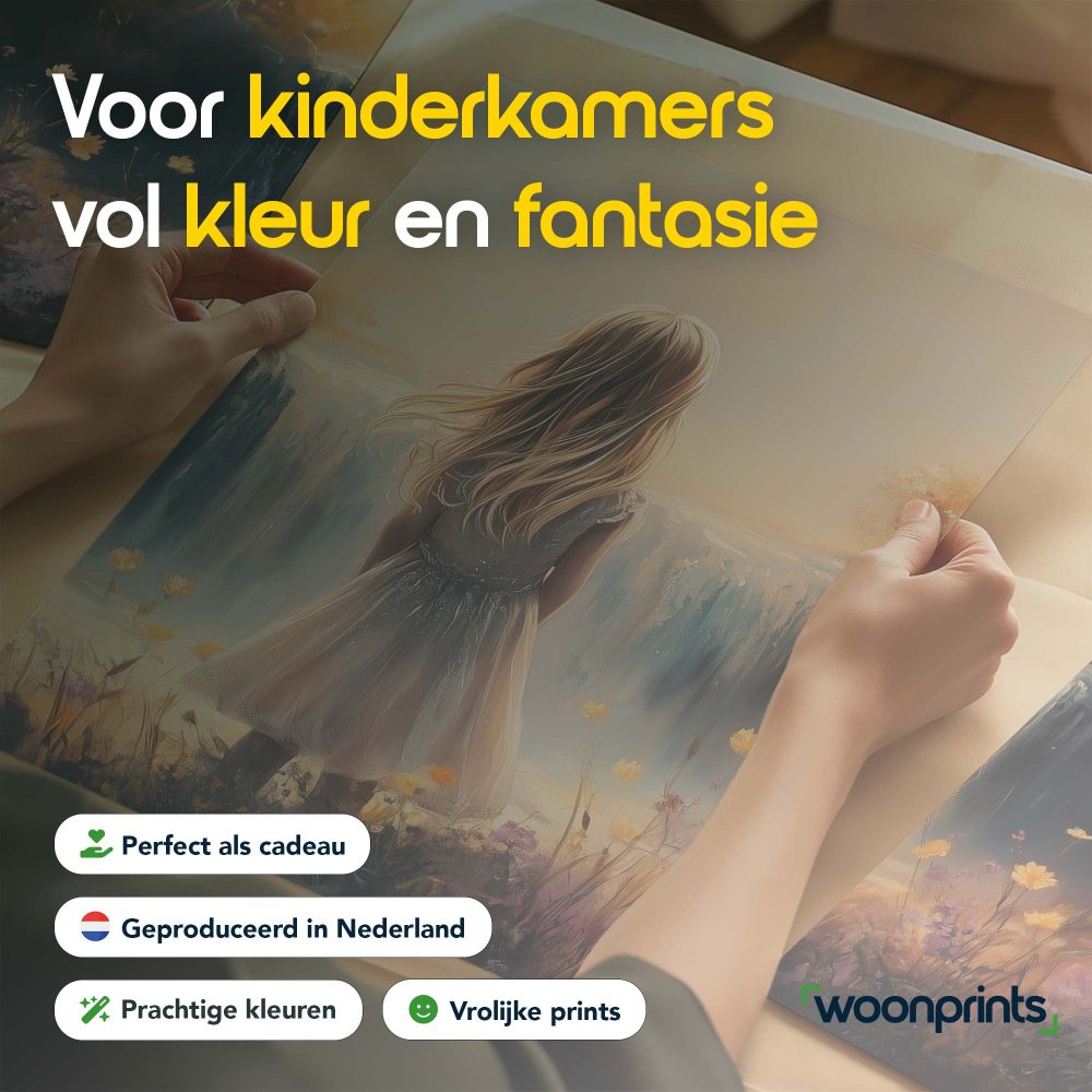 Terug naar collectie / Kinderkamer posters / Bloemen posters / Dromerig Meisje bij Waterval – Pastel Bloemenwereld