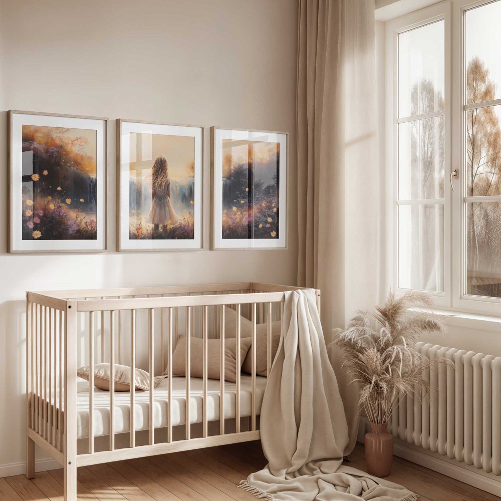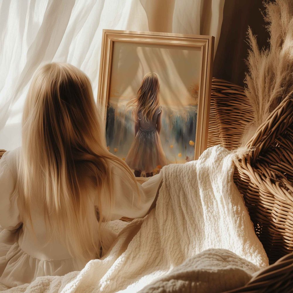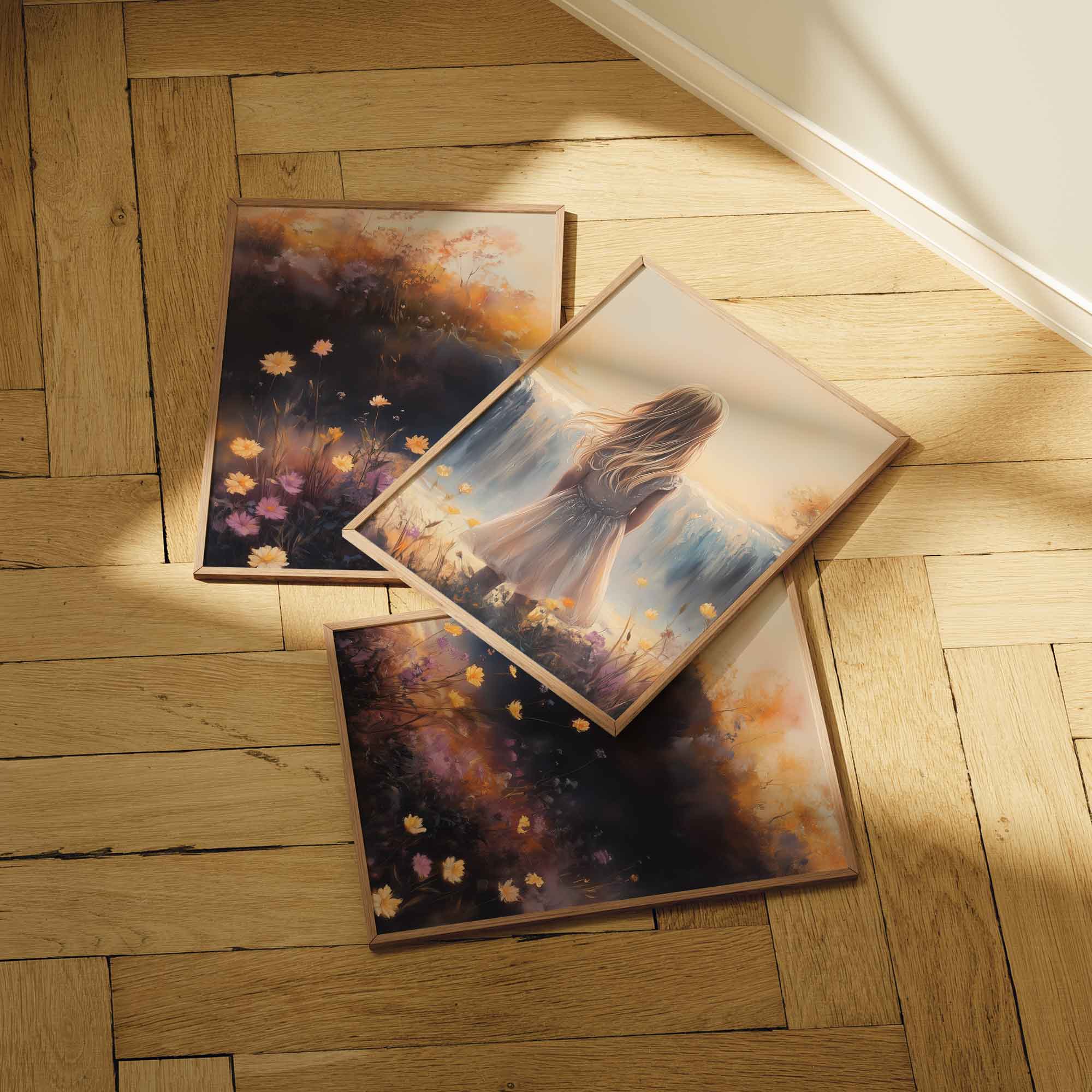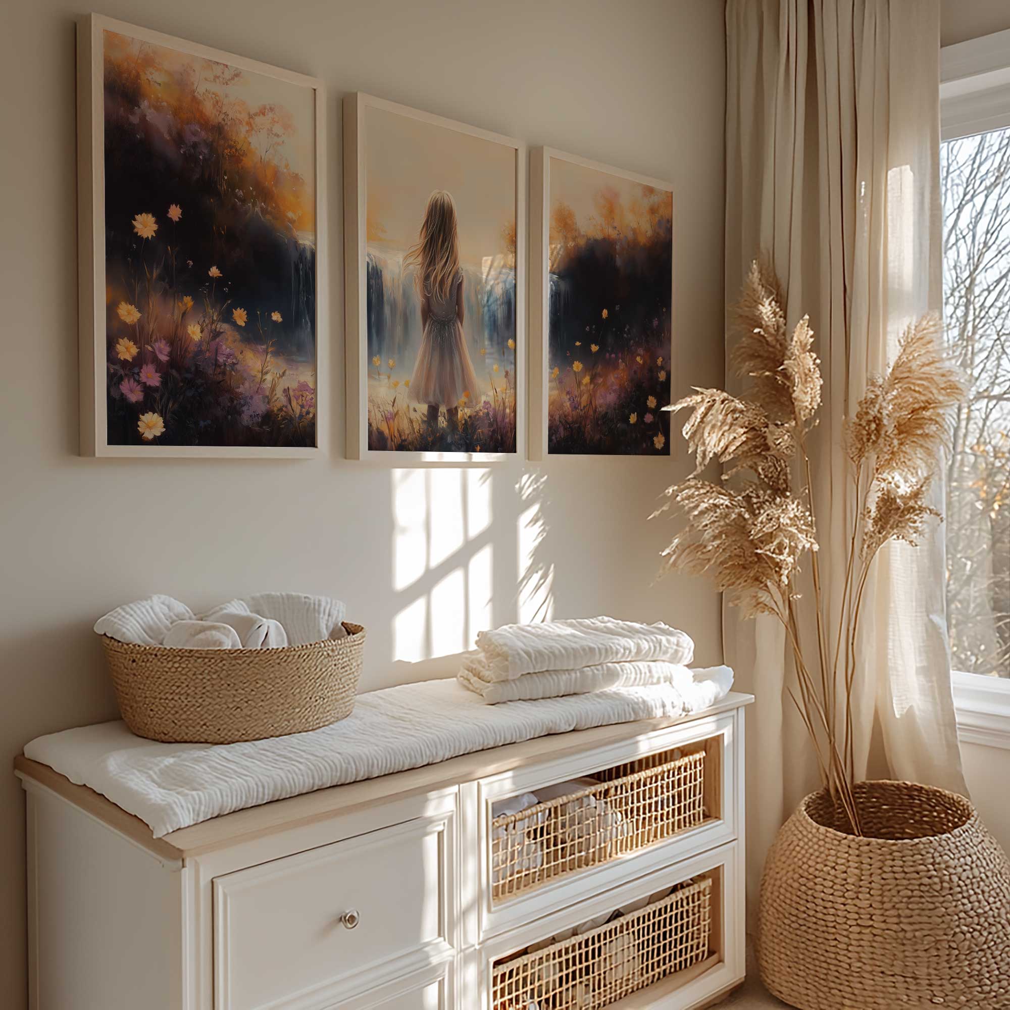 Terug naar collectie / Kinderkamer posters / Bloemen posters / Dromerig Meisje bij Waterval – Pastel Bloemenwereld