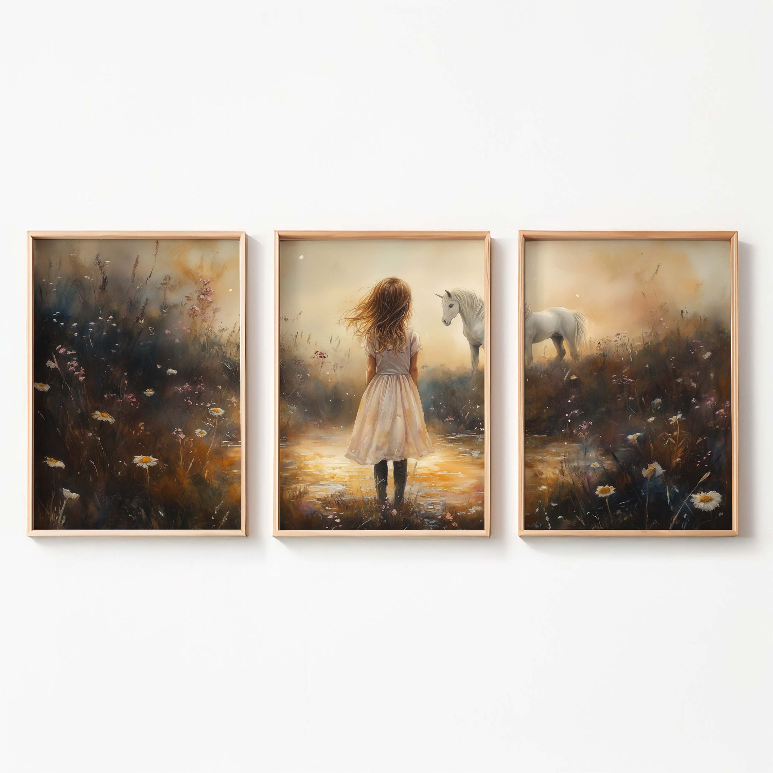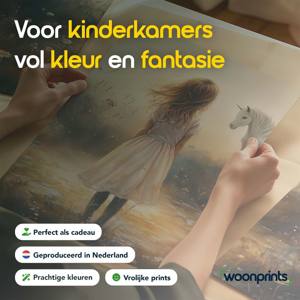 Terug naar collectie / Kinderkamer posters / Dieren posters / Dromerig Meisje en Witte Paard in Pastel Sfeer