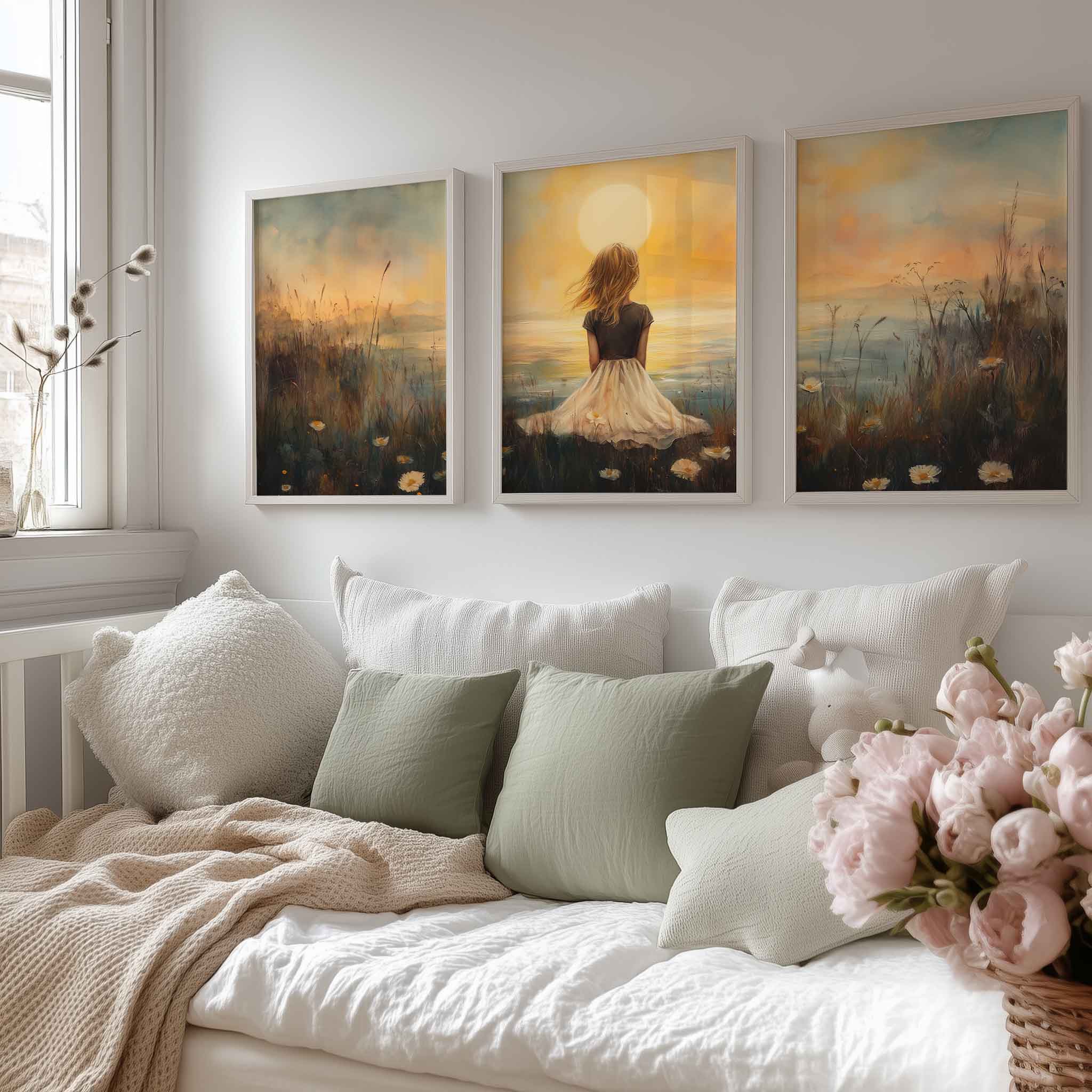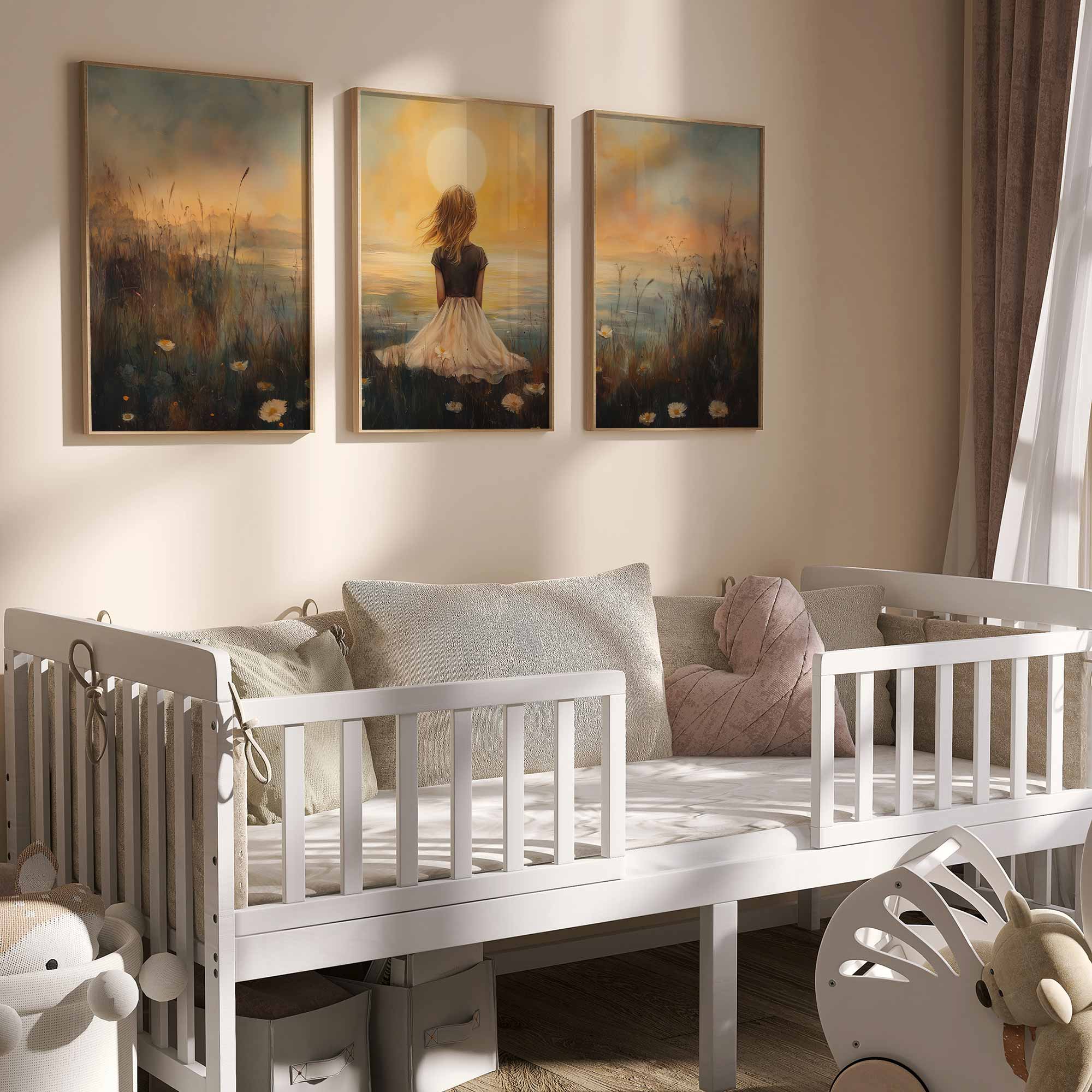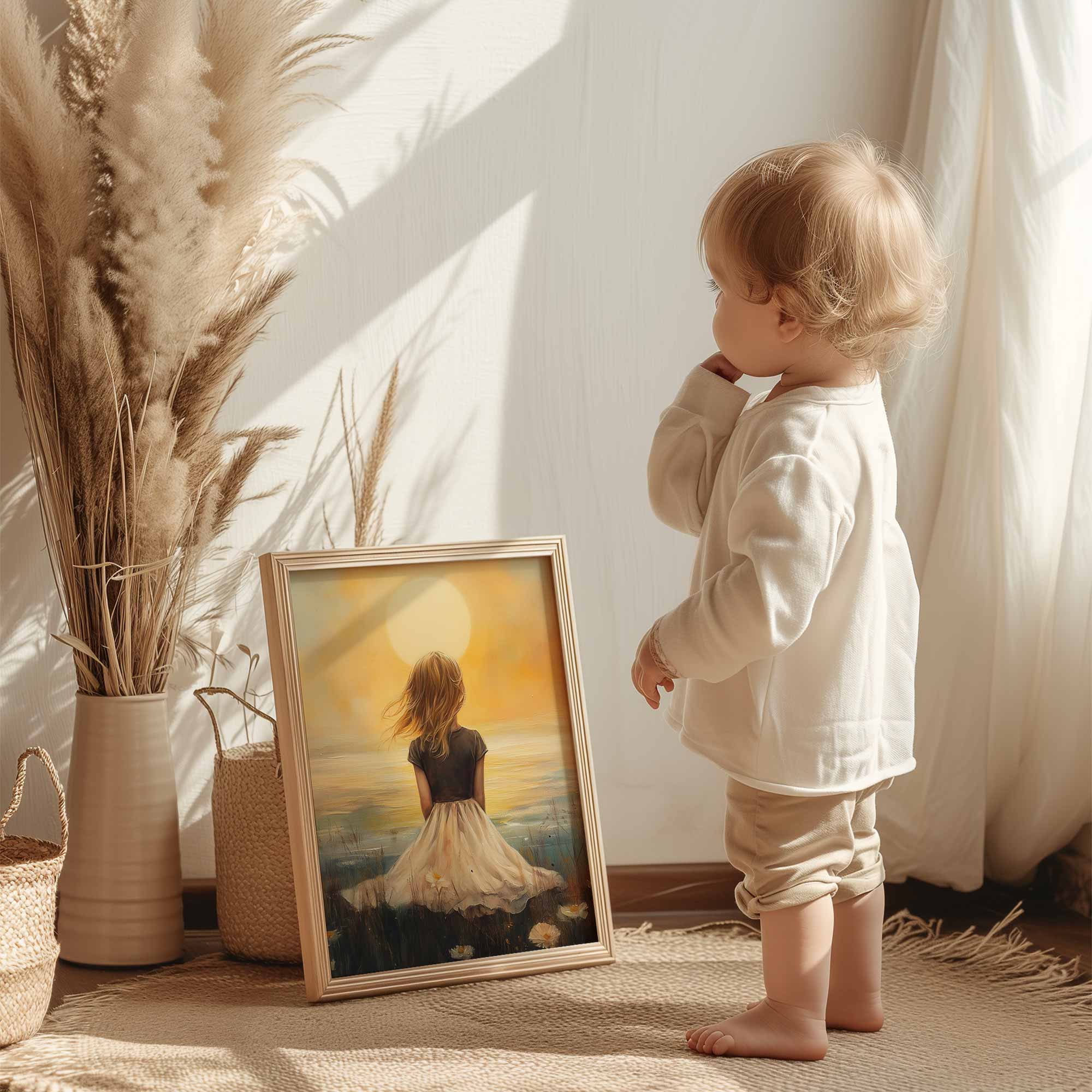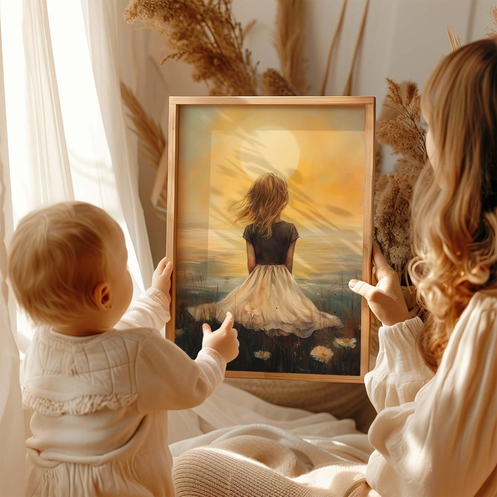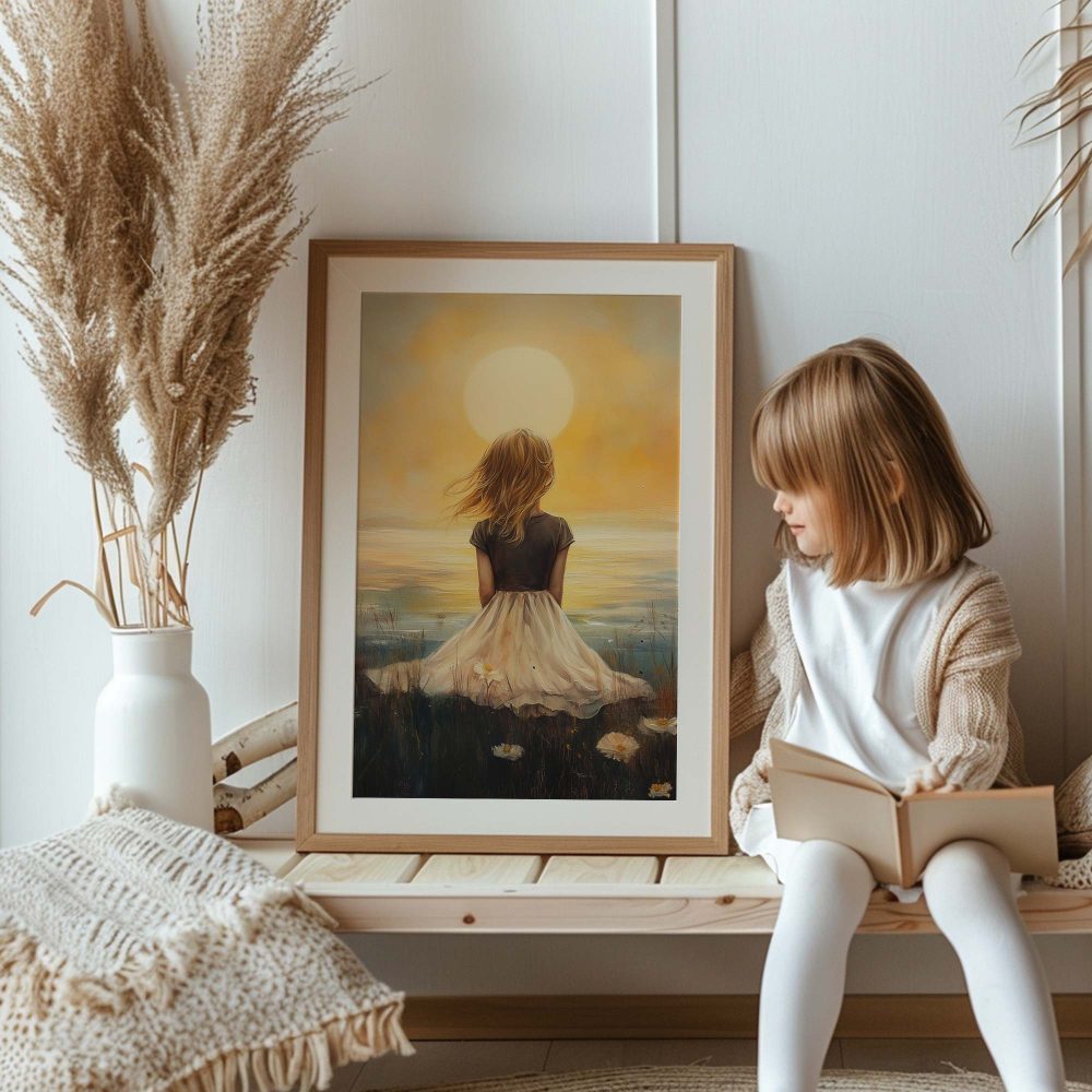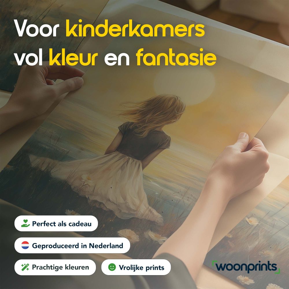 Terug naar collectie / Kinderkamer posters / Bloemen posters / Dromerig Meisje in Bloemenveld aan Zee