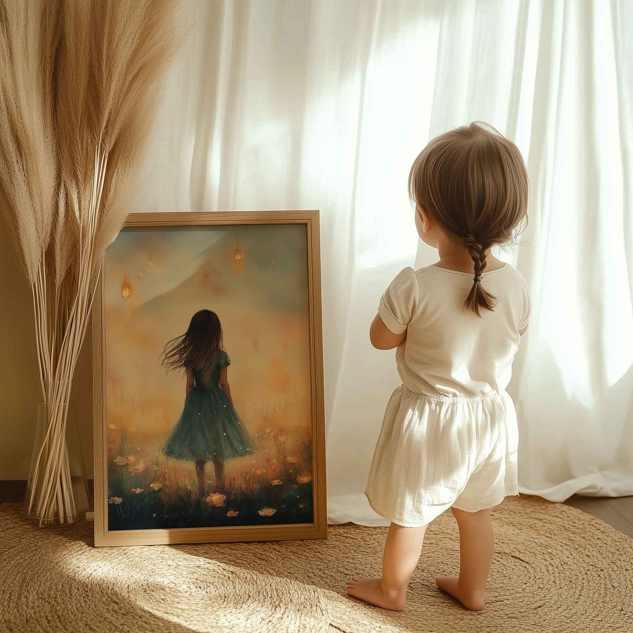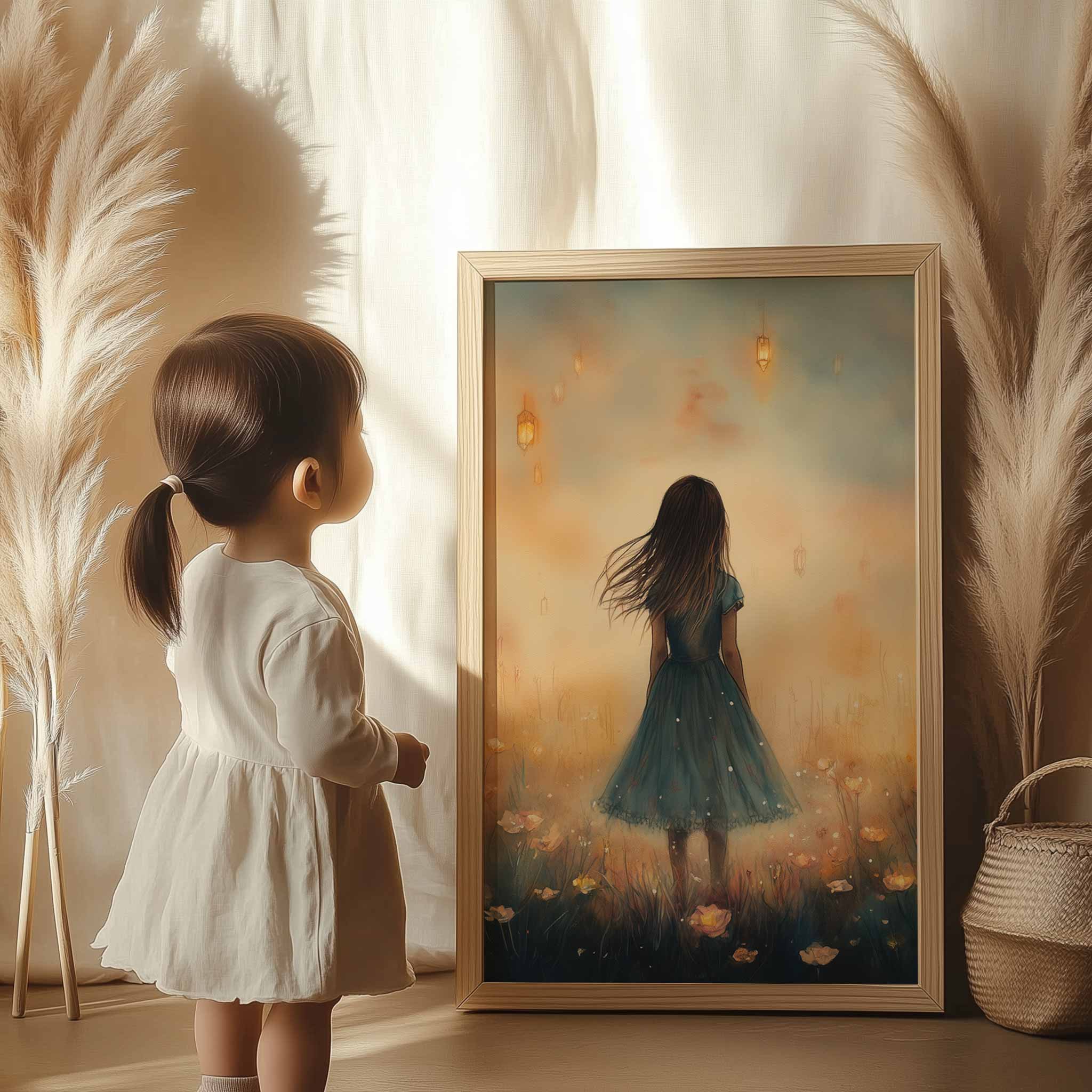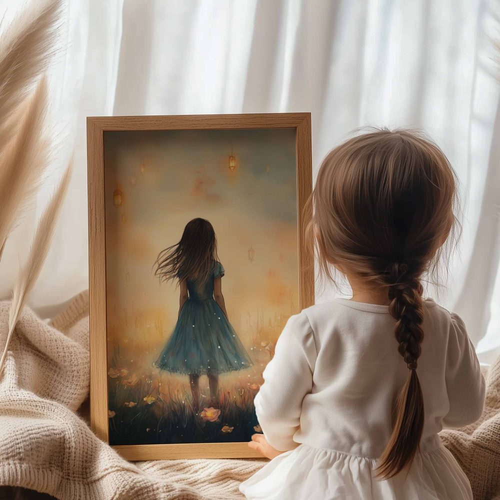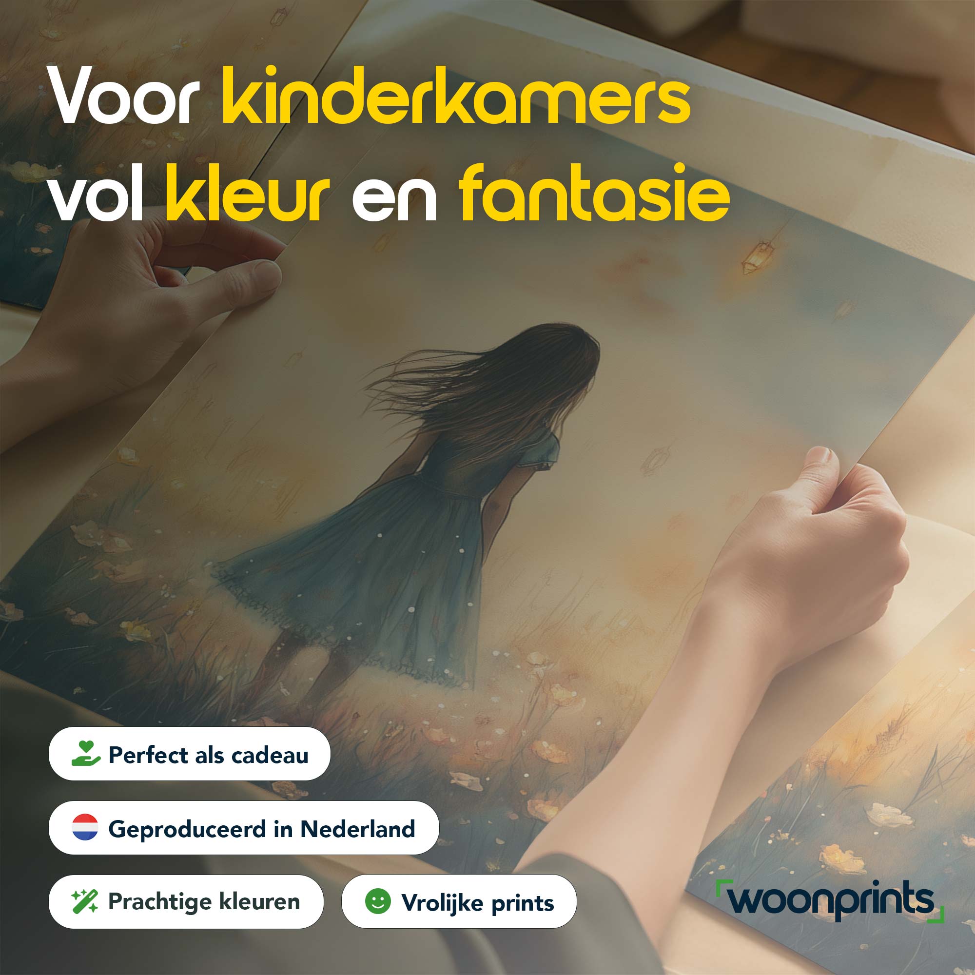 Terug naar collectie / Kinderkamer posters / Bloemen posters / Dromerig Meisje in Bloemenveld – Betoverend Blauw