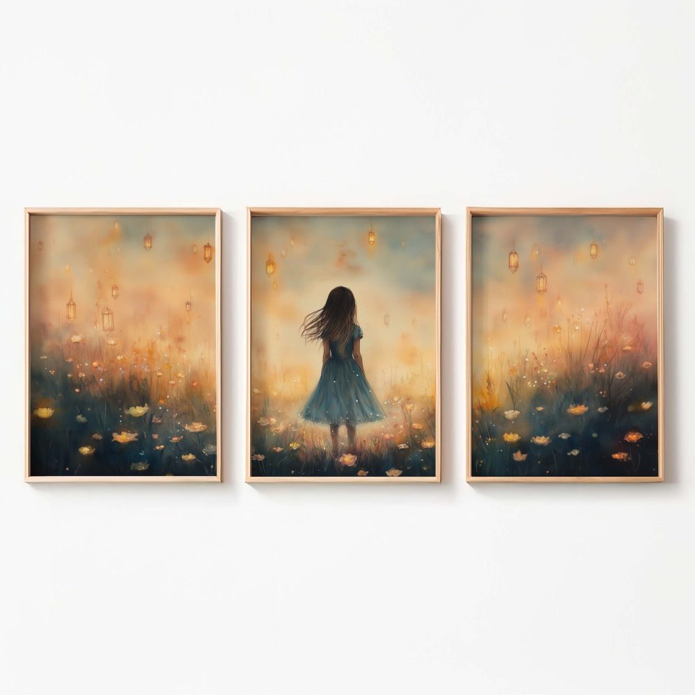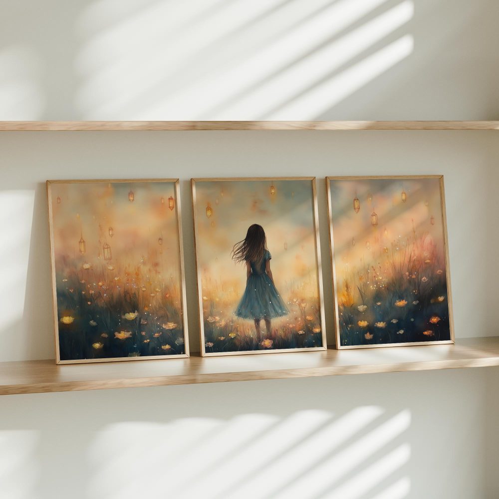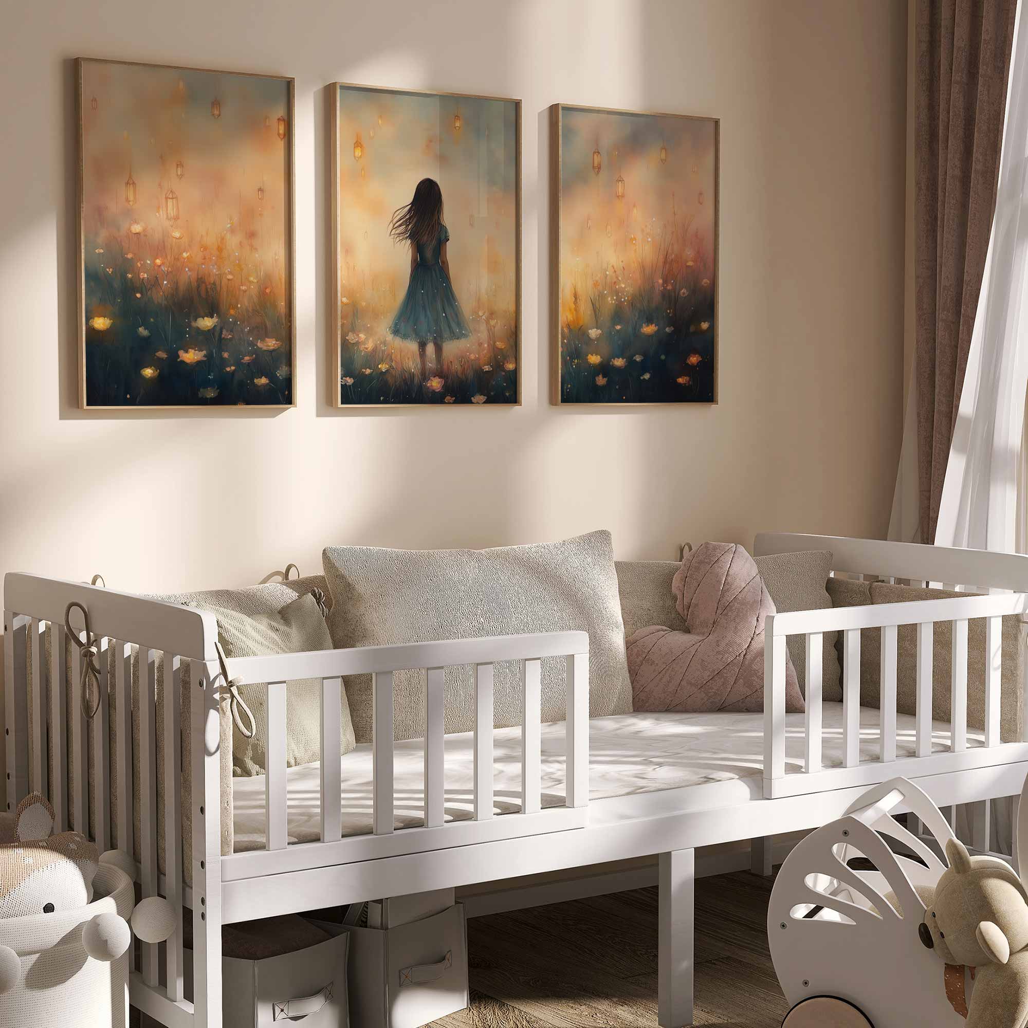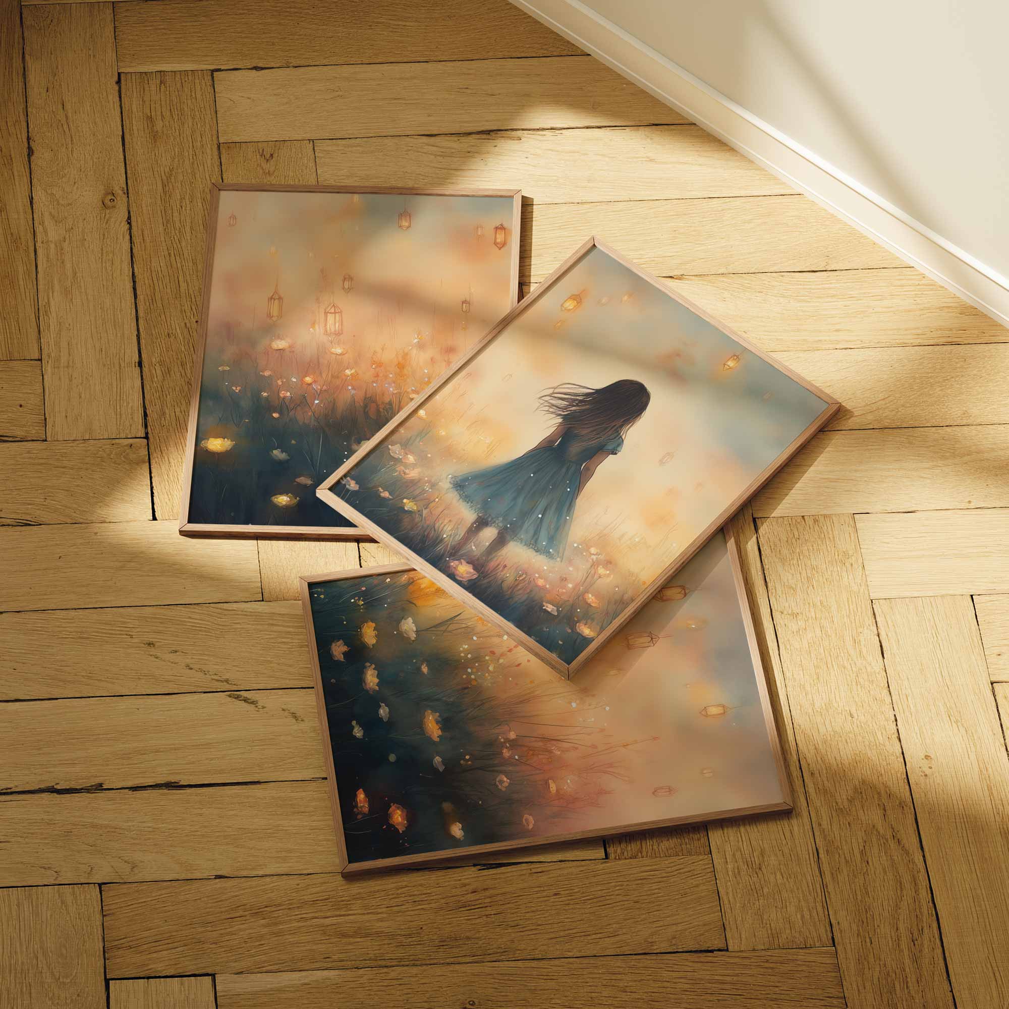 Terug naar collectie / Kinderkamer posters / Bloemen posters / Dromerig Meisje in Bloemenveld – Betoverend Blauw