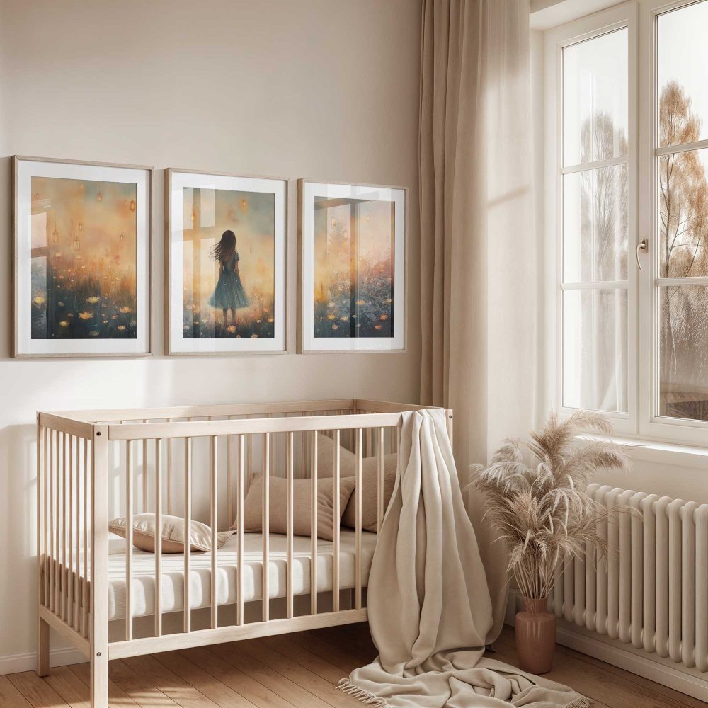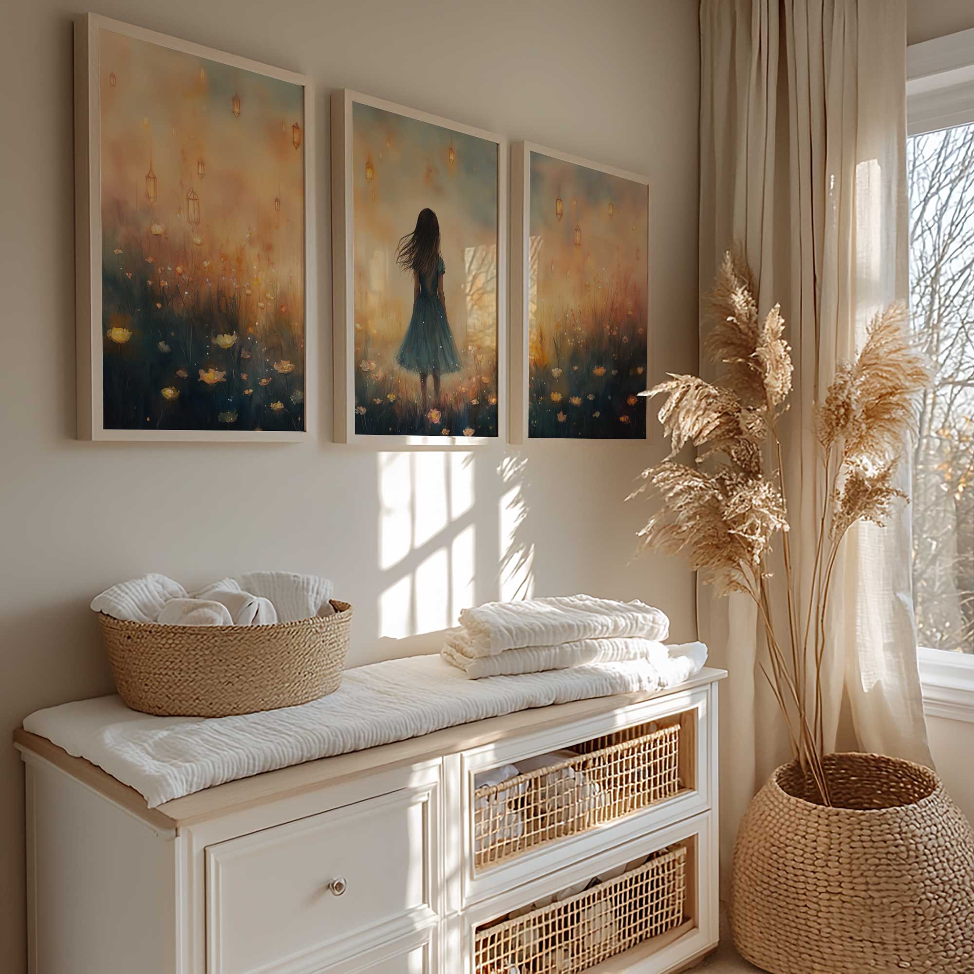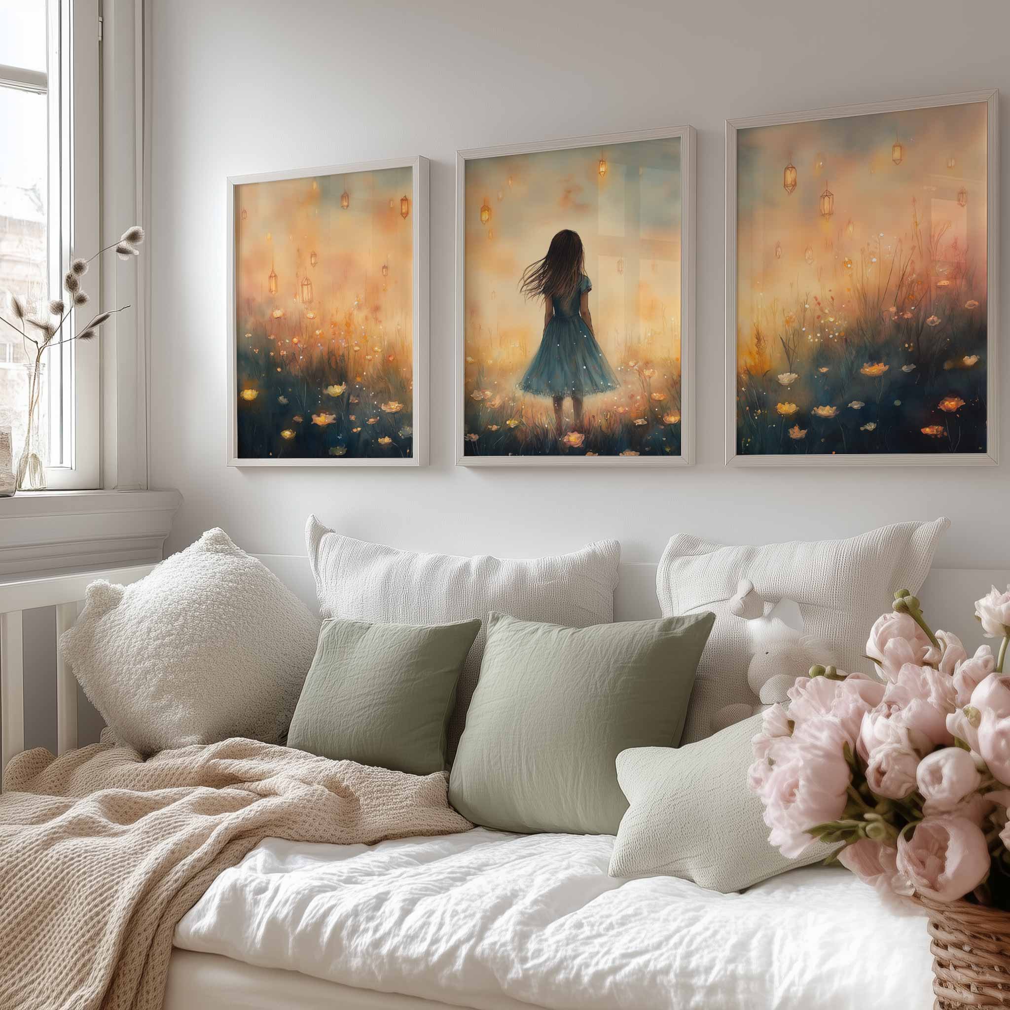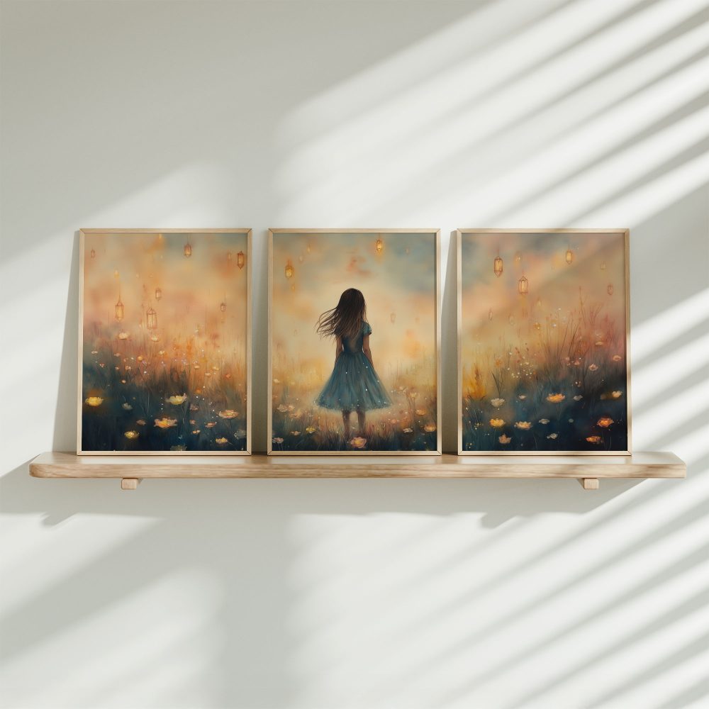Terug naar collectie / Kinderkamer posters / Bloemen posters / Dromerig Meisje in Bloemenveld – Betoverend Blauw
