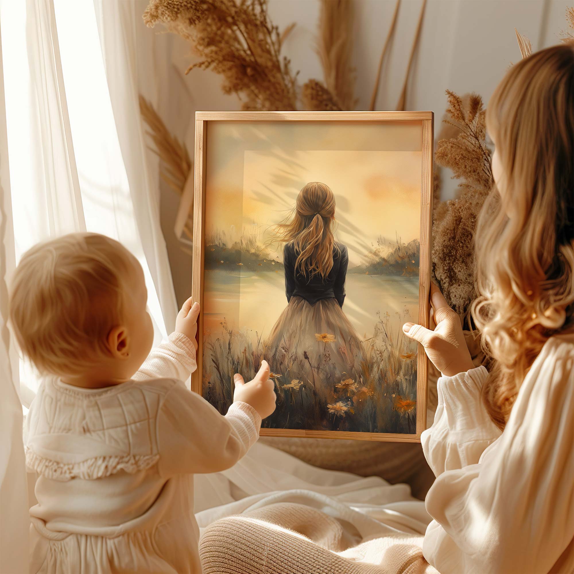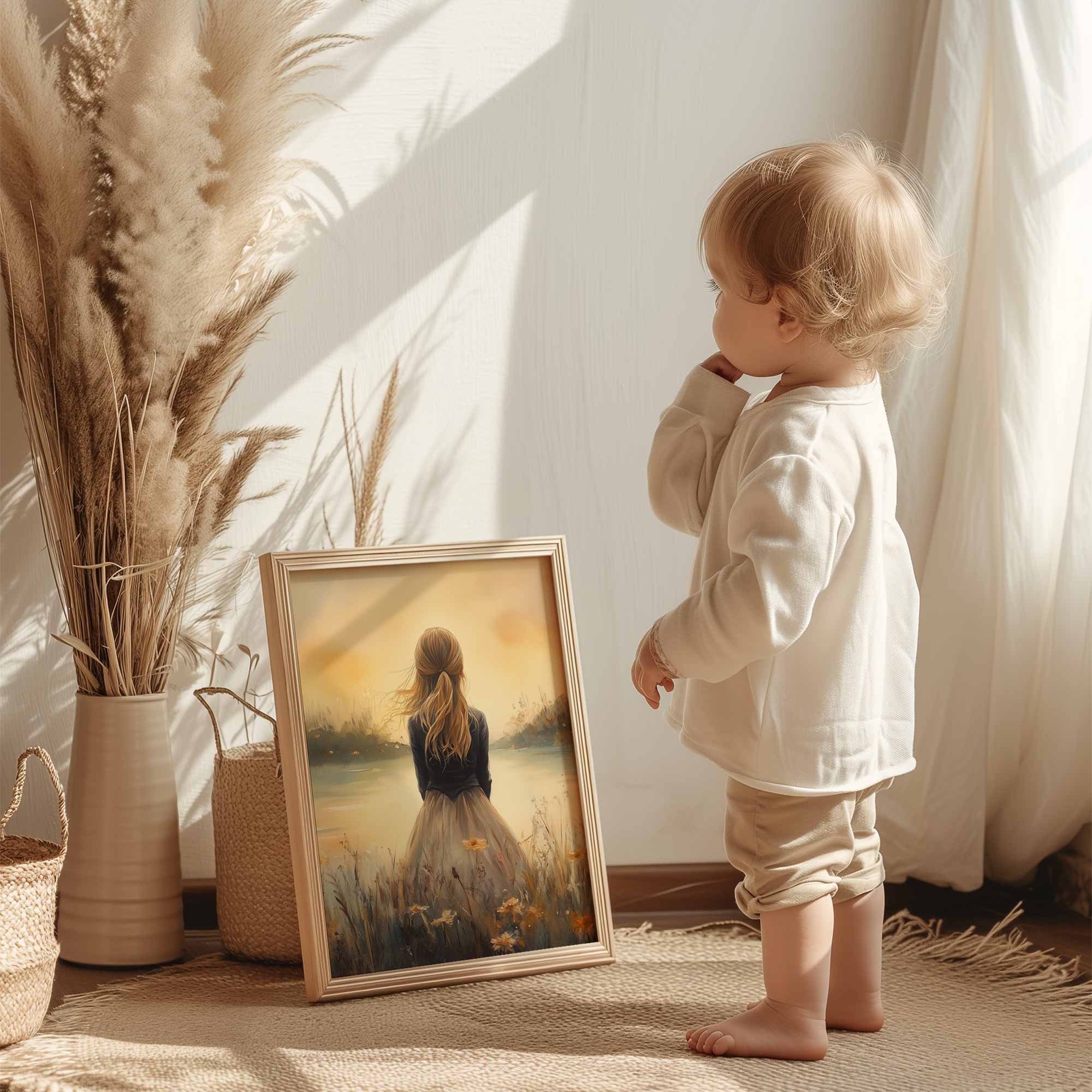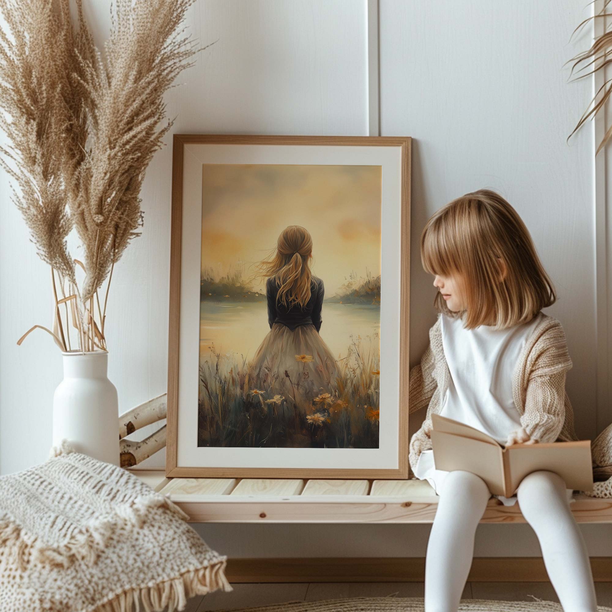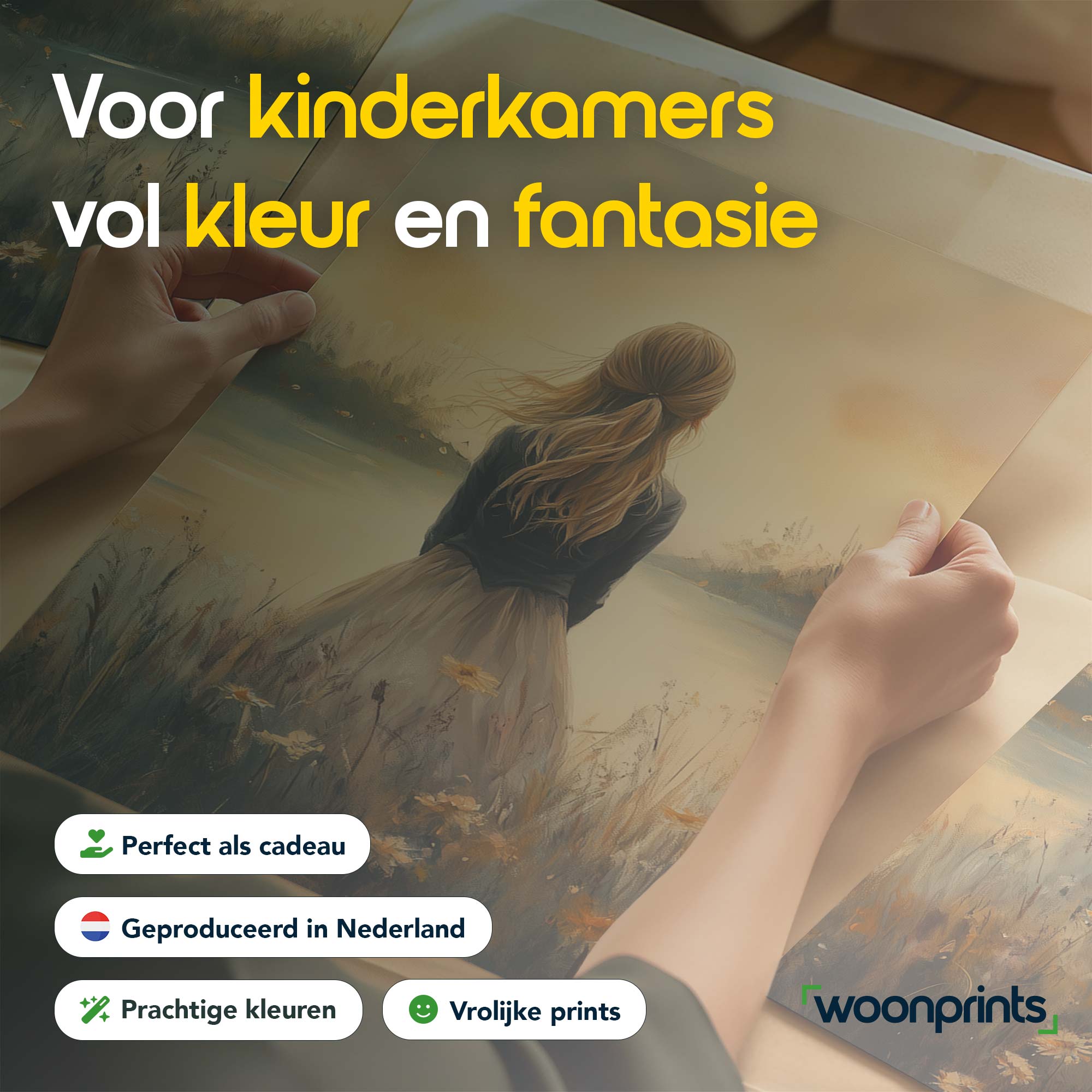 Terug naar collectie / Kinderkamer posters / Bloemen posters / Dromerig Meisje in Bloemenveld bij het Meer