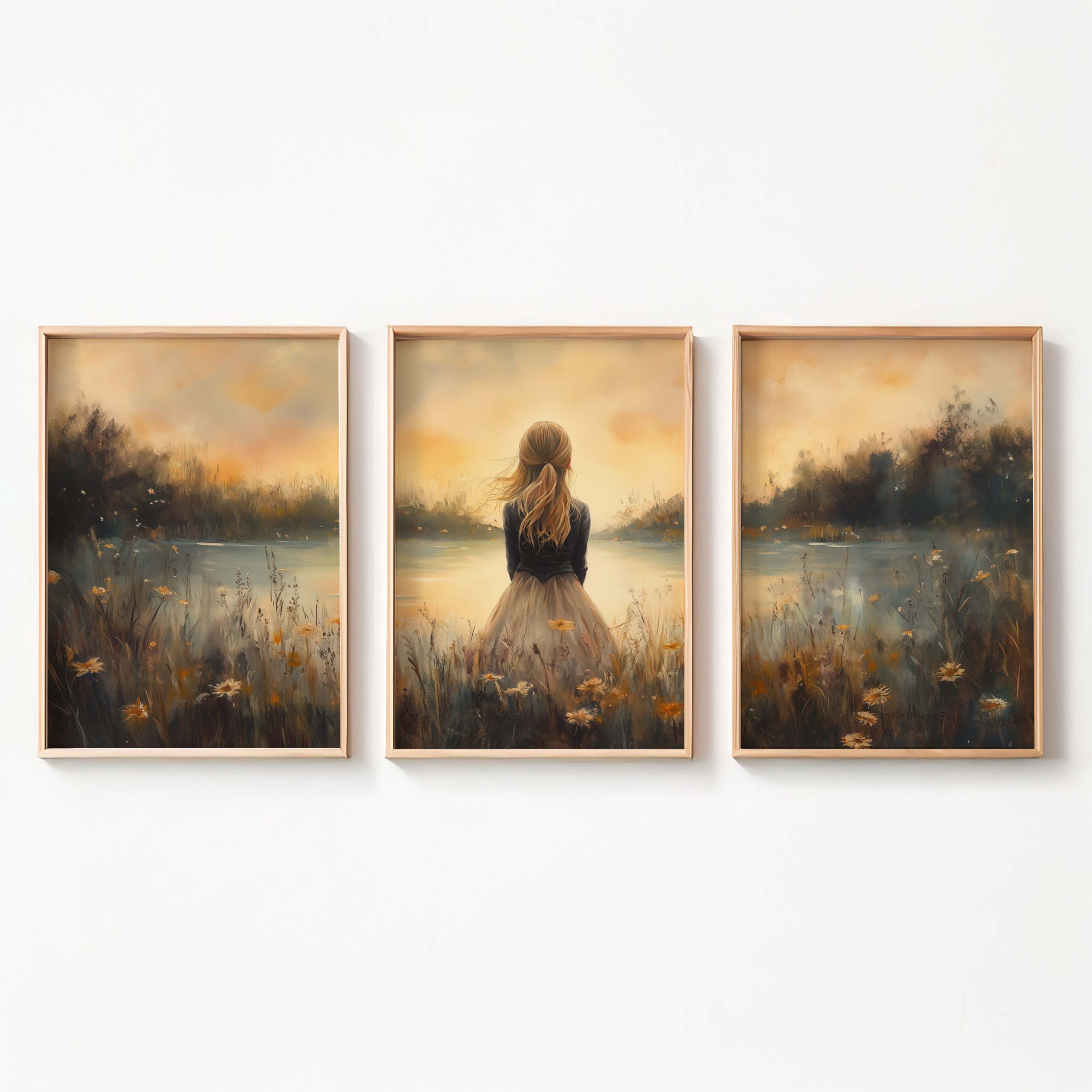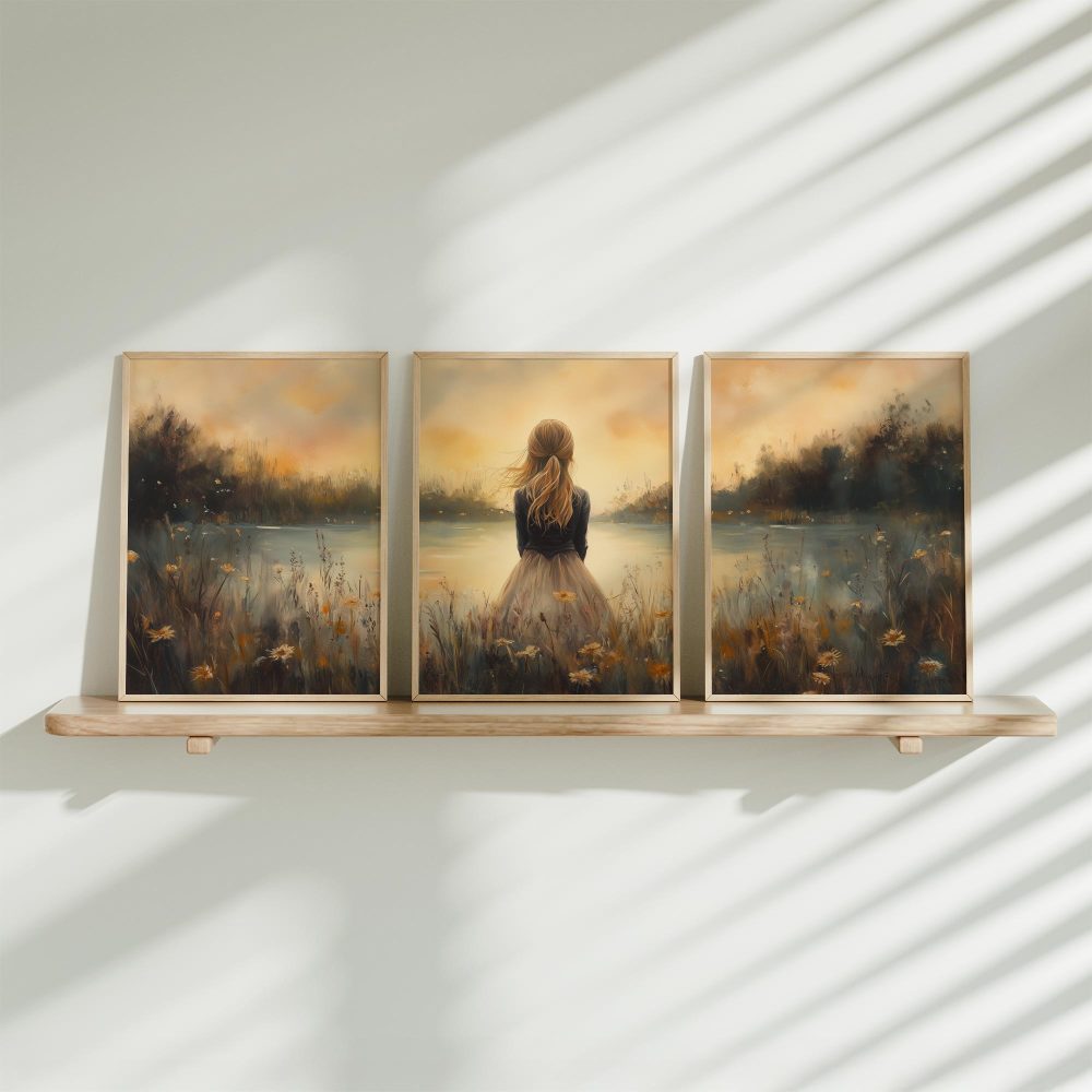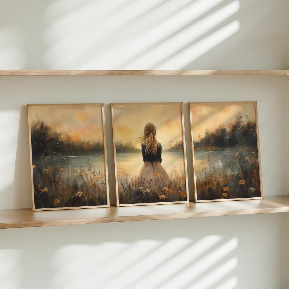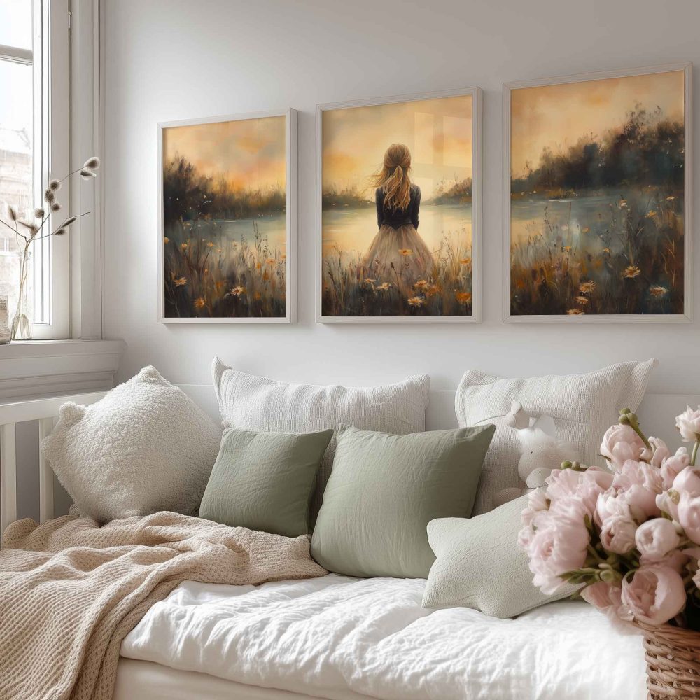 Terug naar collectie / Kinderkamer posters / Bloemen posters / Dromerig Meisje in Bloemenveld bij het Meer