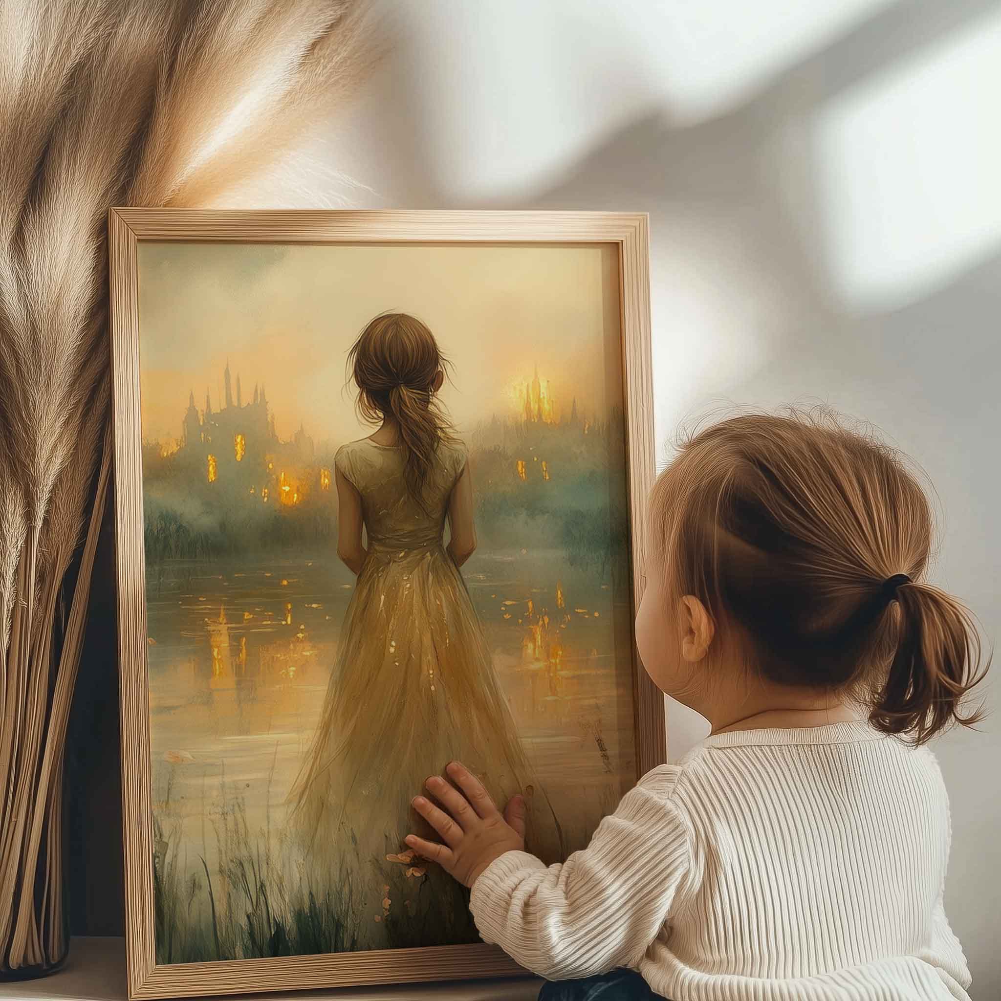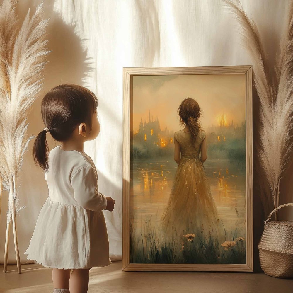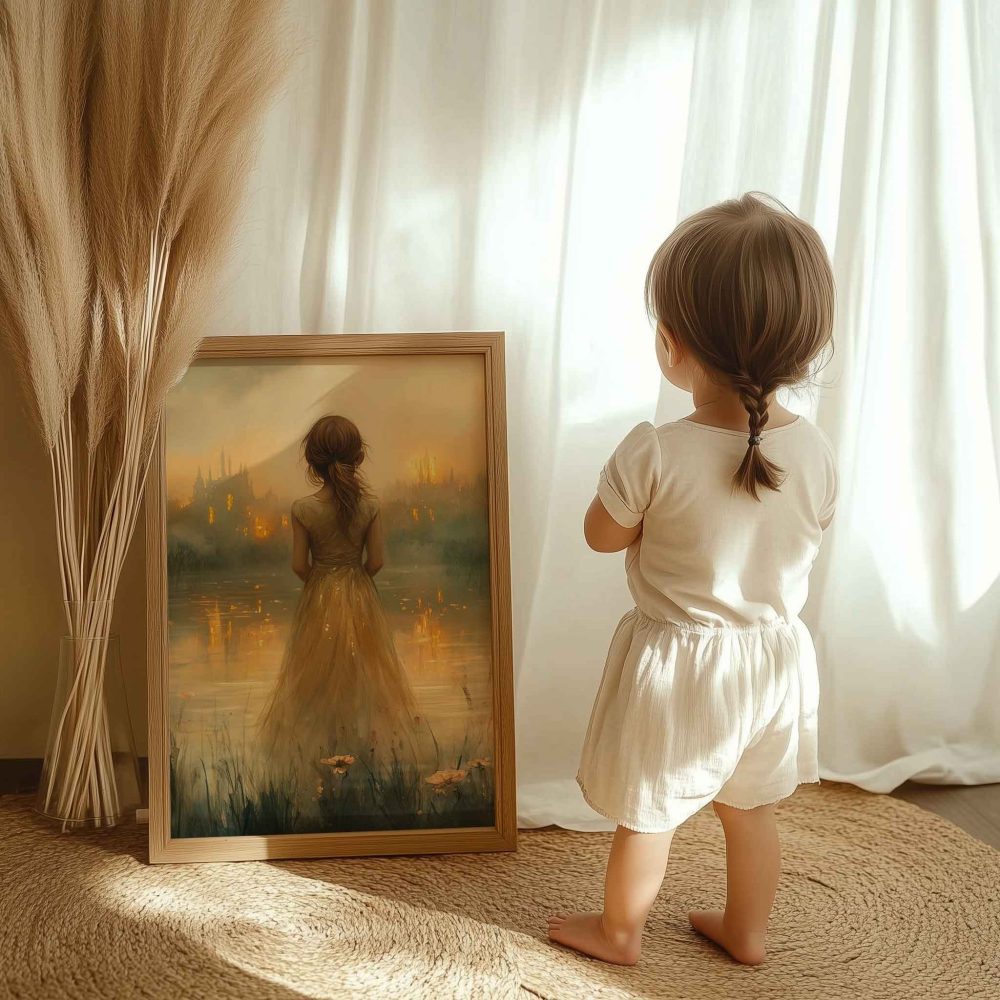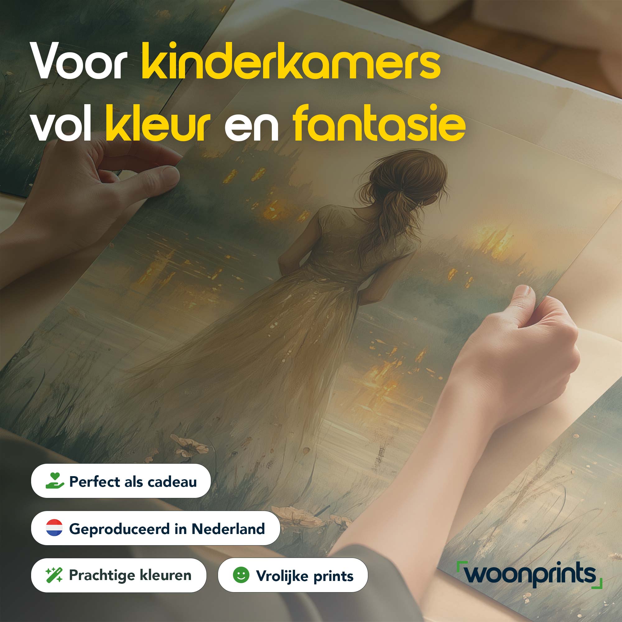 Terug naar collectie / Kinderkamer posters / Bloemen posters / Dromerig Meisje in Bloemenveld bij Water