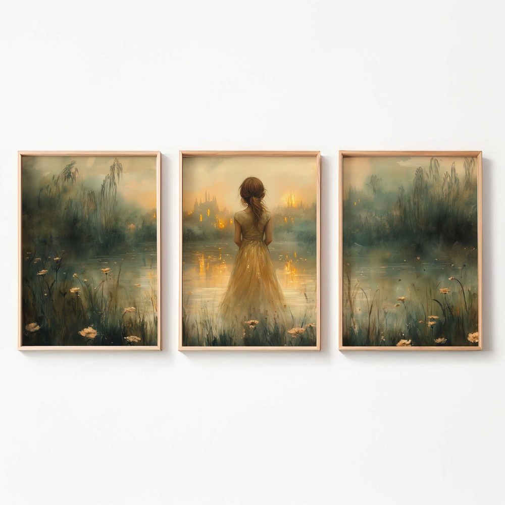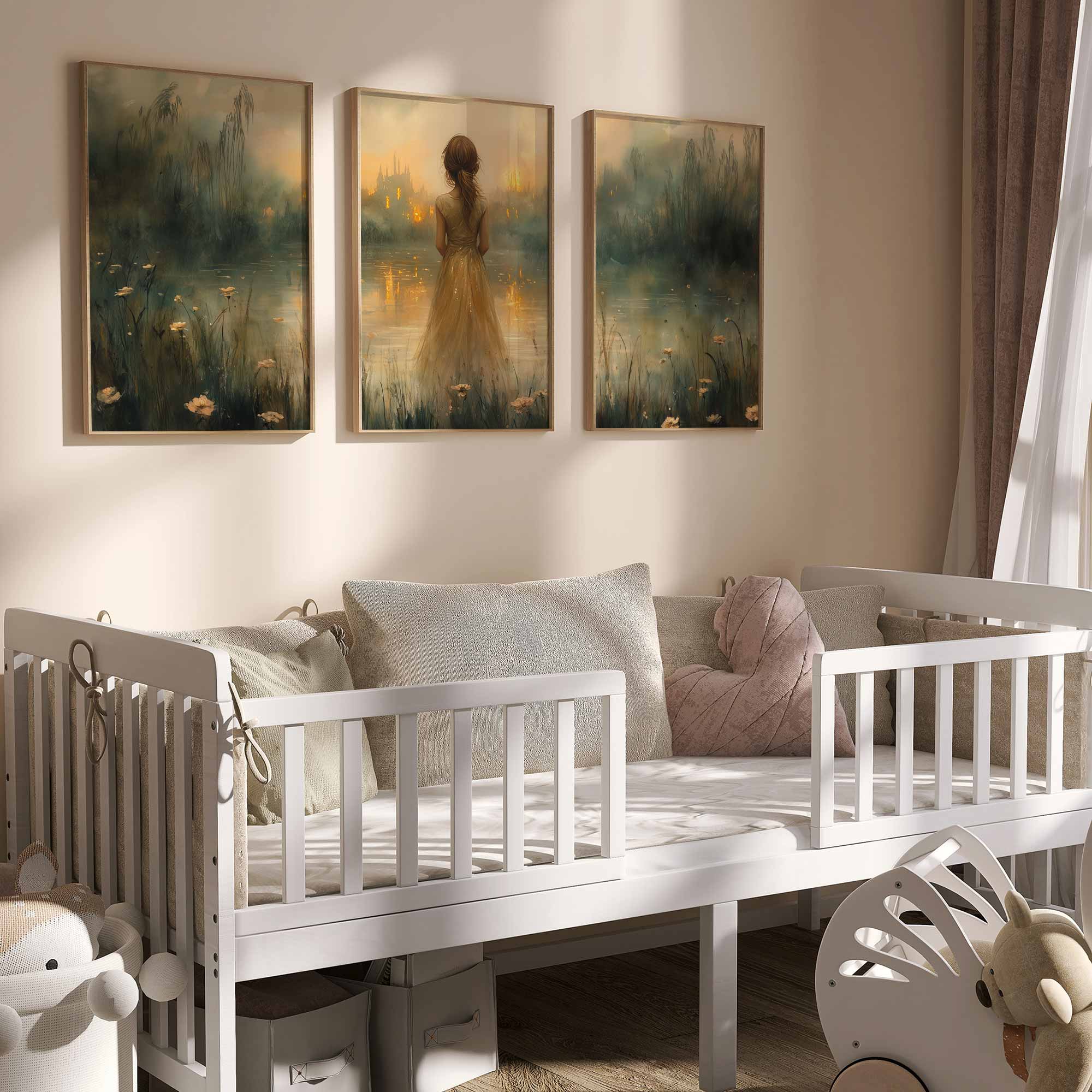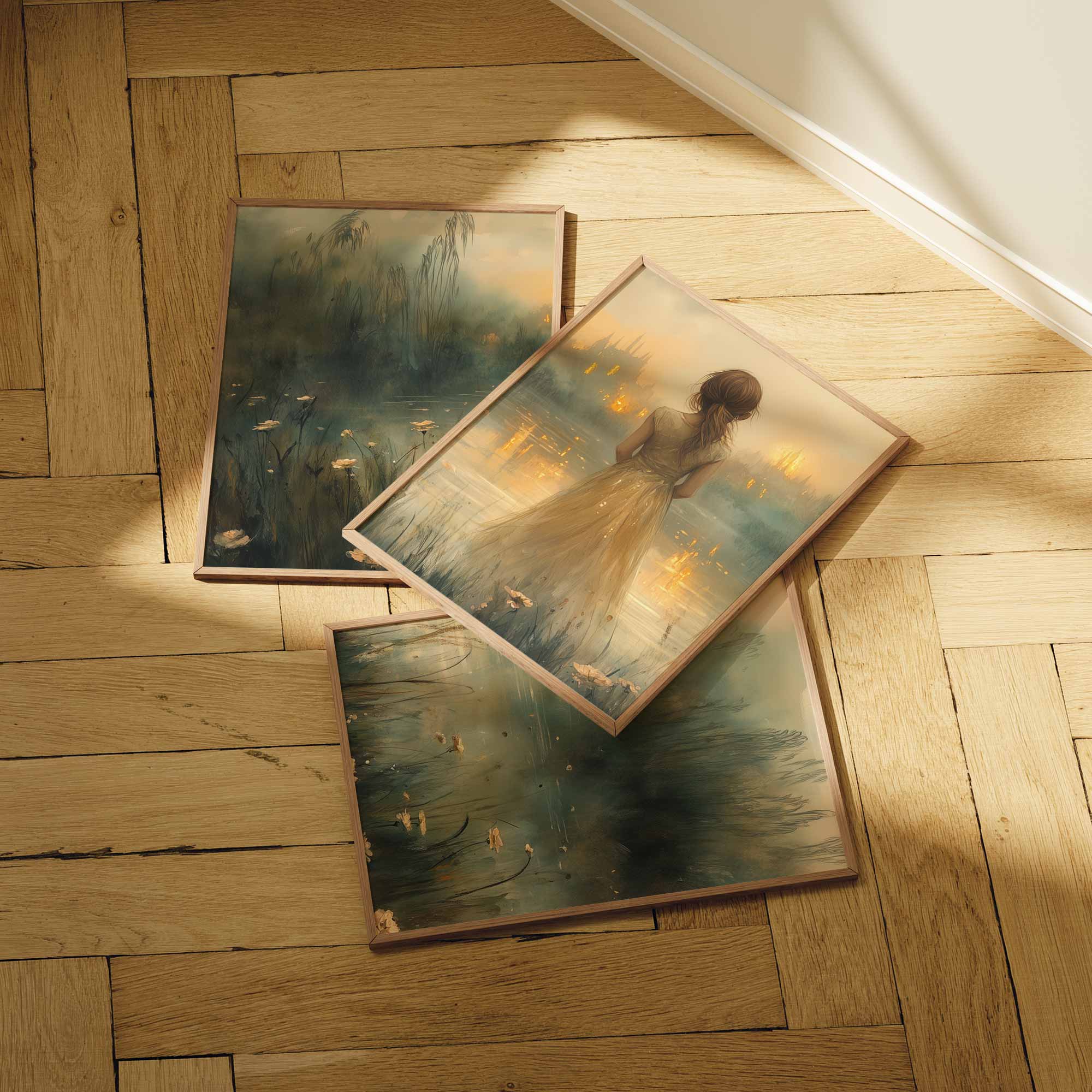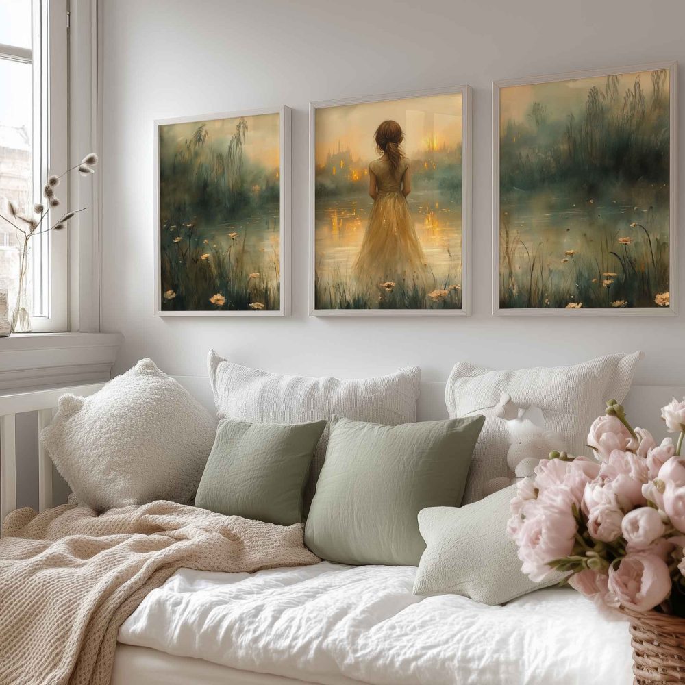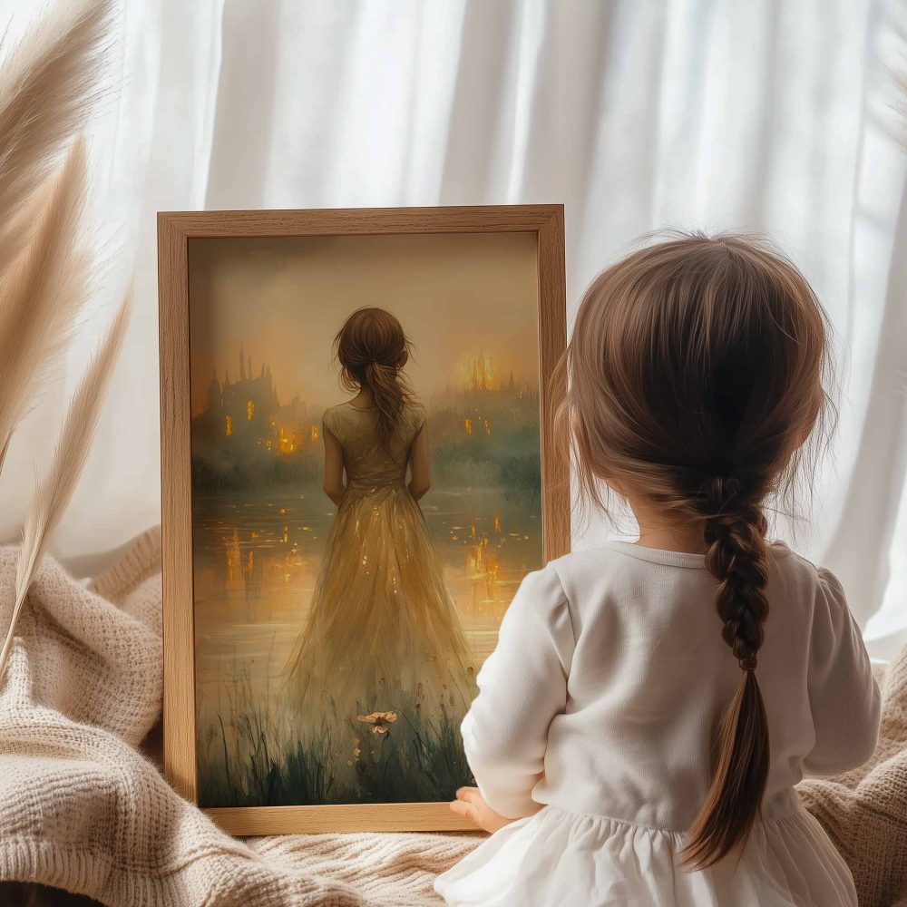 Terug naar collectie / Kinderkamer posters / Bloemen posters / Dromerig Meisje in Bloemenveld bij Water