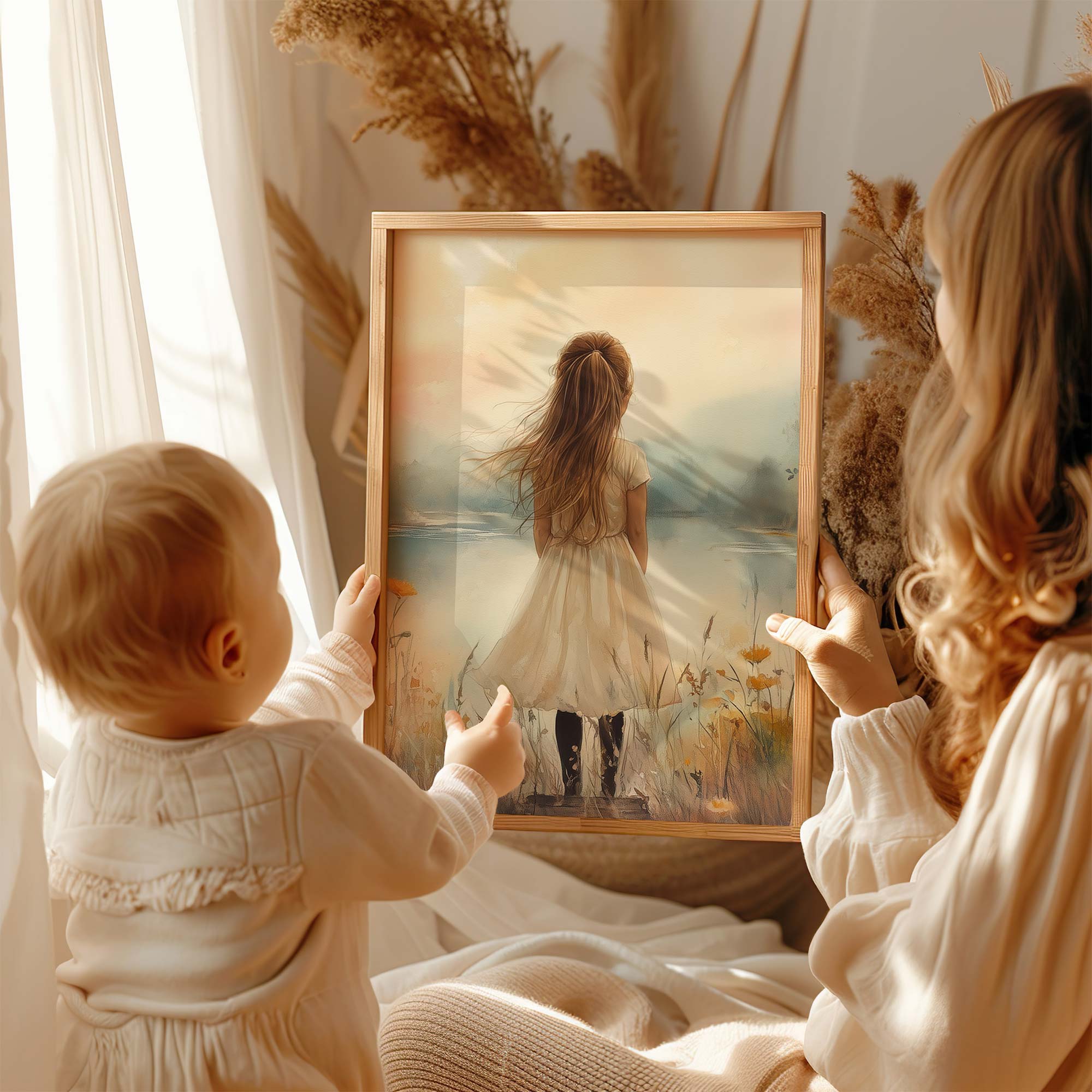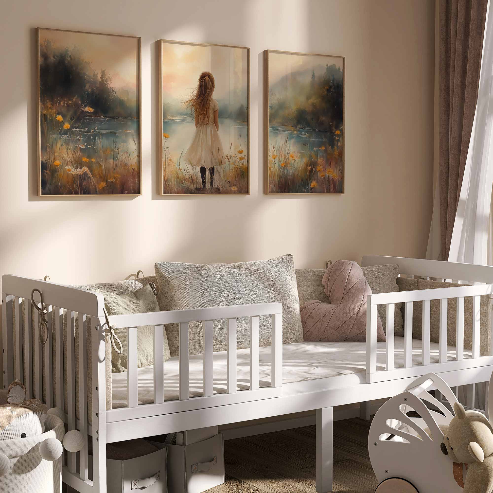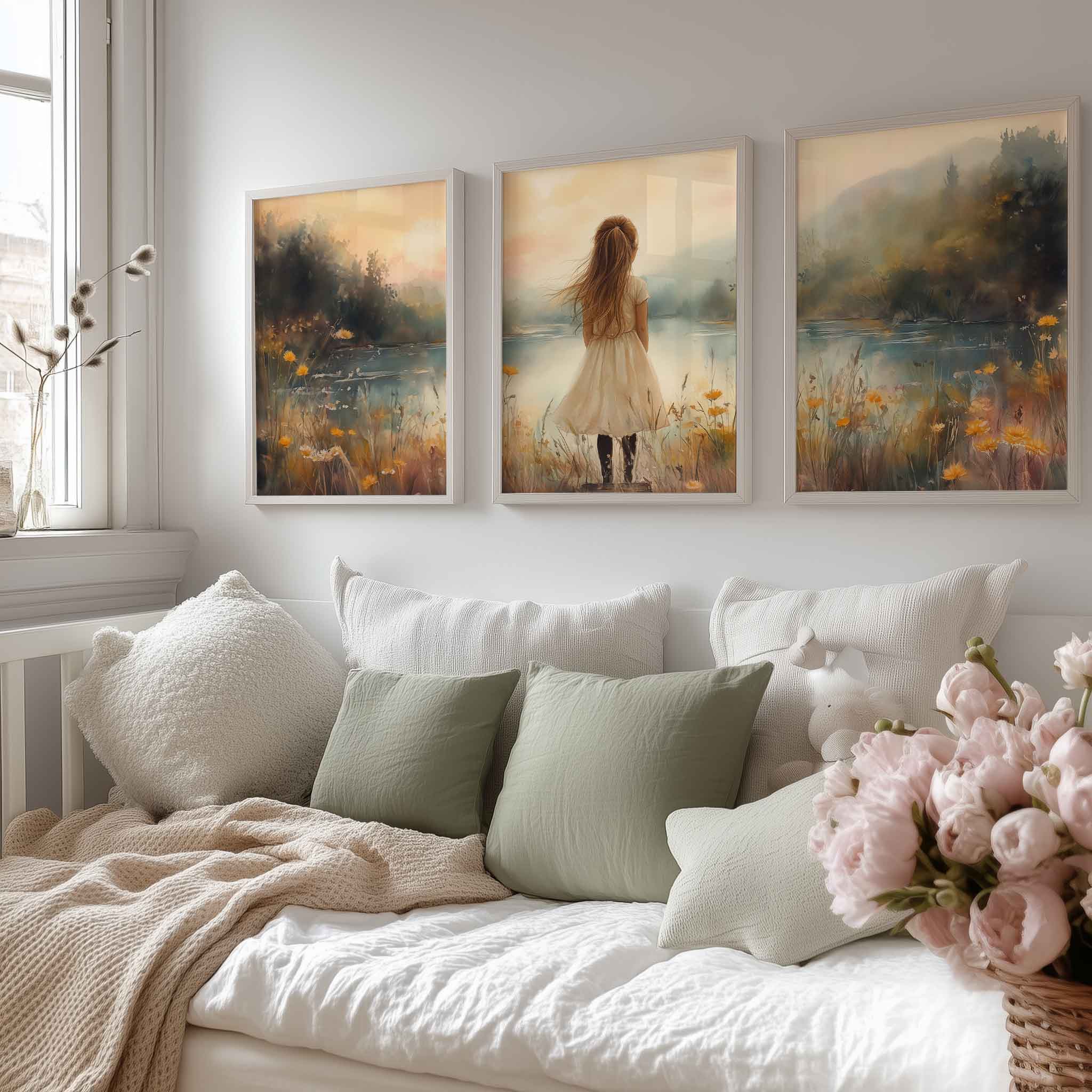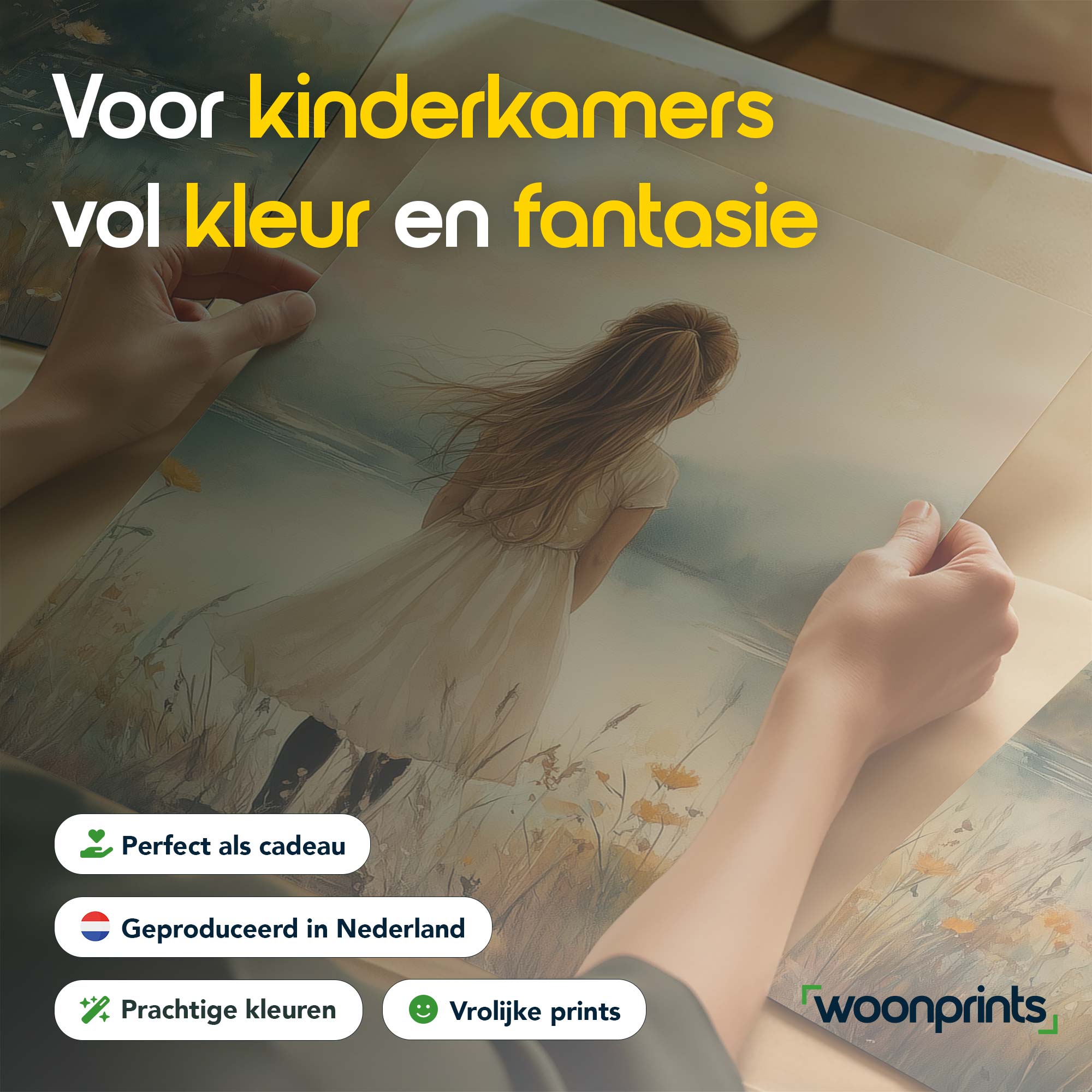 Terug naar collectie / Kinderkamer posters / Bloemen posters / Dromerig Meisje in Bloemenveld bij Water