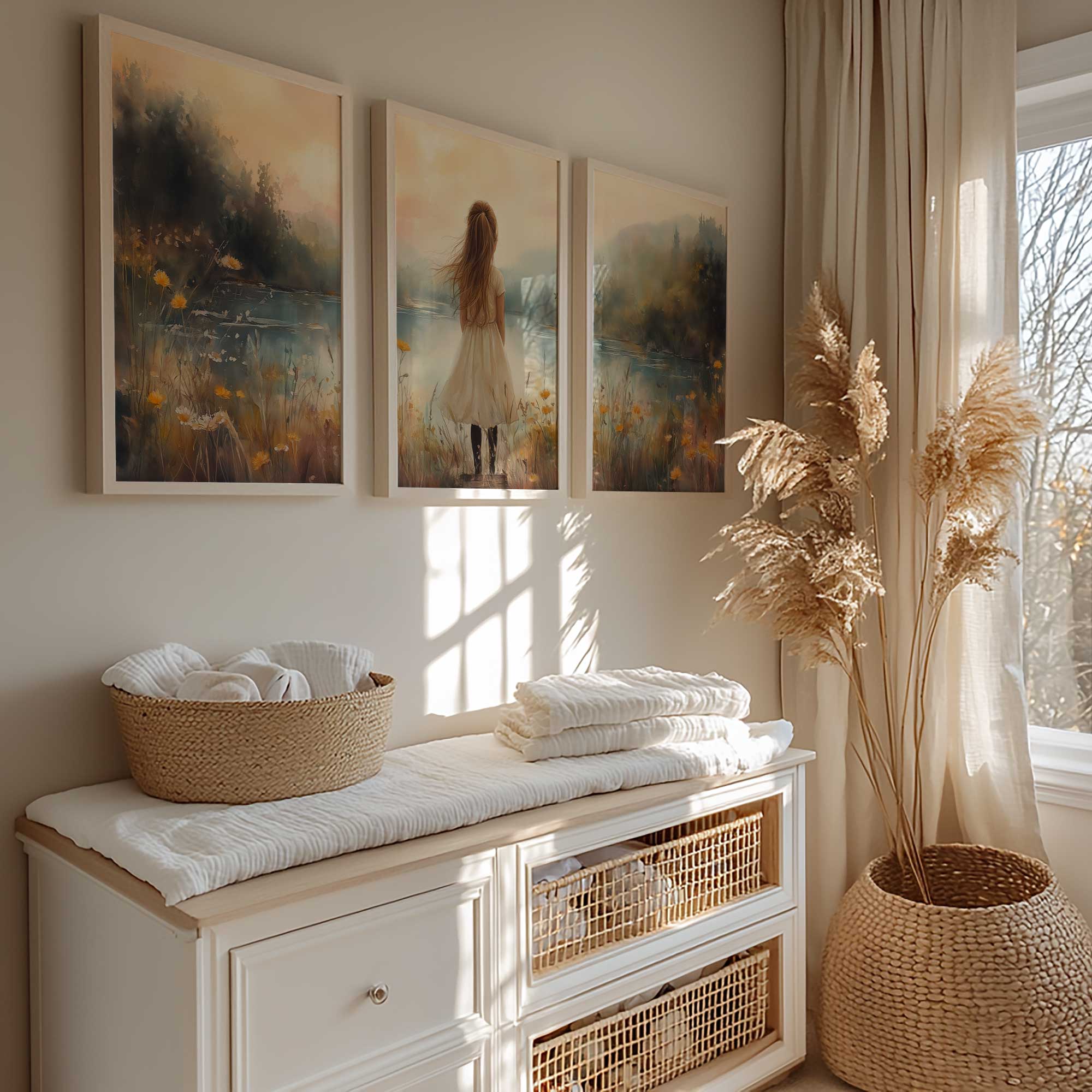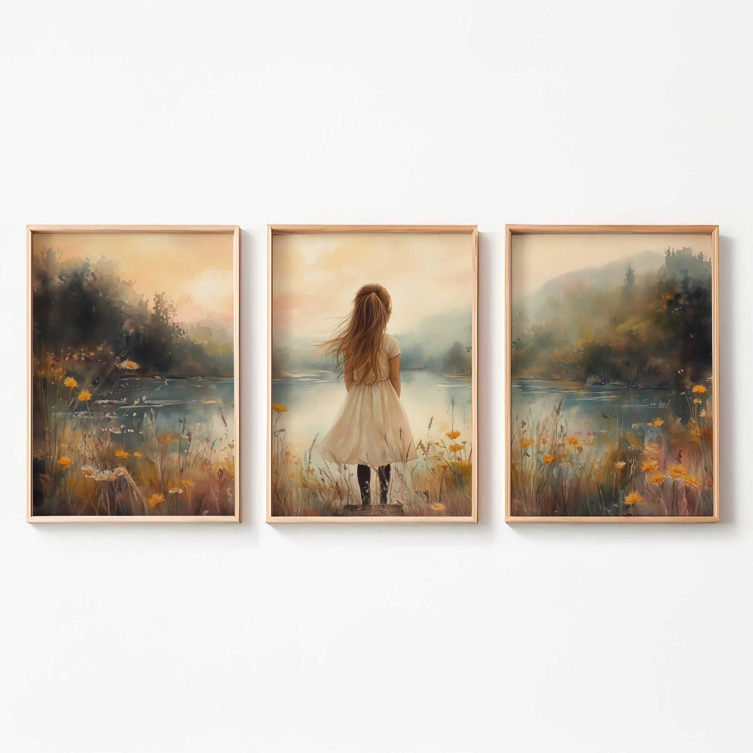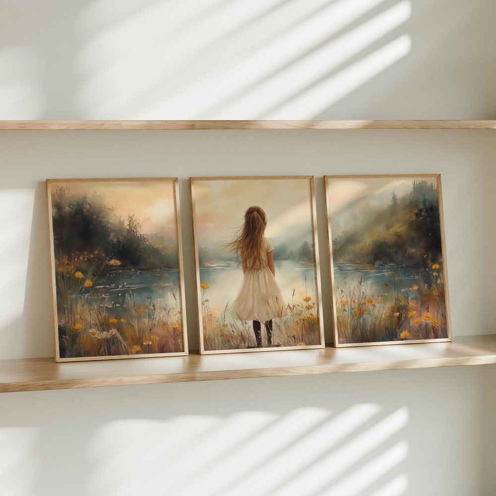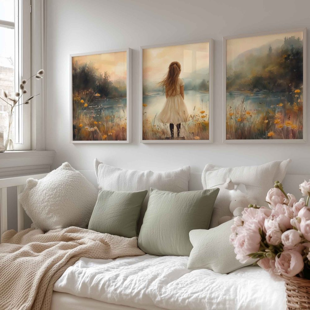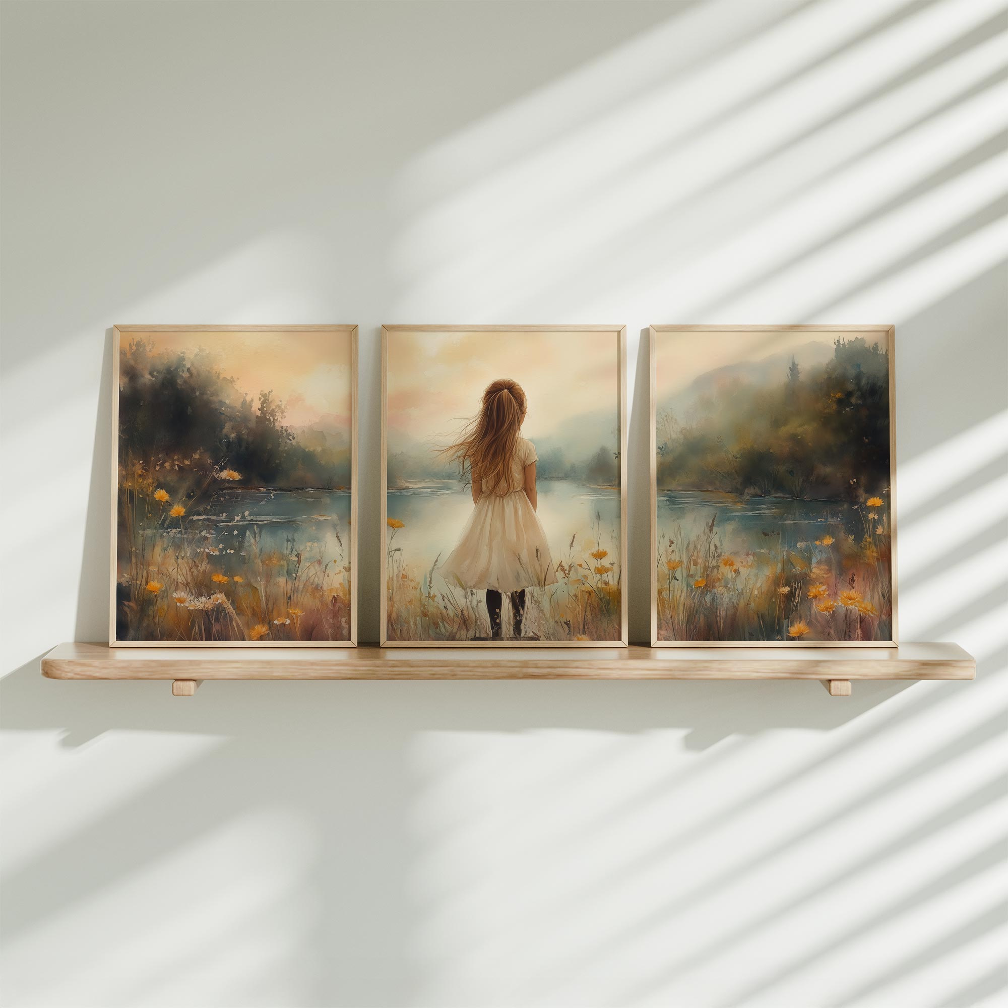 Terug naar collectie / Kinderkamer posters / Bloemen posters / Dromerig Meisje in Bloemenveld bij Water