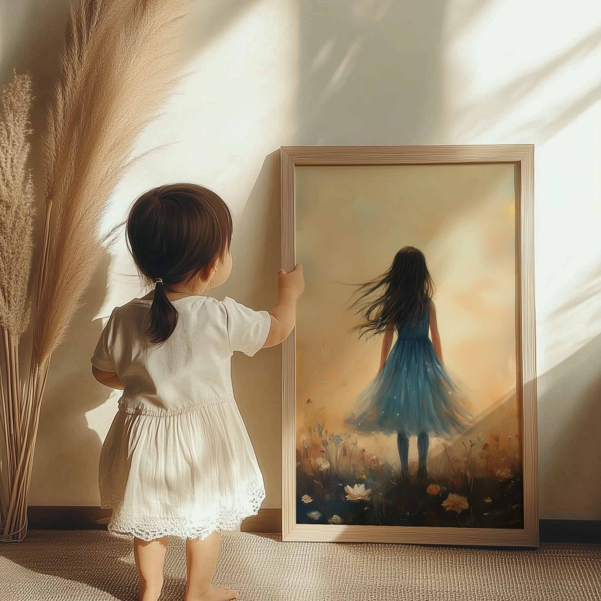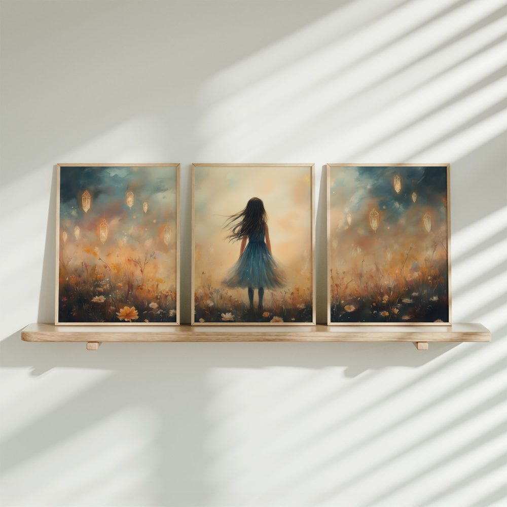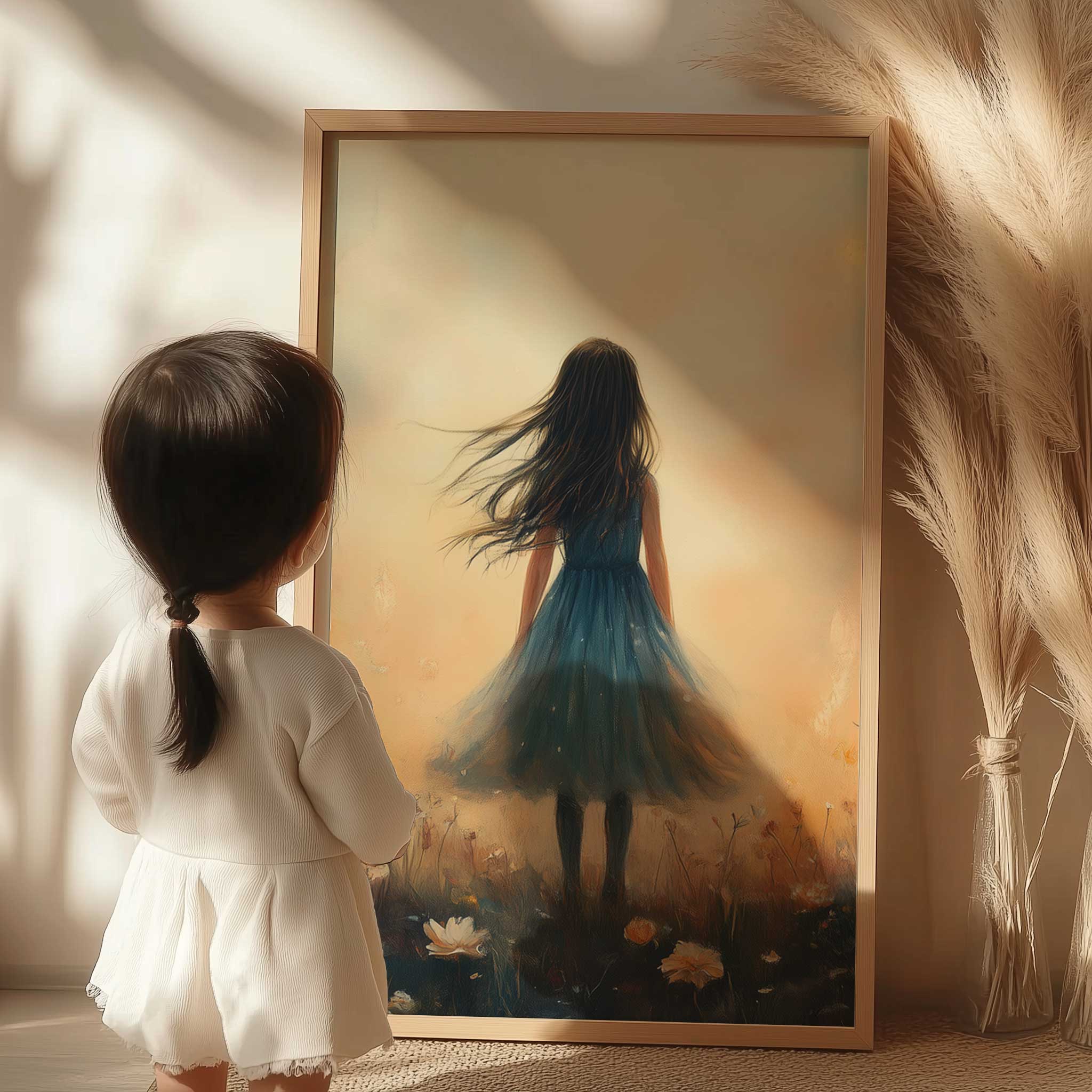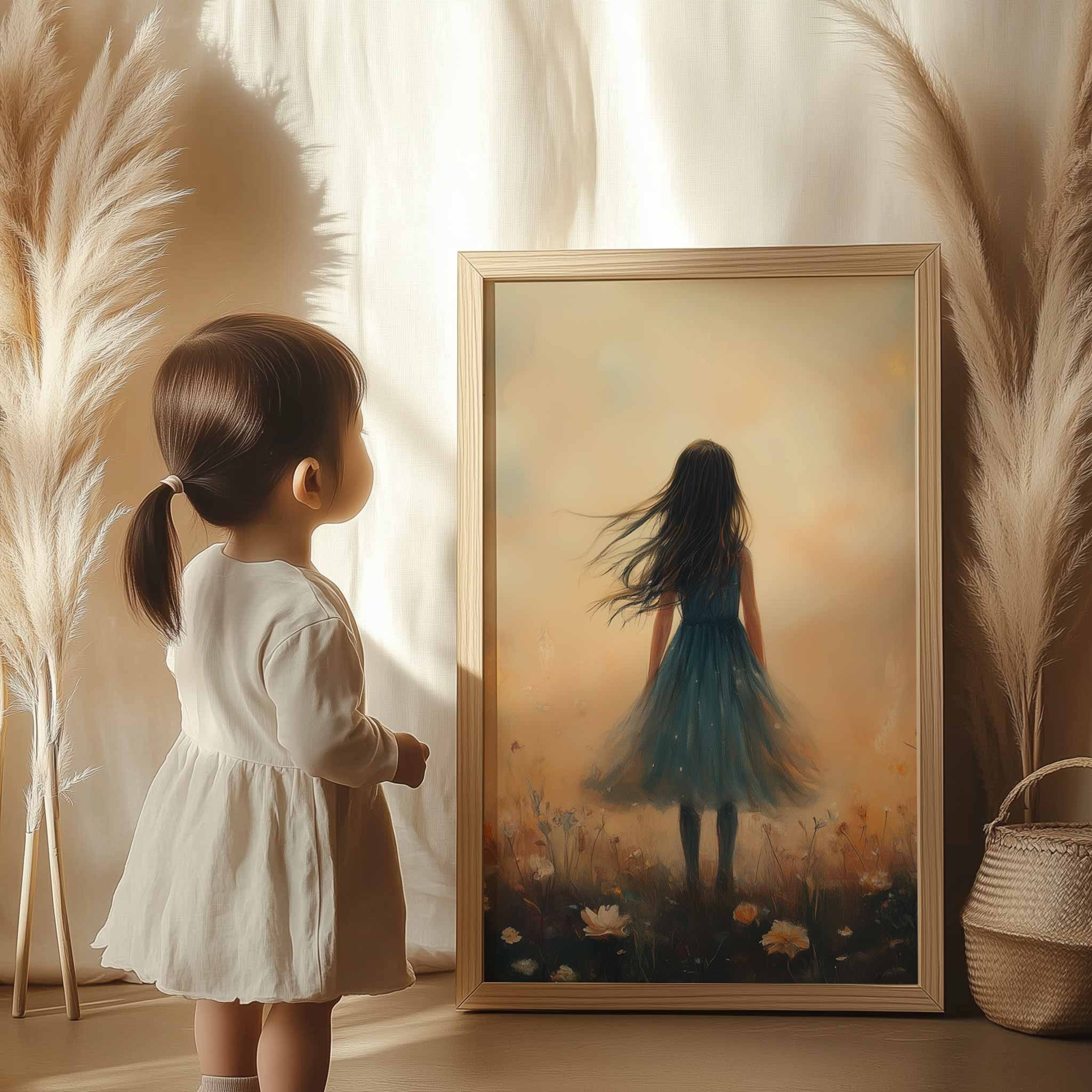 Terug naar collectie / Kinderkamer posters / Bloemen posters / Dromerig Meisje in Bloemenveld – Blauwe Jurk en Zacht Briesje