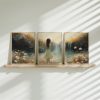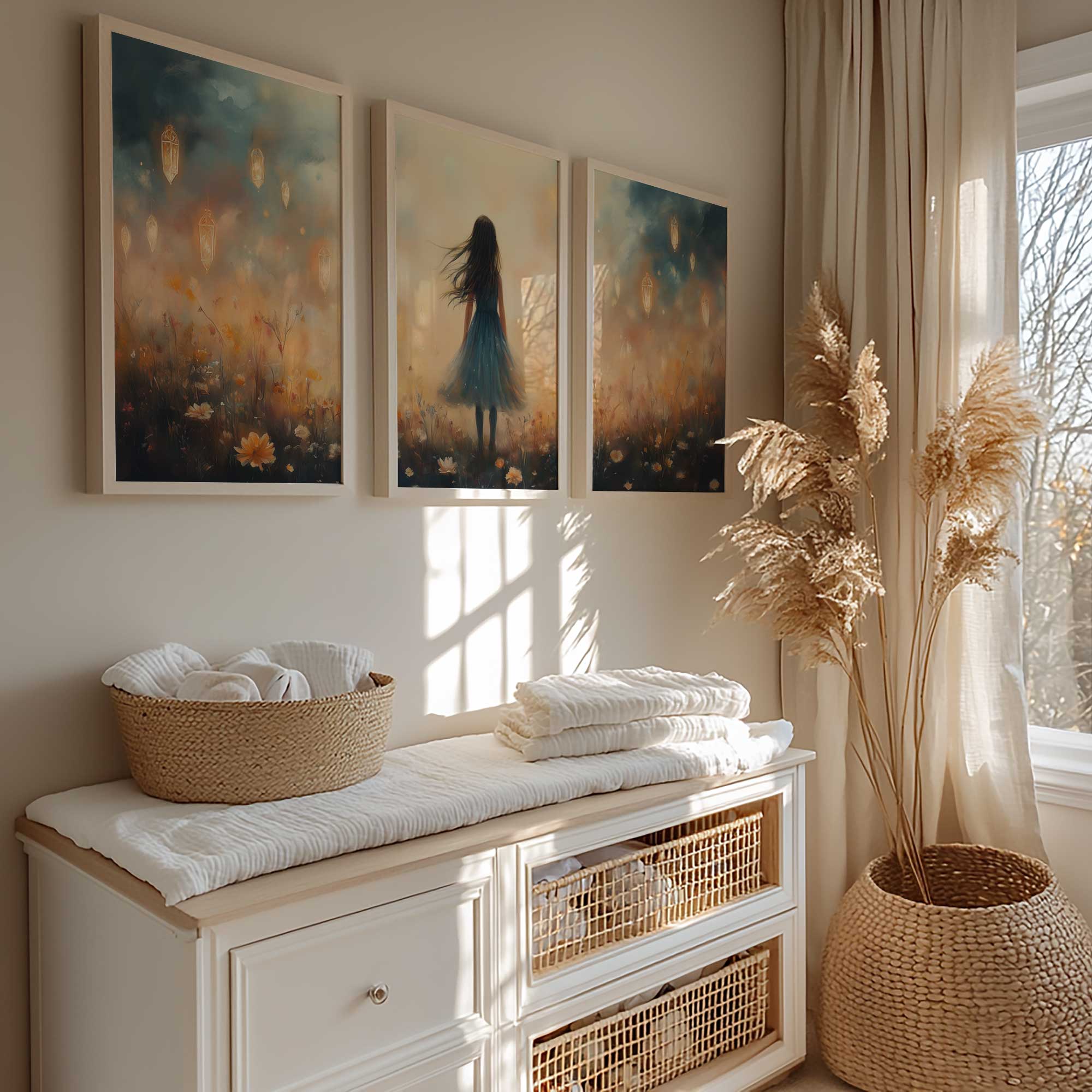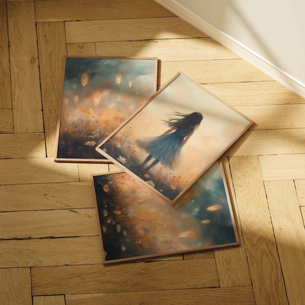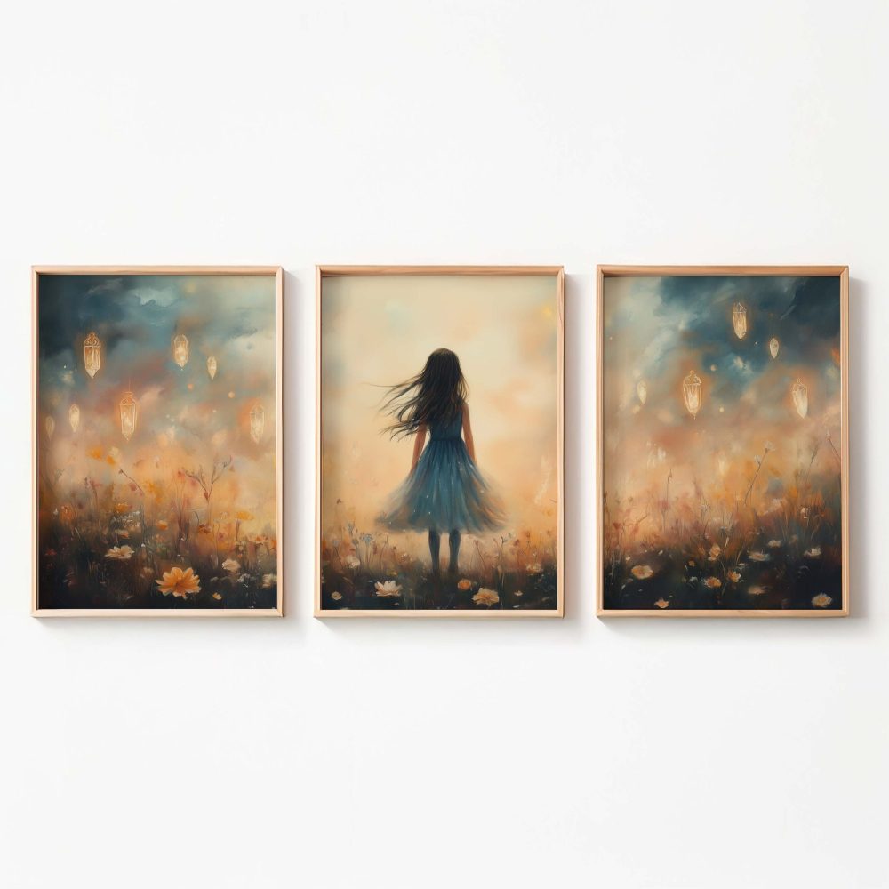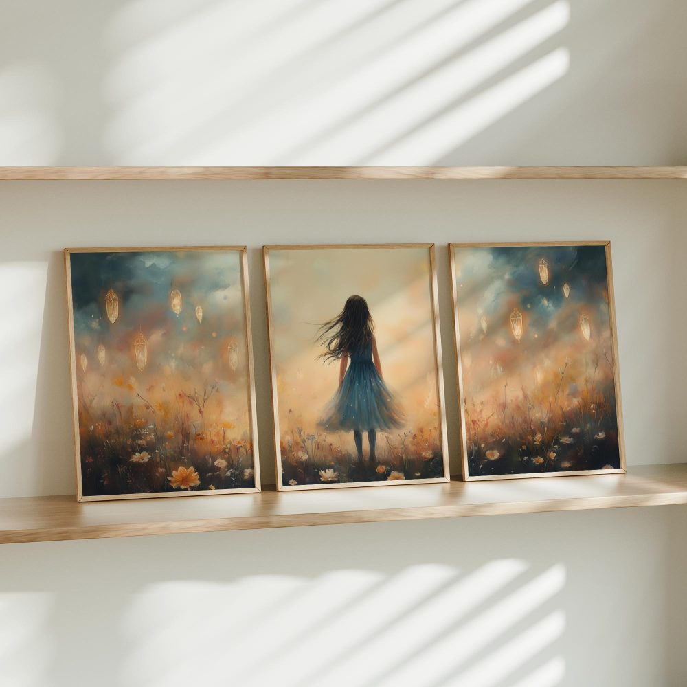 Terug naar collectie / Kinderkamer posters / Bloemen posters / Dromerig Meisje in Bloemenveld – Blauwe Jurk en Zacht Briesje