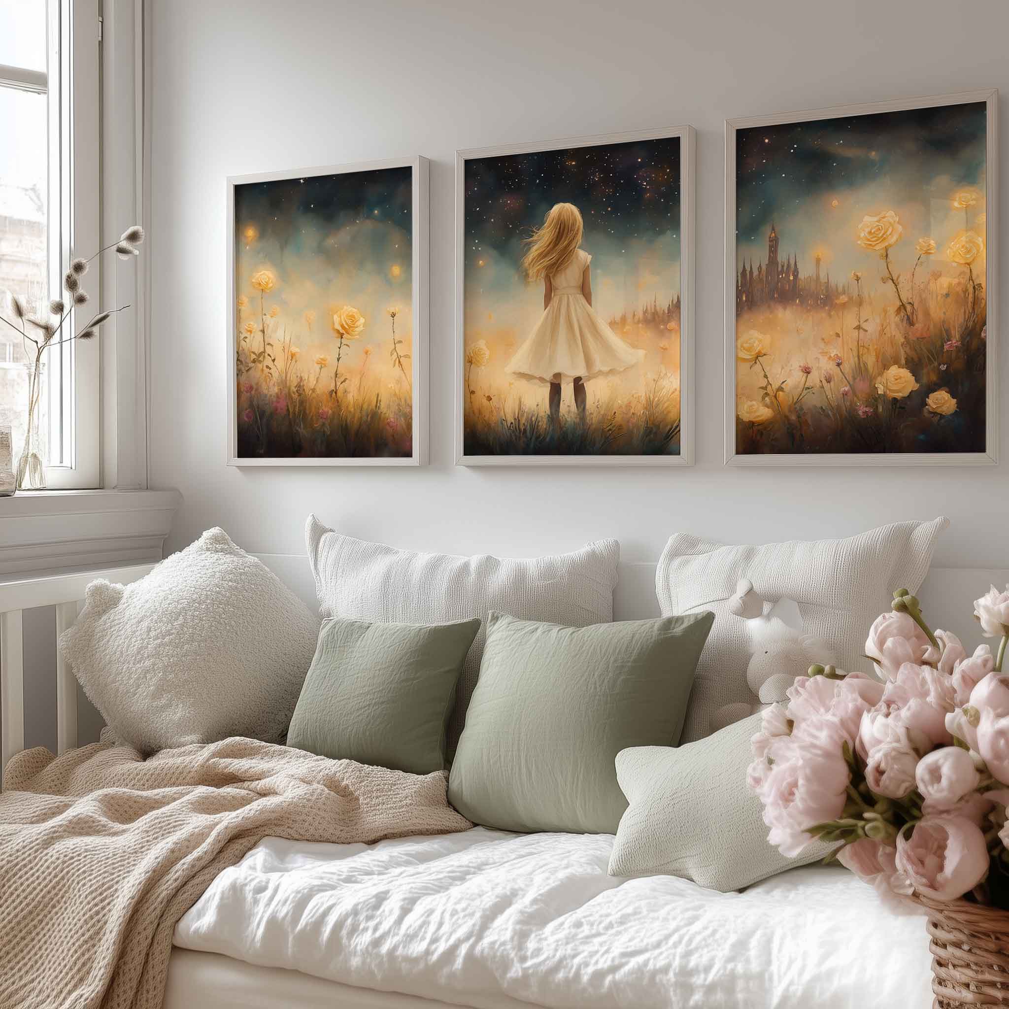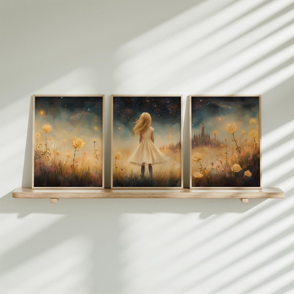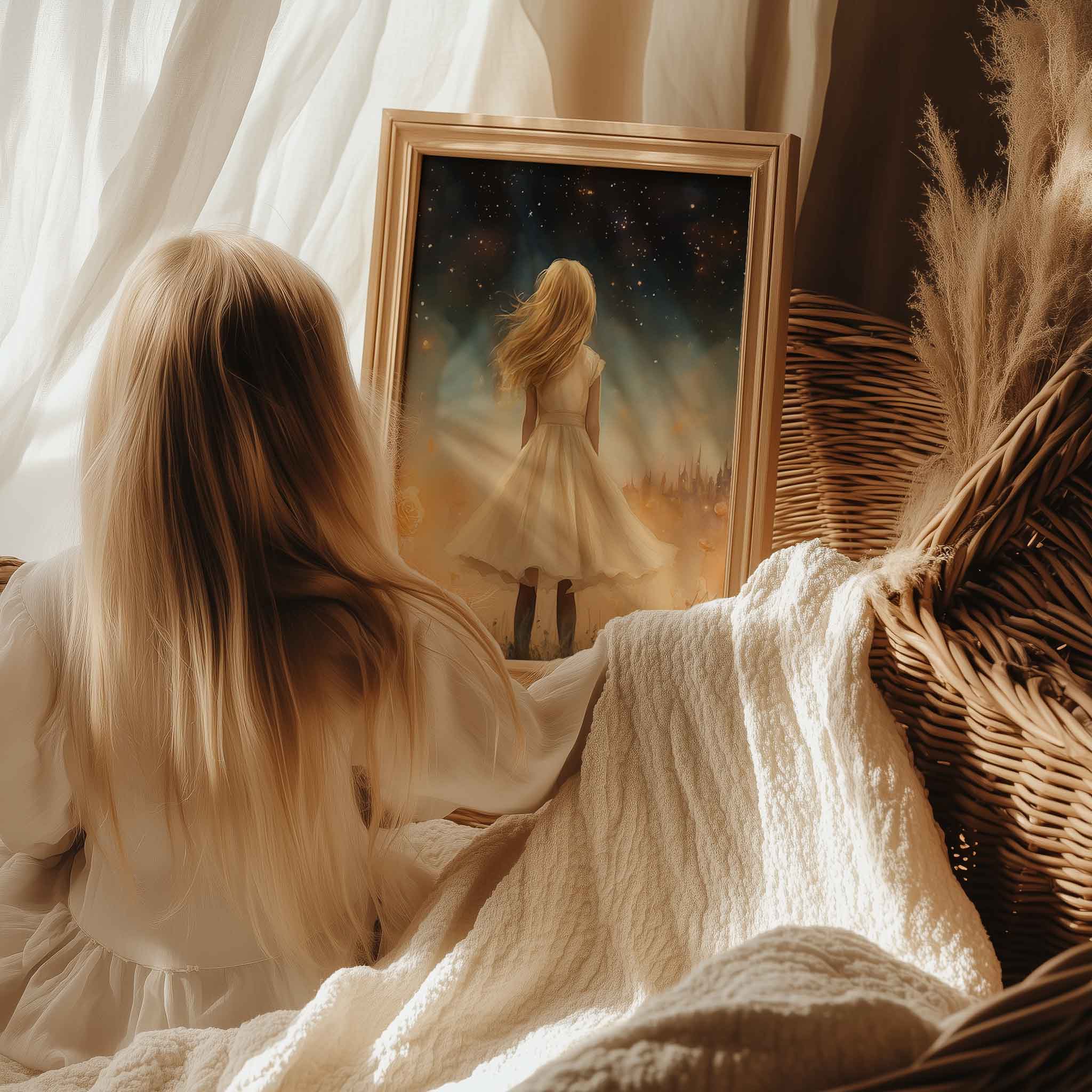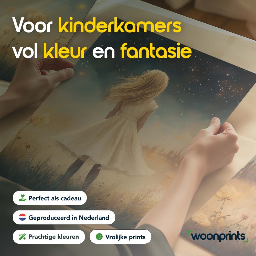 Terug naar collectie / Kinderkamer posters / Bloemen posters / Dromerig Meisje in Bloemenveld met Betoverend Kasteel