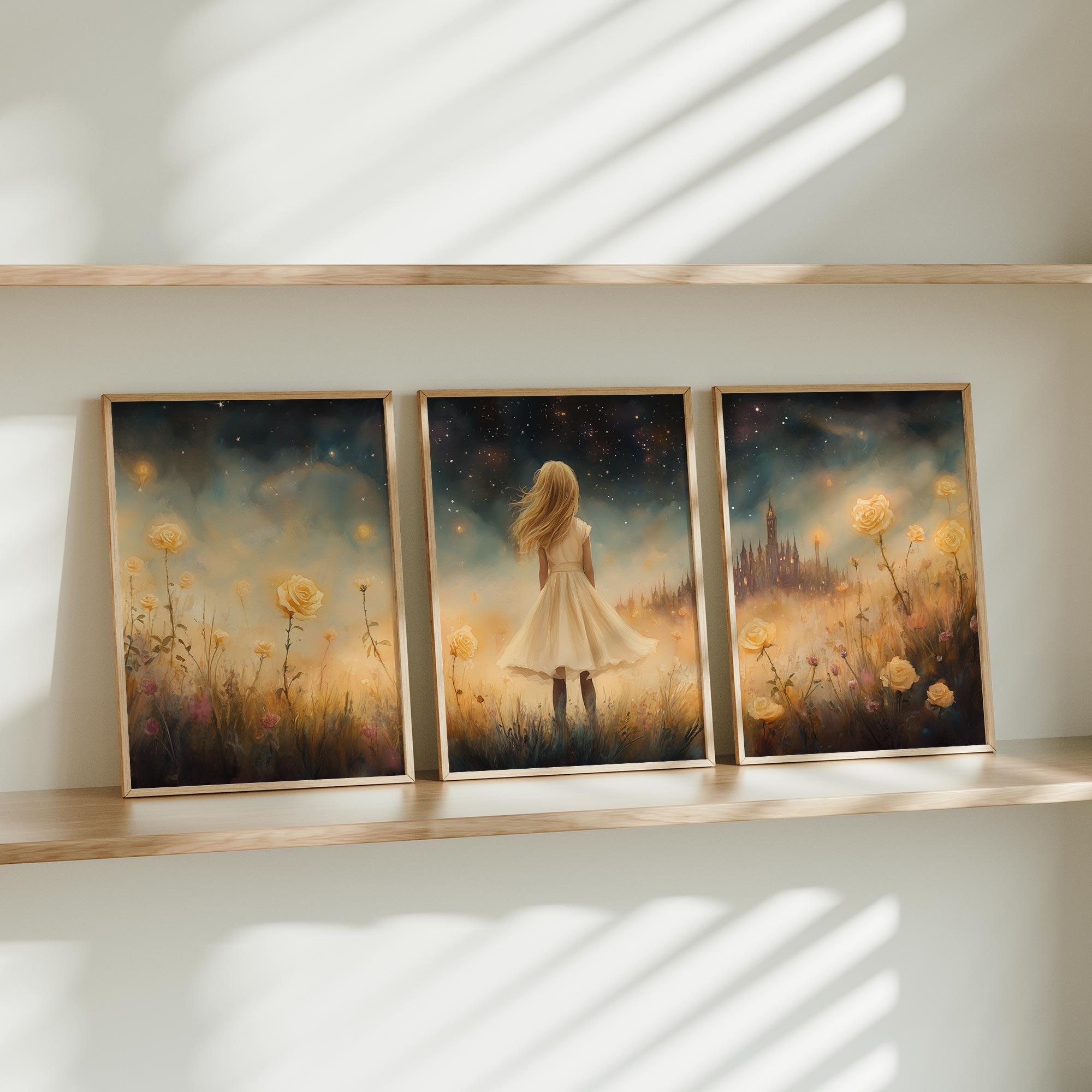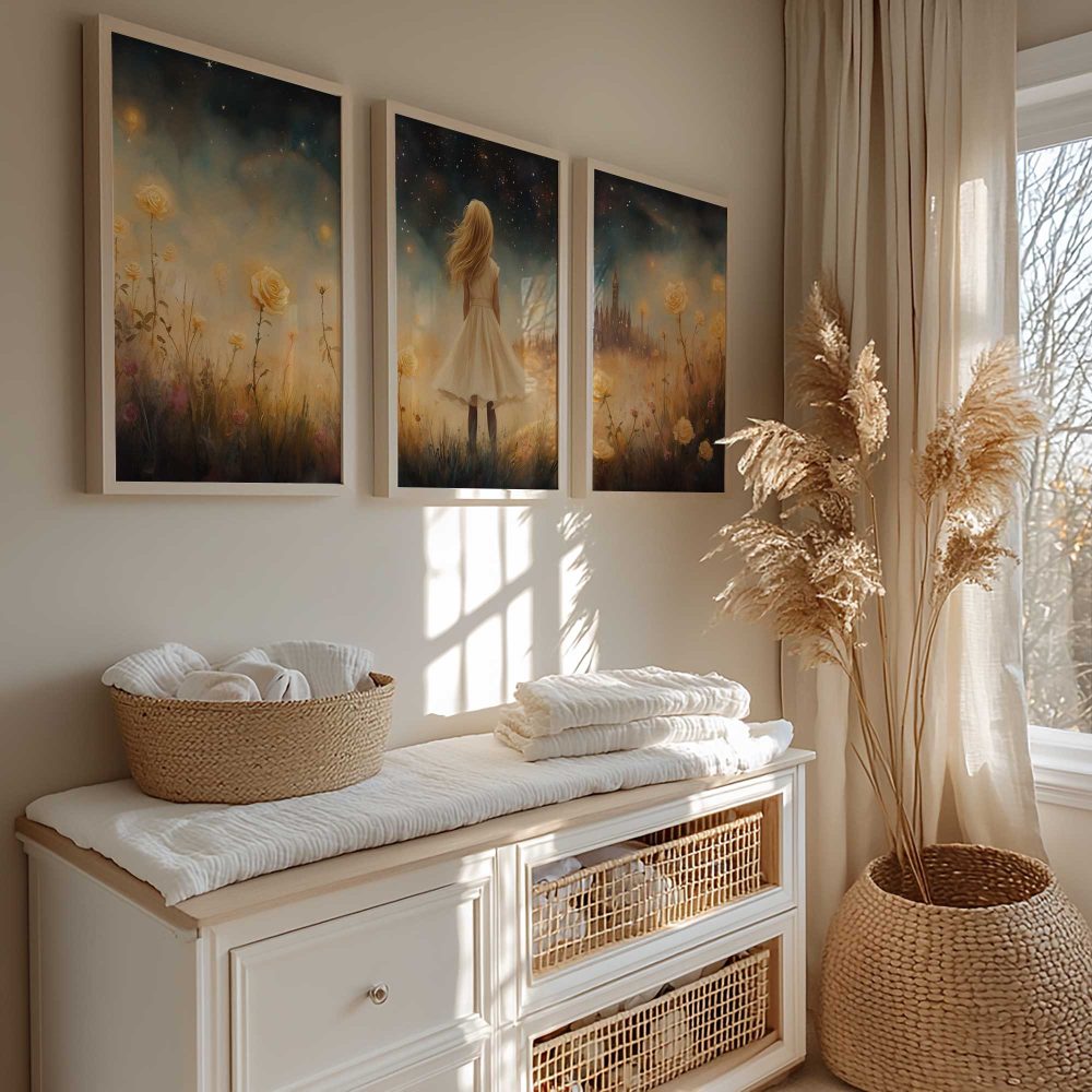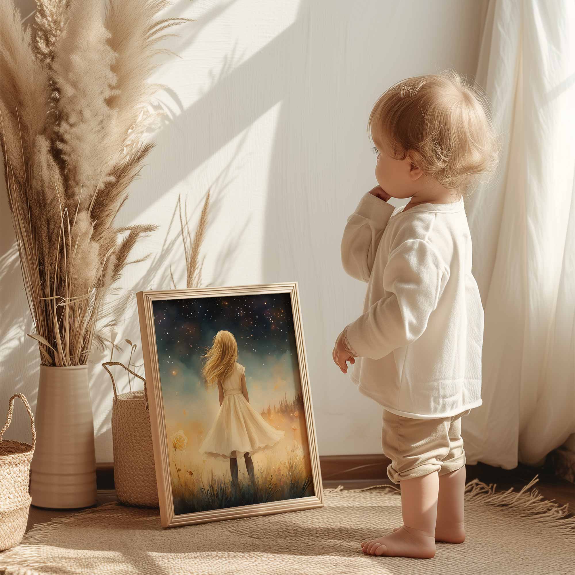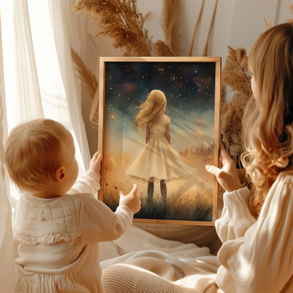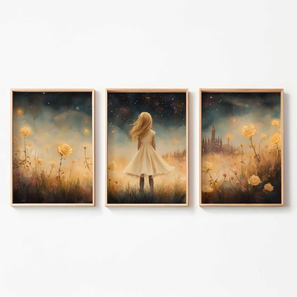 Terug naar collectie / Kinderkamer posters / Bloemen posters / Dromerig Meisje in Bloemenveld met Betoverend Kasteel