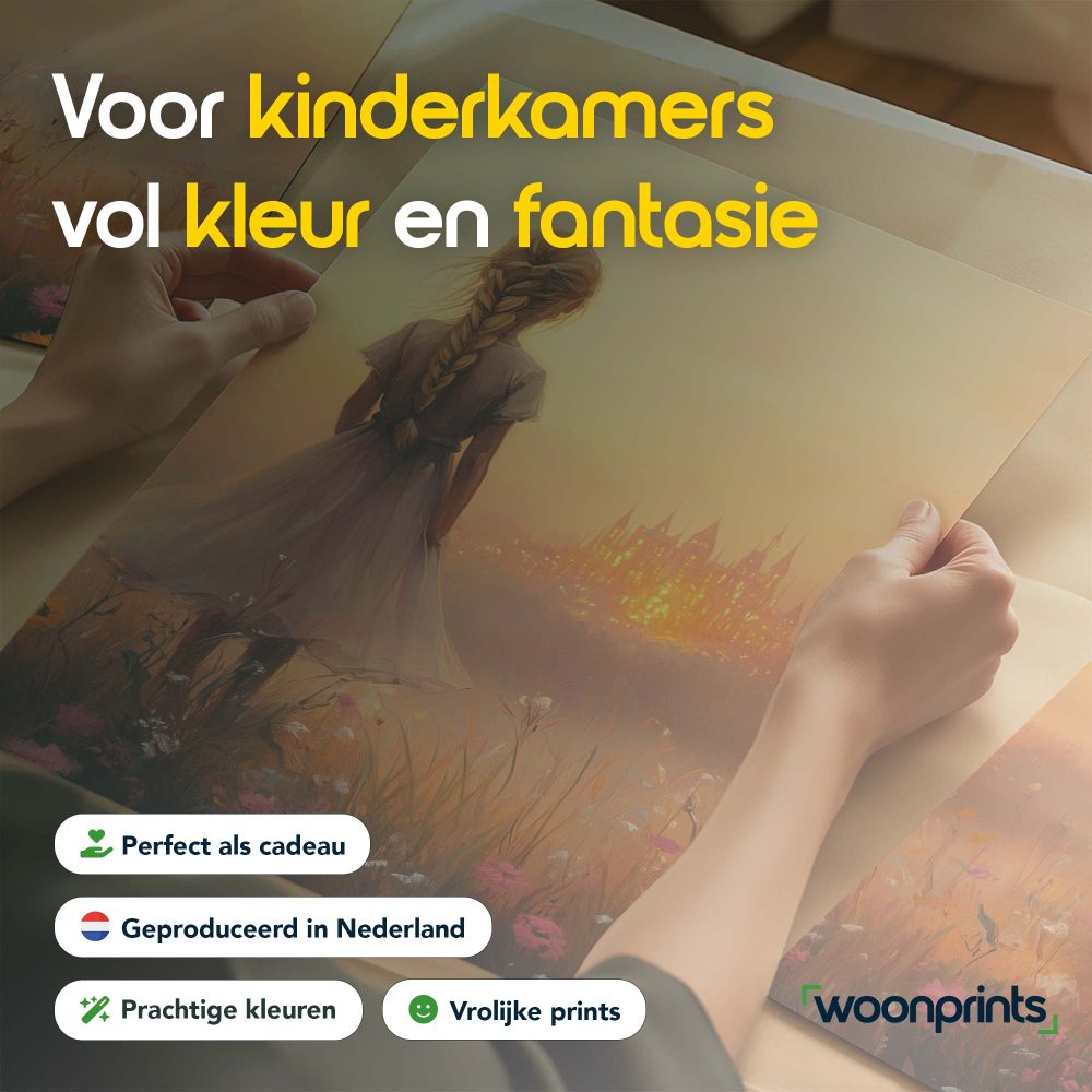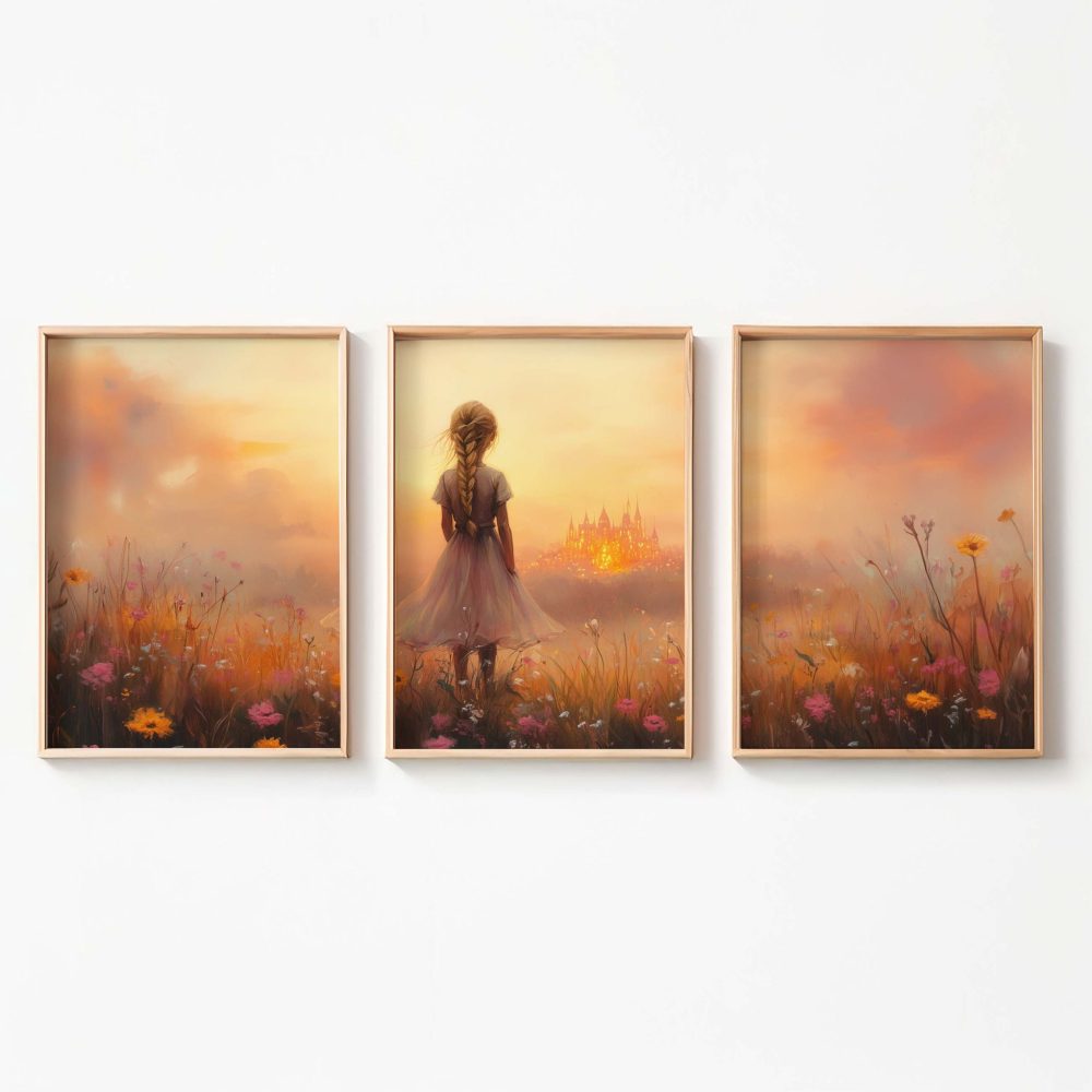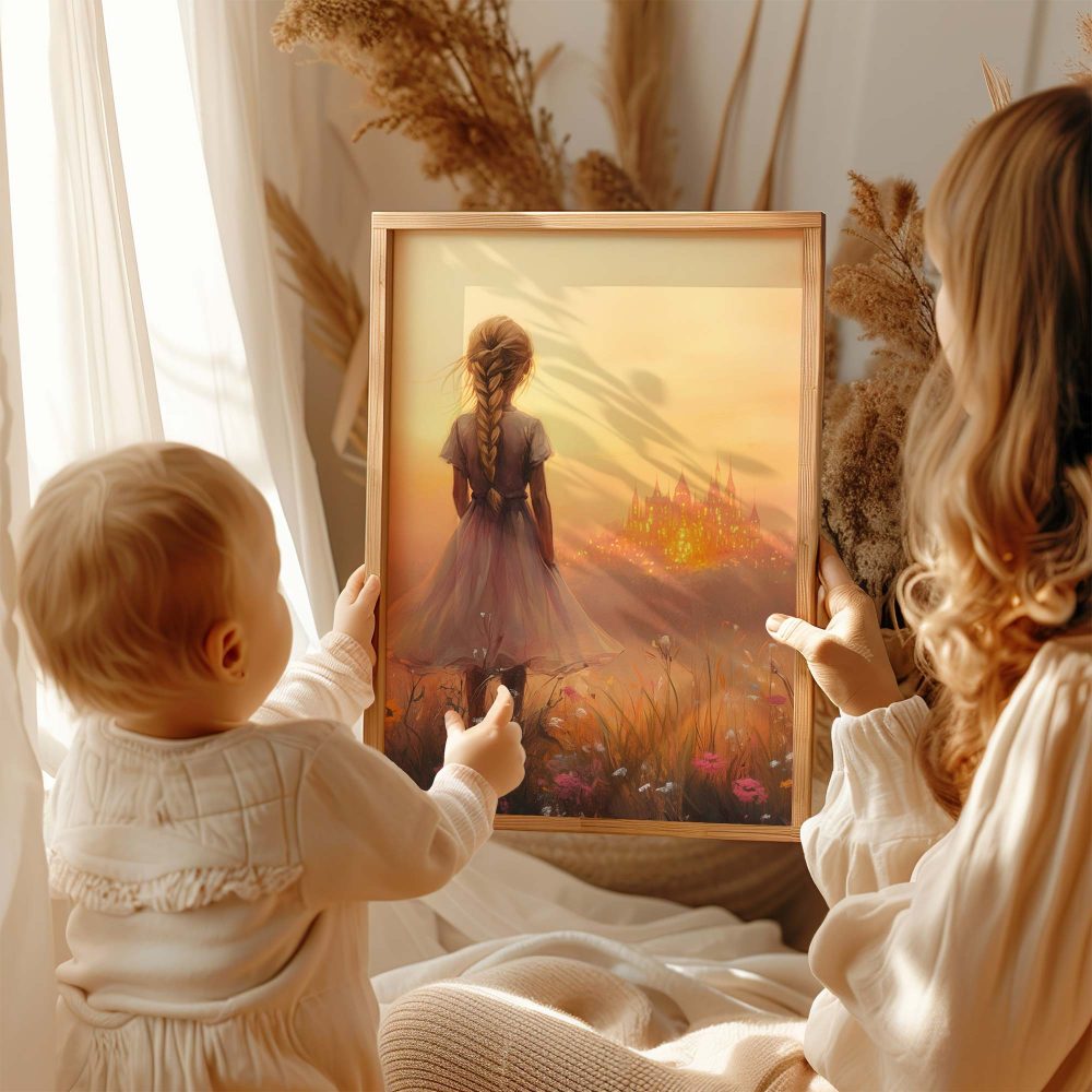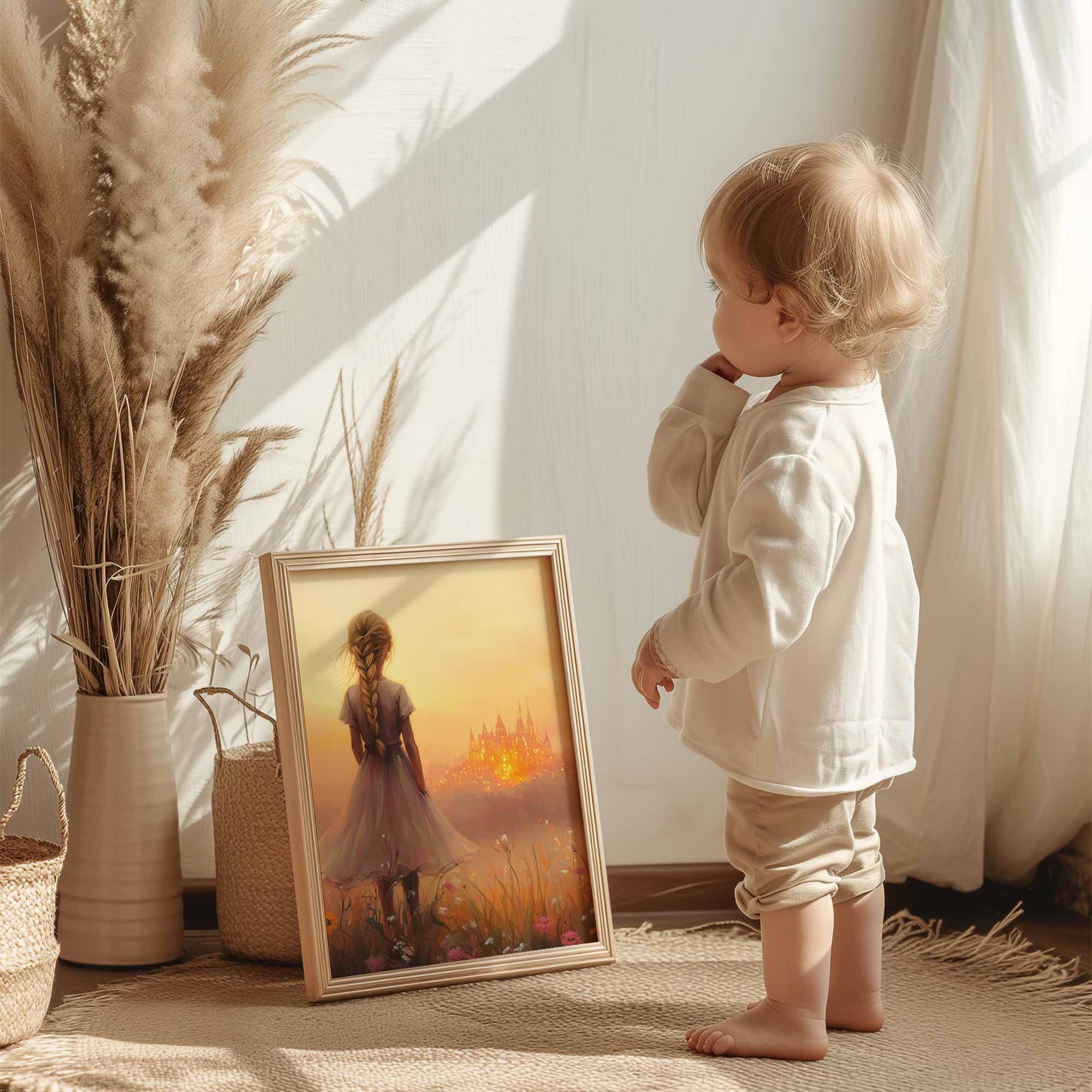 Terug naar collectie / Kinderkamer posters / Avontuurlijk posters / Dromerig Meisje in Bloemenveld met Betoverend Kasteel