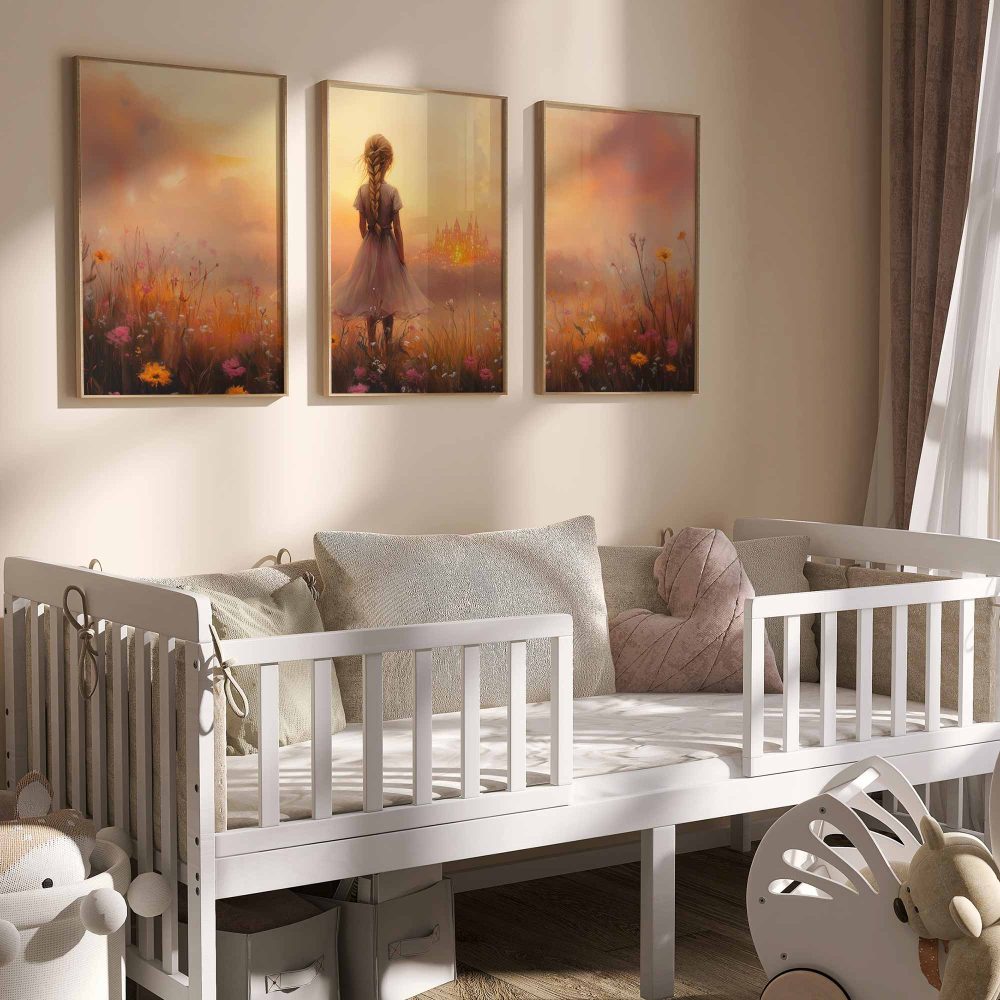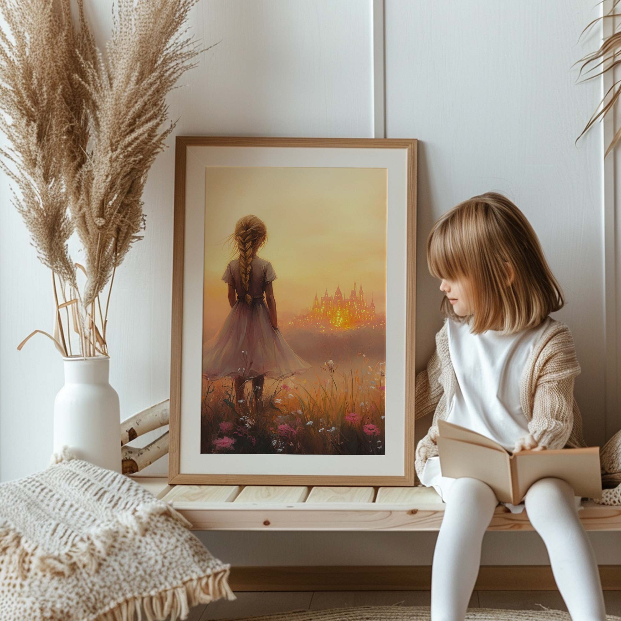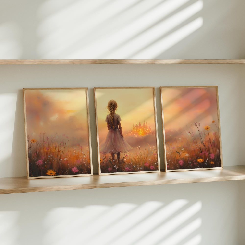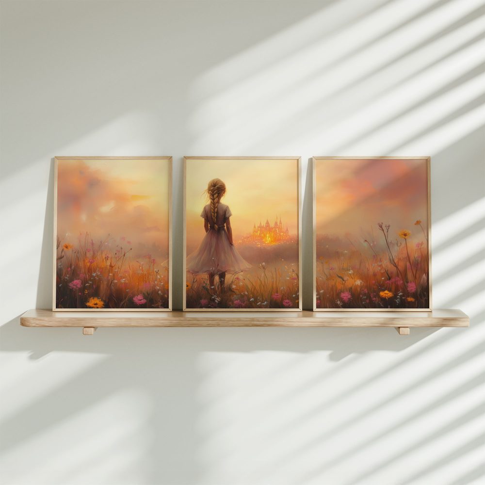 Terug naar collectie / Kinderkamer posters / Avontuurlijk posters / Dromerig Meisje in Bloemenveld met Betoverend Kasteel