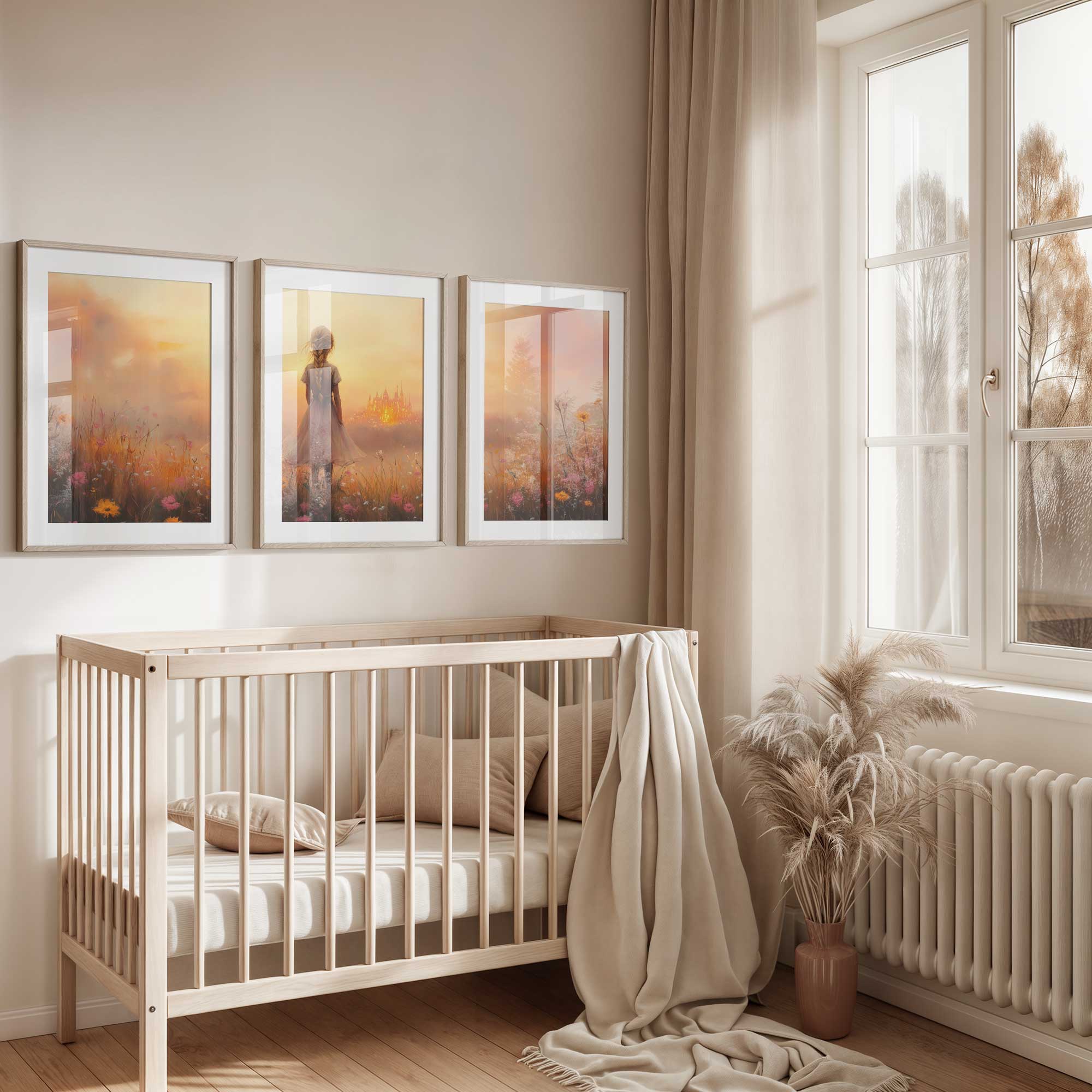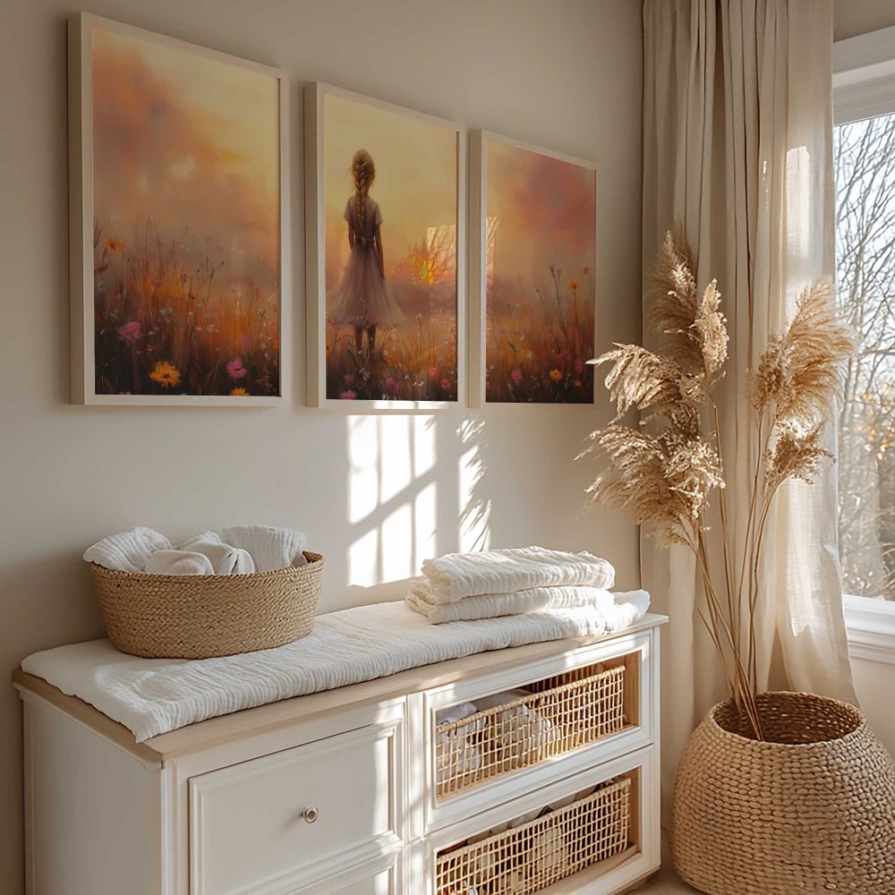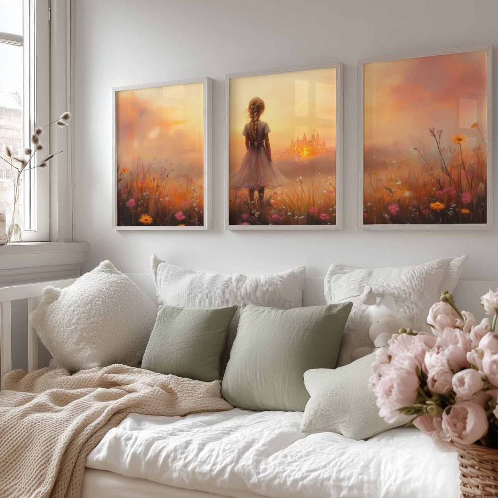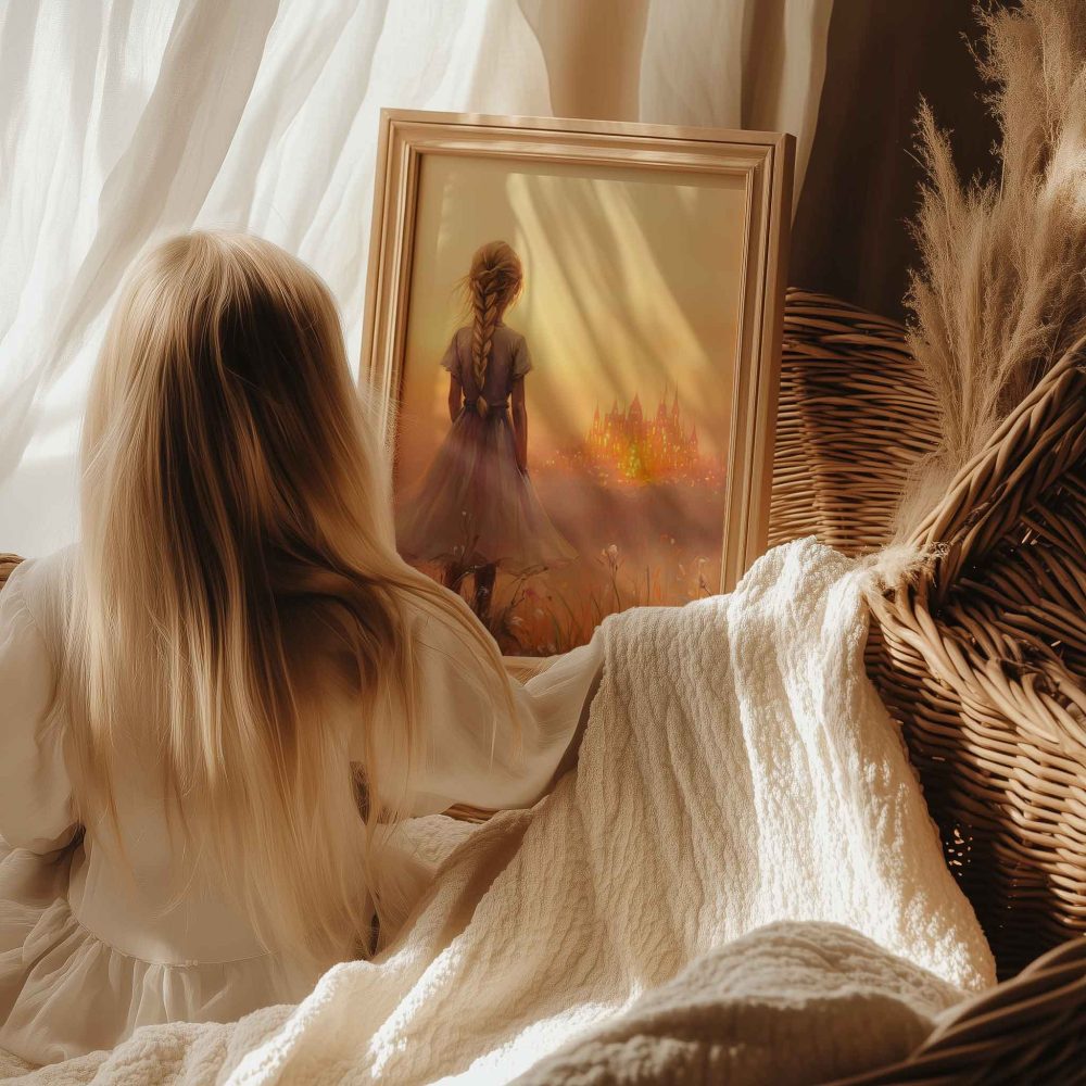 Terug naar collectie / Kinderkamer posters / Avontuurlijk posters / Dromerig Meisje in Bloemenveld met Betoverend Kasteel