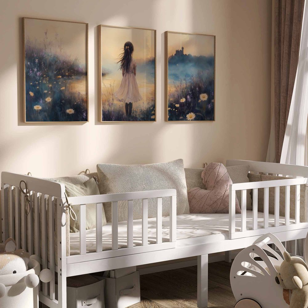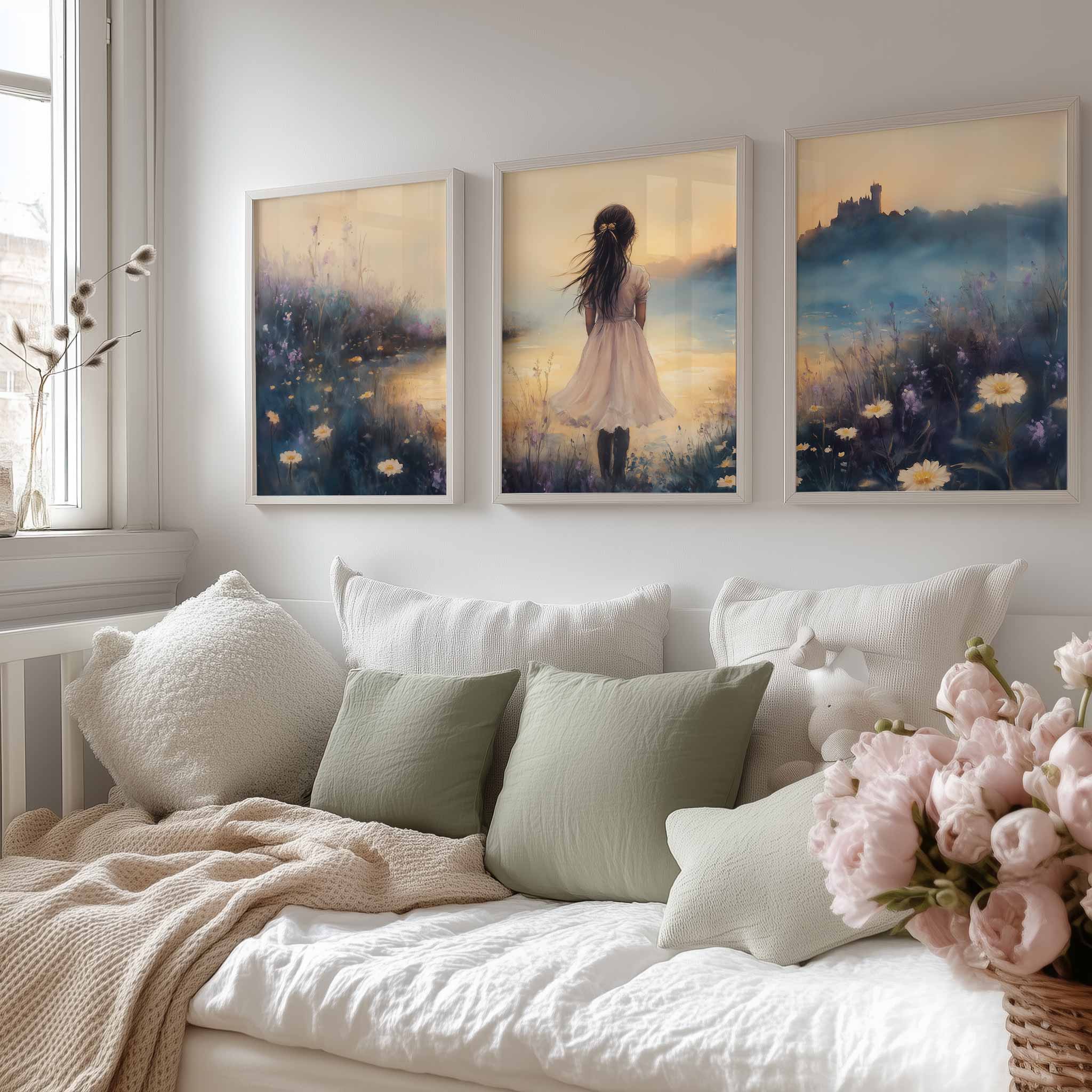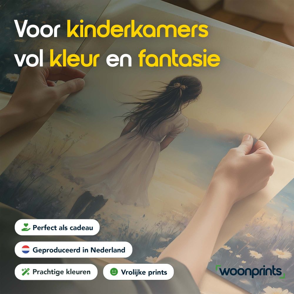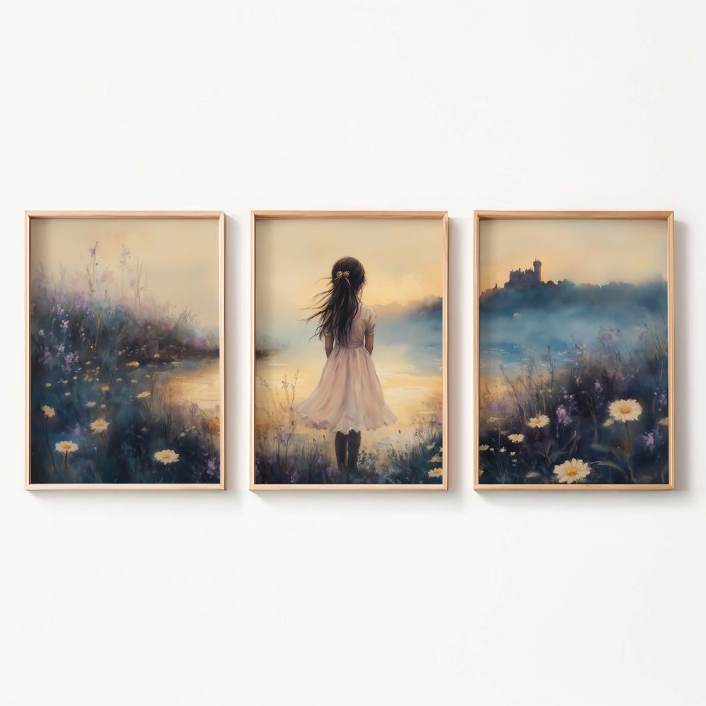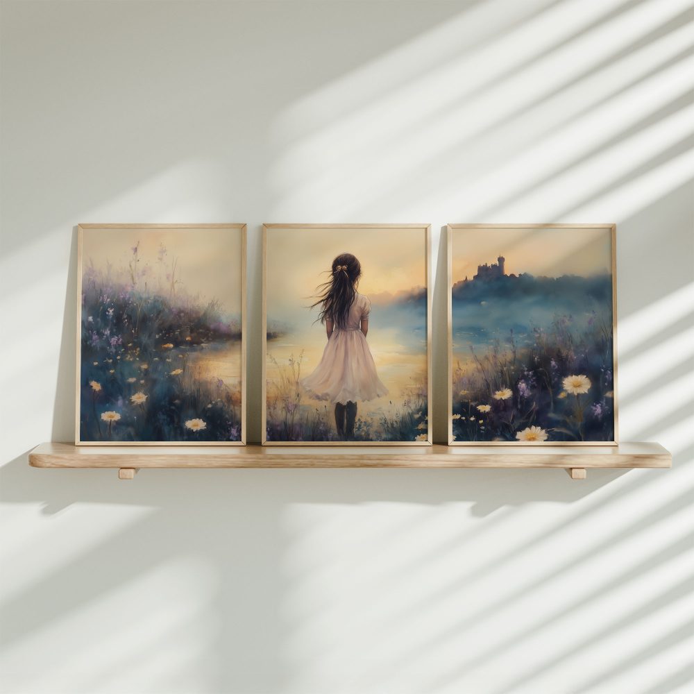 Terug naar collectie / Kinderkamer posters / Bloemen posters / Dromerig Meisje in Bloemenveld met Kasteel