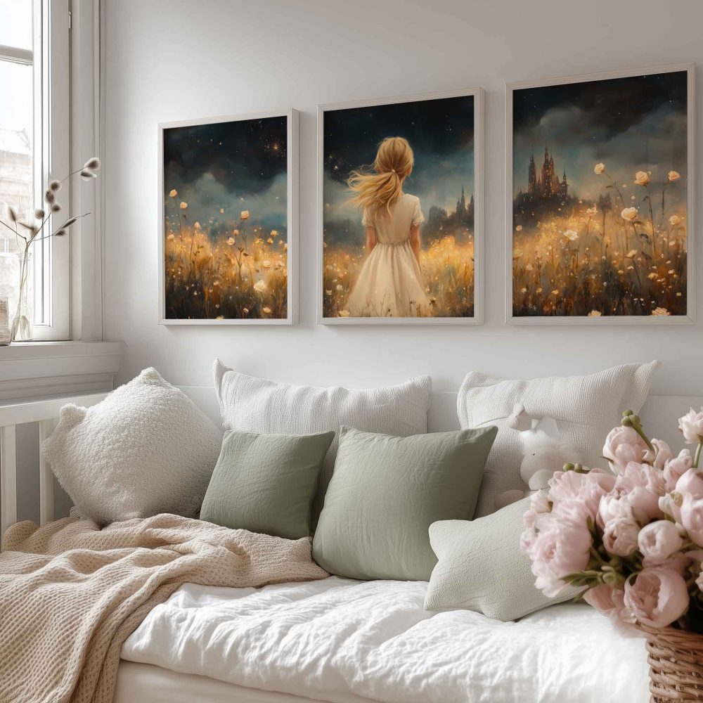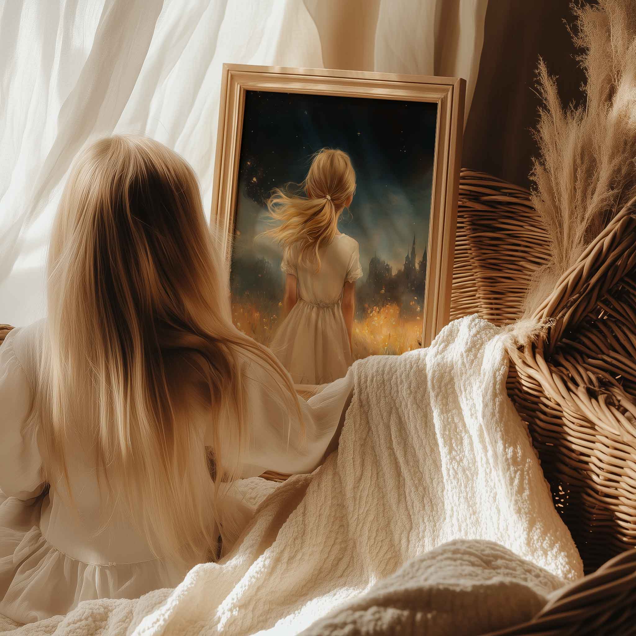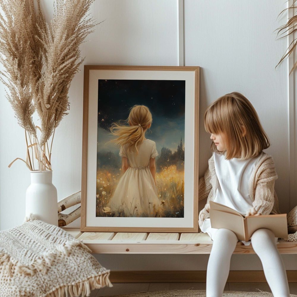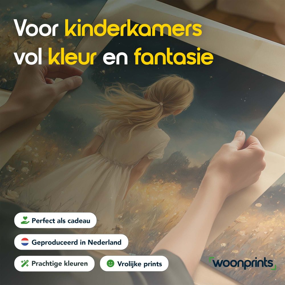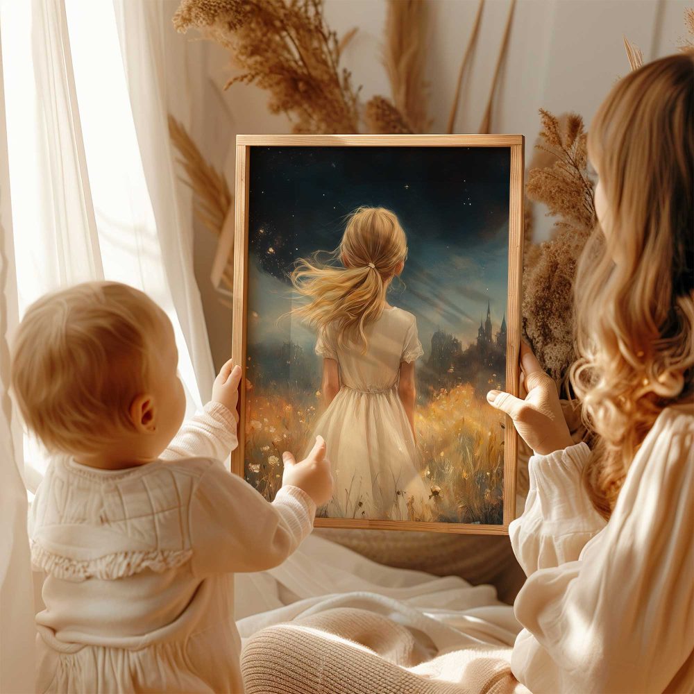 Terug naar collectie / Kinderkamer posters / Bloemen posters / Dromerig Meisje in Bloemenveld met Kasteel