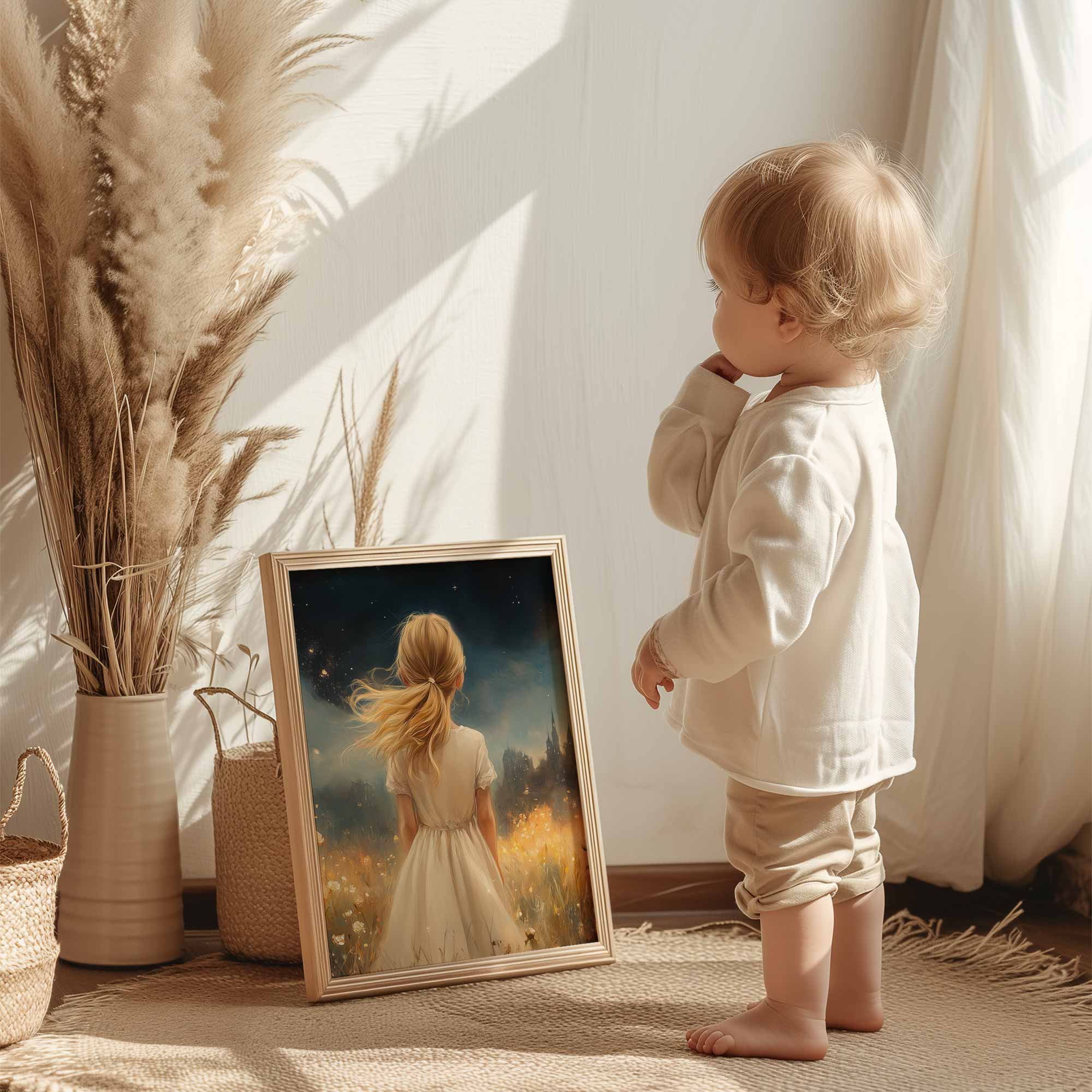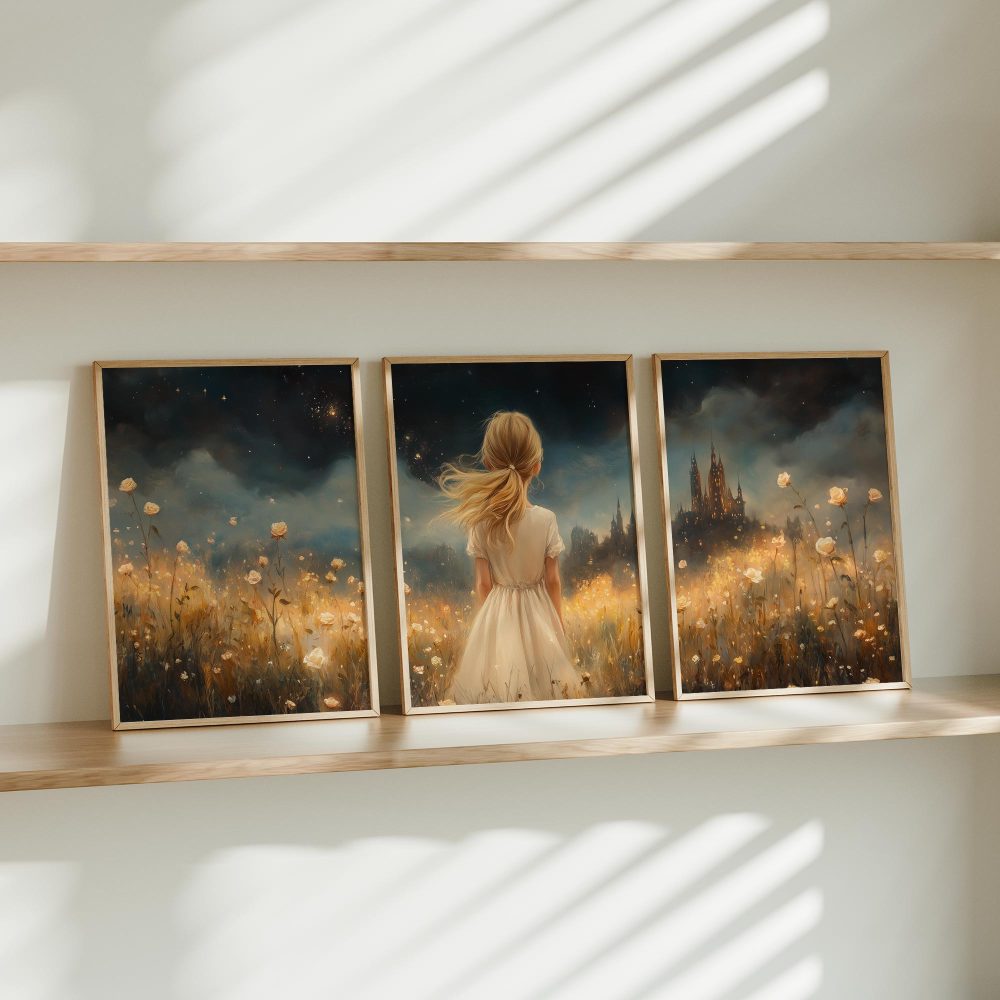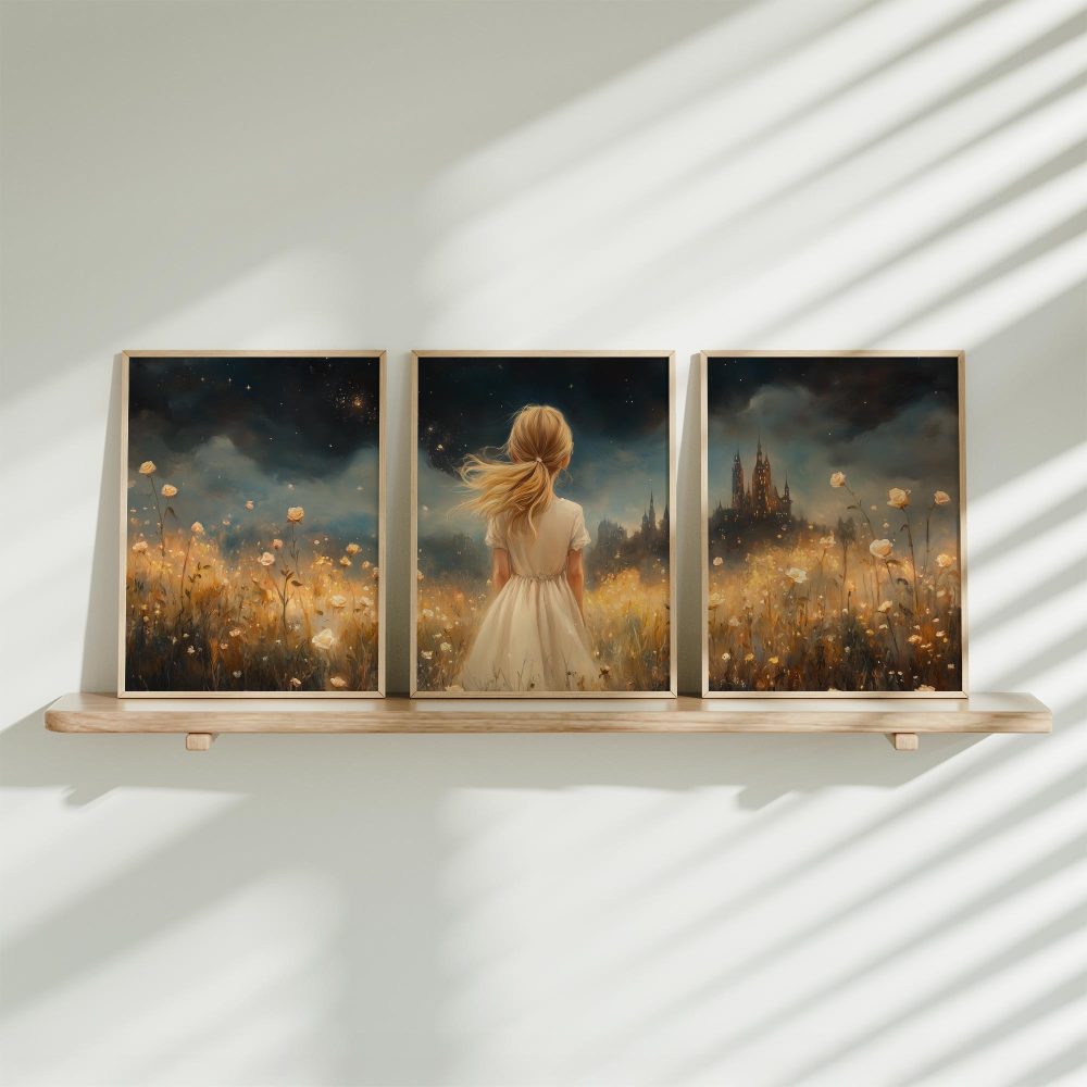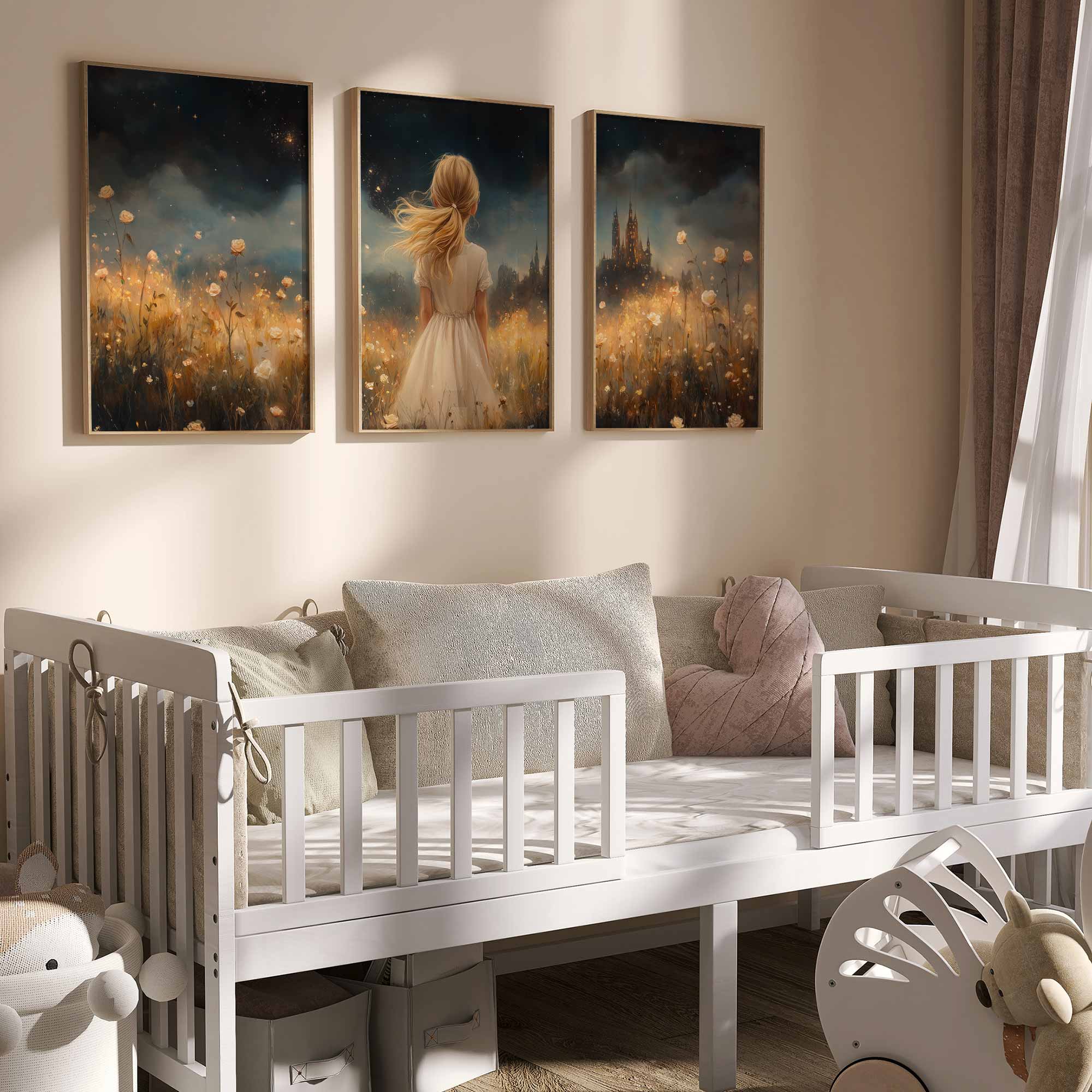 Terug naar collectie / Kinderkamer posters / Bloemen posters / Dromerig Meisje in Bloemenveld met Kasteel