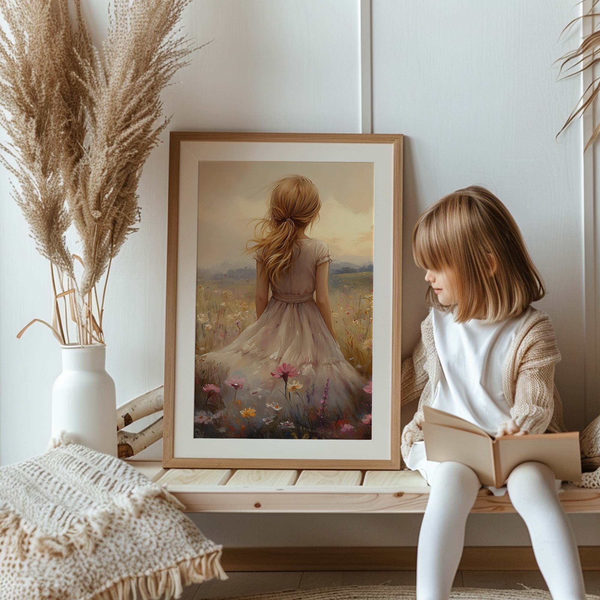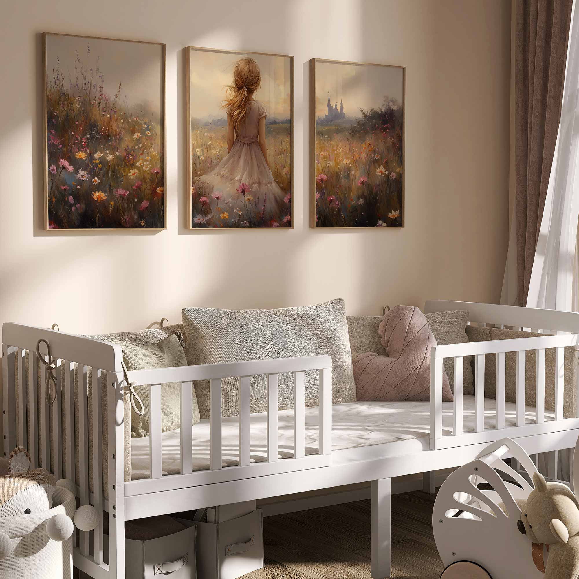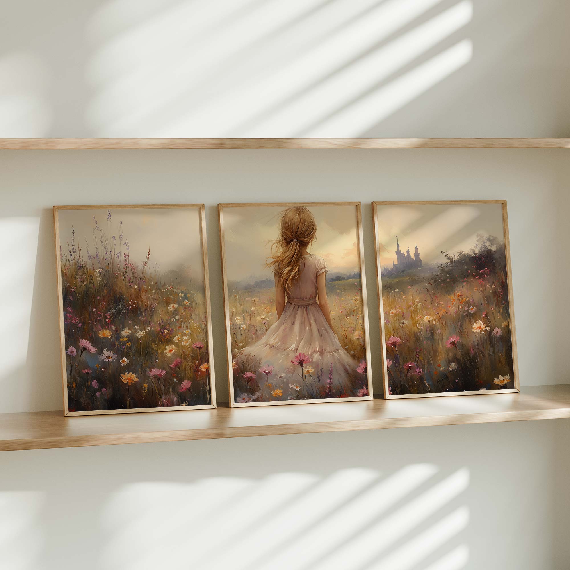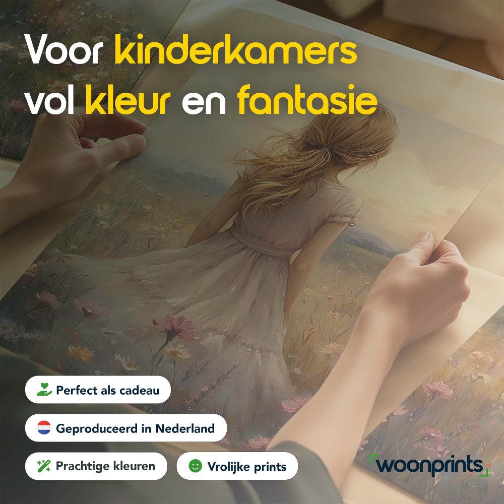 Terug naar collectie / Kinderkamer posters / Avontuurlijk posters / Dromerig Meisje in Bloemenveld met Kasteelzicht