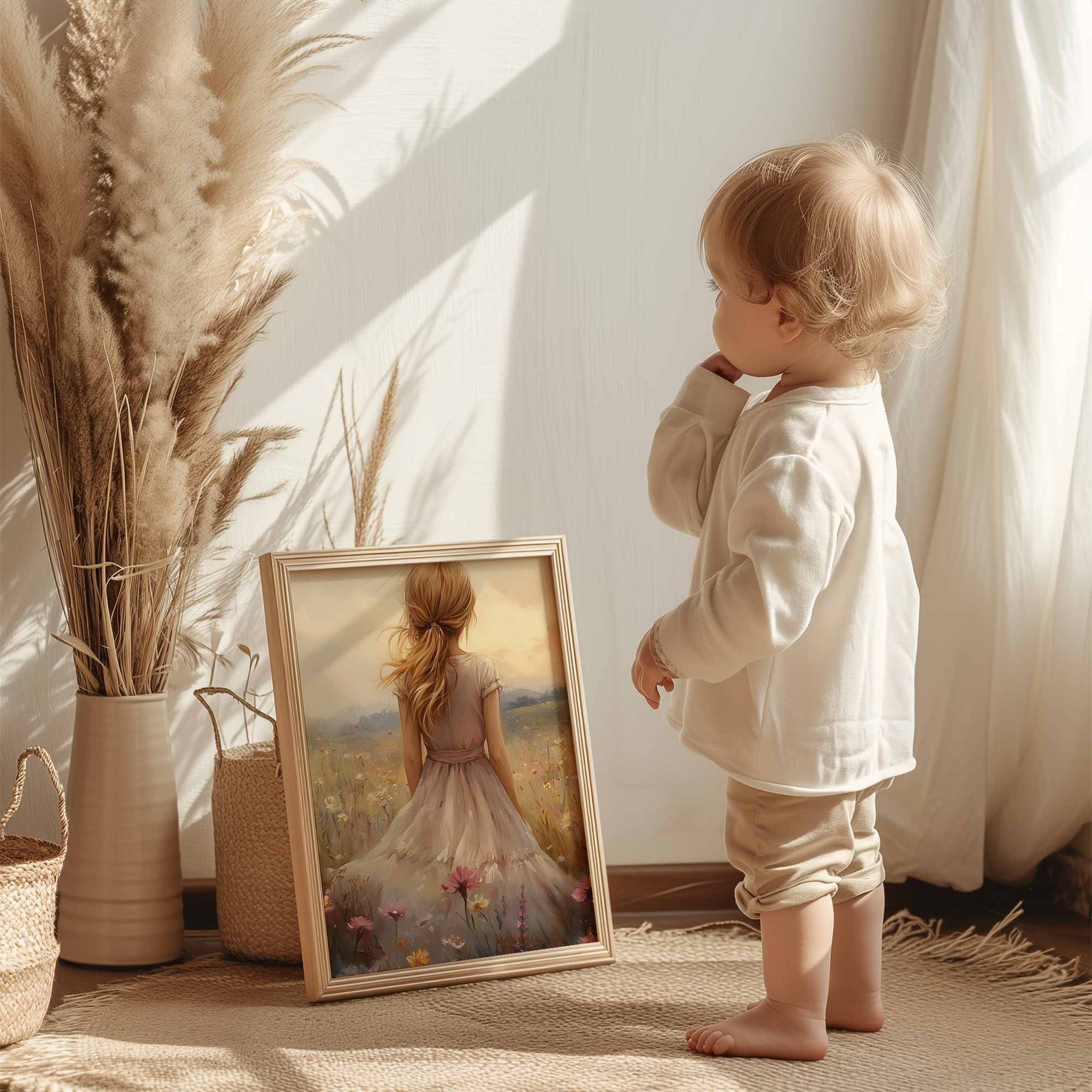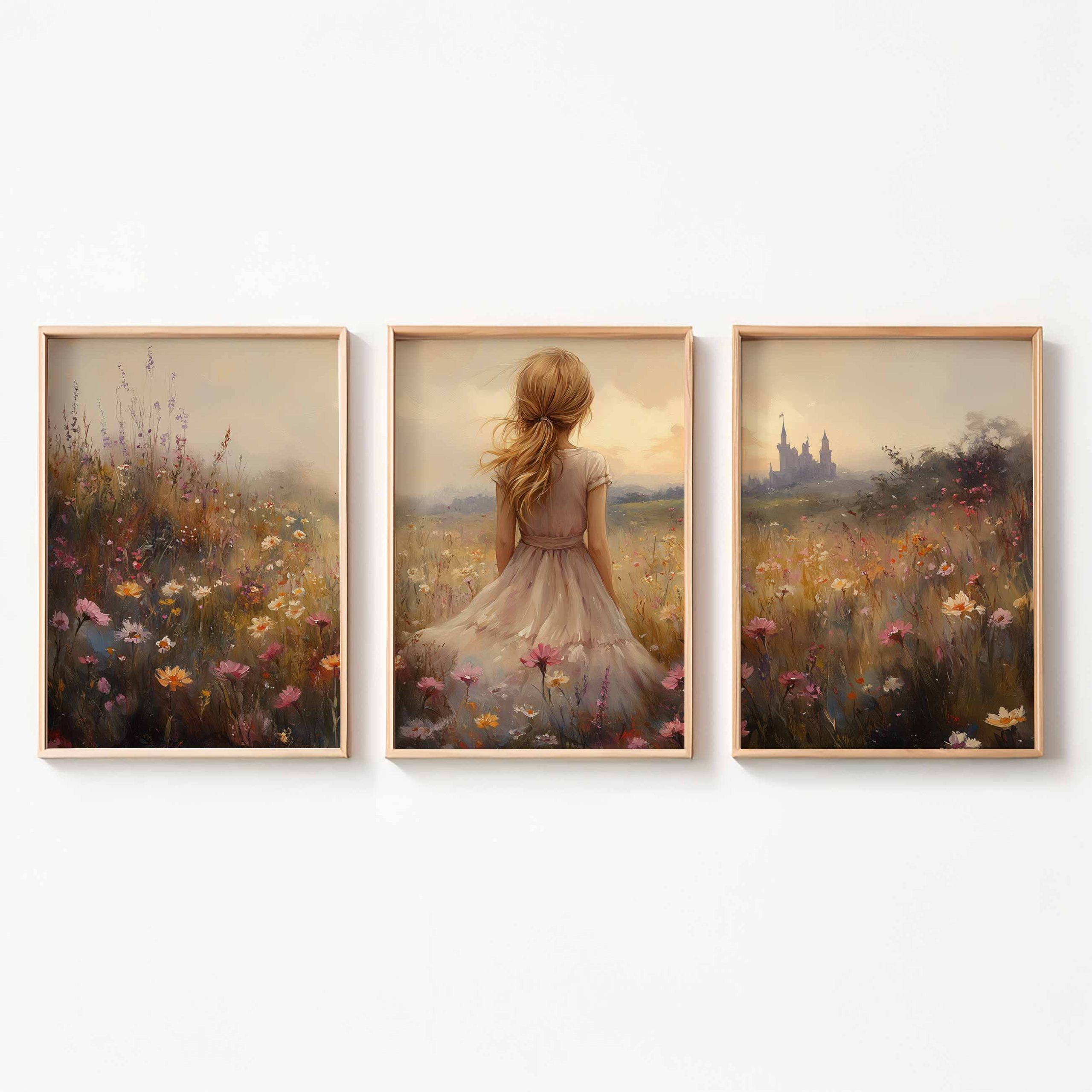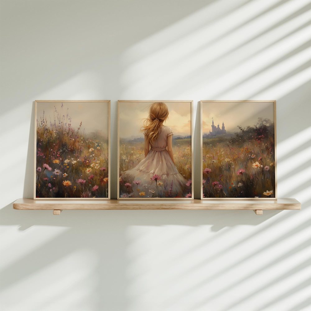 Terug naar collectie / Kinderkamer posters / Avontuurlijk posters / Dromerig Meisje in Bloemenveld met Kasteelzicht
