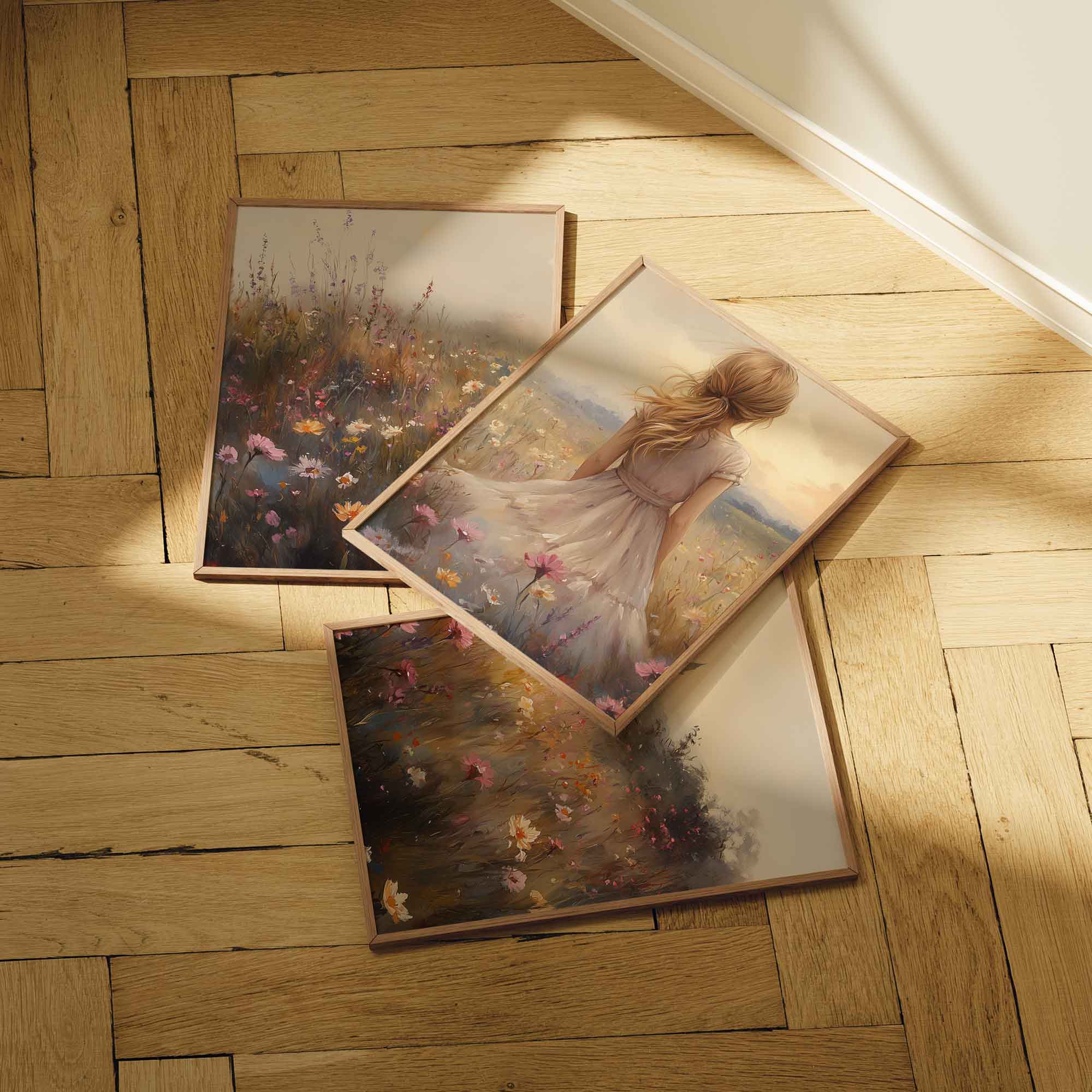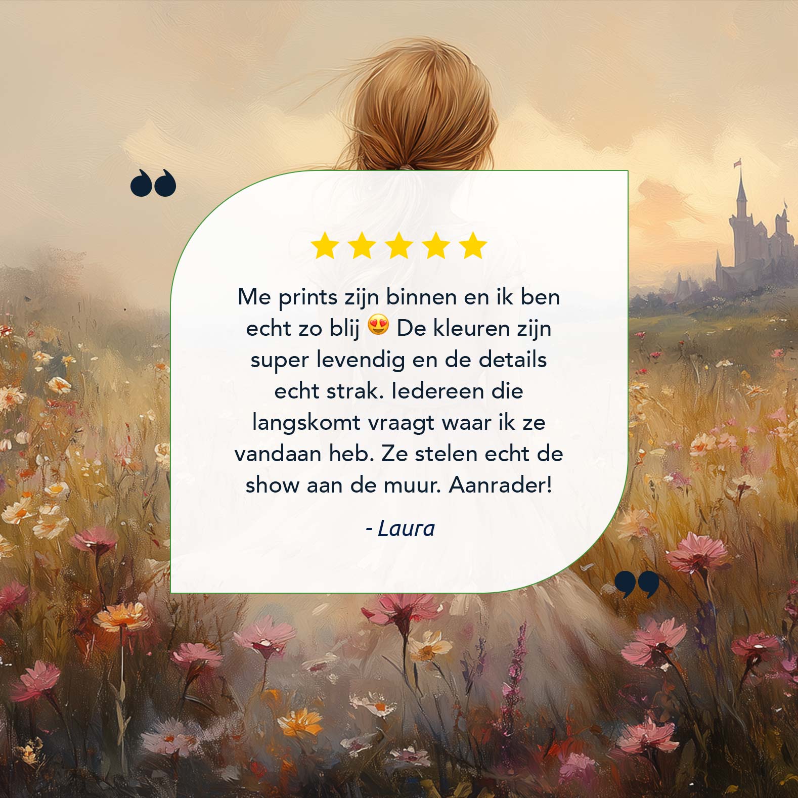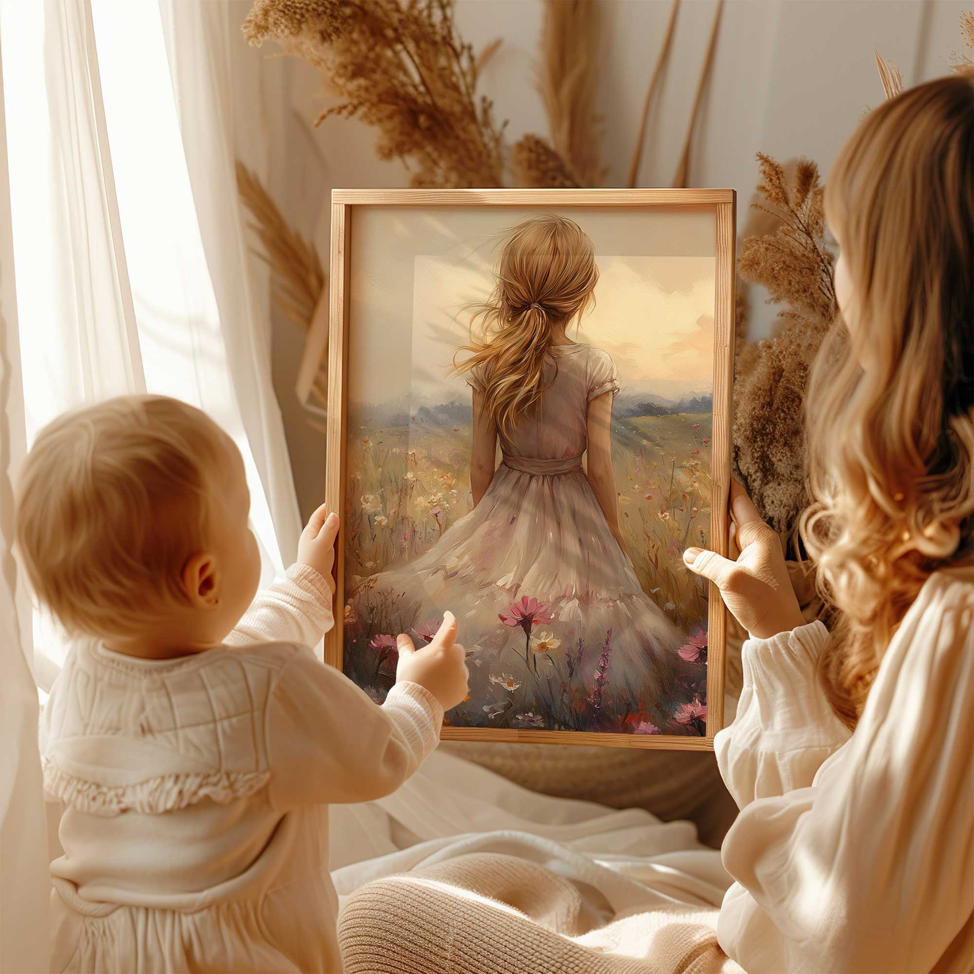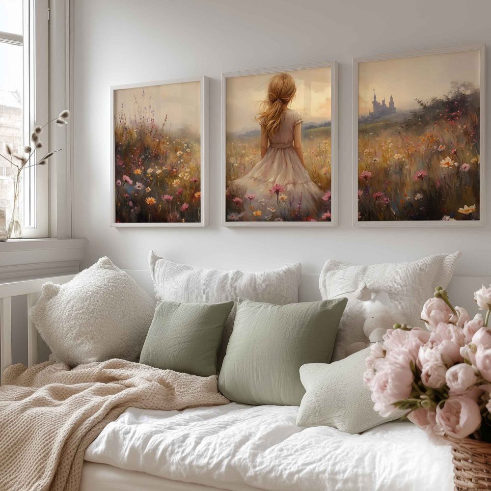 Terug naar collectie / Kinderkamer posters / Avontuurlijk posters / Dromerig Meisje in Bloemenveld met Kasteelzicht