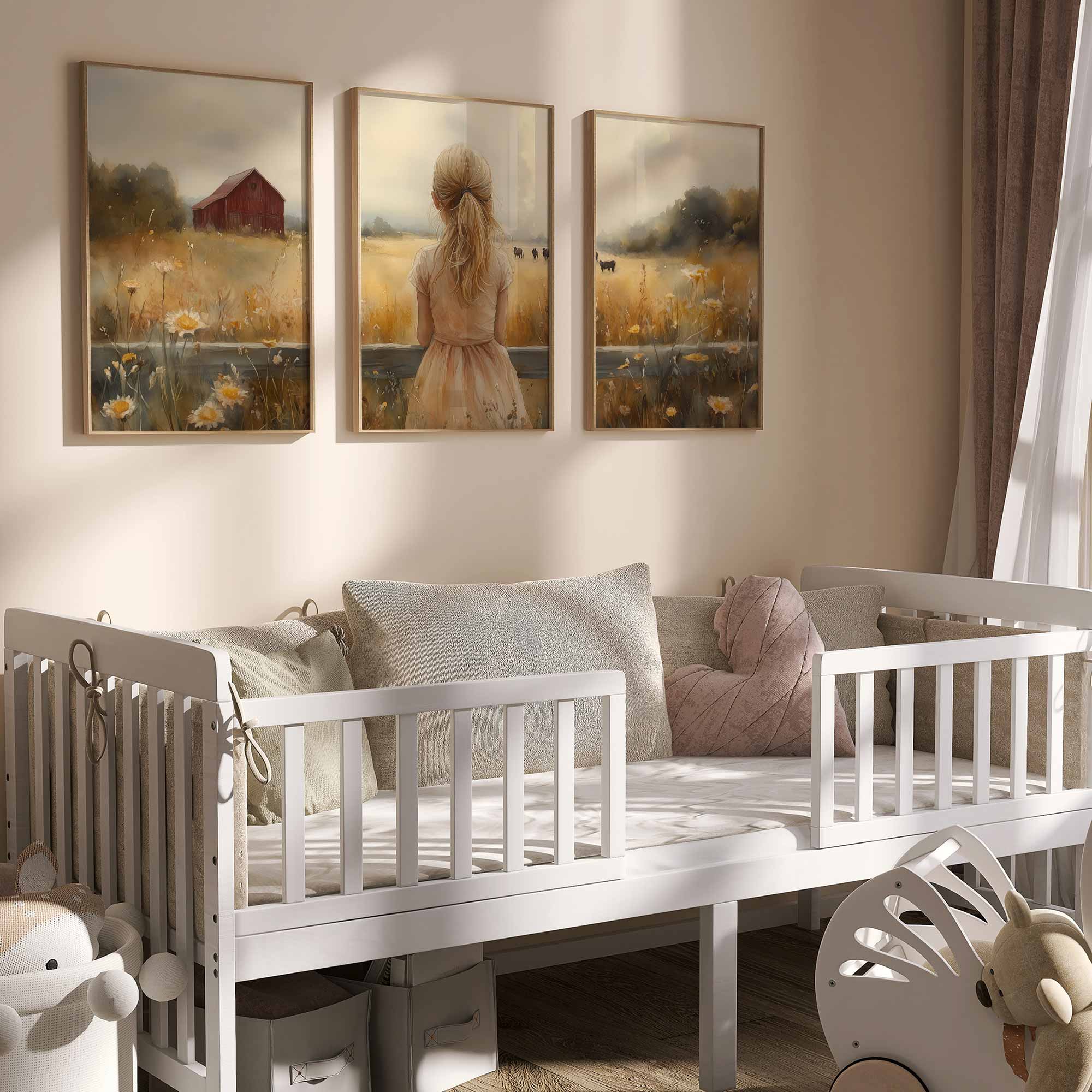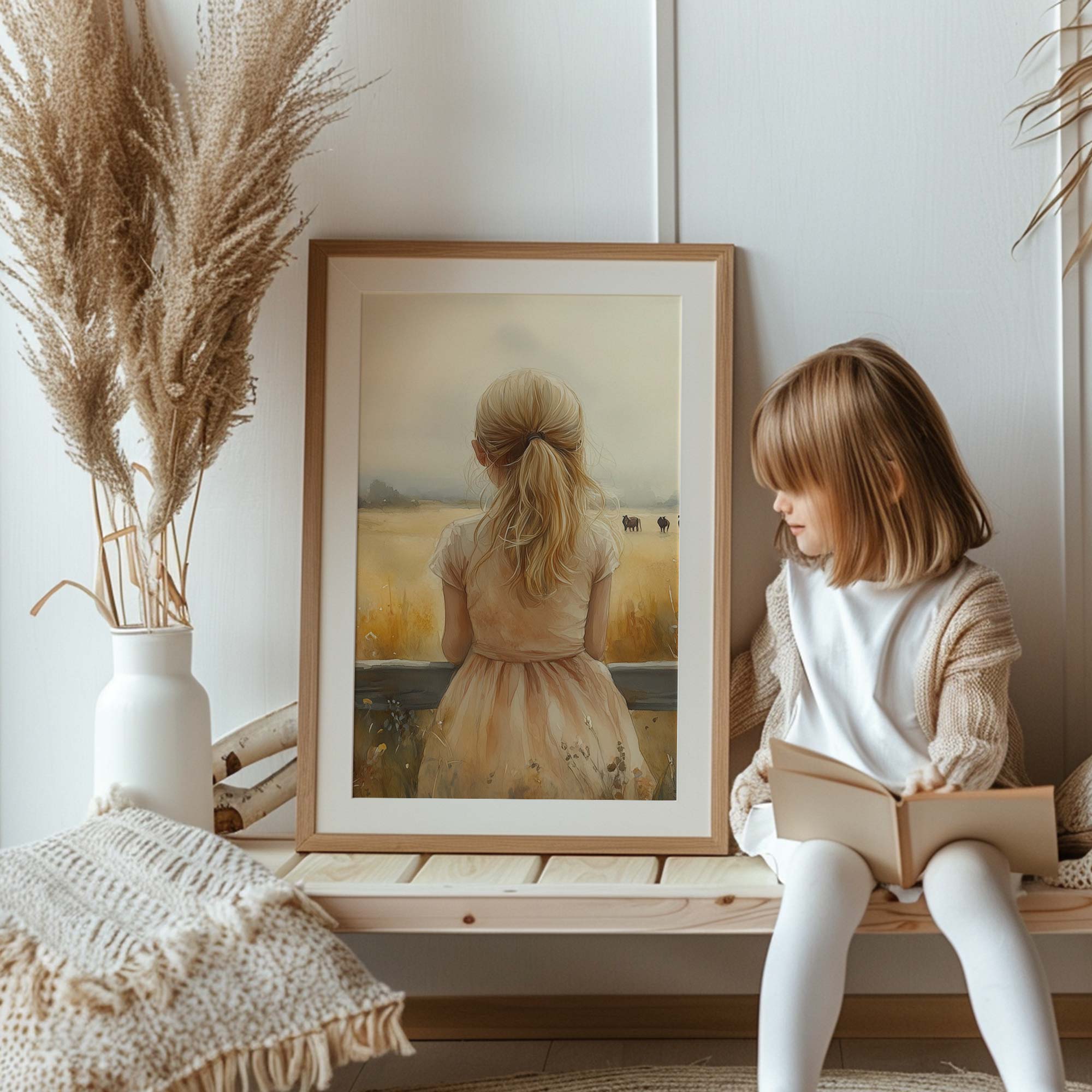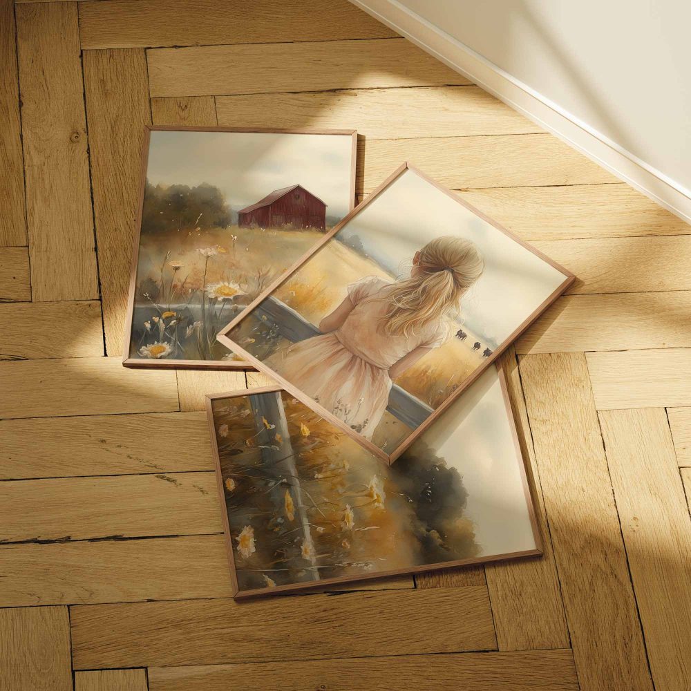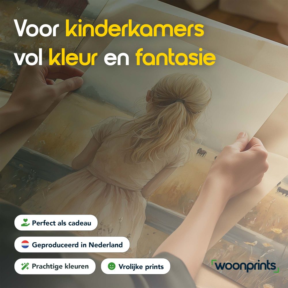 Terug naar collectie / Kinderkamer posters / Bloemen posters / Dromerig Meisje in Bloemenveld met Rode Schuur