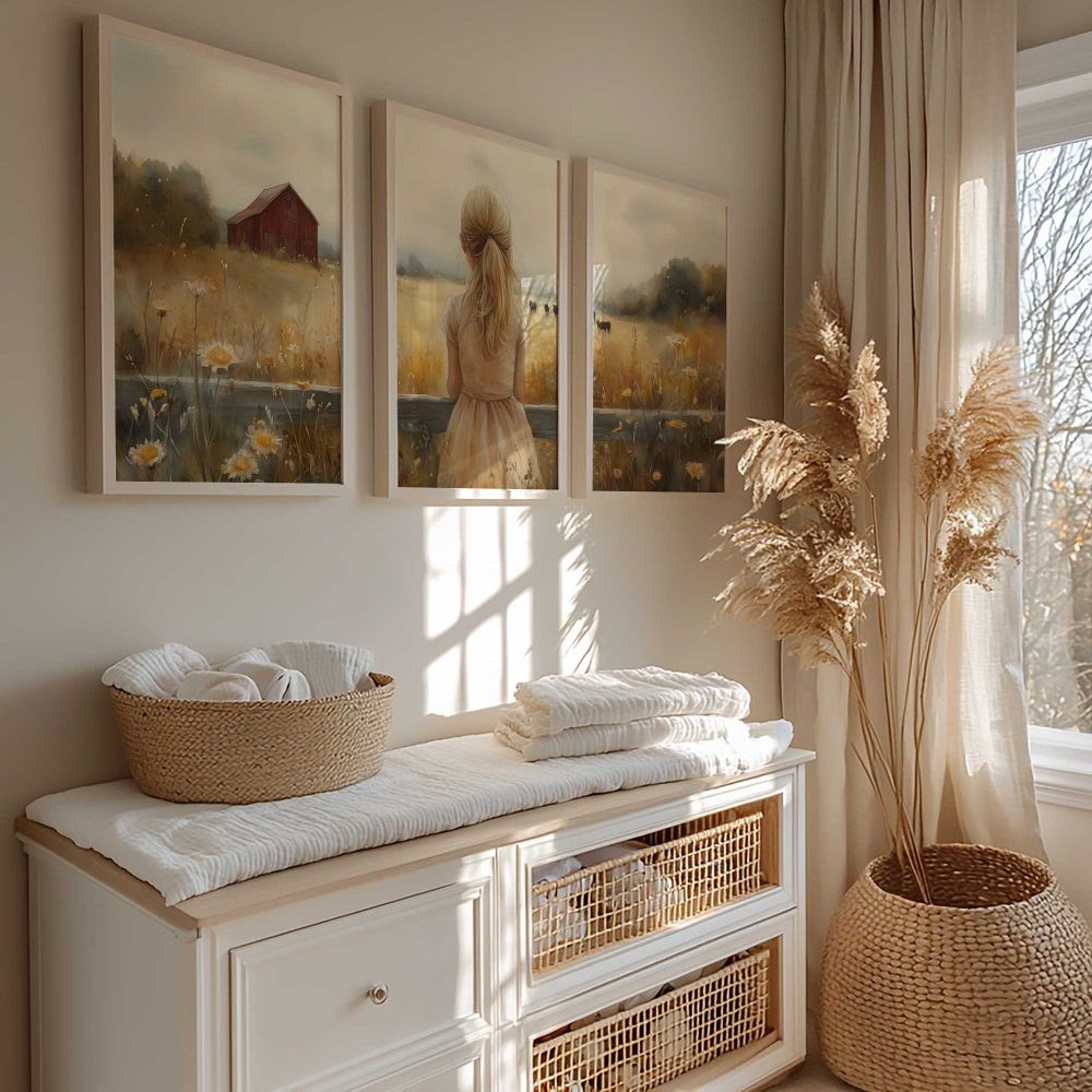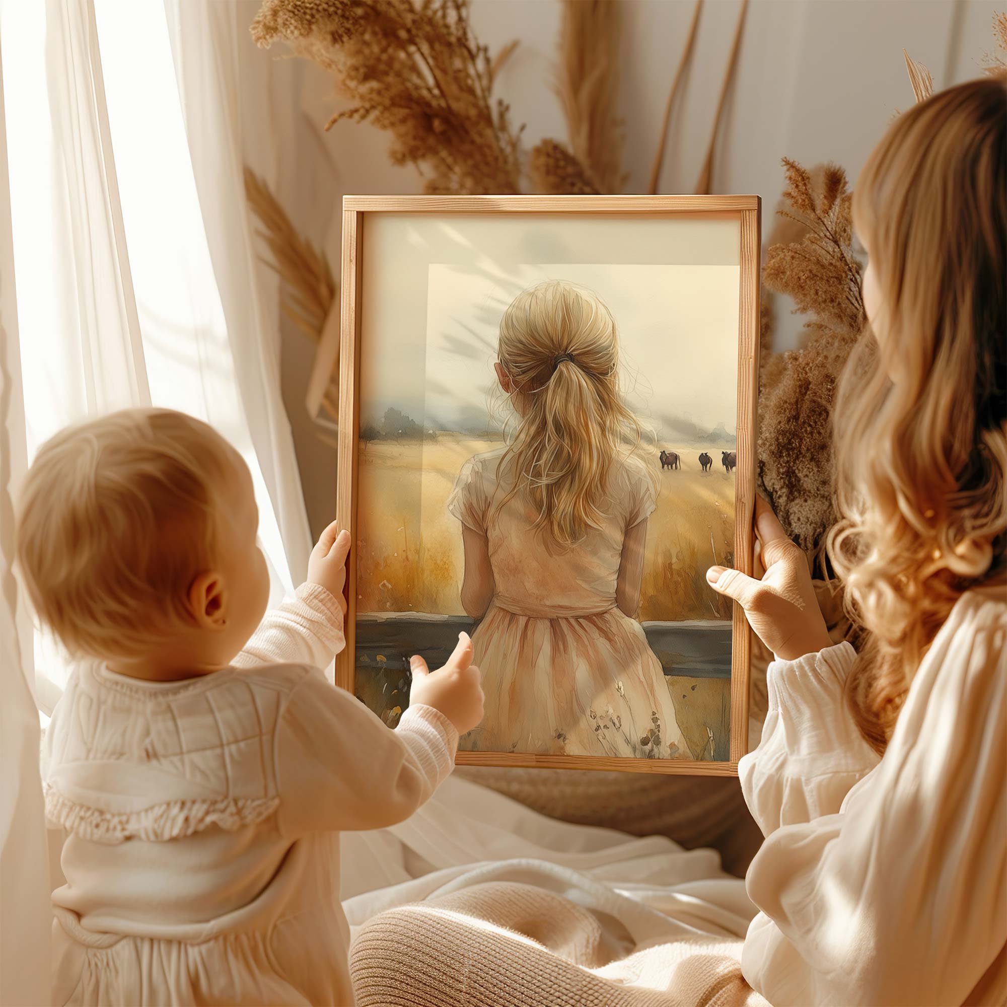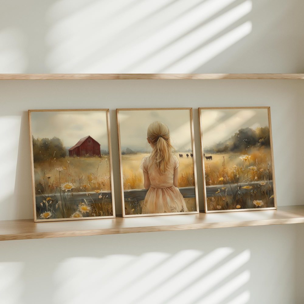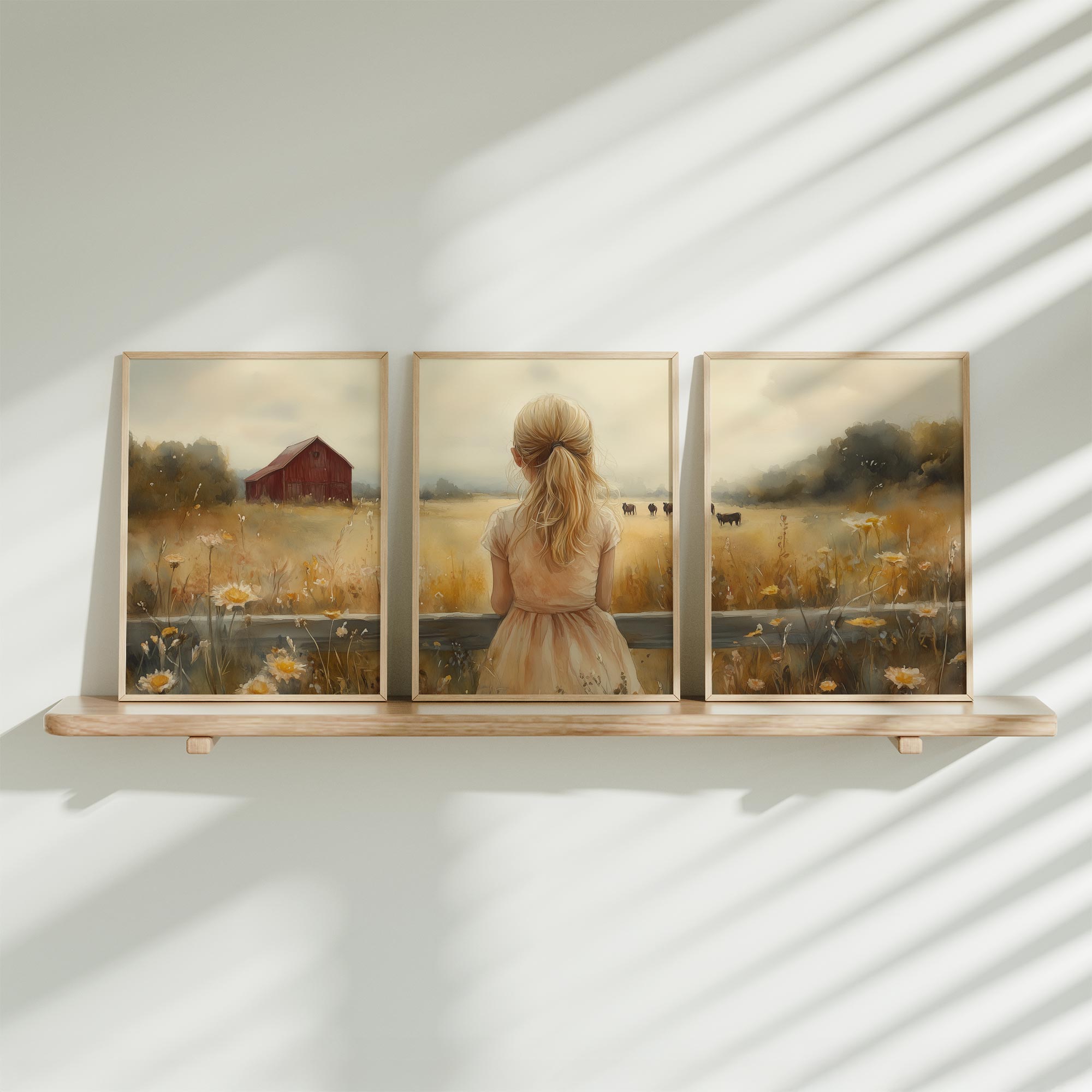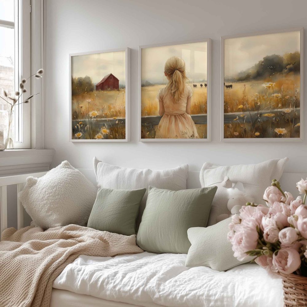 Terug naar collectie / Kinderkamer posters / Bloemen posters / Dromerig Meisje in Bloemenveld met Rode Schuur