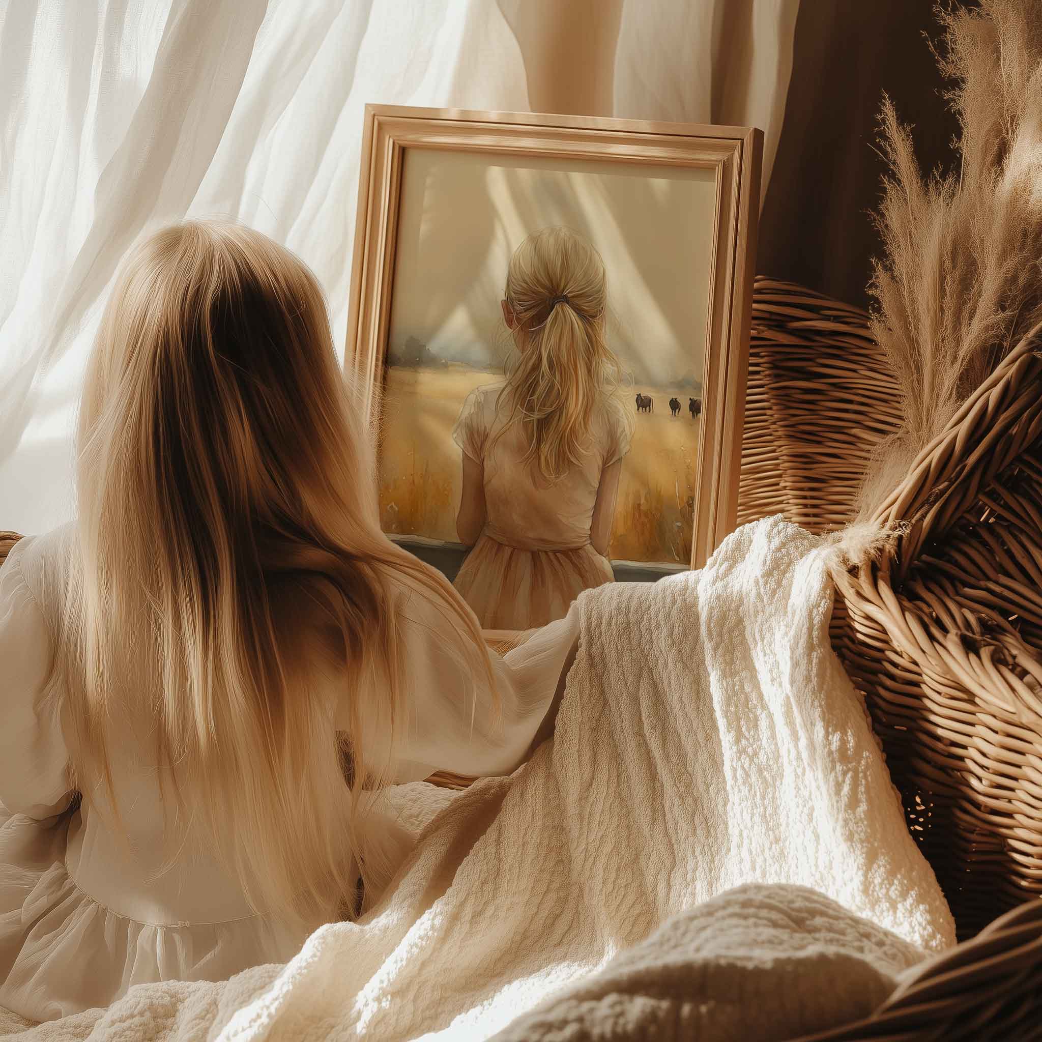 Dromerig Meisje in Bloemenveld met Rode Schuur