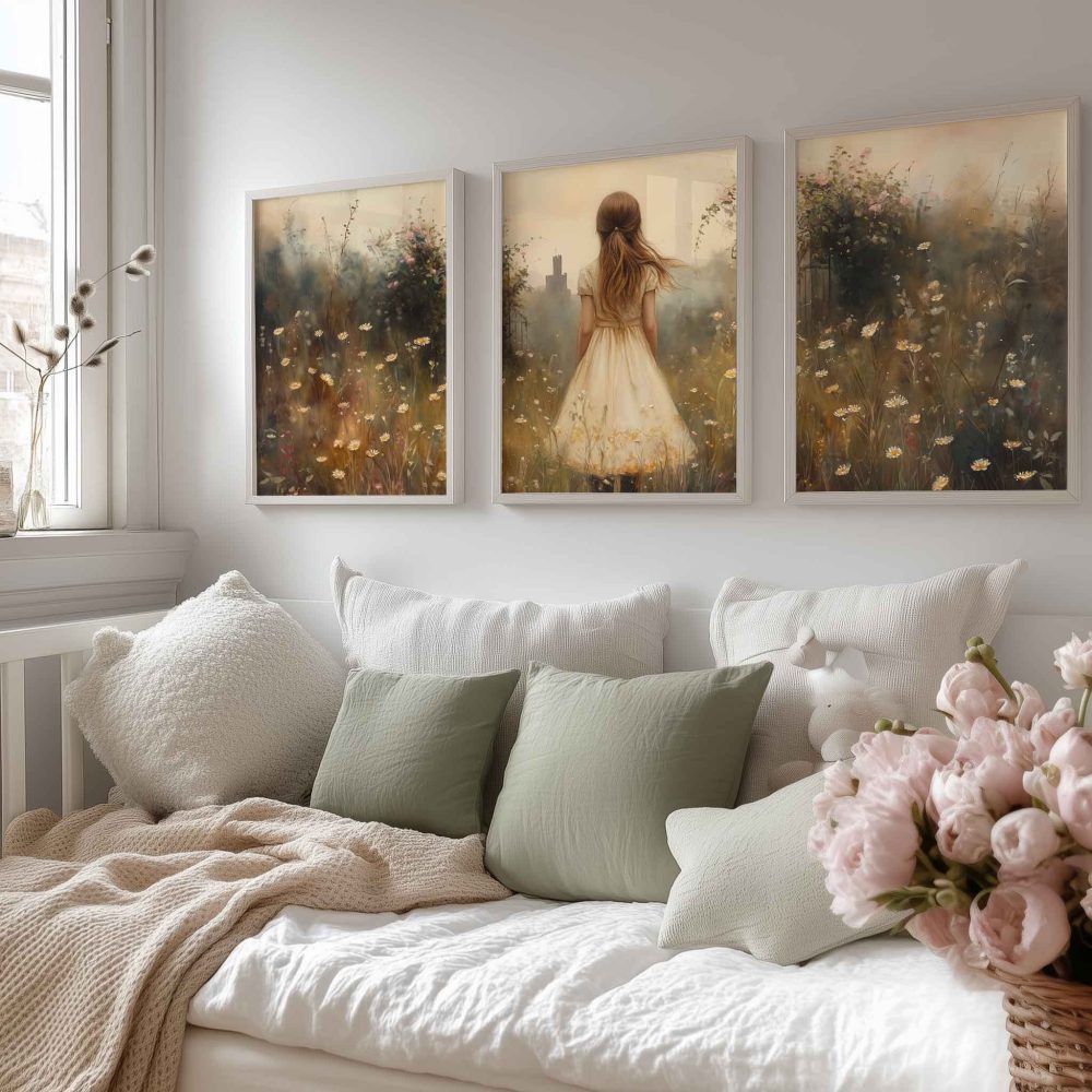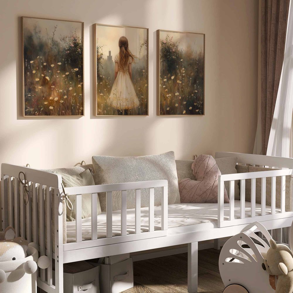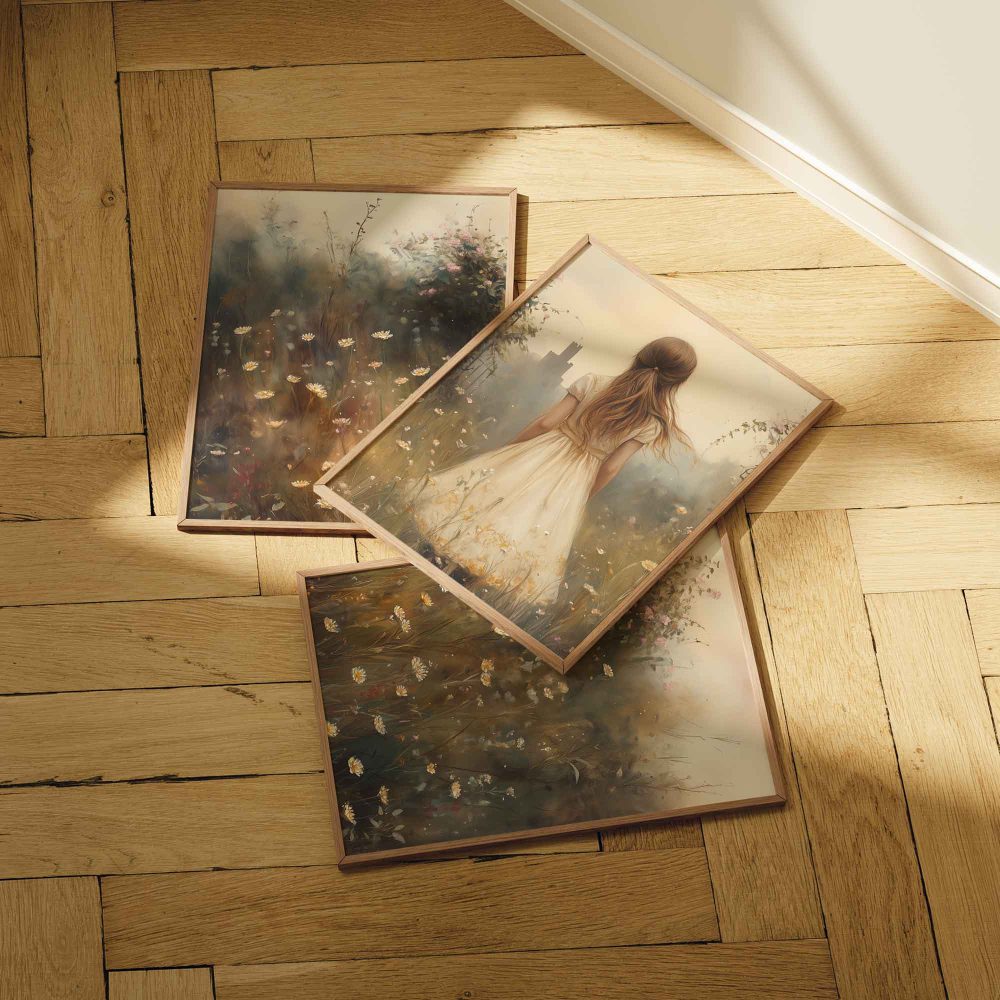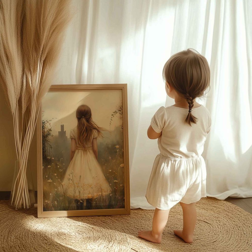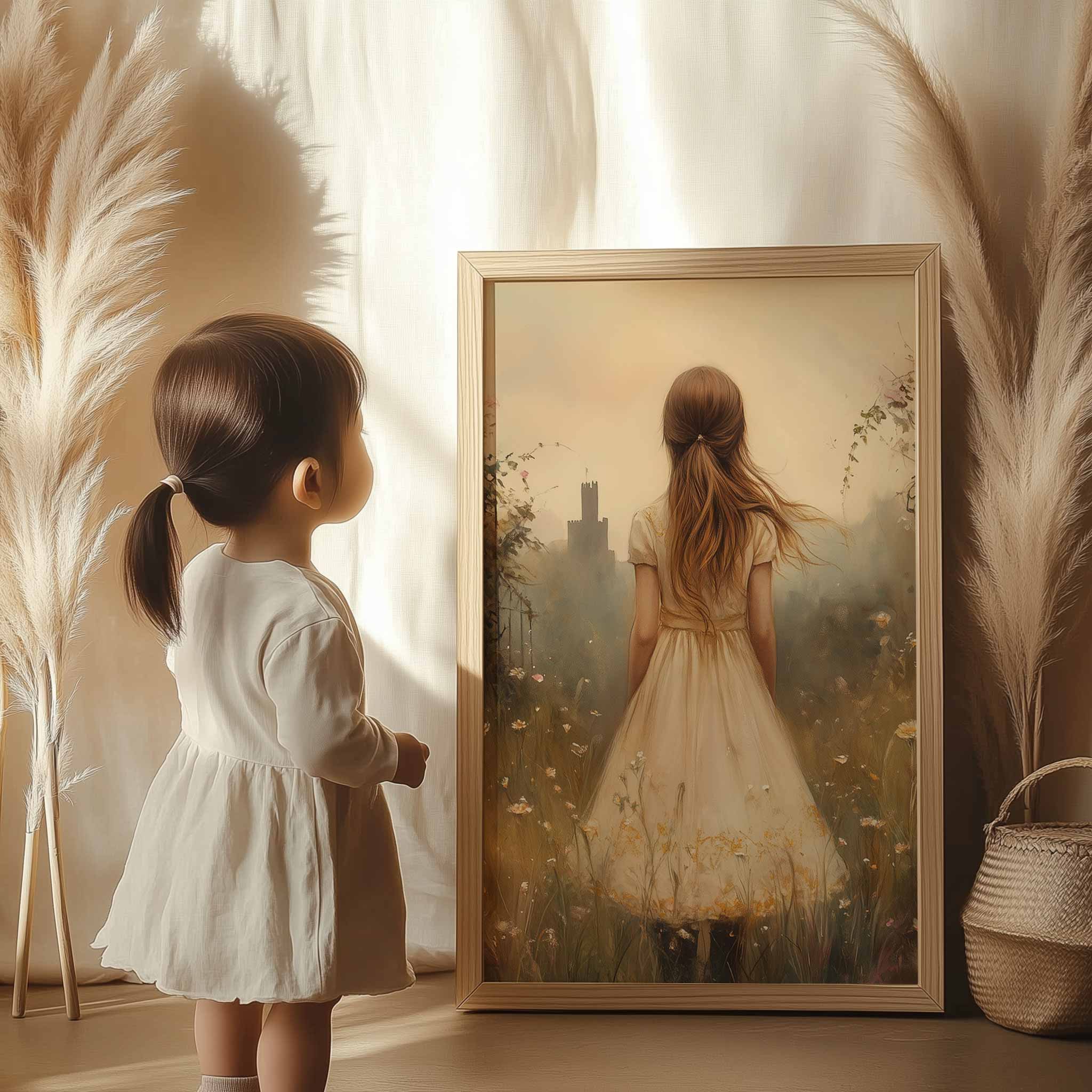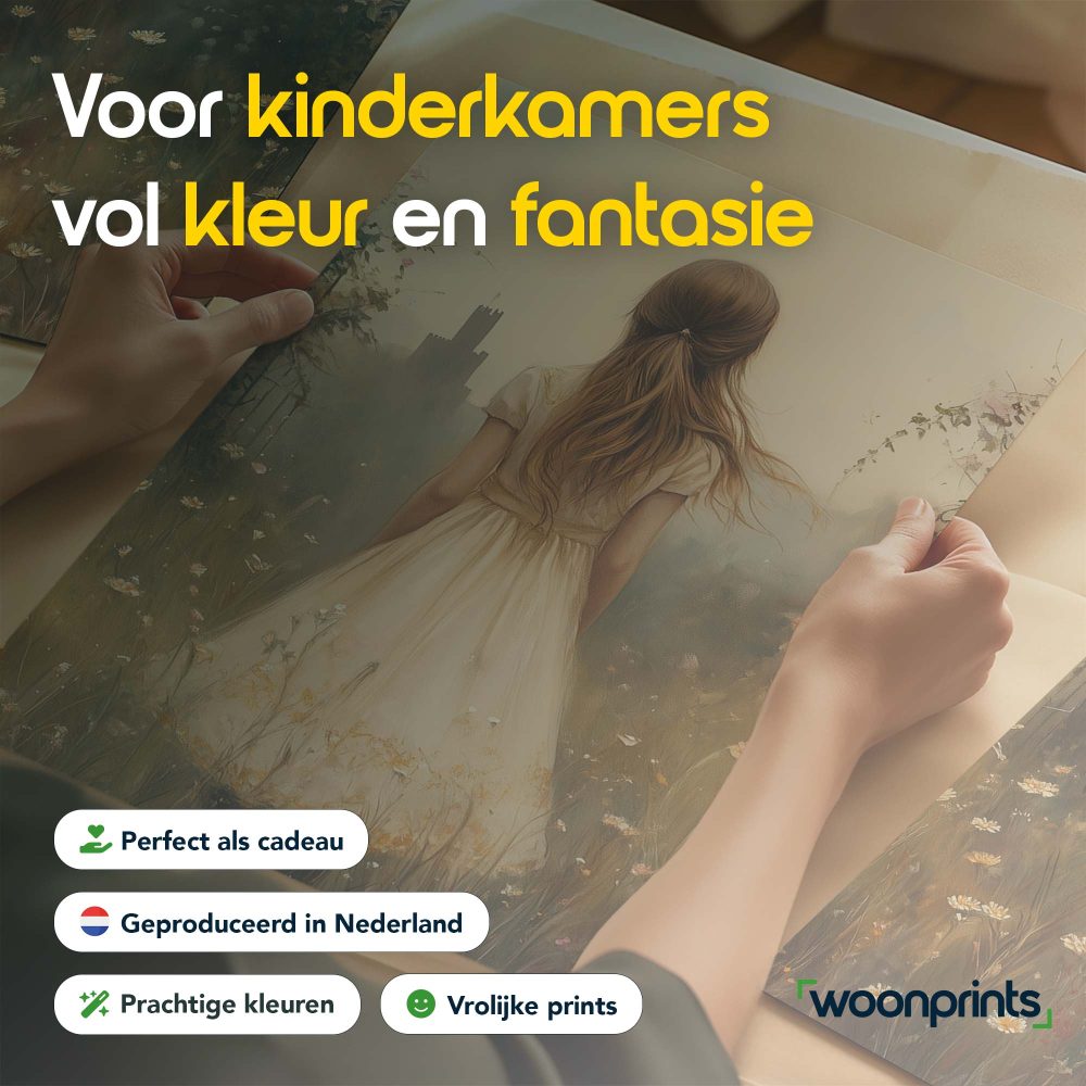 Terug naar collectie / Kinderkamer posters / Bloemen posters / Dromerig Meisje in Bloemenveld met Stad op Achtergrond