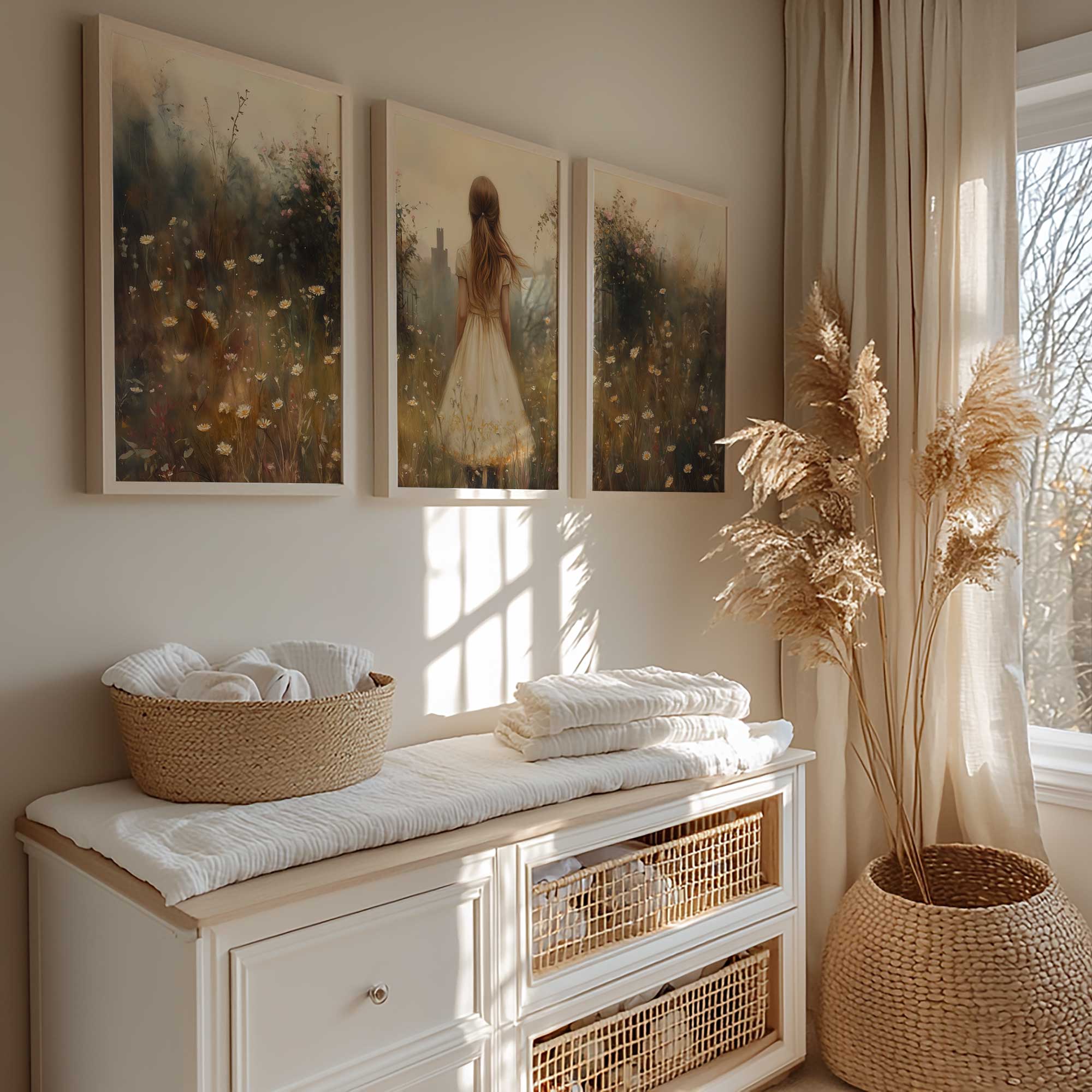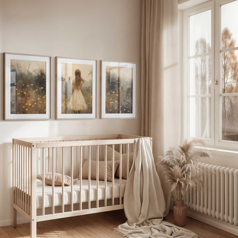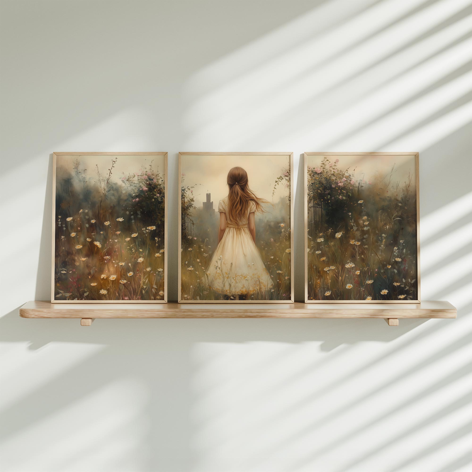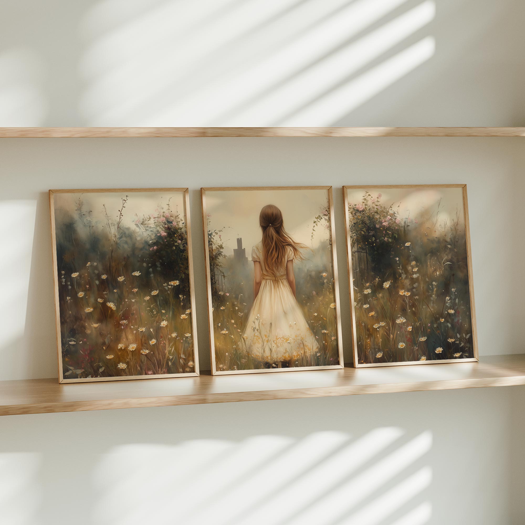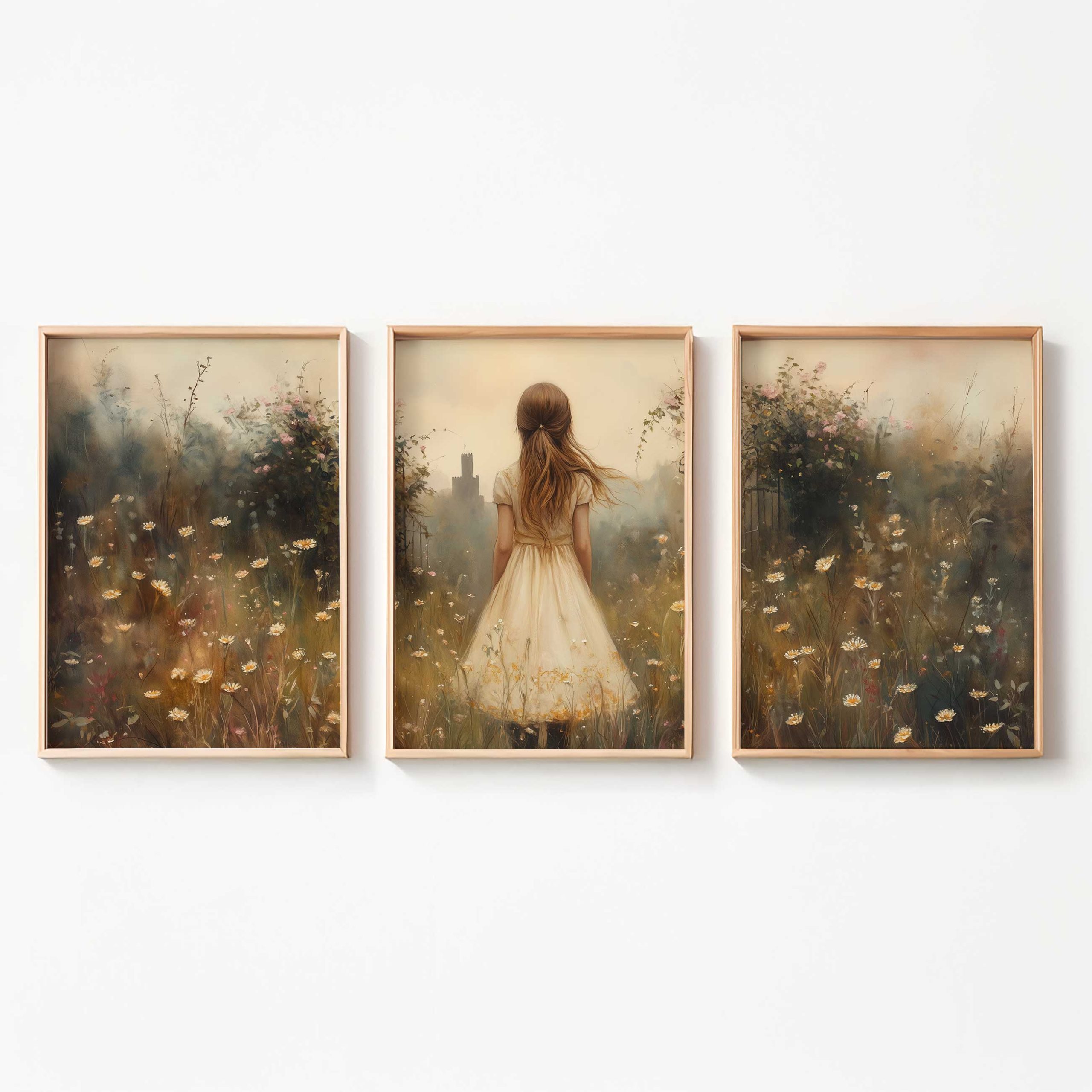 Terug naar collectie / Kinderkamer posters / Bloemen posters / Dromerig Meisje in Bloemenveld met Stad op Achtergrond