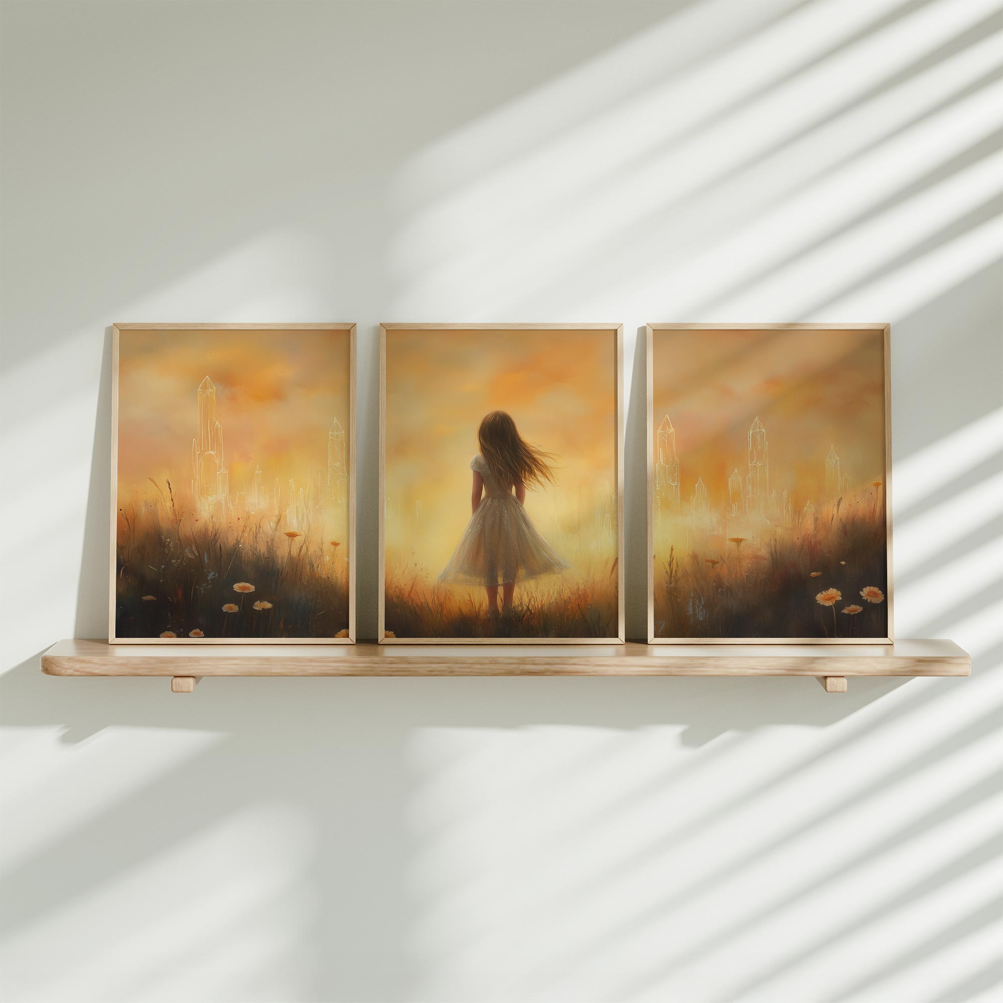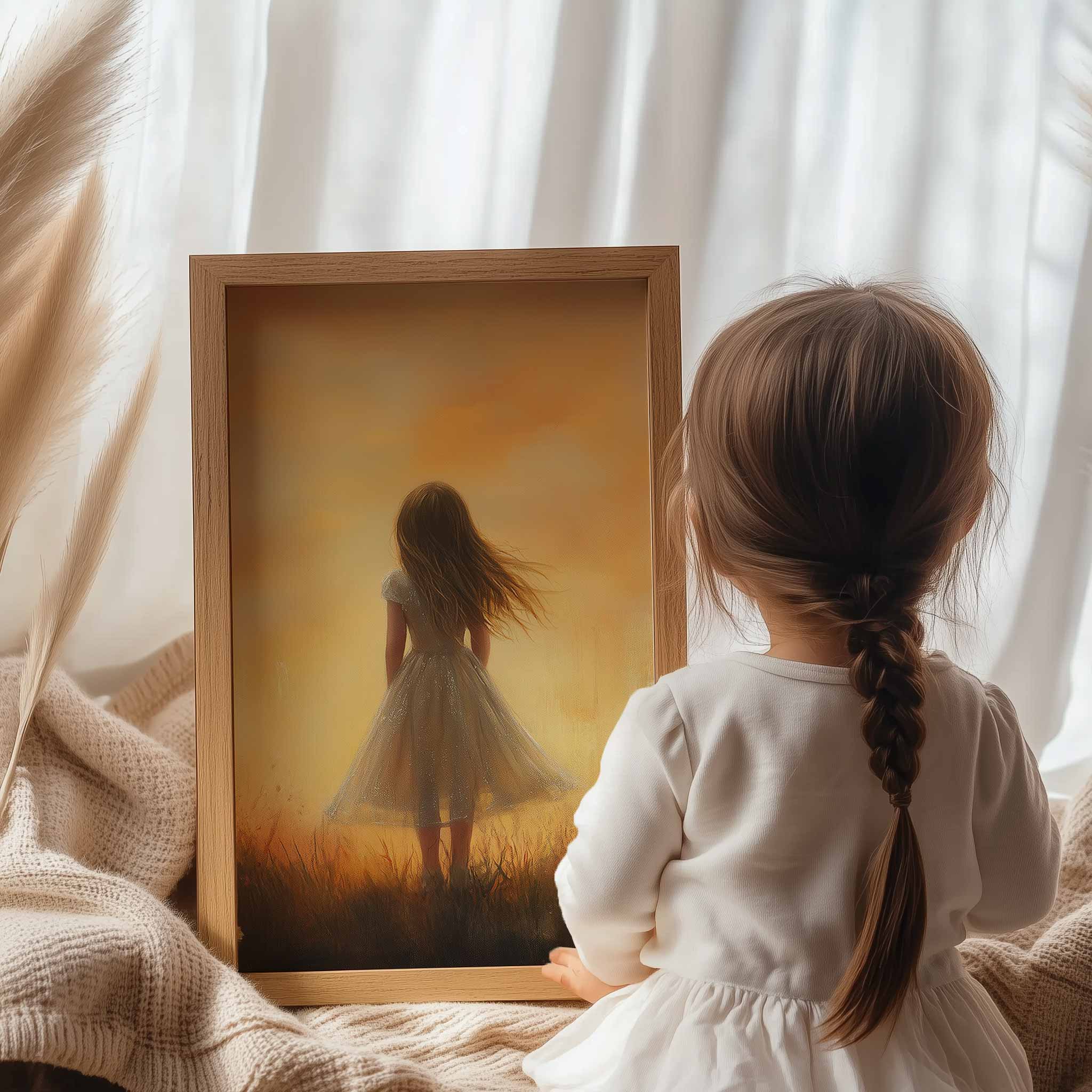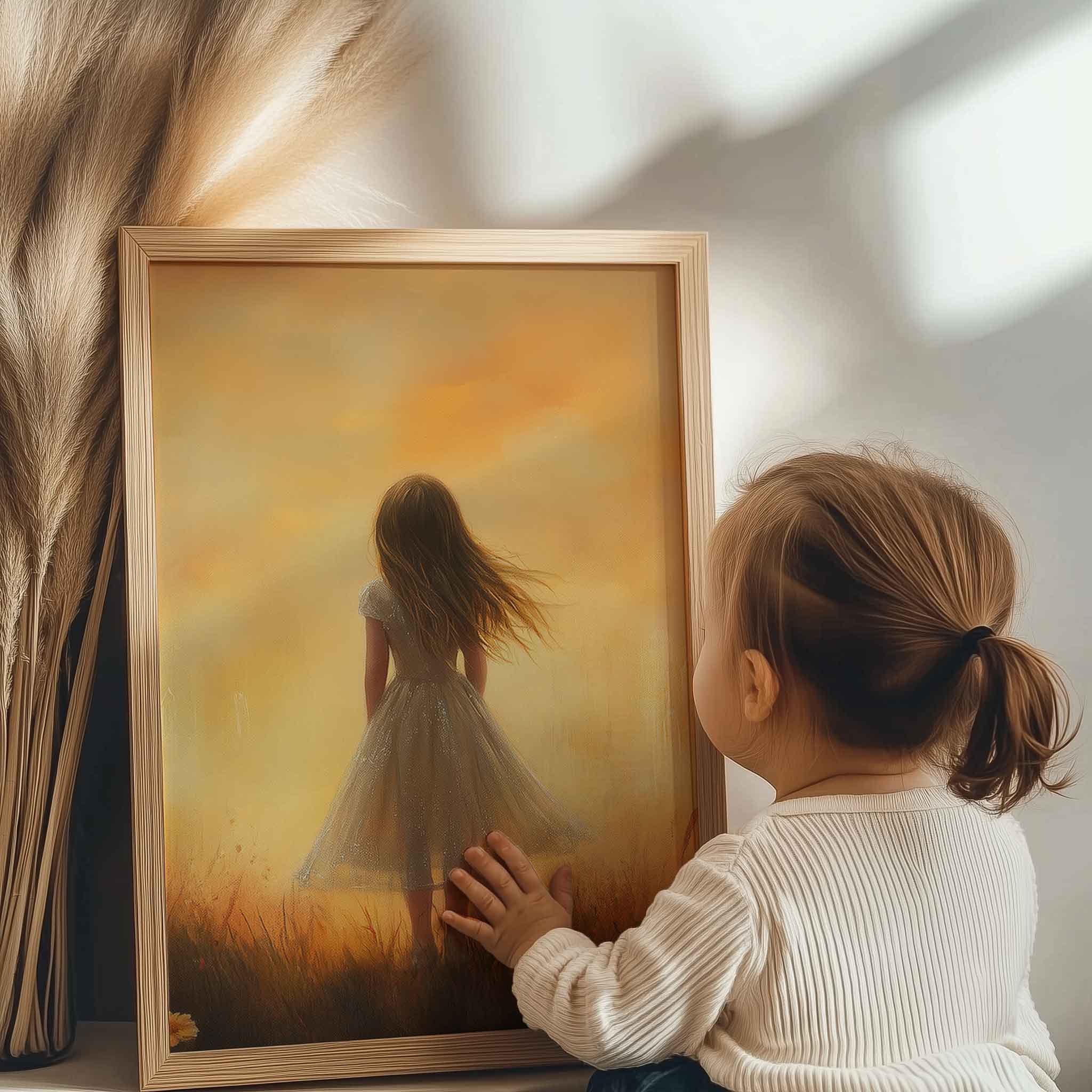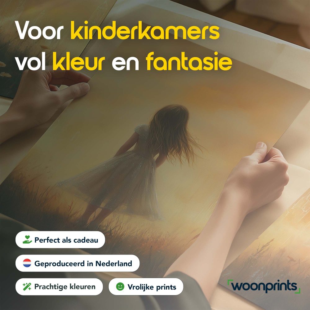 Terug naar collectie / Kinderkamer posters / Bloemen posters / Dromerig Meisje in Bloemenveld met Stad op de Achtergrond