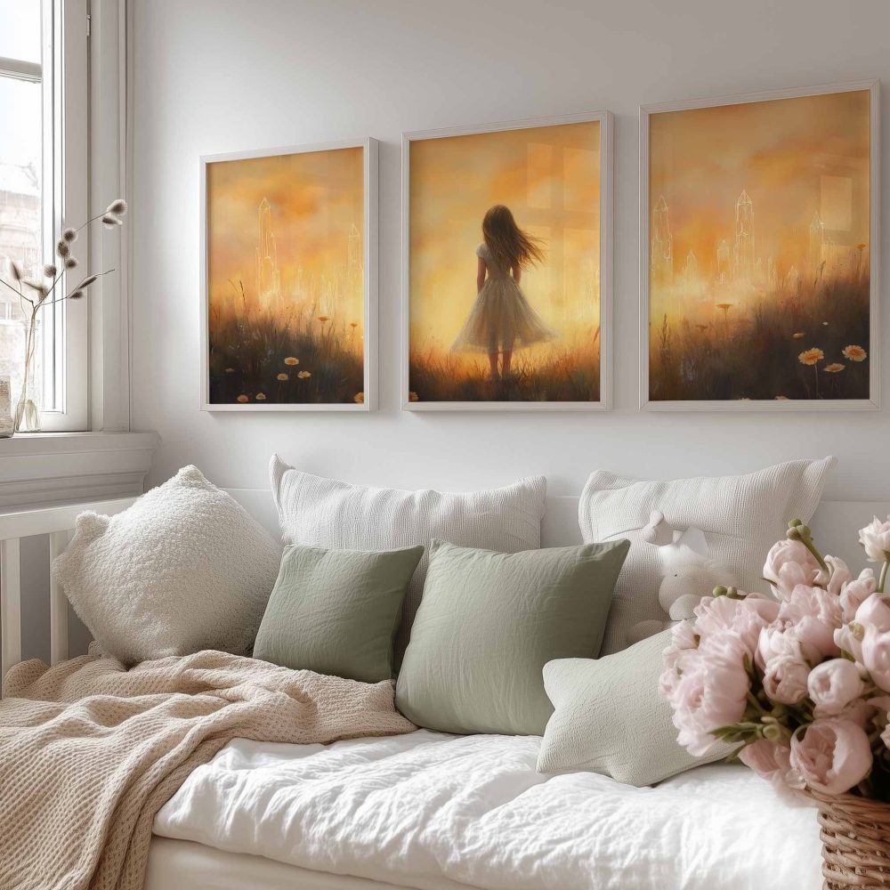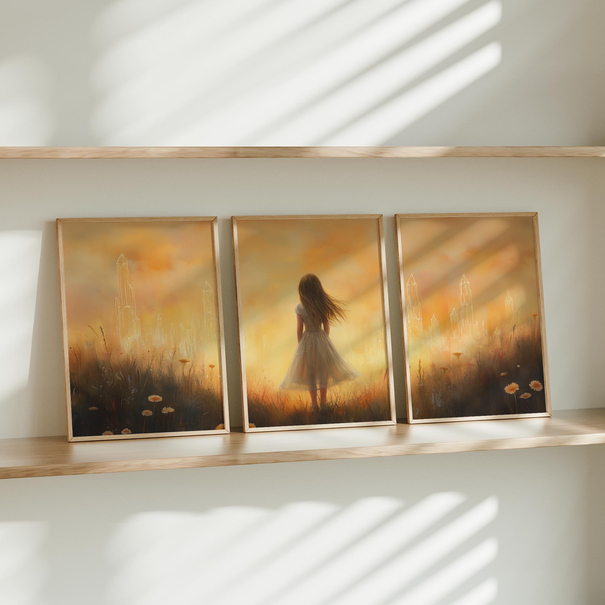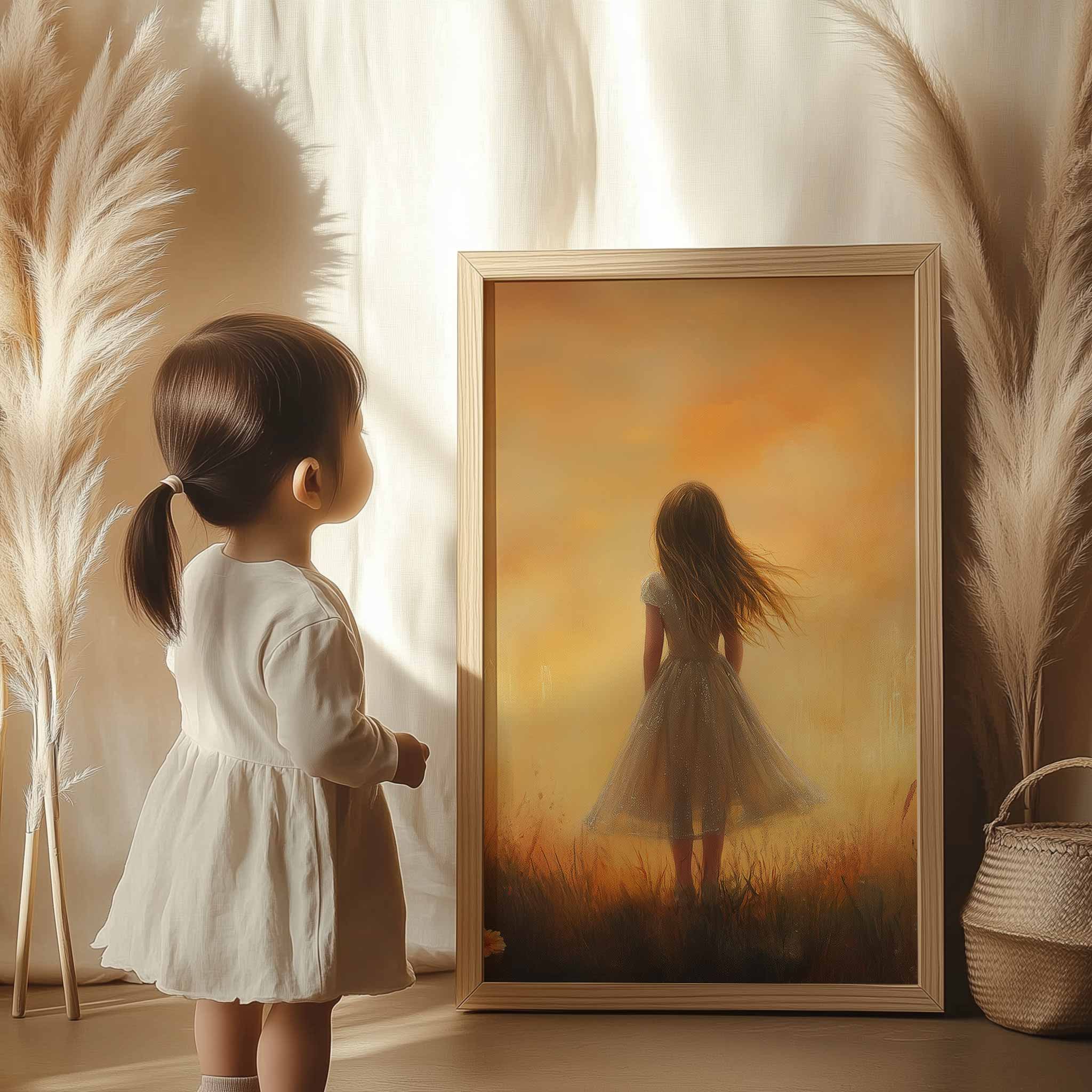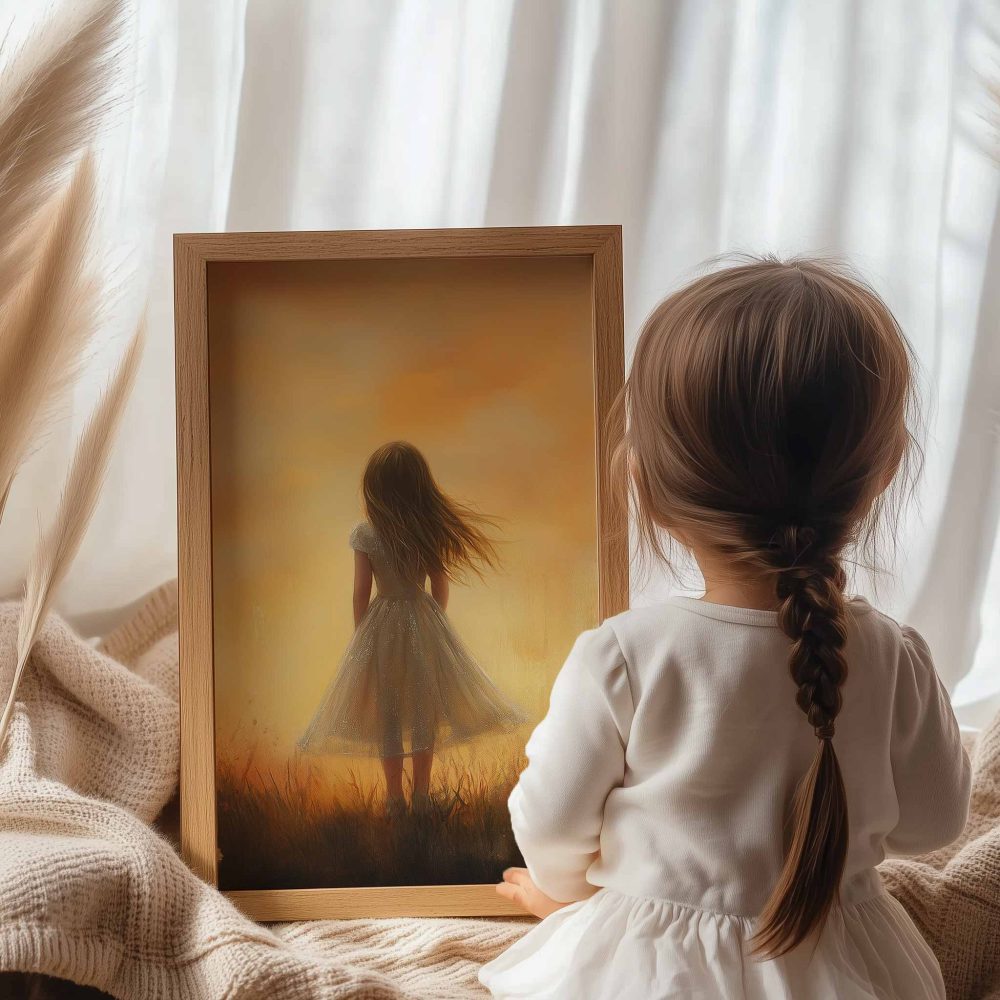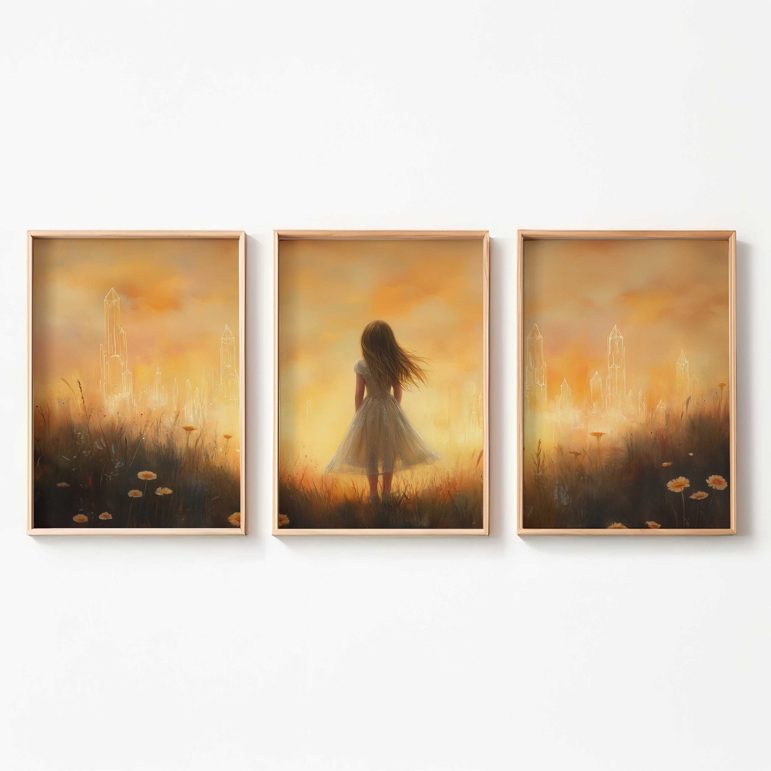 Terug naar collectie / Kinderkamer posters / Bloemen posters / Dromerig Meisje in Bloemenveld met Stad op de Achtergrond