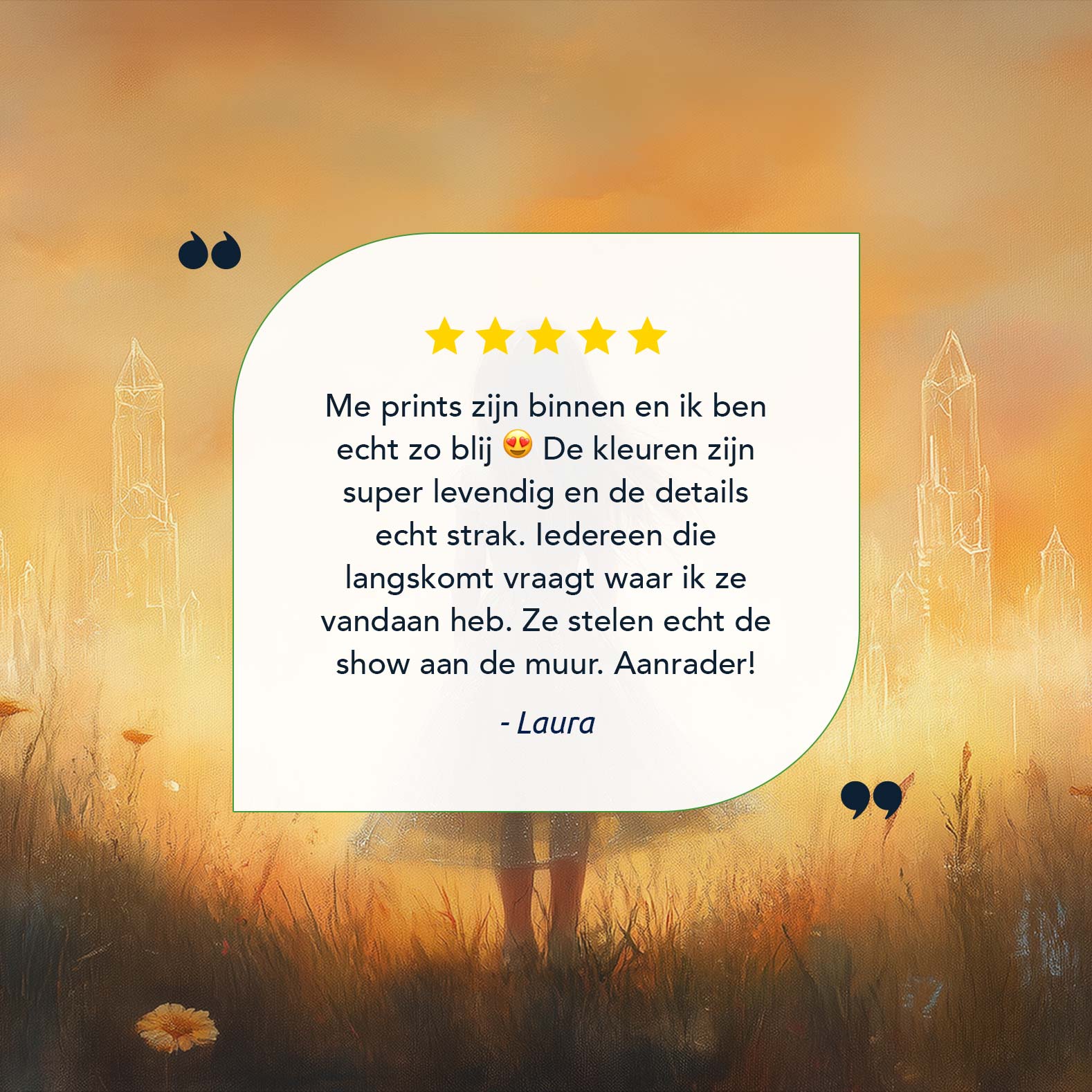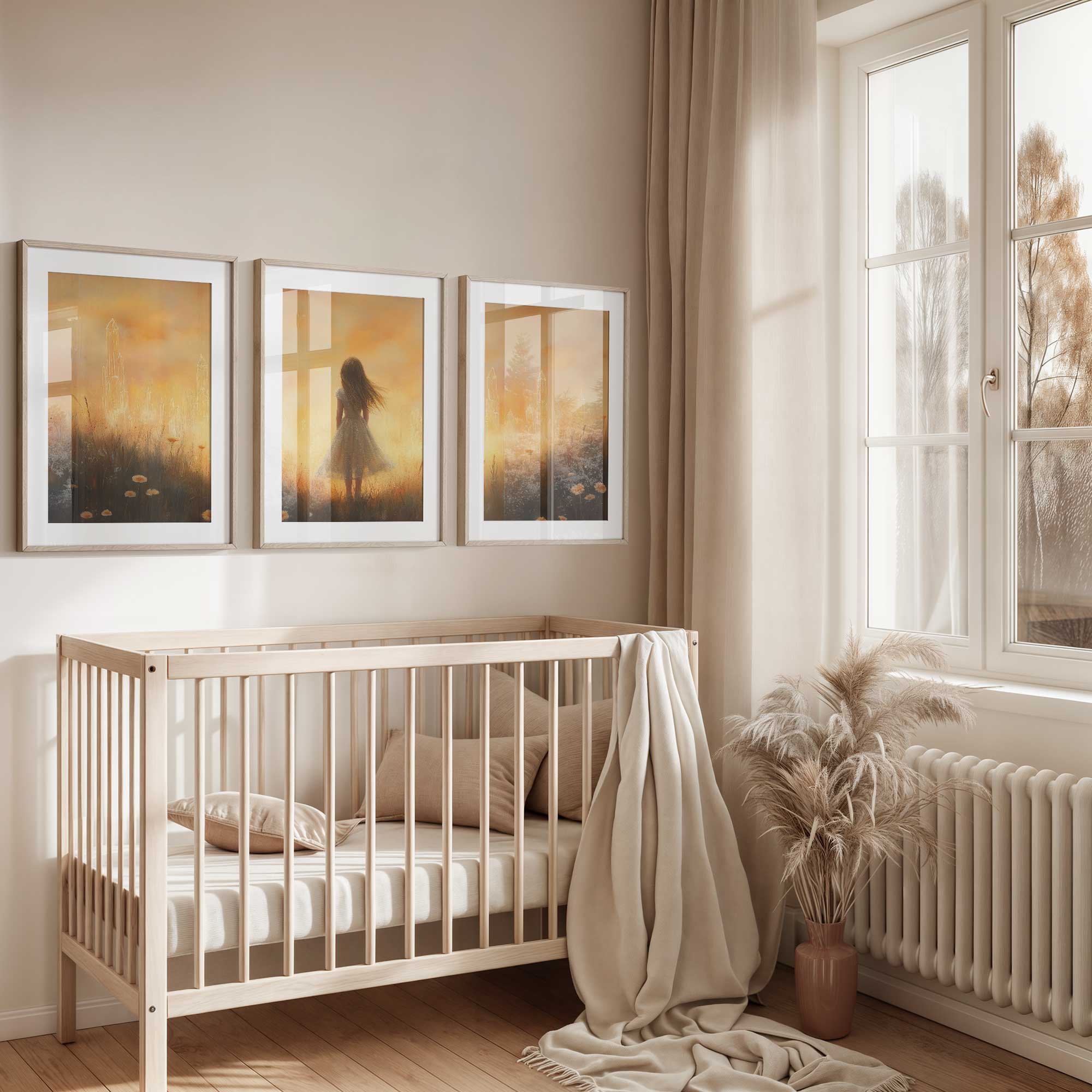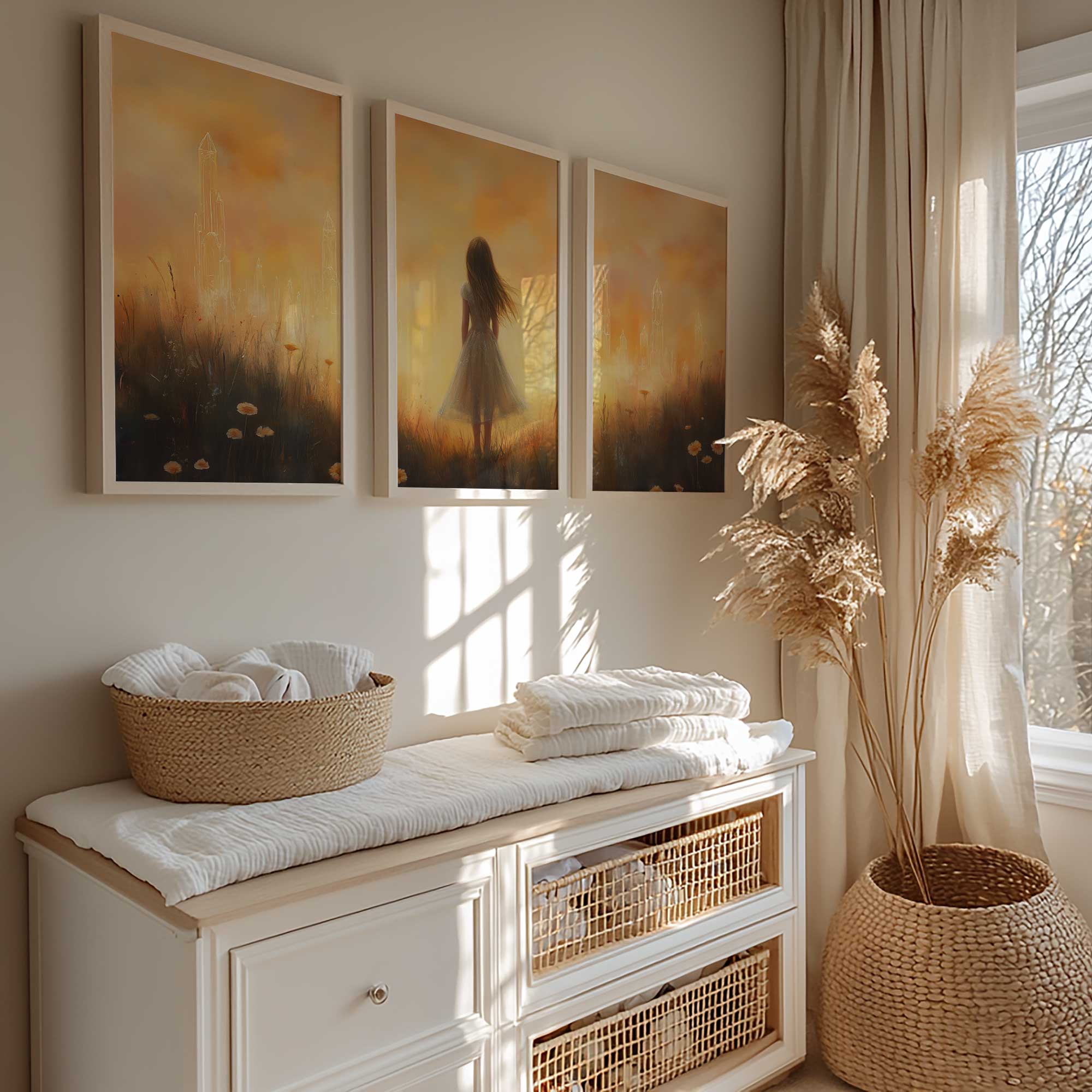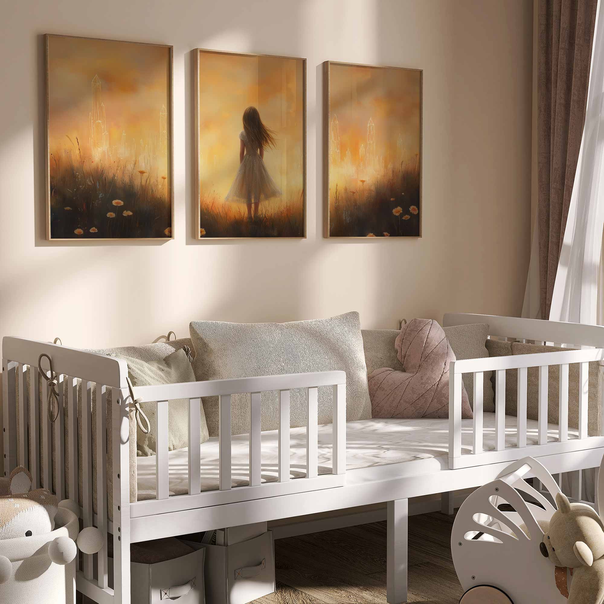 Terug naar collectie / Kinderkamer posters / Bloemen posters / Dromerig Meisje in Bloemenveld met Stad op de Achtergrond