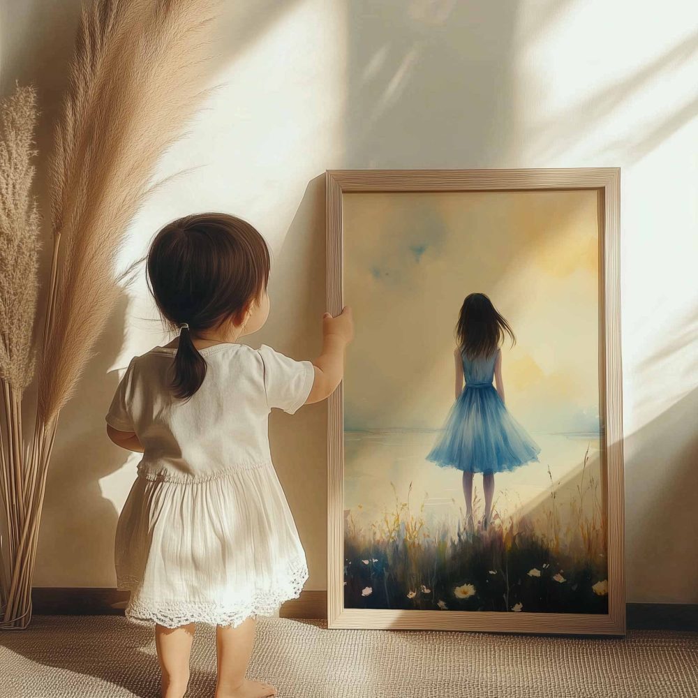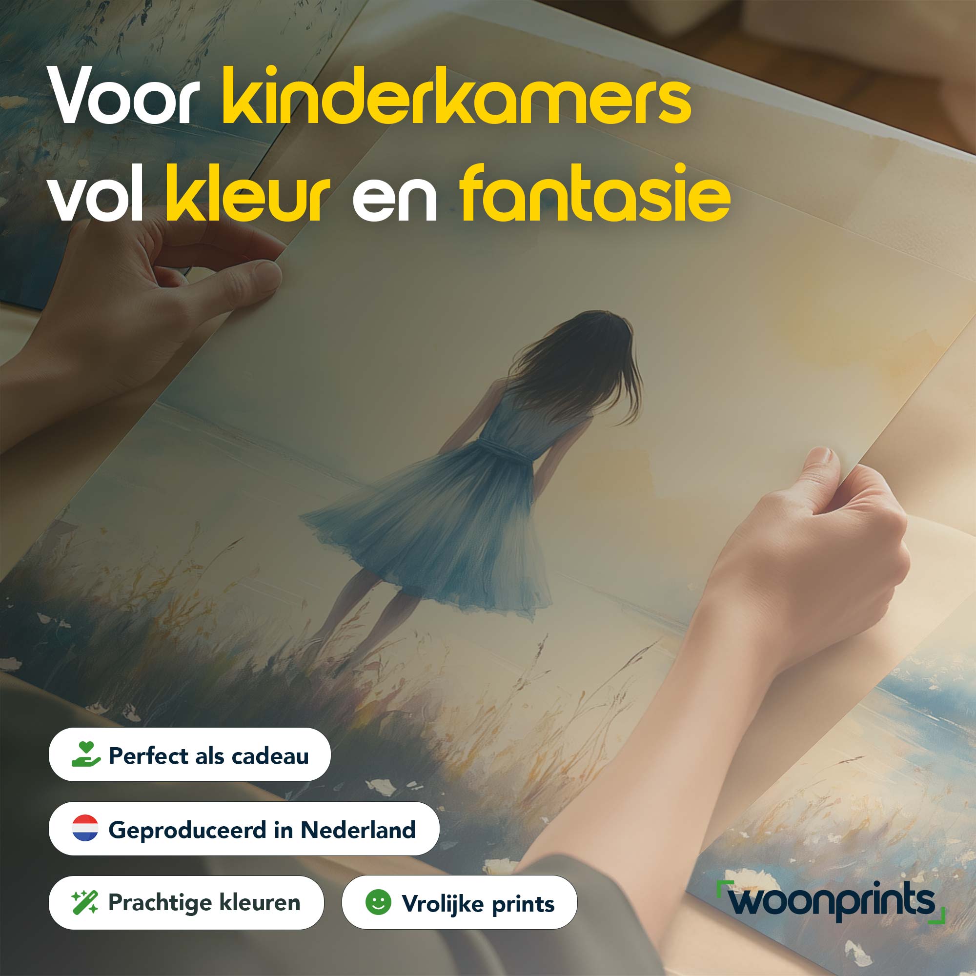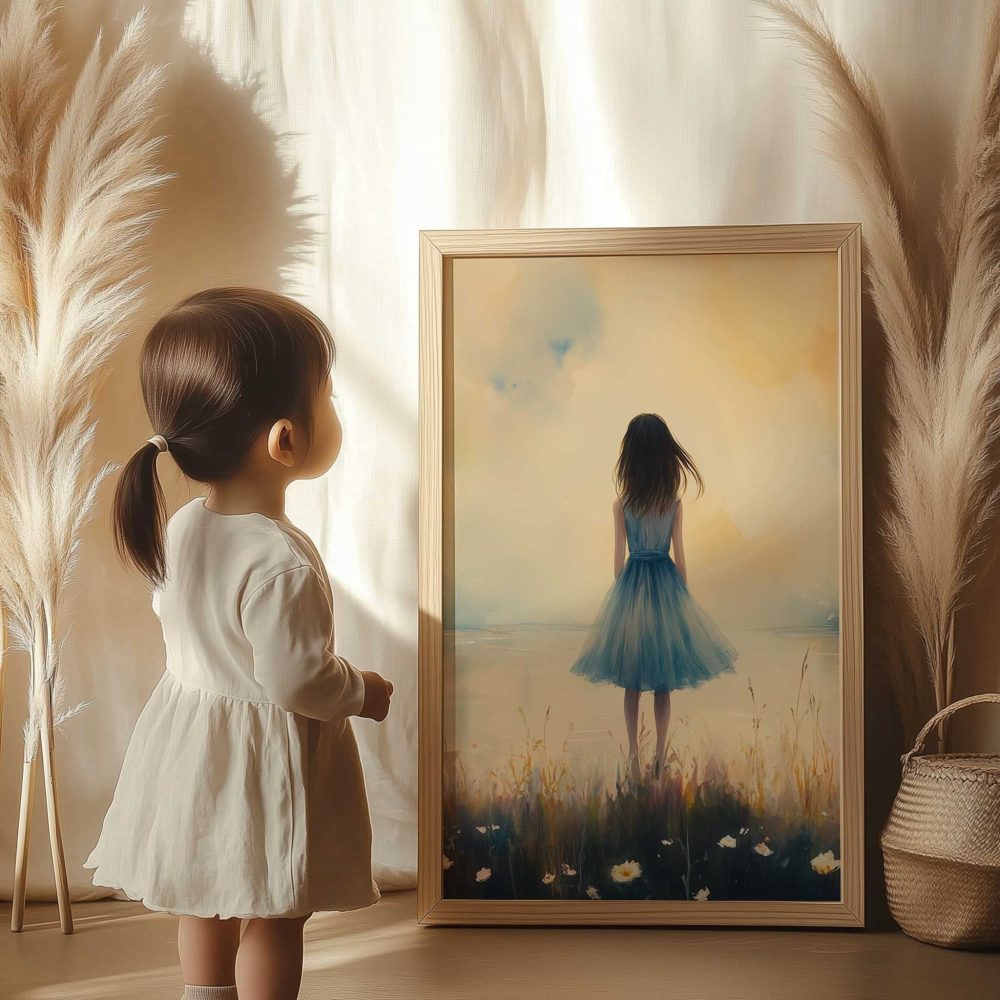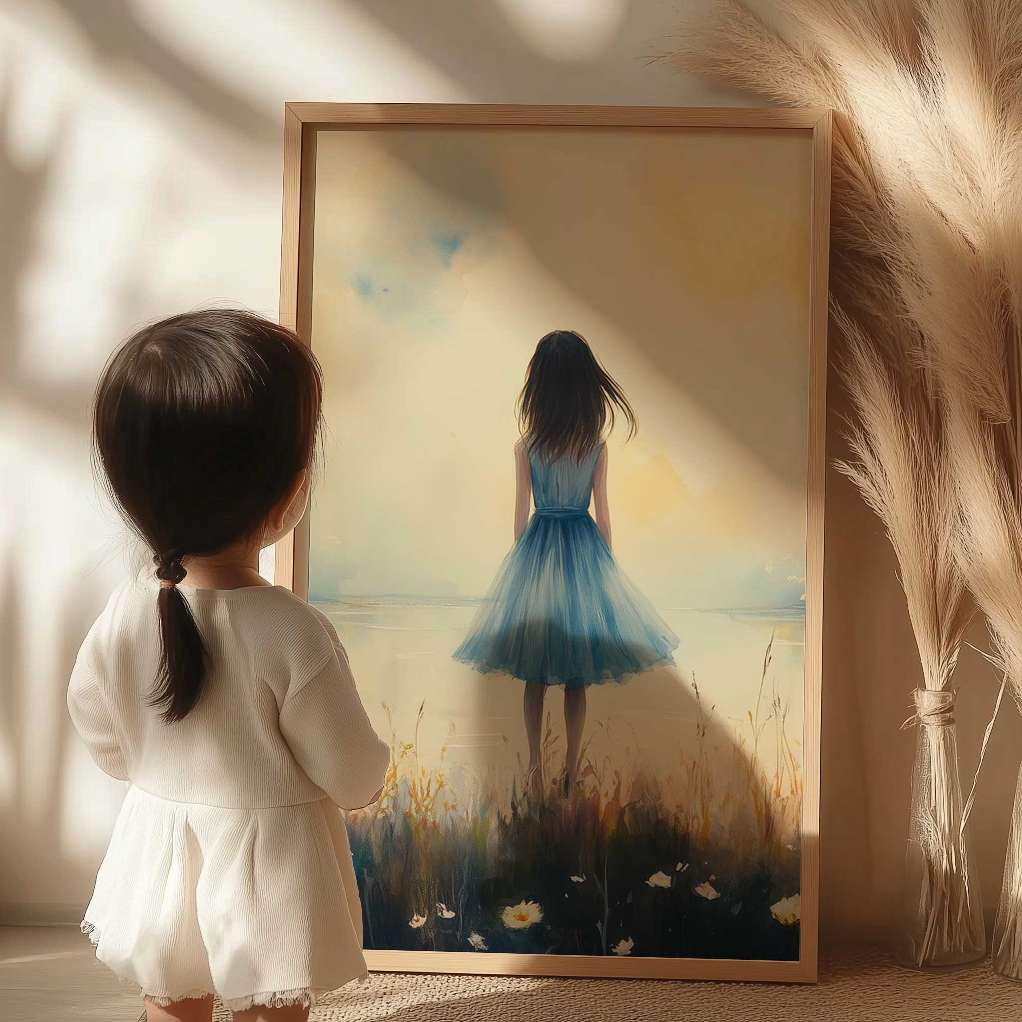 Terug naar collectie / Kinderkamer posters / Bloemen posters / Dromerig Meisje in Bloemenveld – Pastel Blauwe Jurk