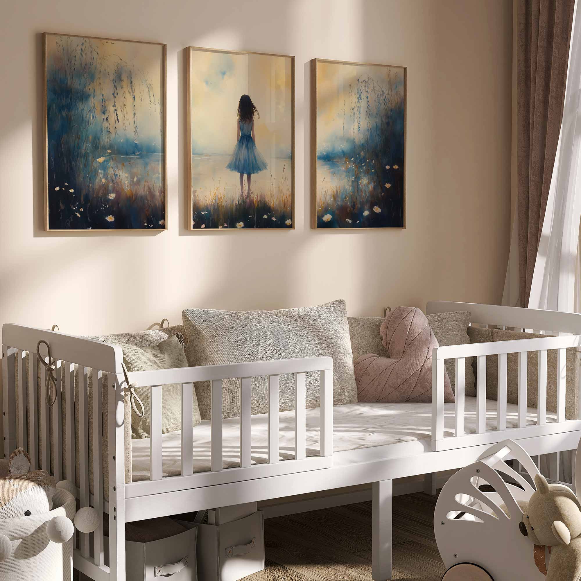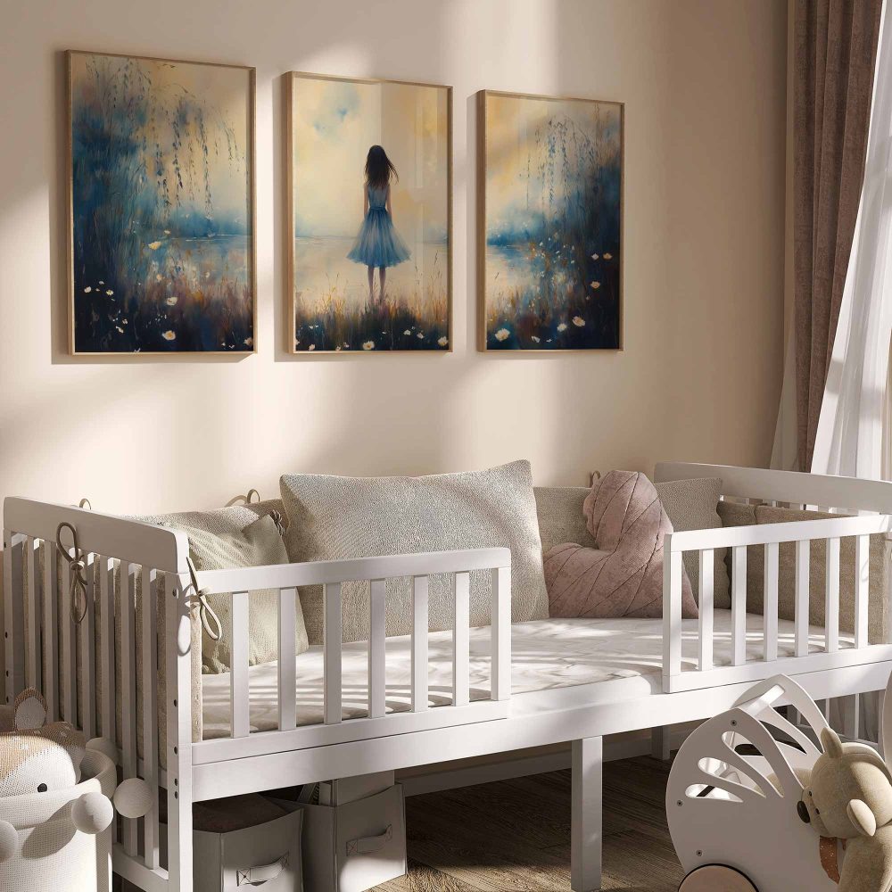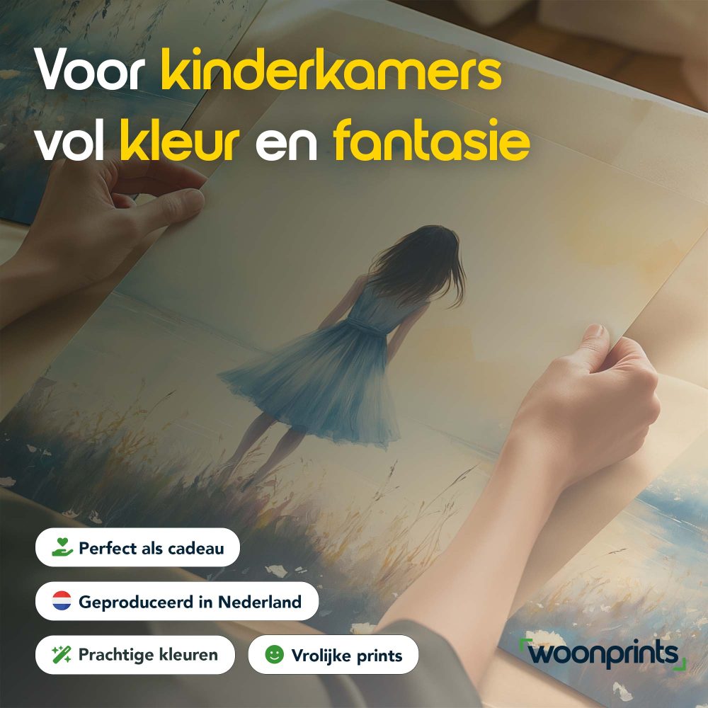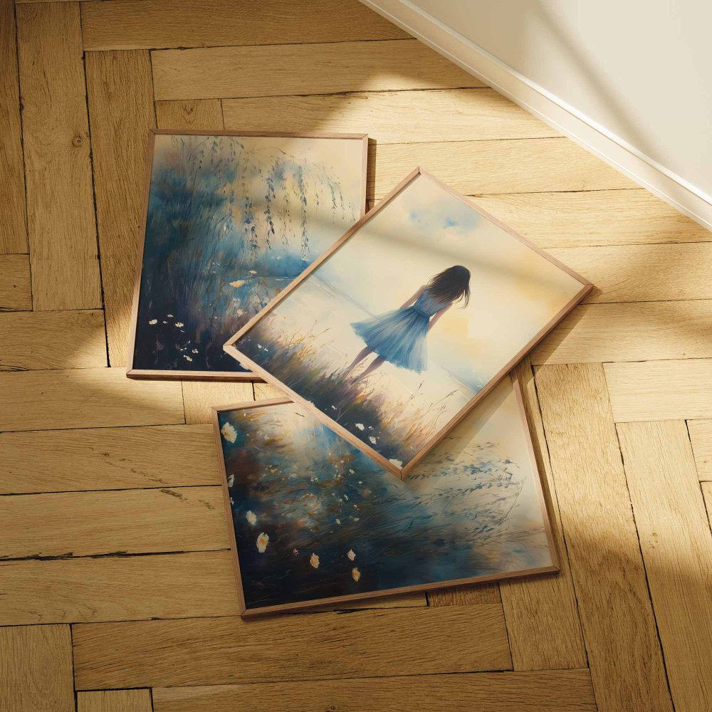 Terug naar collectie / Kinderkamer posters / Bloemen posters / Dromerig Meisje in Bloemenveld – Pastel Blauwe Jurk