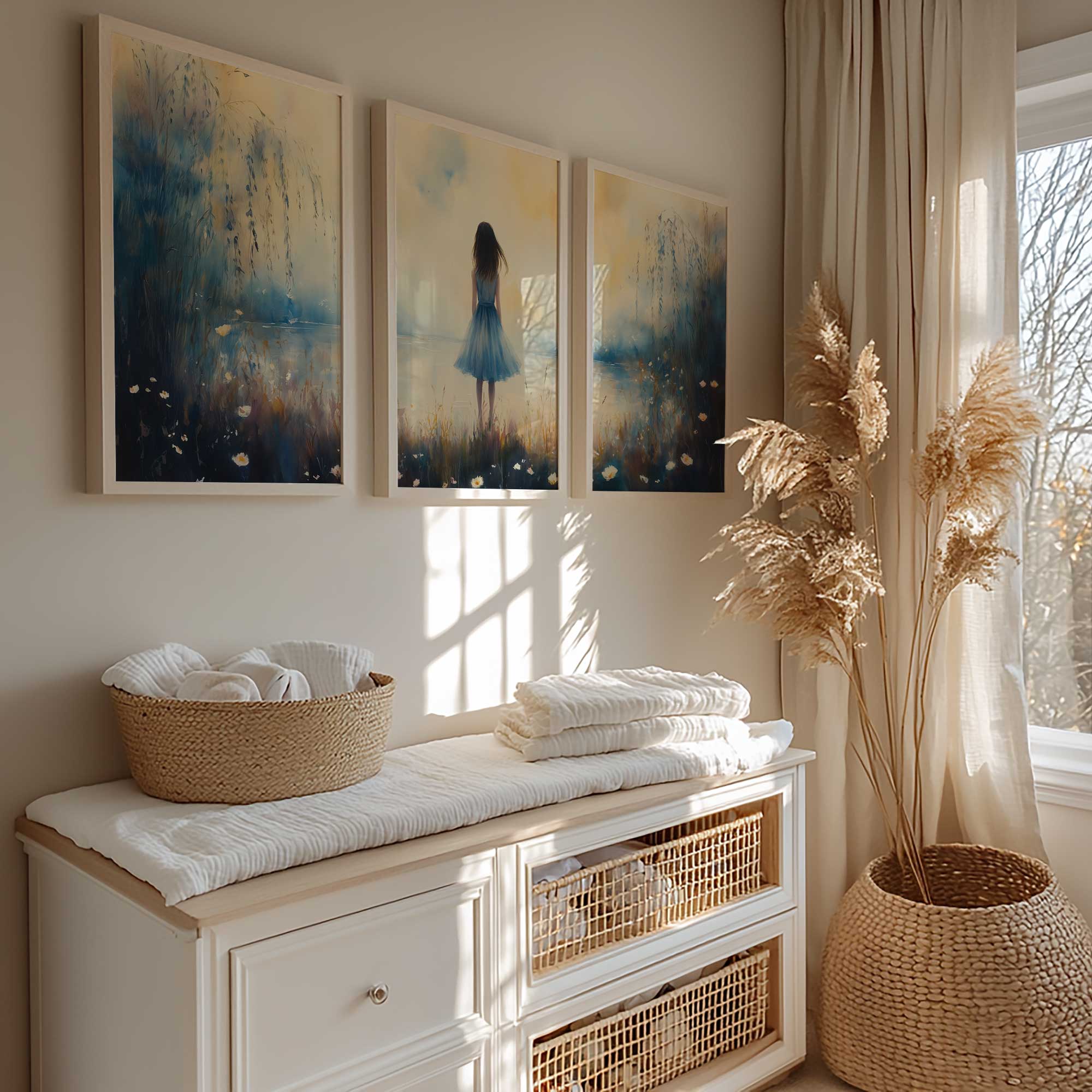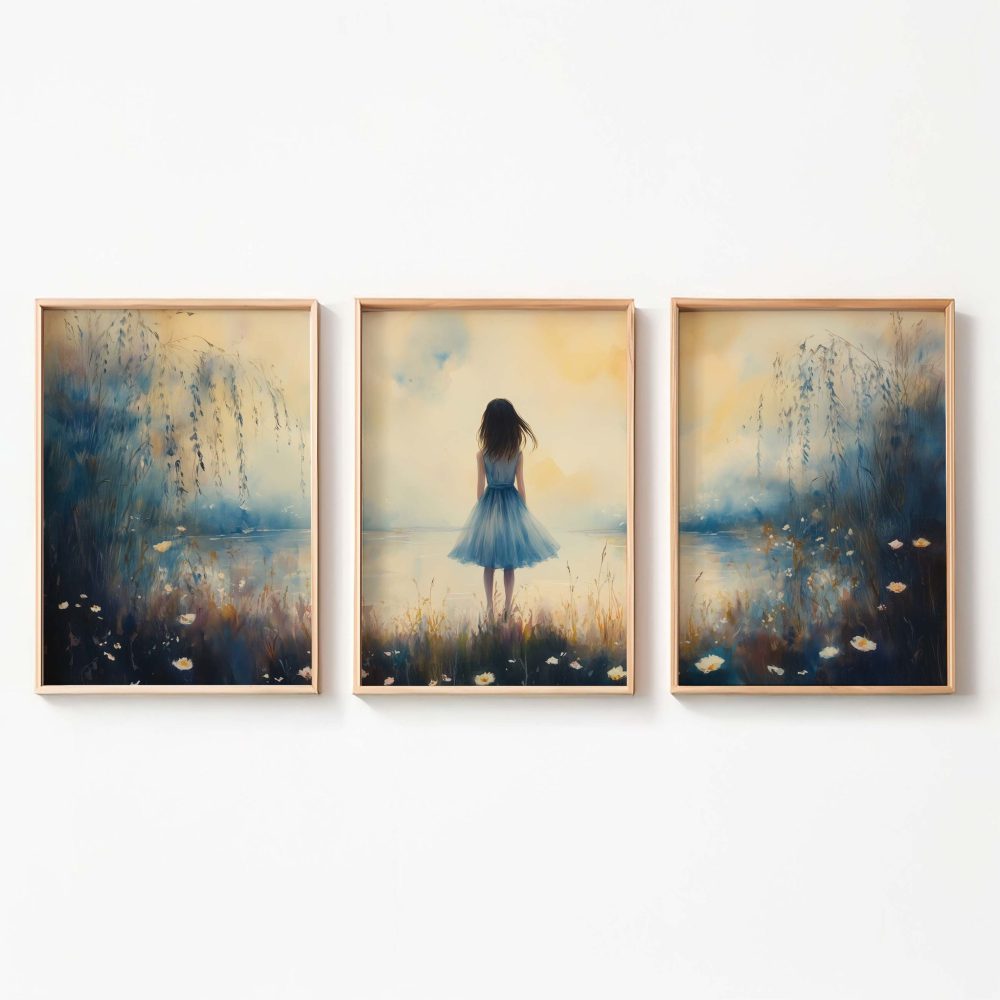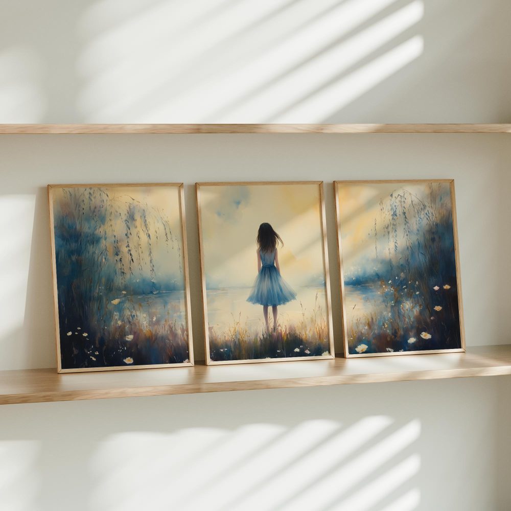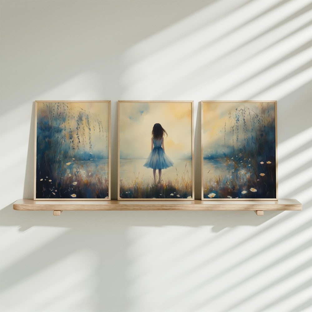 Terug naar collectie / Kinderkamer posters / Bloemen posters / Dromerig Meisje in Bloemenveld – Pastel Blauwe Jurk
