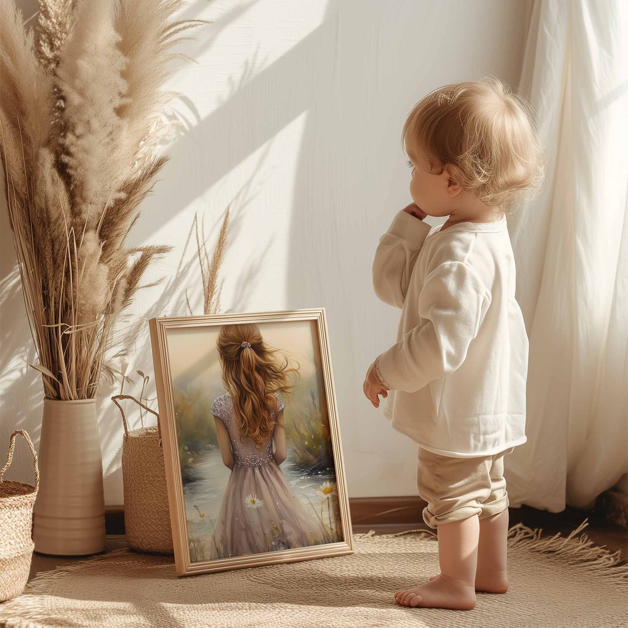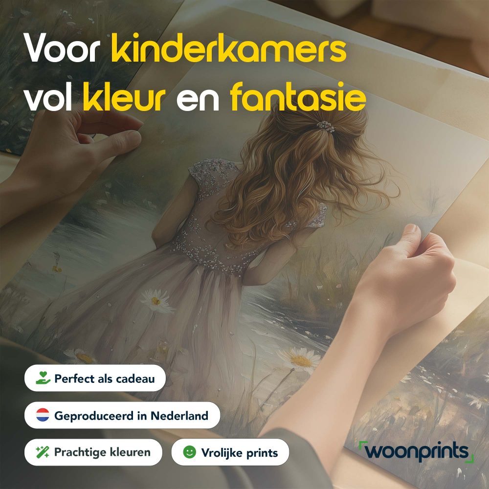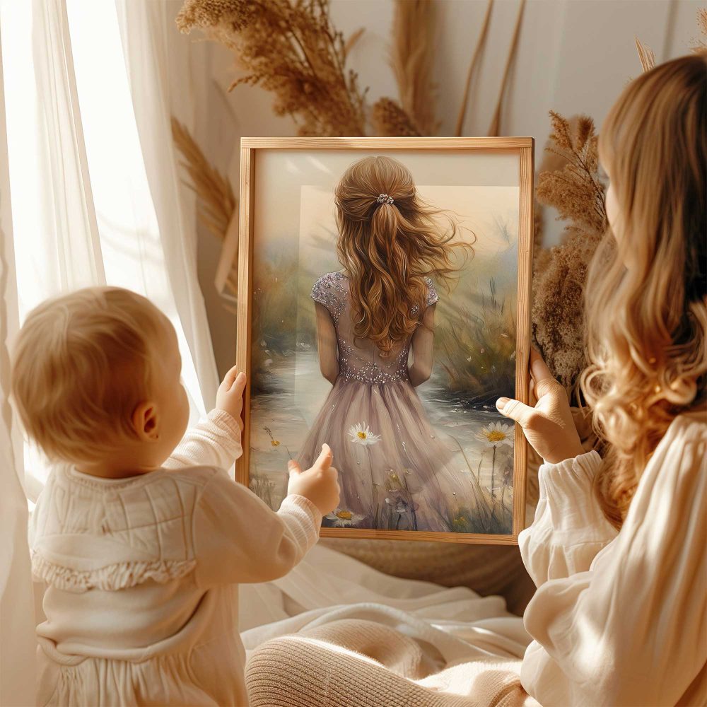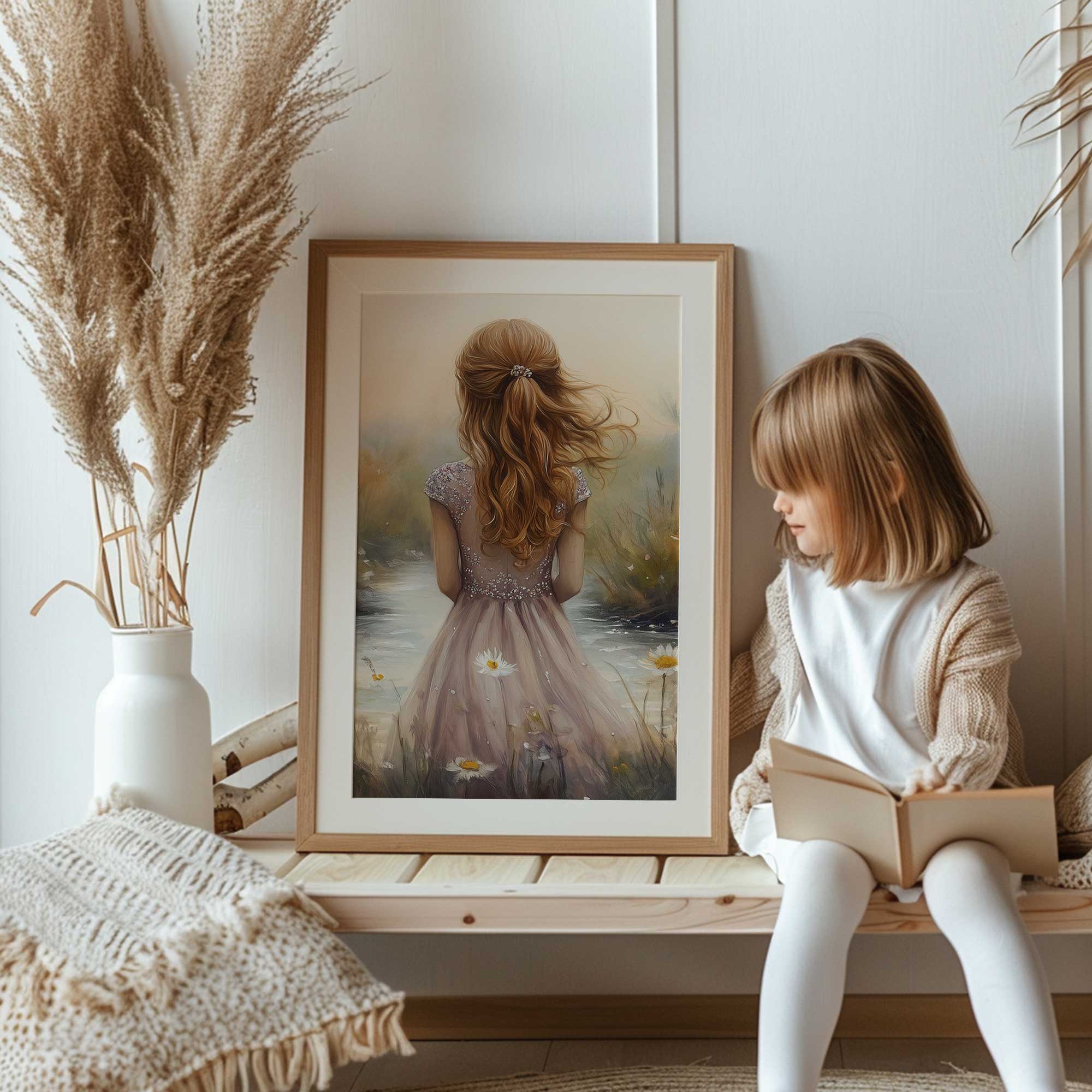 Terug naar collectie / Kinderkamer posters / Bloemen posters / Dromerig Meisje in Bloemenveld – Pastel Roze en Geel