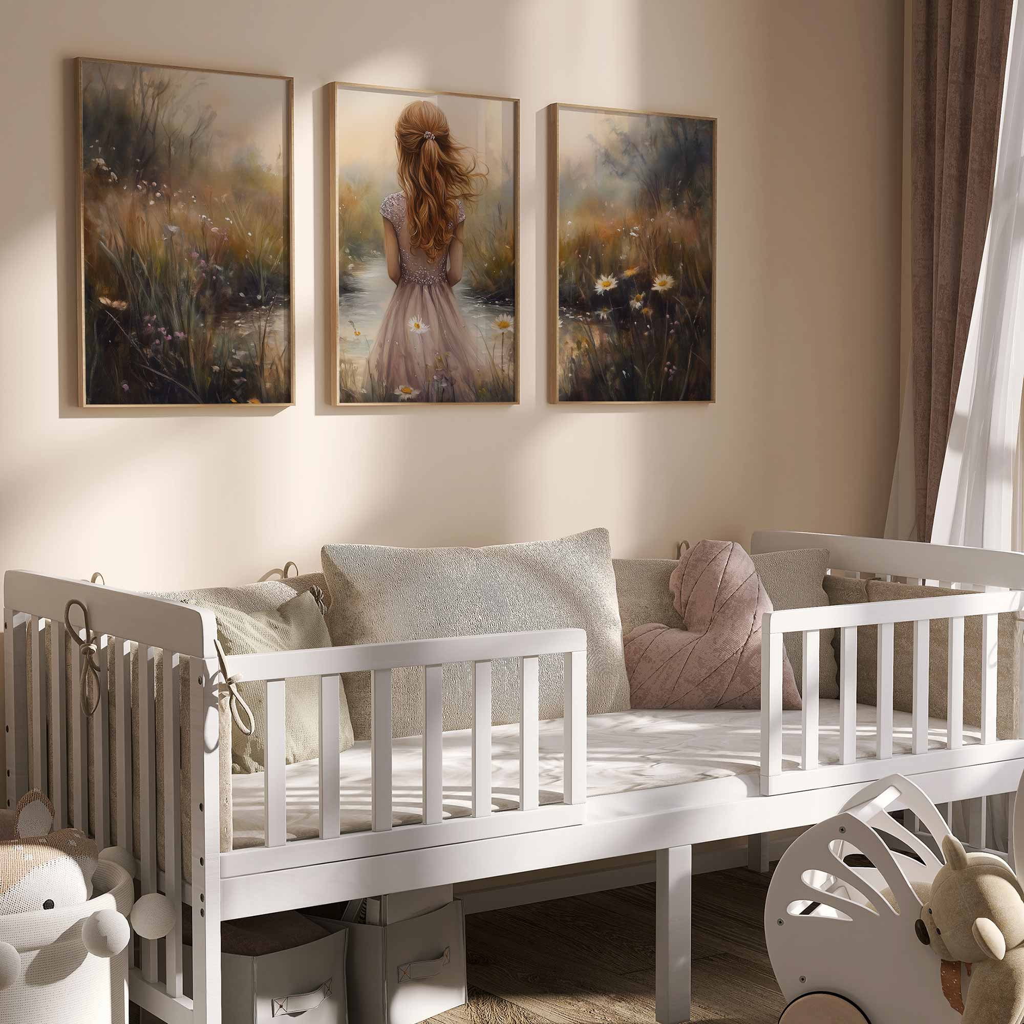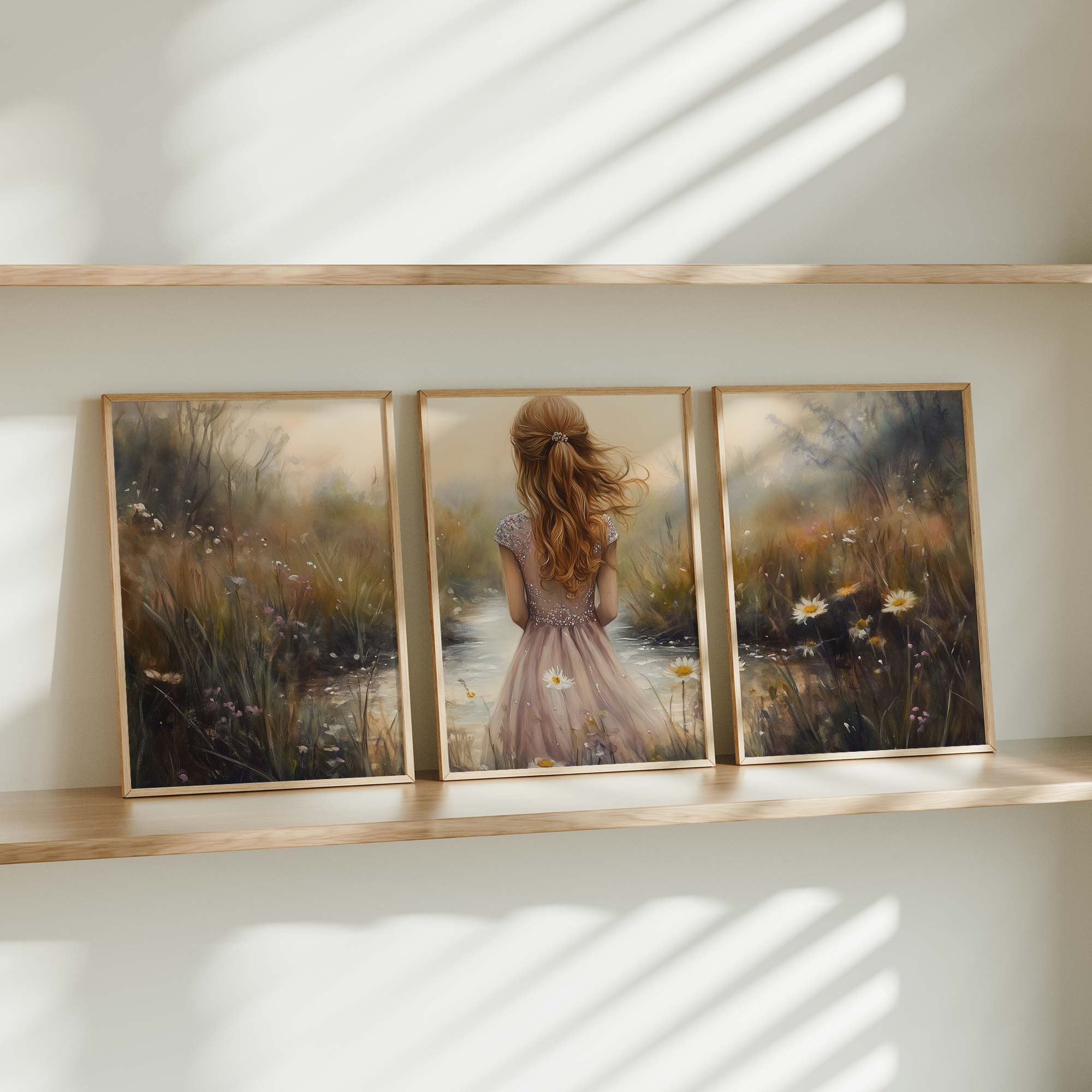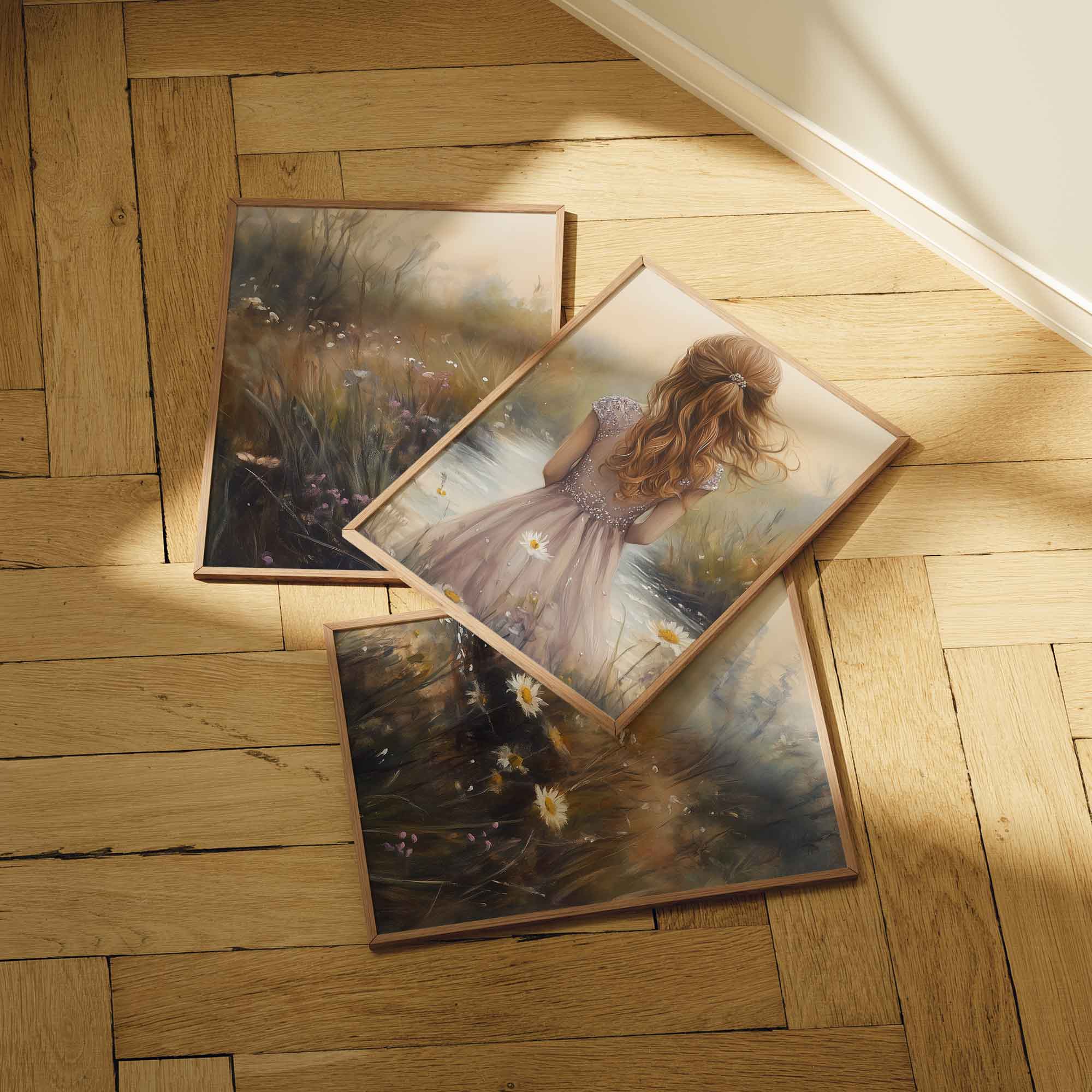 Terug naar collectie / Kinderkamer posters / Bloemen posters / Dromerig Meisje in Bloemenveld – Pastel Roze en Geel