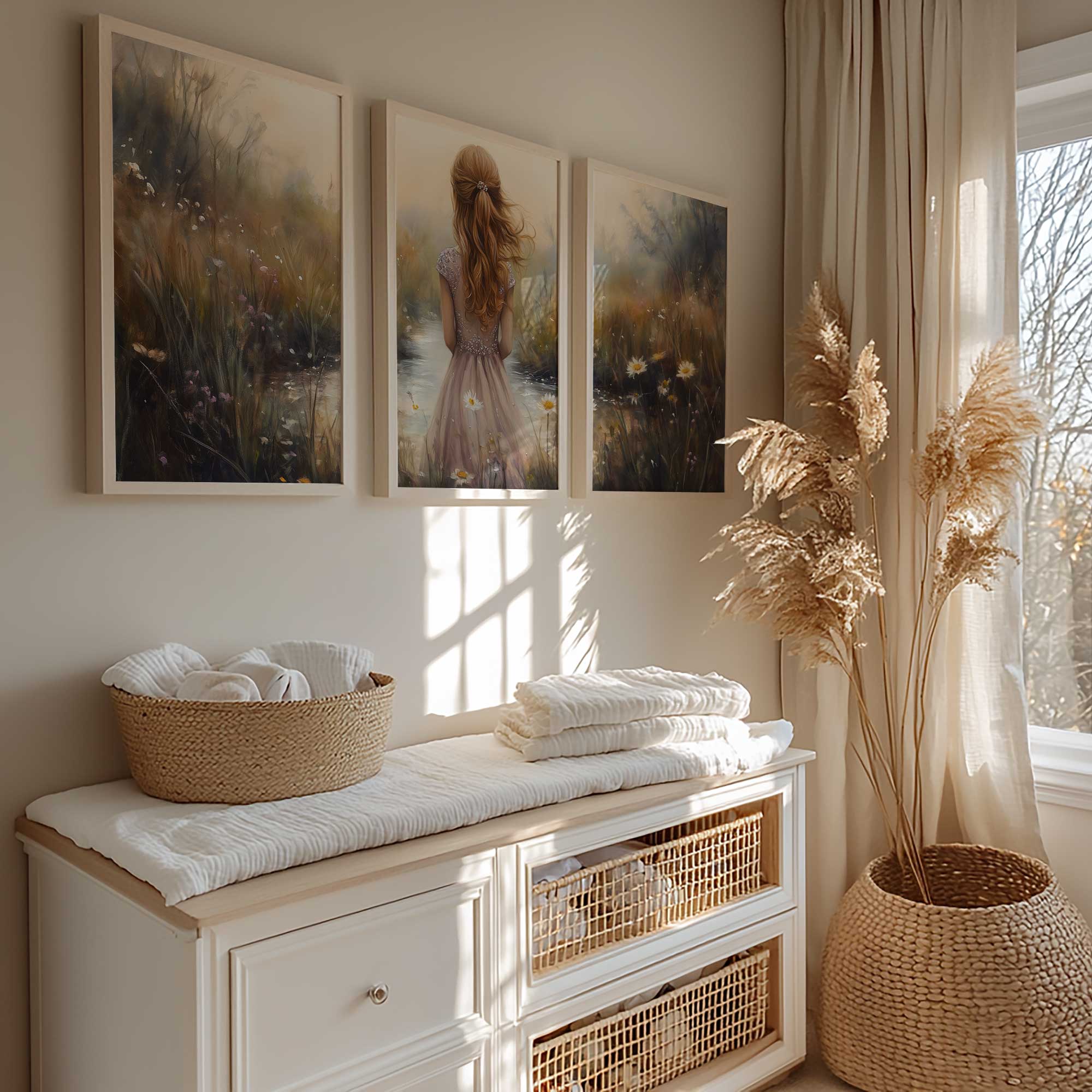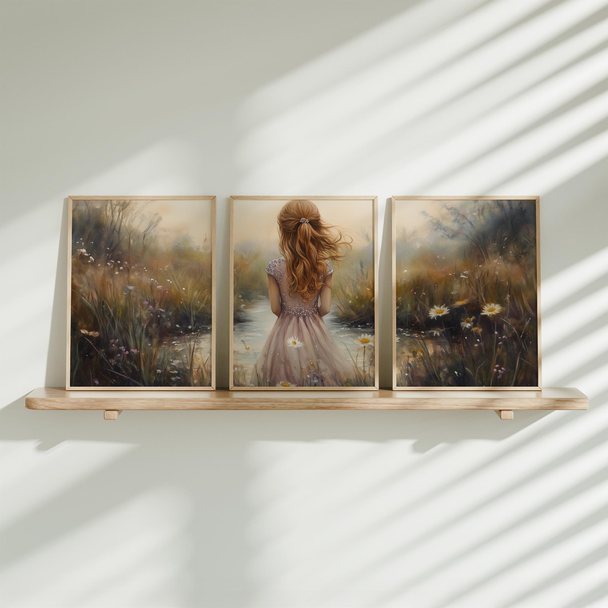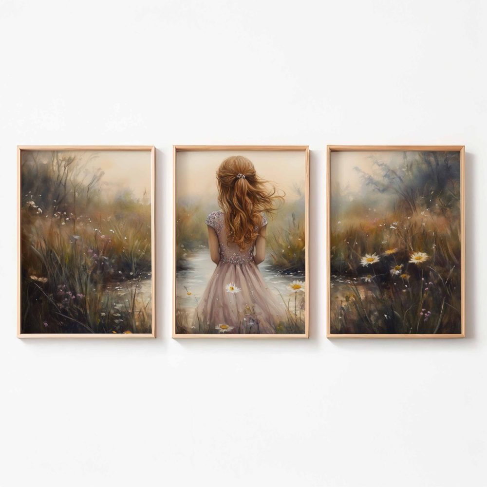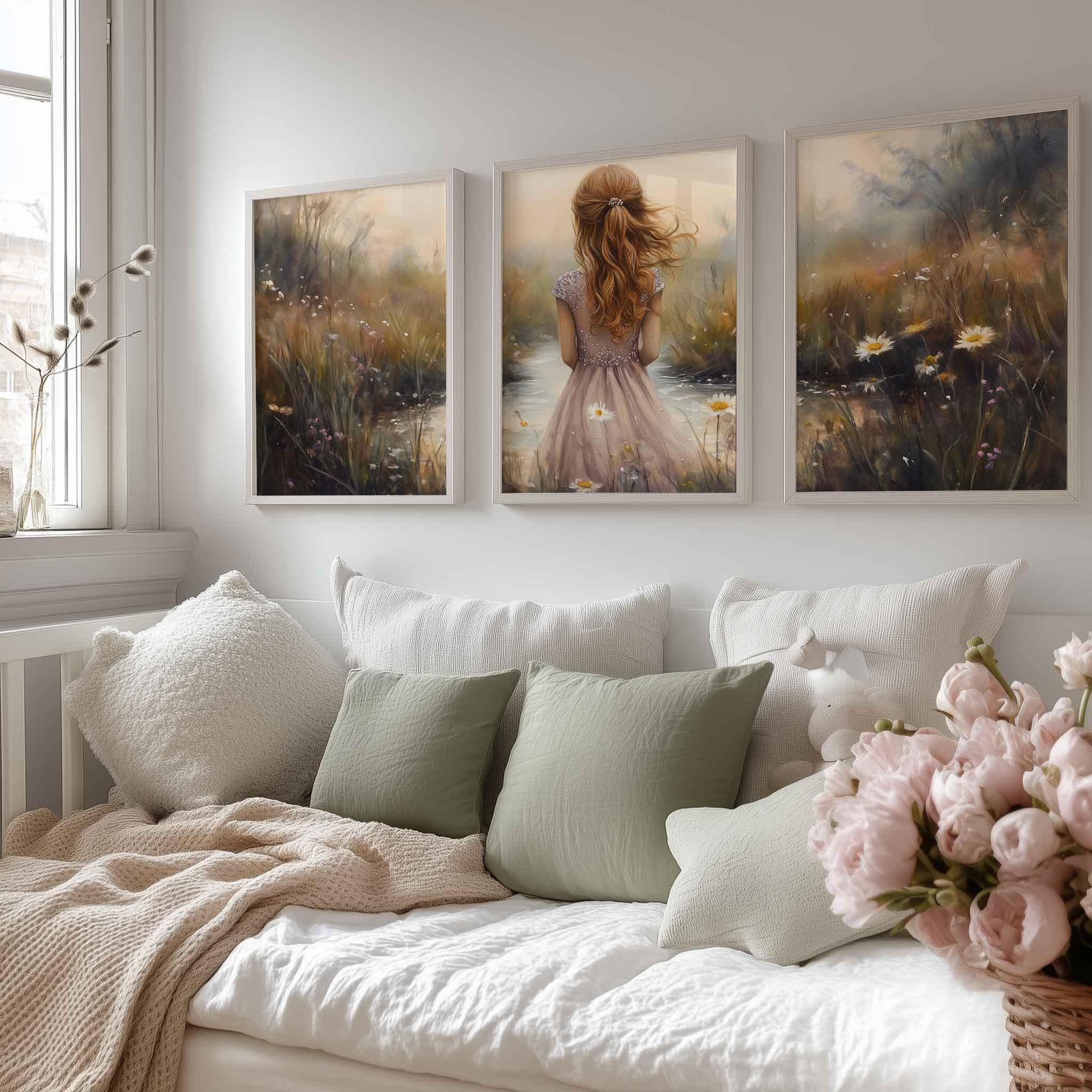 Terug naar collectie / Kinderkamer posters / Bloemen posters / Dromerig Meisje in Bloemenveld – Pastel Roze en Geel