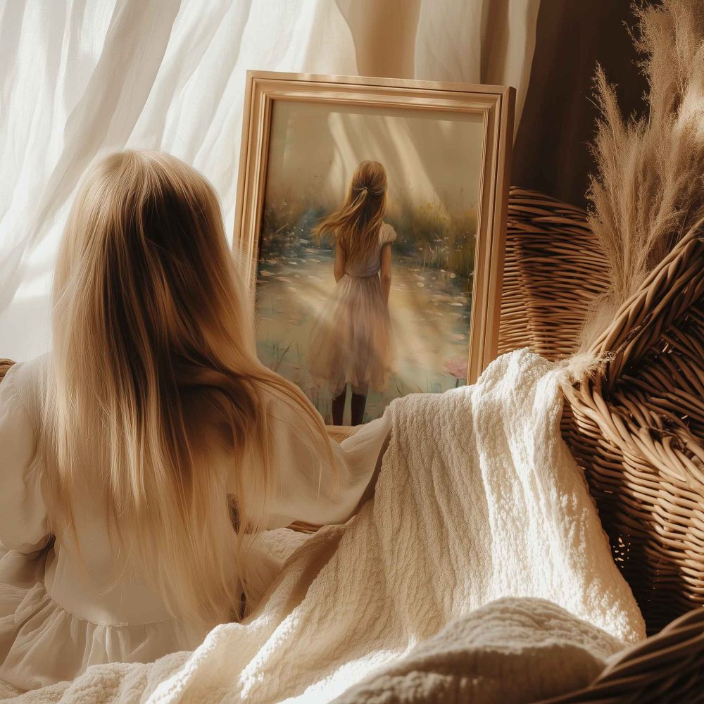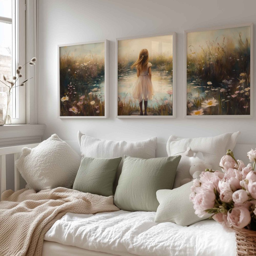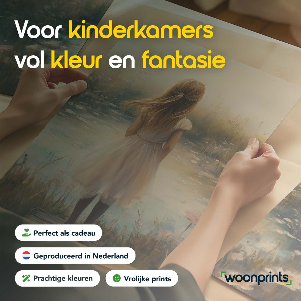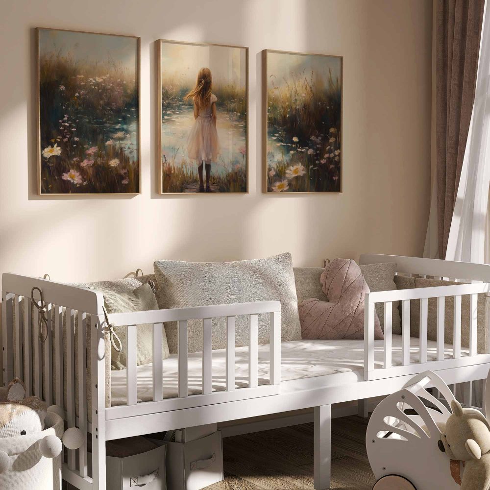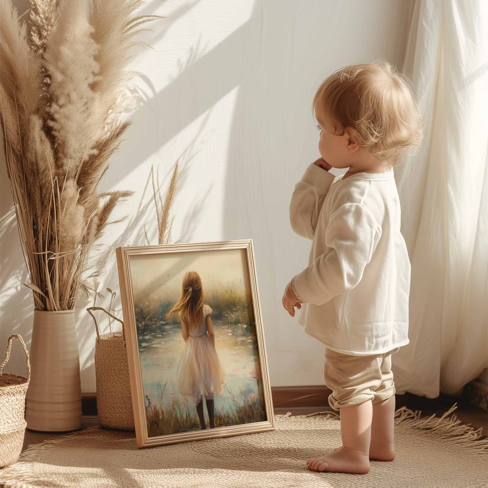 Terug naar collectie / Kinderkamer posters / Bloemen posters / Dromerig Meisje in Bloemenveld – Pastel Sereniteit