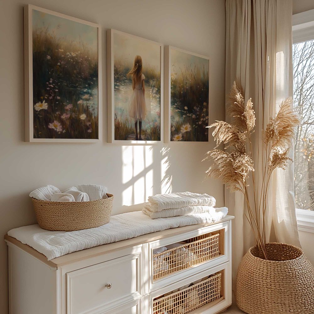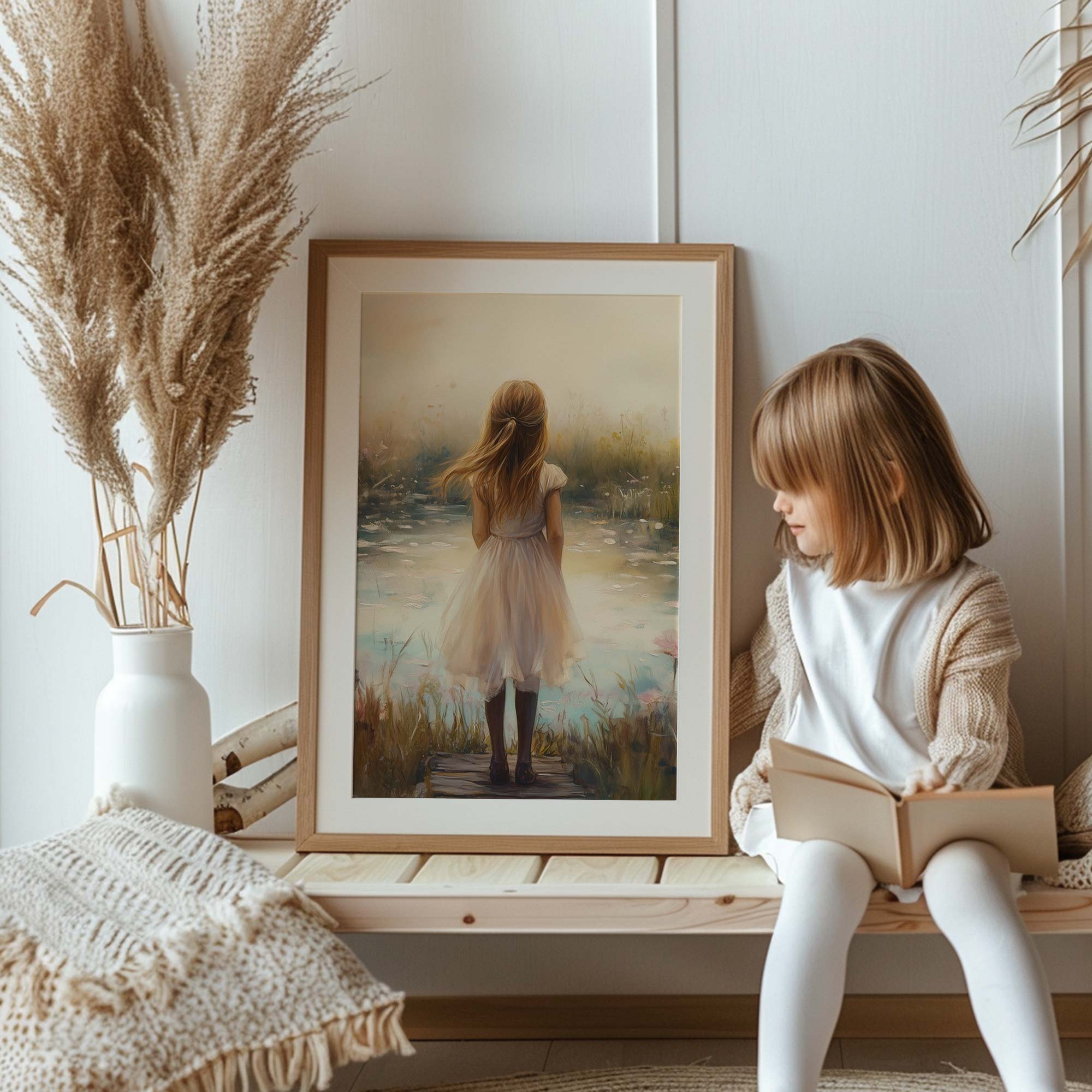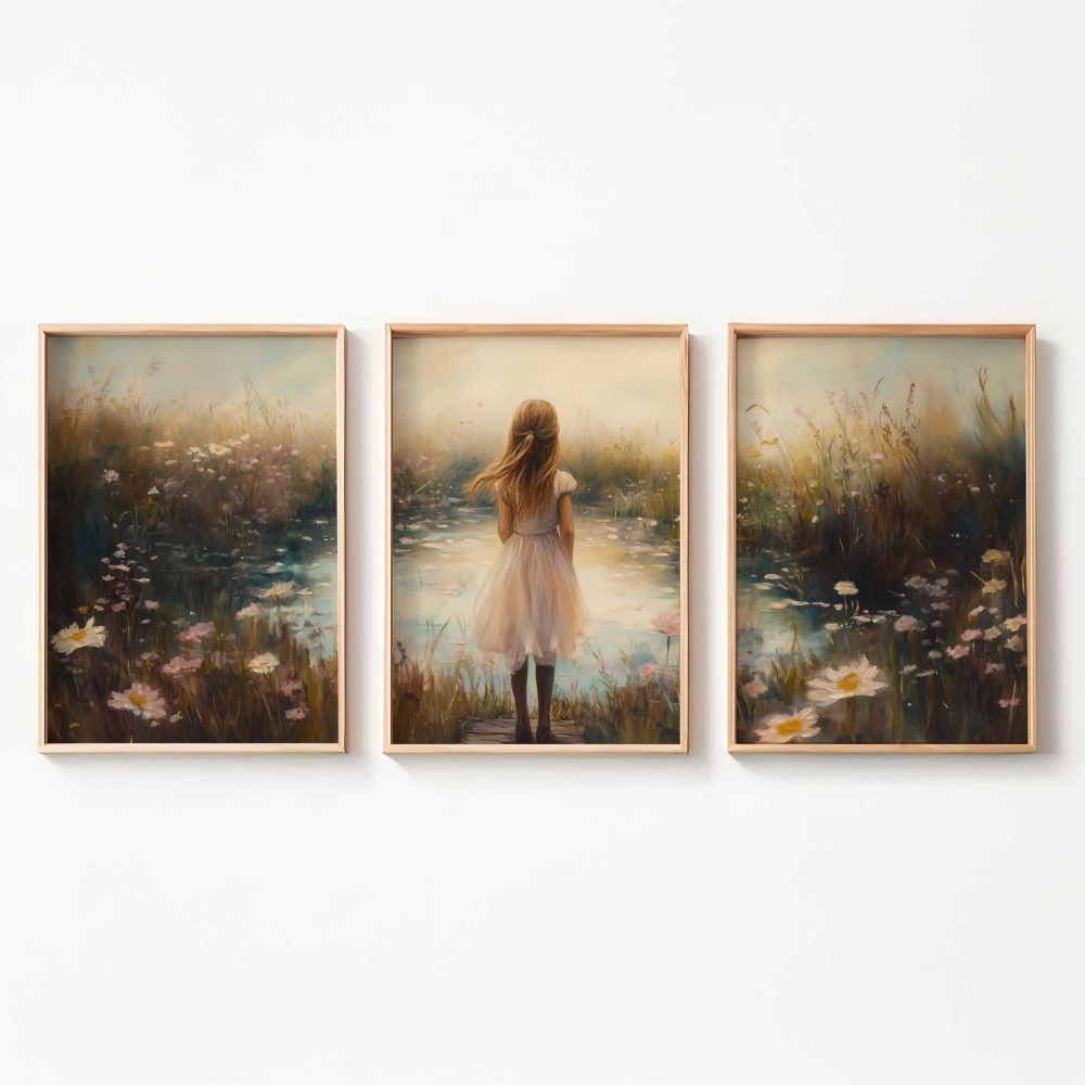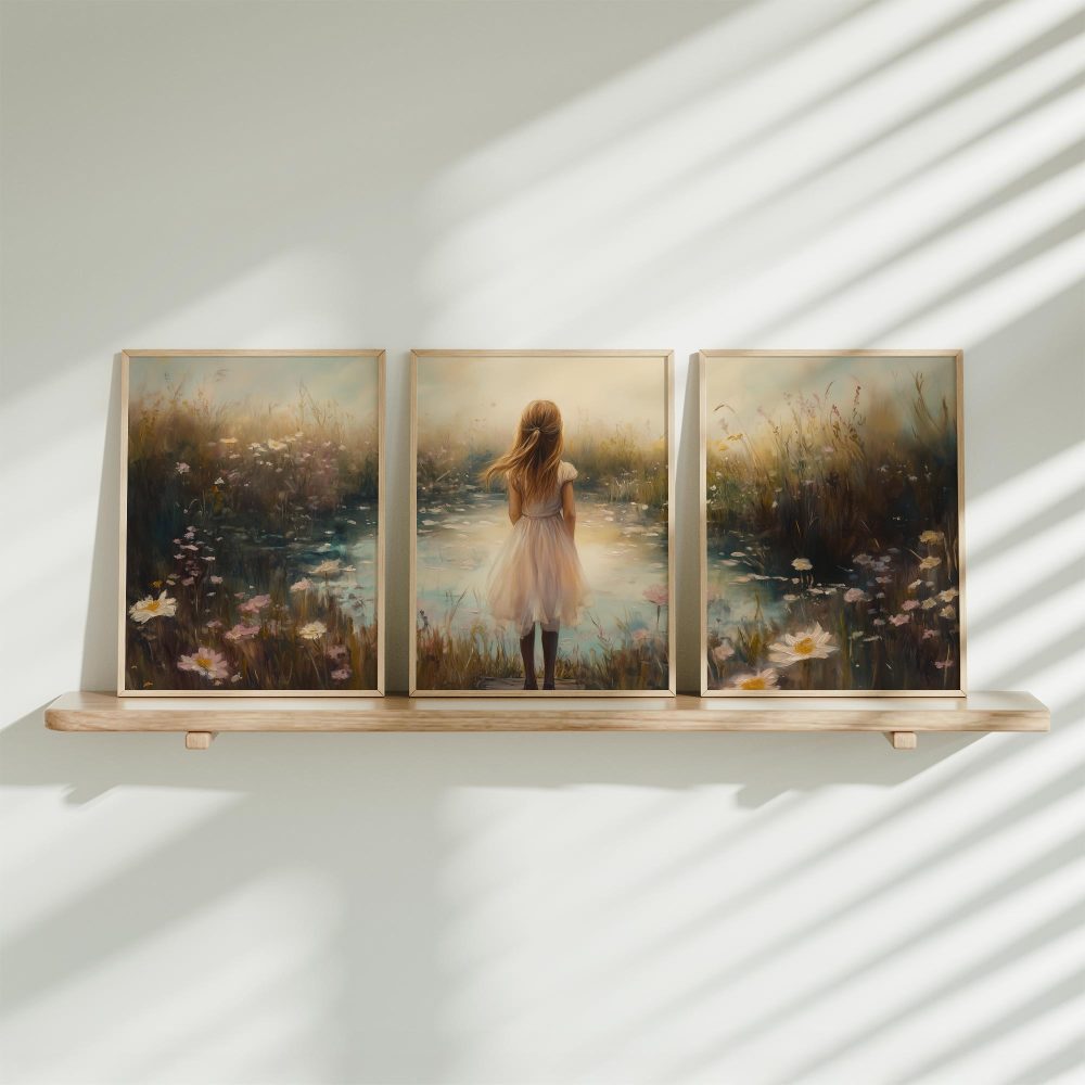 Terug naar collectie / Kinderkamer posters / Bloemen posters / Dromerig Meisje in Bloemenveld – Pastel Sereniteit