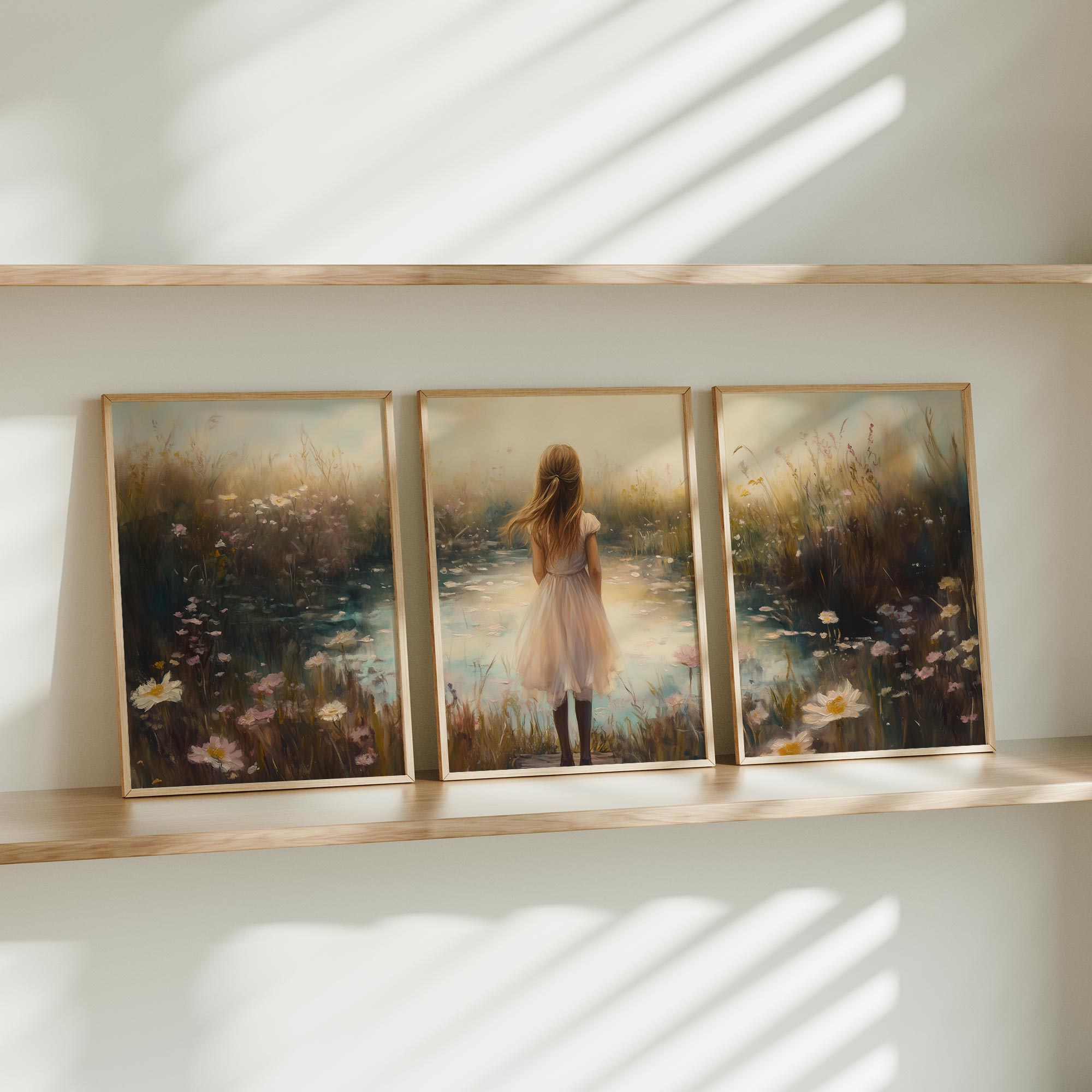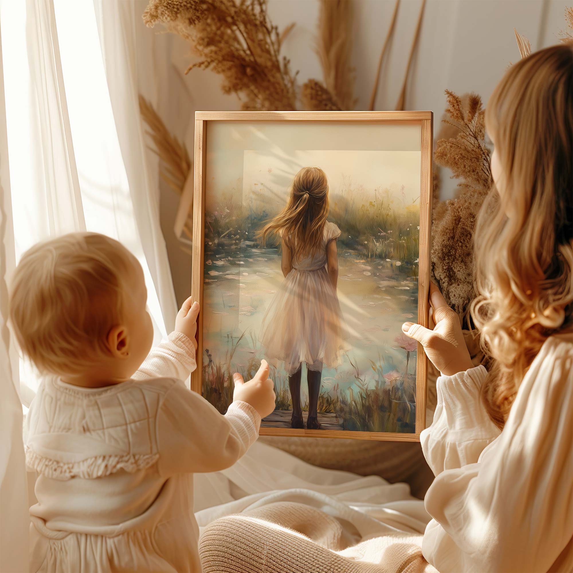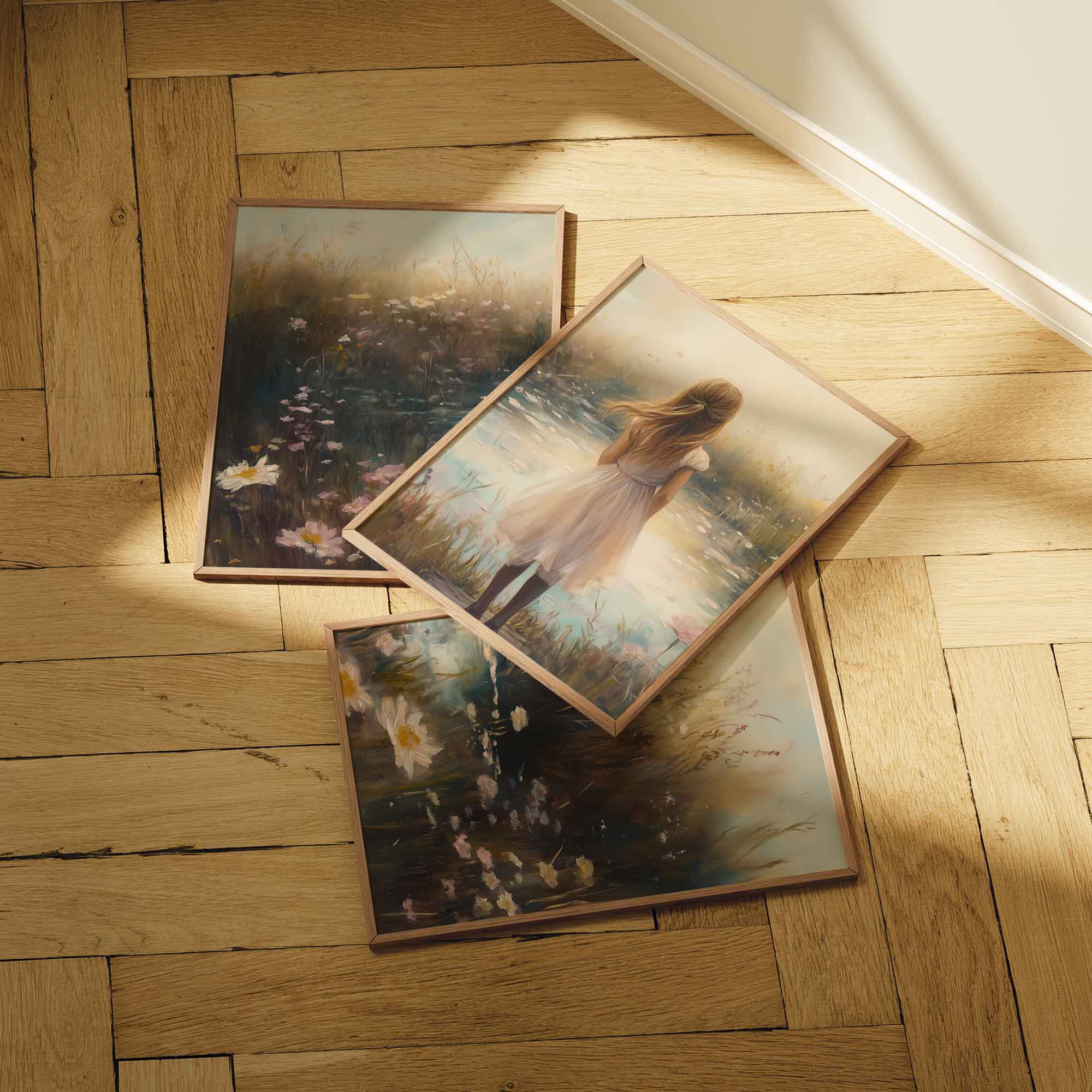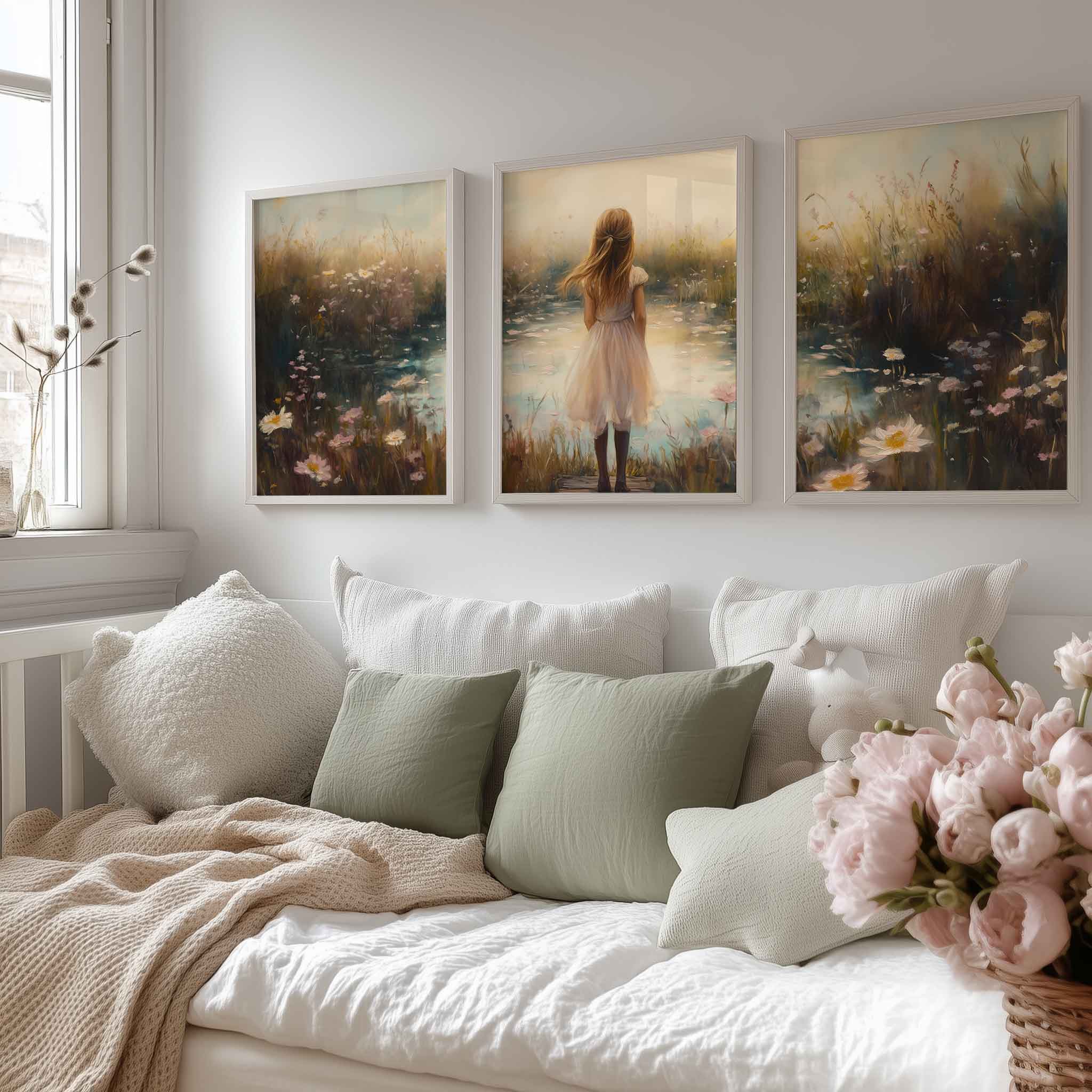 Terug naar collectie / Kinderkamer posters / Bloemen posters / Dromerig Meisje in Bloemenveld – Pastel Sereniteit