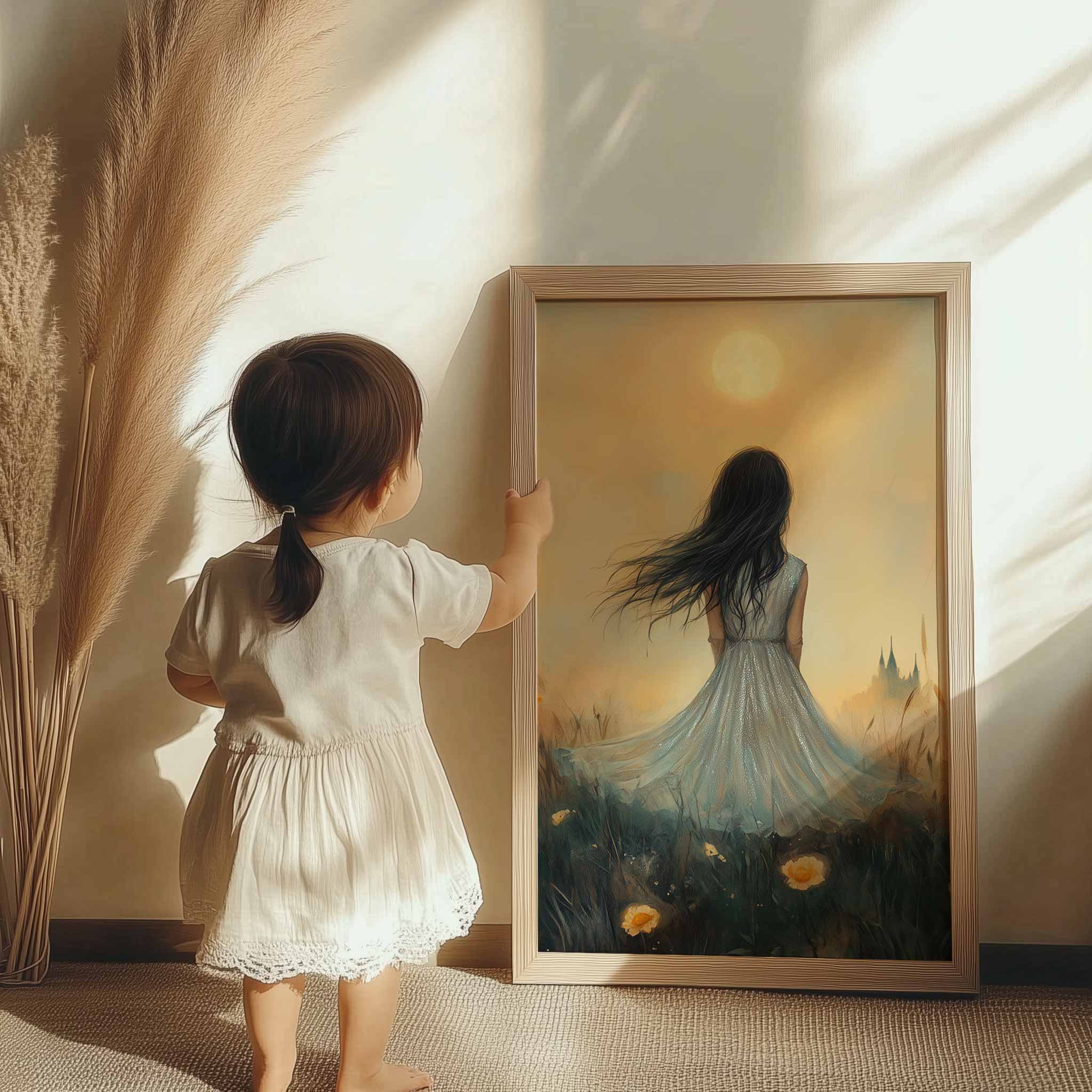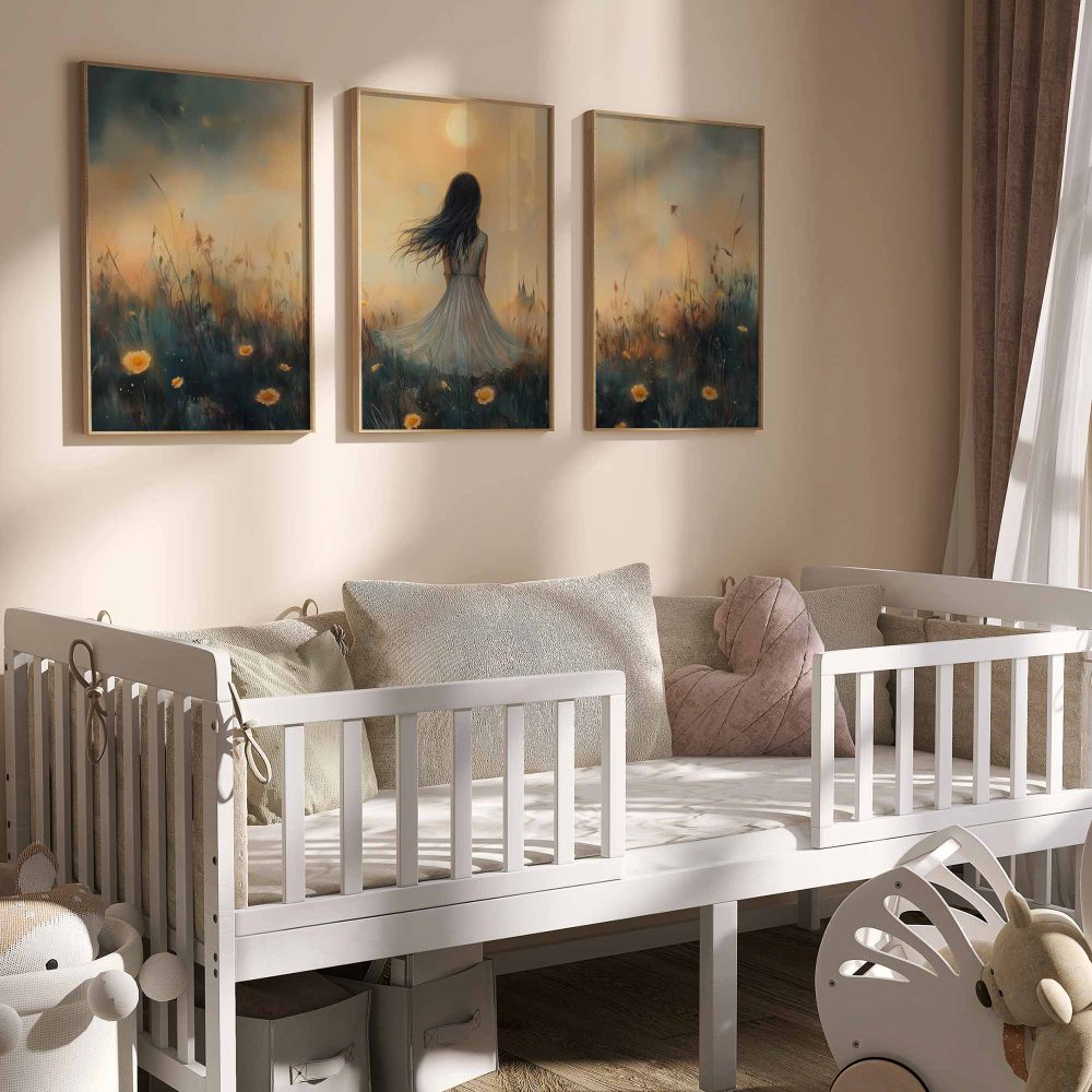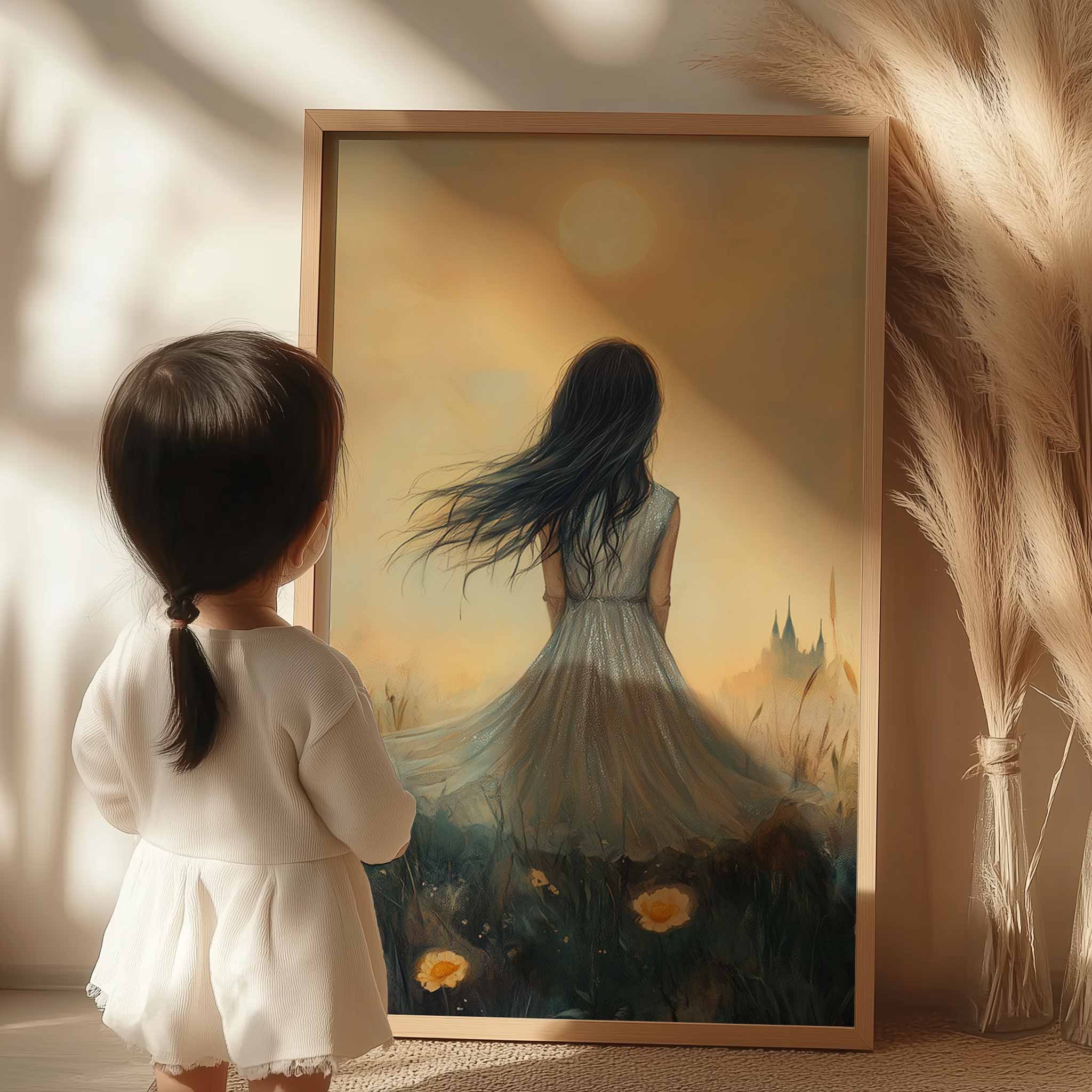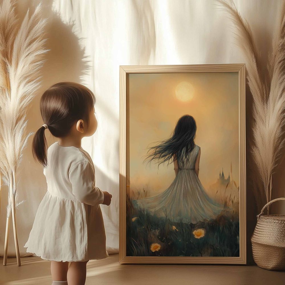 Terug naar collectie / Kinderkamer posters / Bloemen posters / Dromerig Meisje in Bloemenveld – Pastel Zonneschijn
