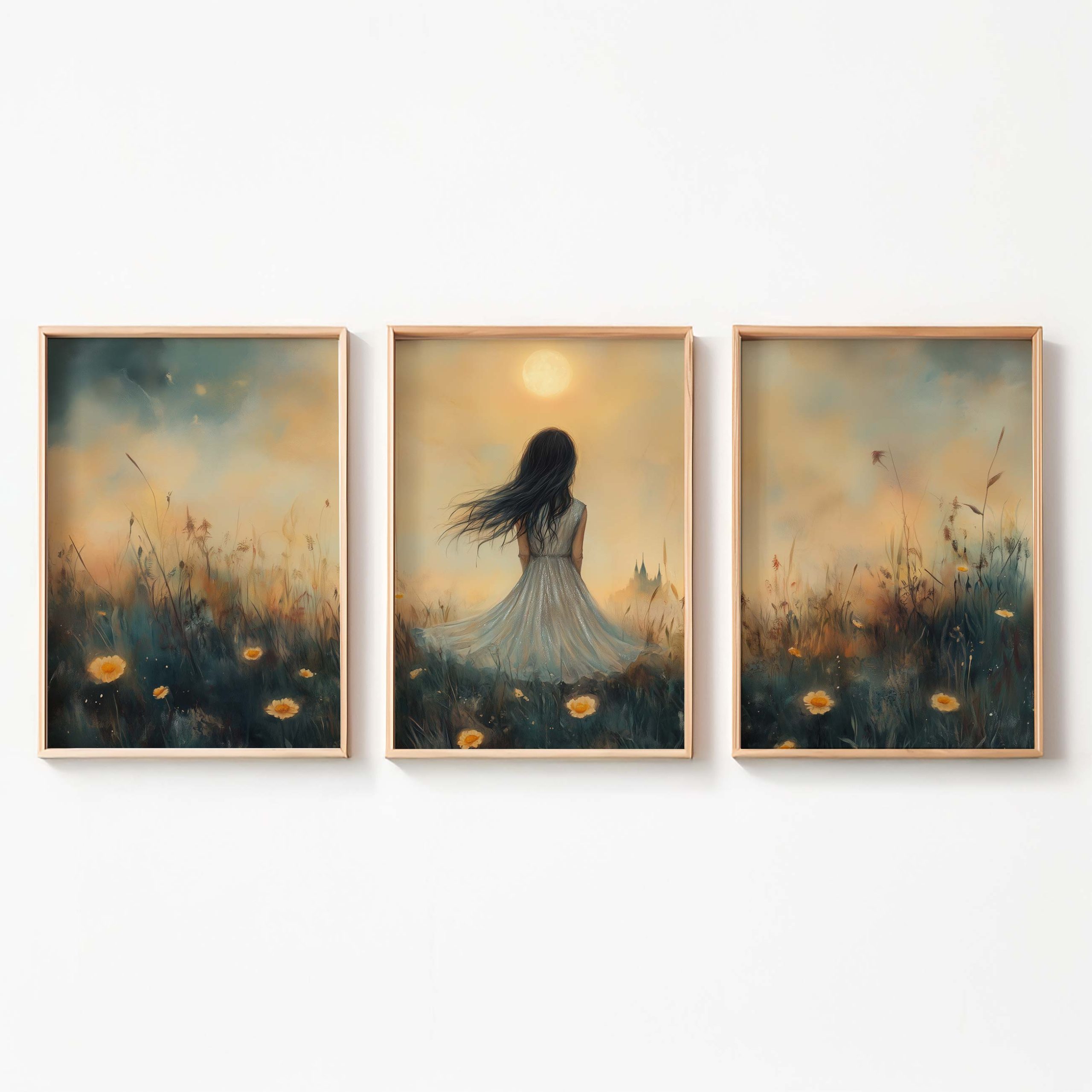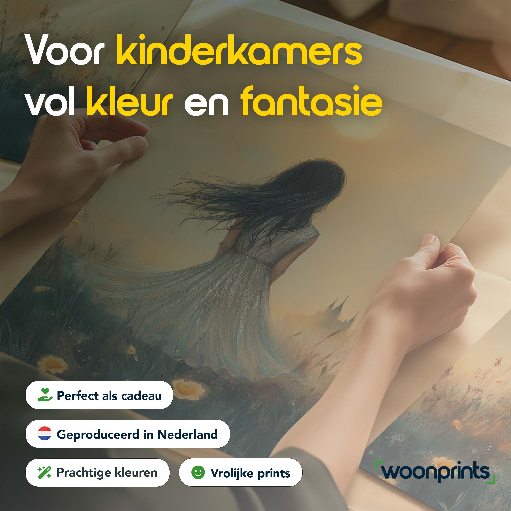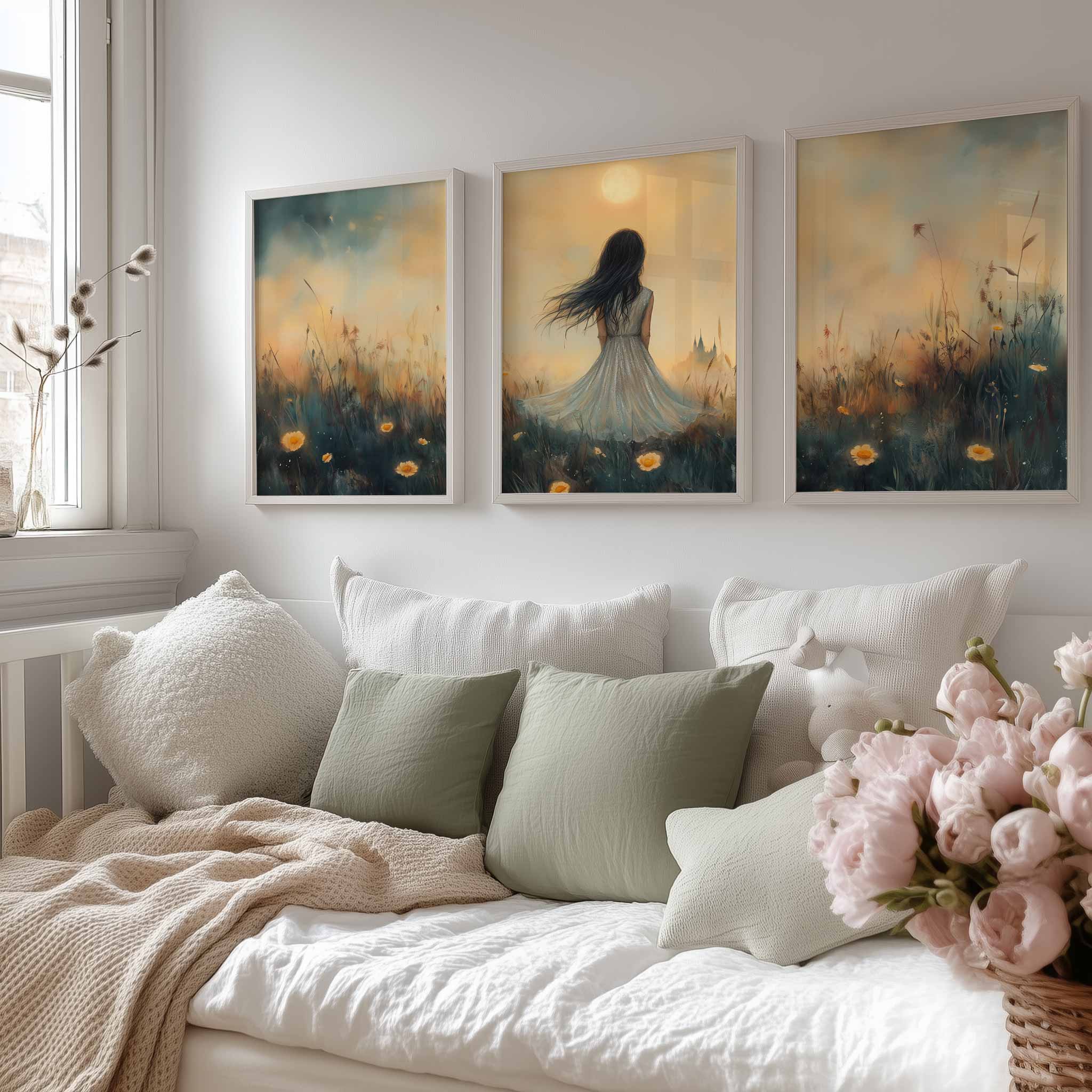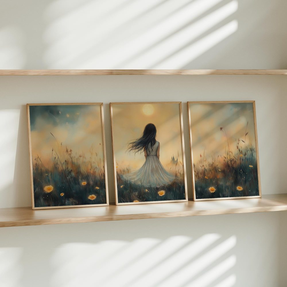 Terug naar collectie / Kinderkamer posters / Bloemen posters / Dromerig Meisje in Bloemenveld – Pastel Zonneschijn