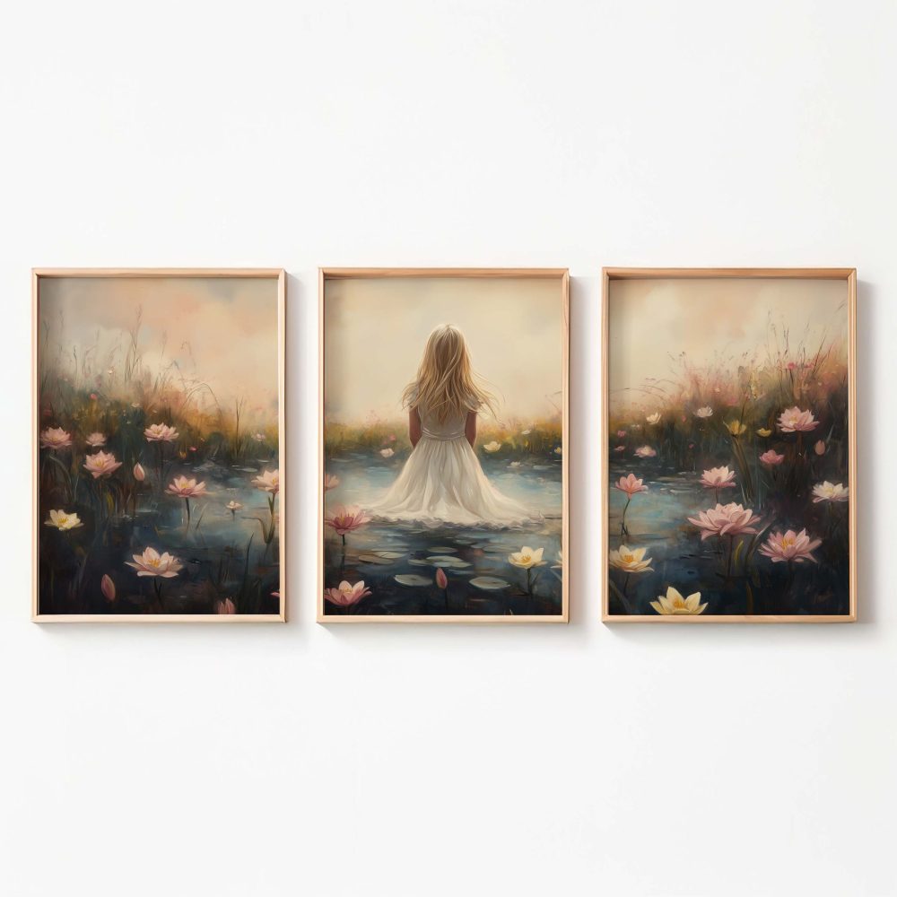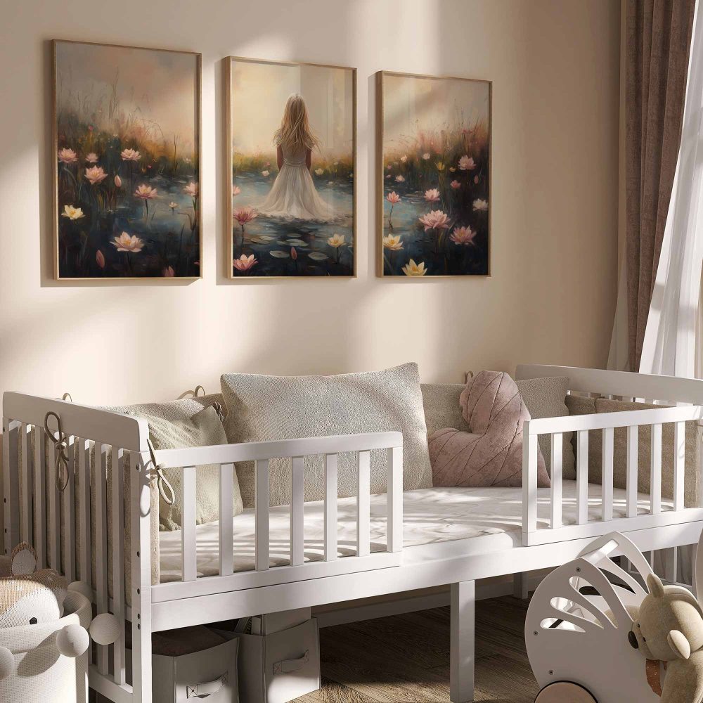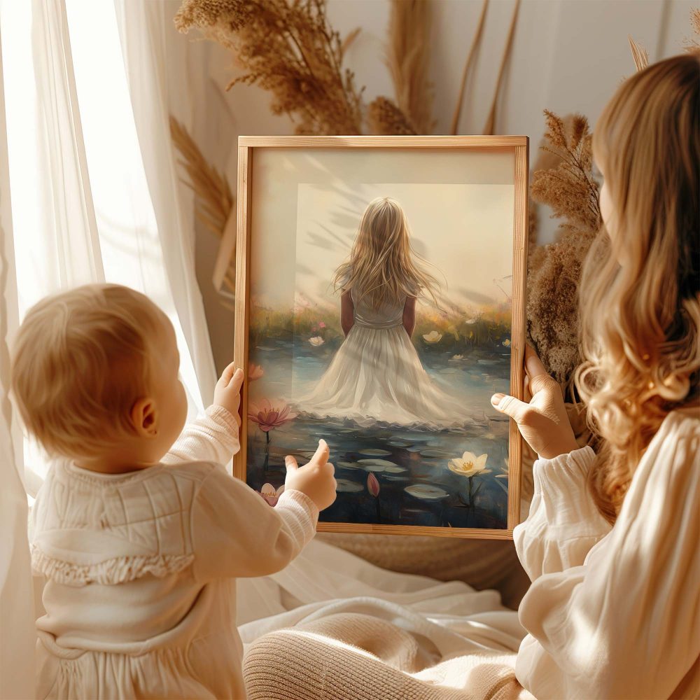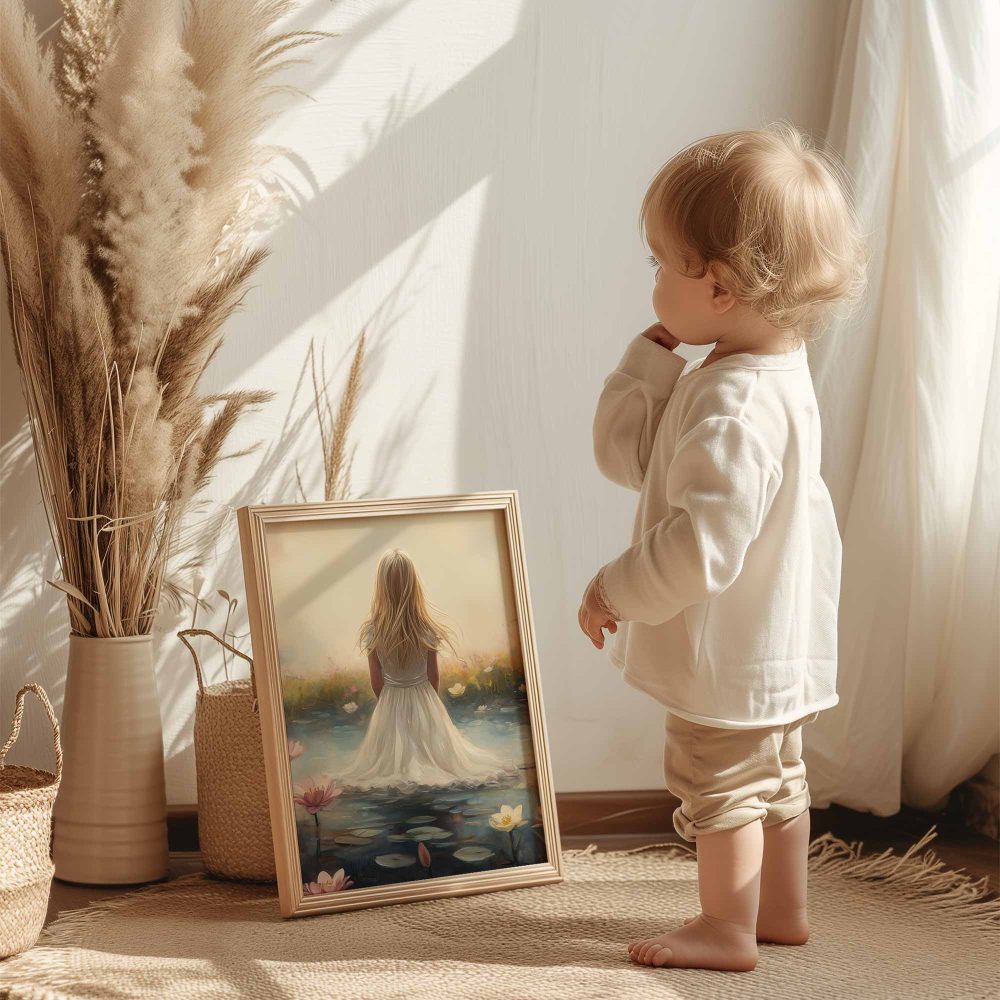 Terug naar collectie / Kinderkamer posters / Bloemen posters / Dromerig Meisje in Bloemenveld – Roze Sereniteit