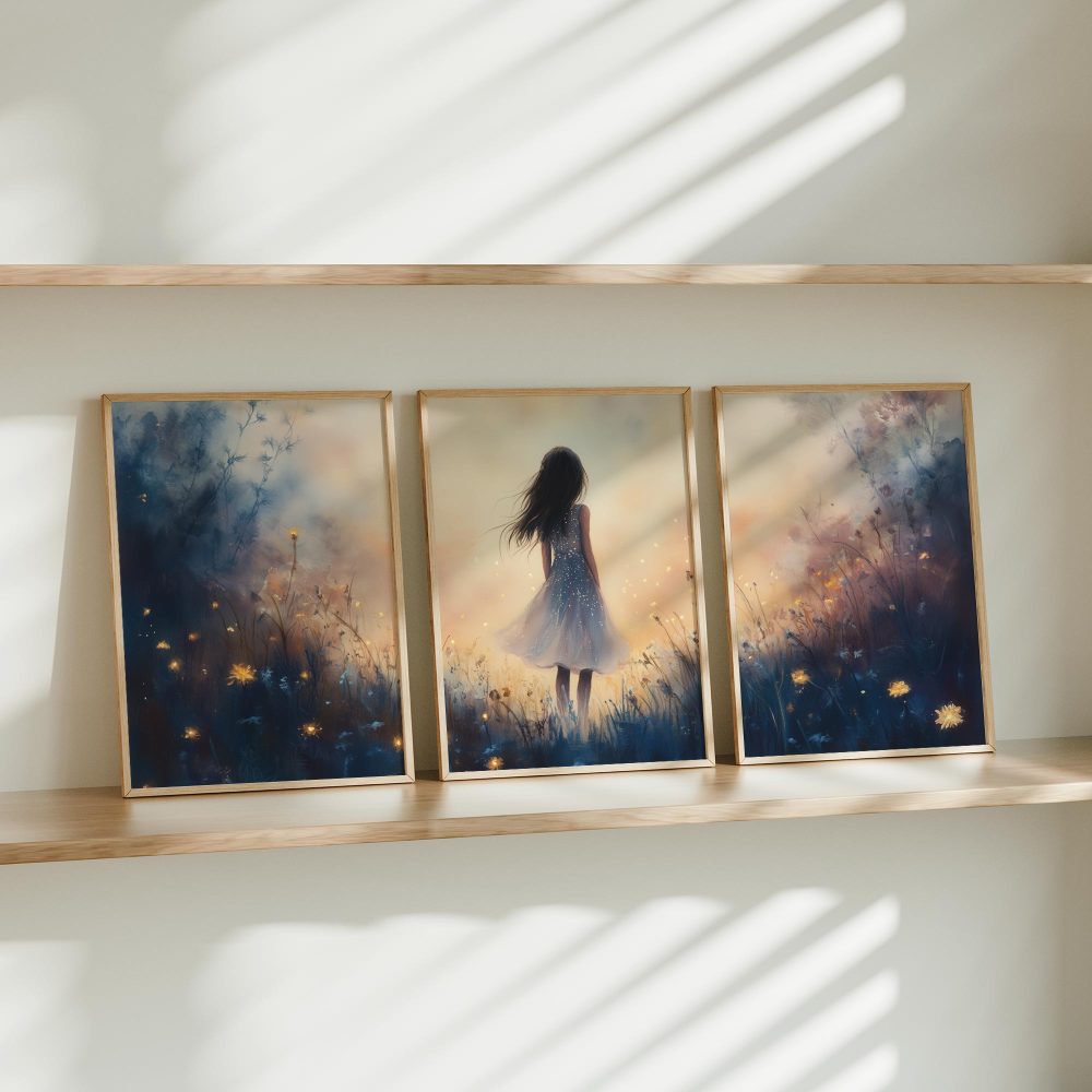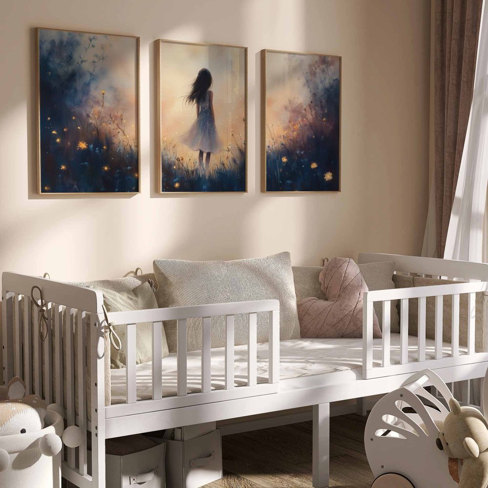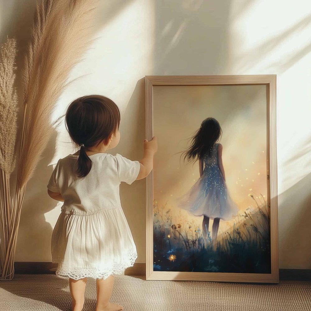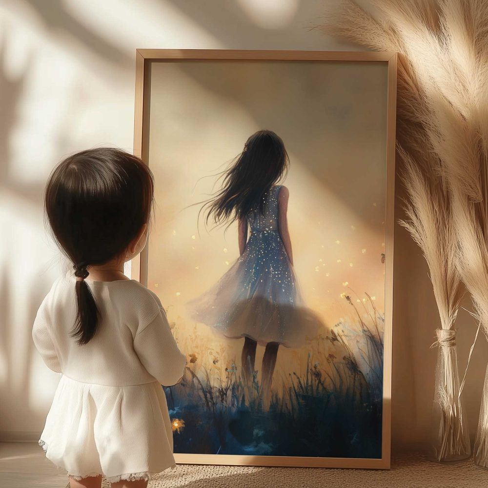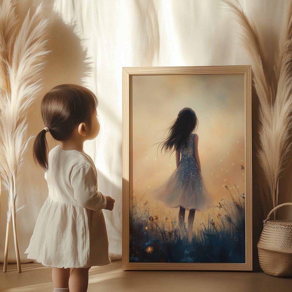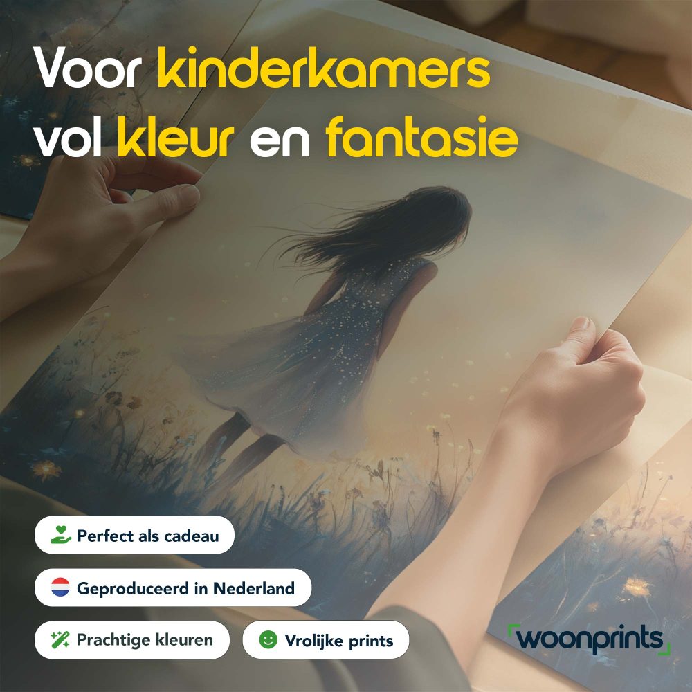 Terug naar collectie / Kinderkamer posters / Bloemen posters / Dromerig Meisje in Bloemenveld – Speels en Zacht