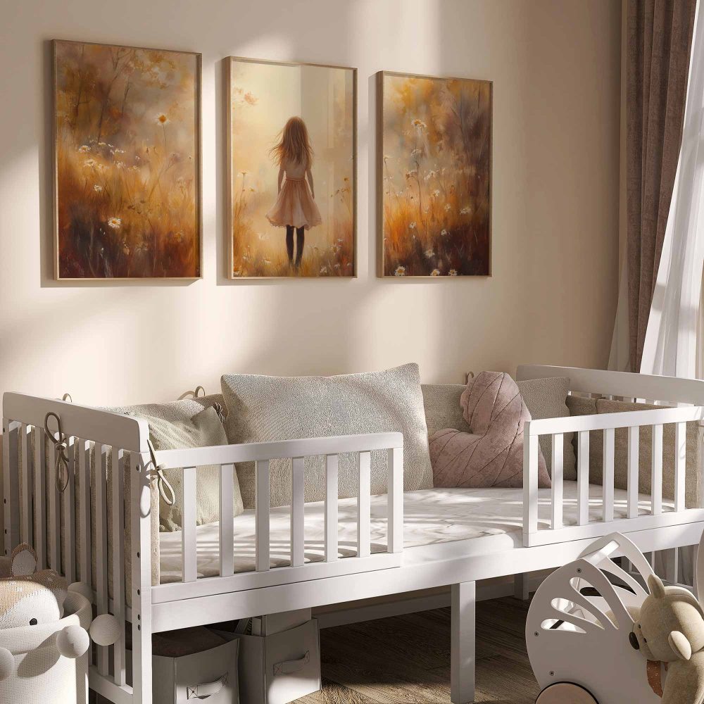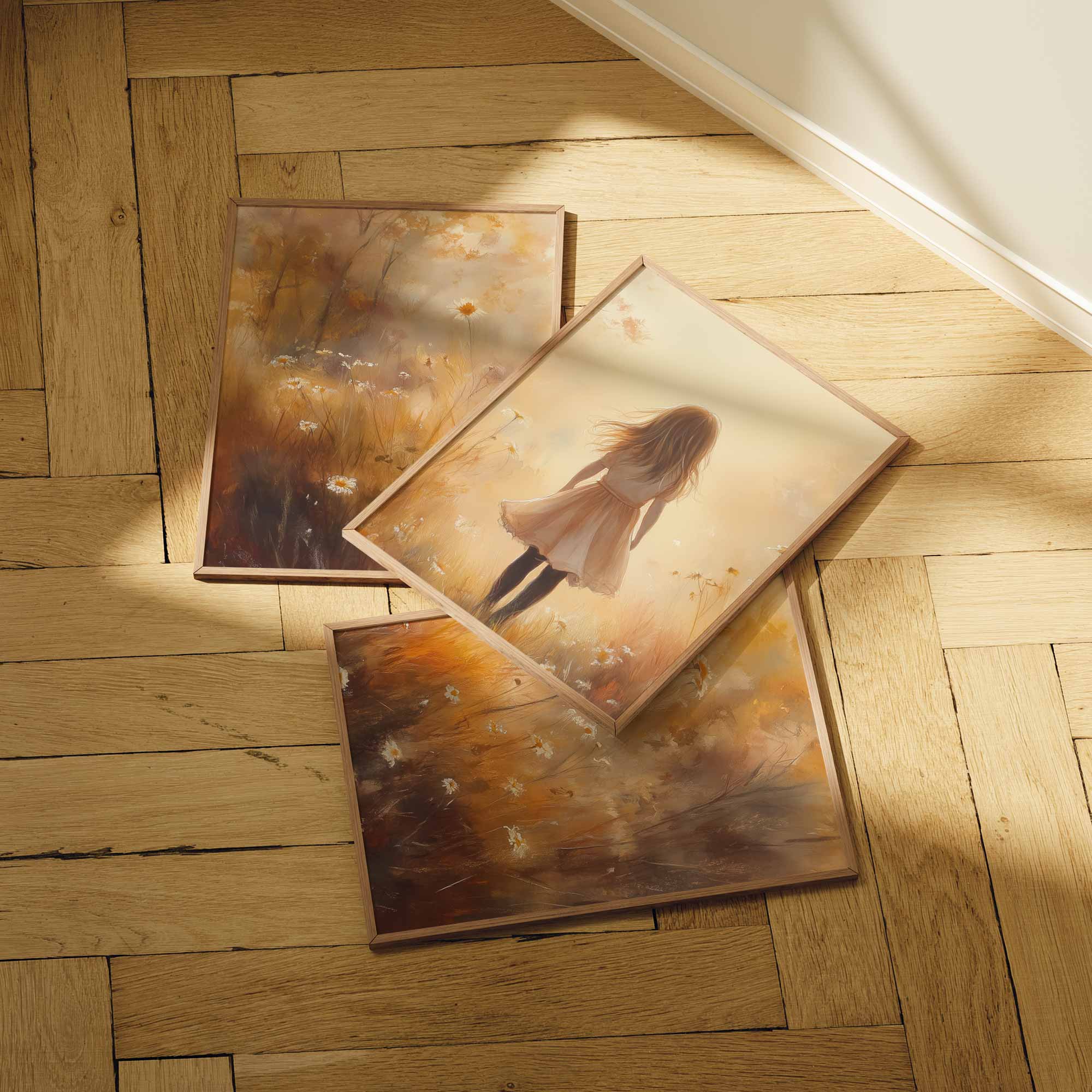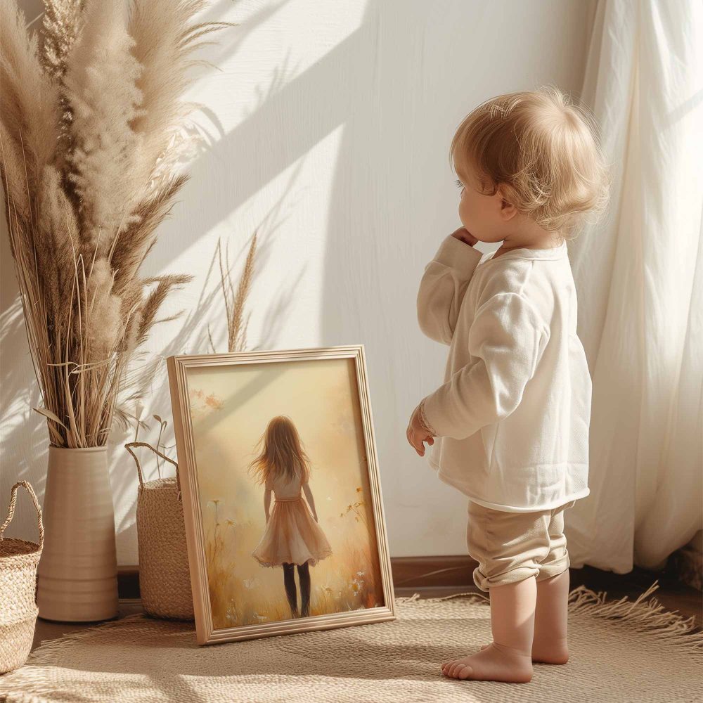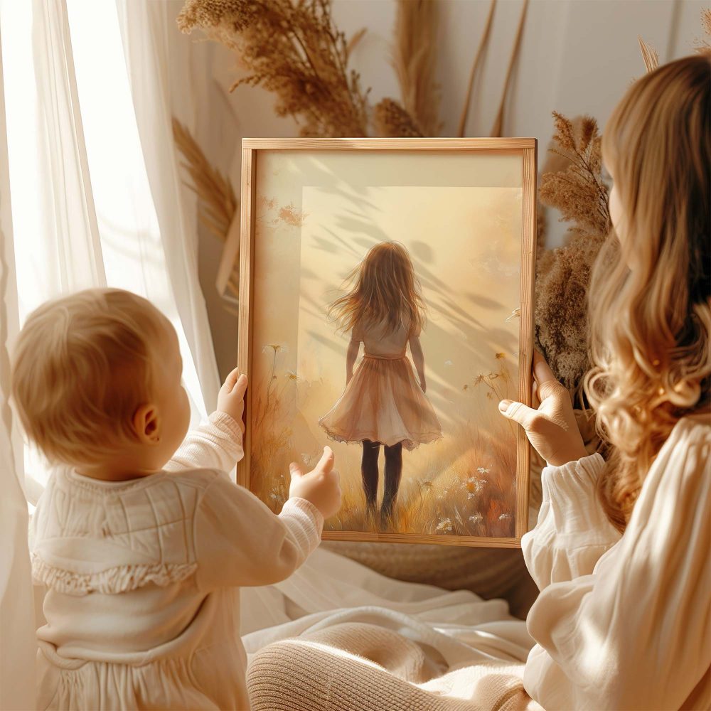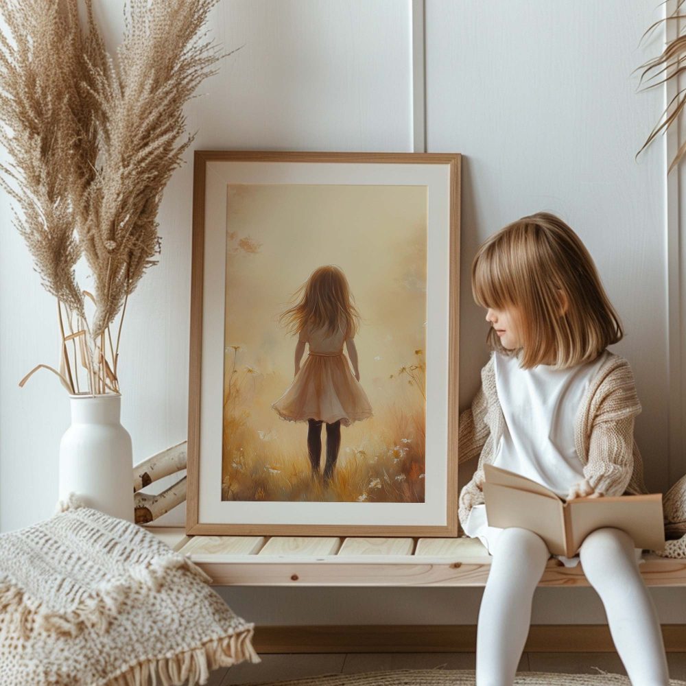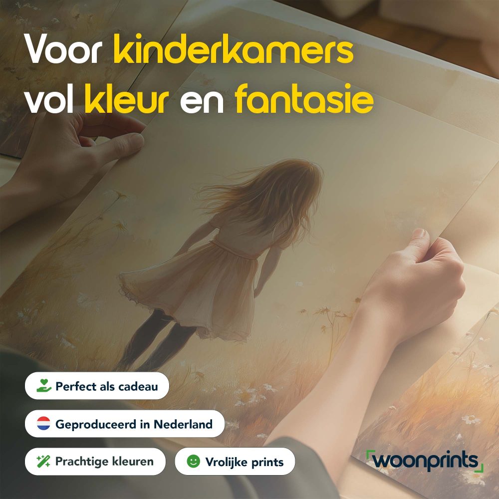 Terug naar collectie / Kinderkamer posters / Bloemen posters / Dromerig Meisje in Bloemenveld – Warme Kinderfantasie